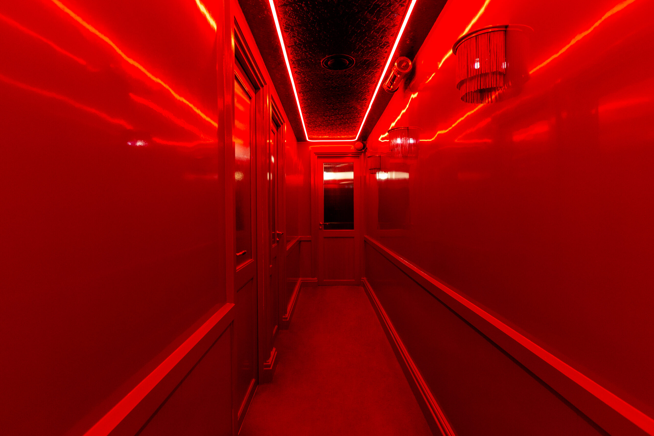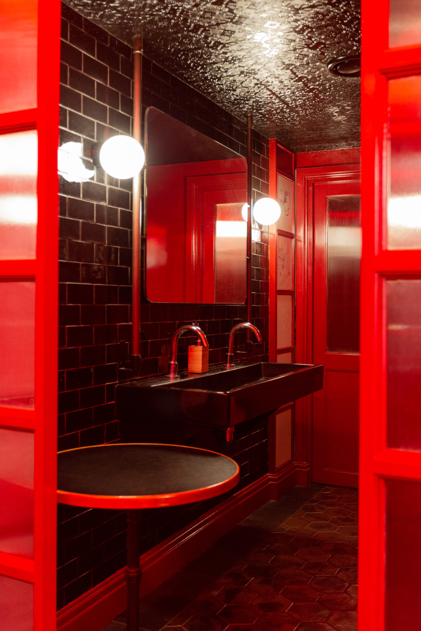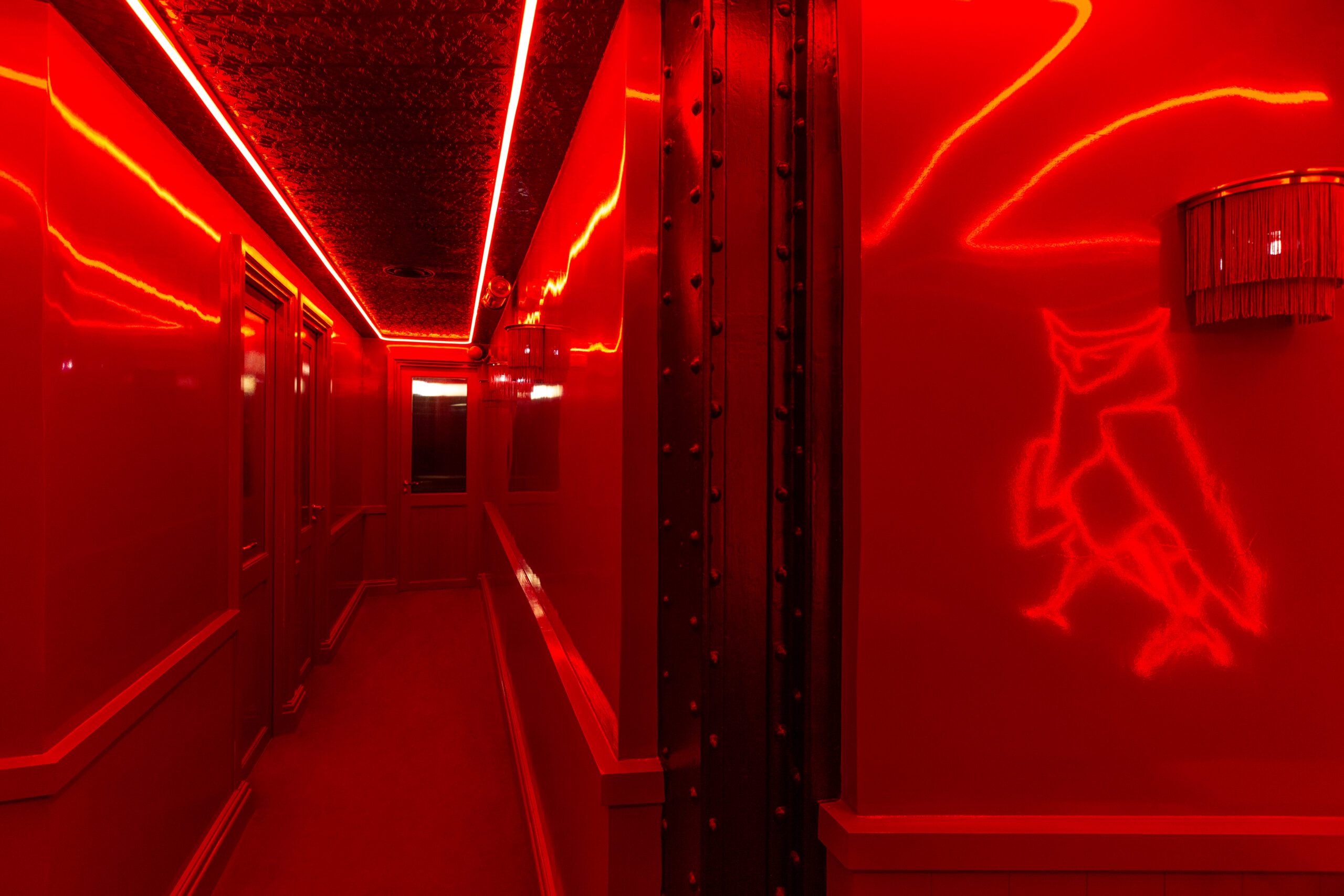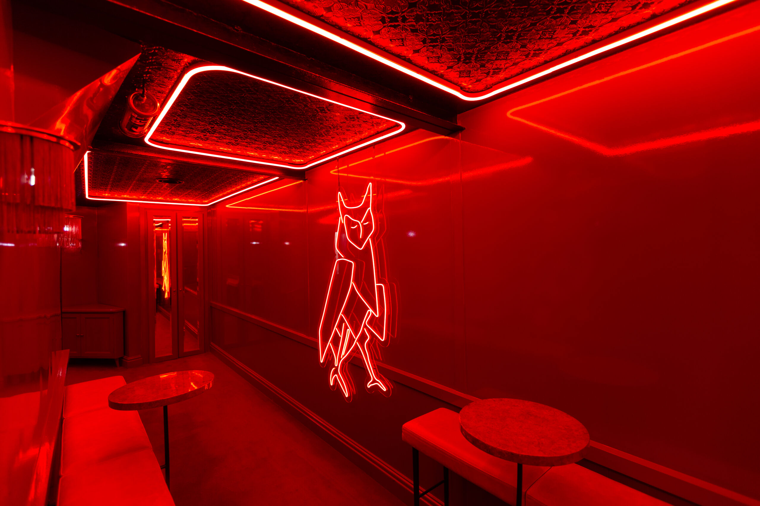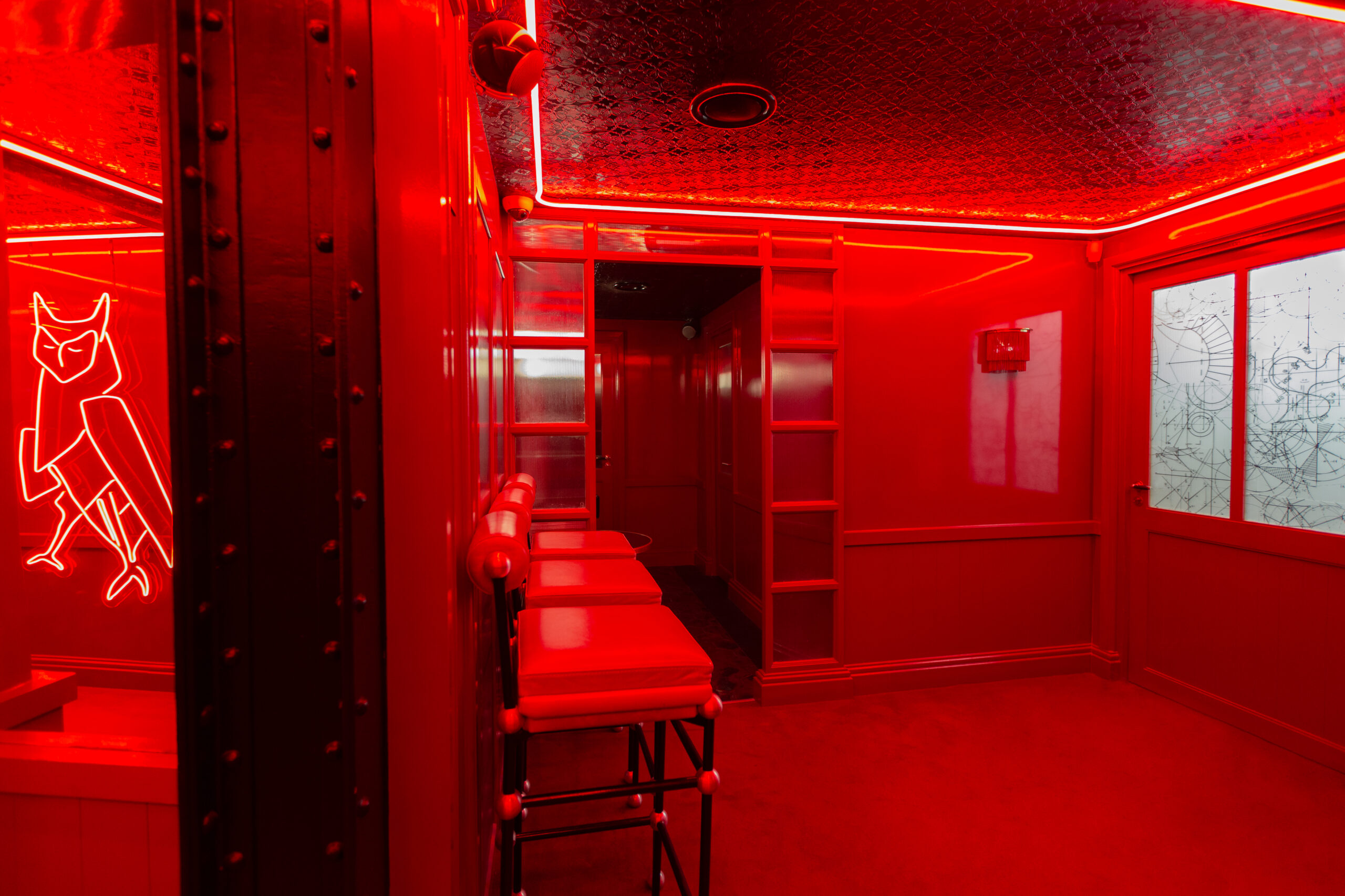 Les Chouettes surprennent jusqu’aux toilettes, où une ambiance rouge éclatante et des miroirs invitent à une interaction ludique et à la création de souvenirs amusants, transformant une visite ordinaire en un moment d’amusement et de partage sur les réseaux sociaux.