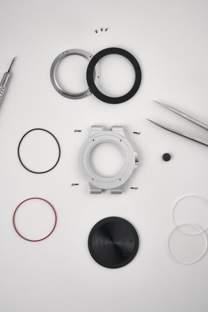 - Boîtier : Aluminium avec fond en titane et revêtement DLC, résistant à l’eau jusqu’à 100 m.