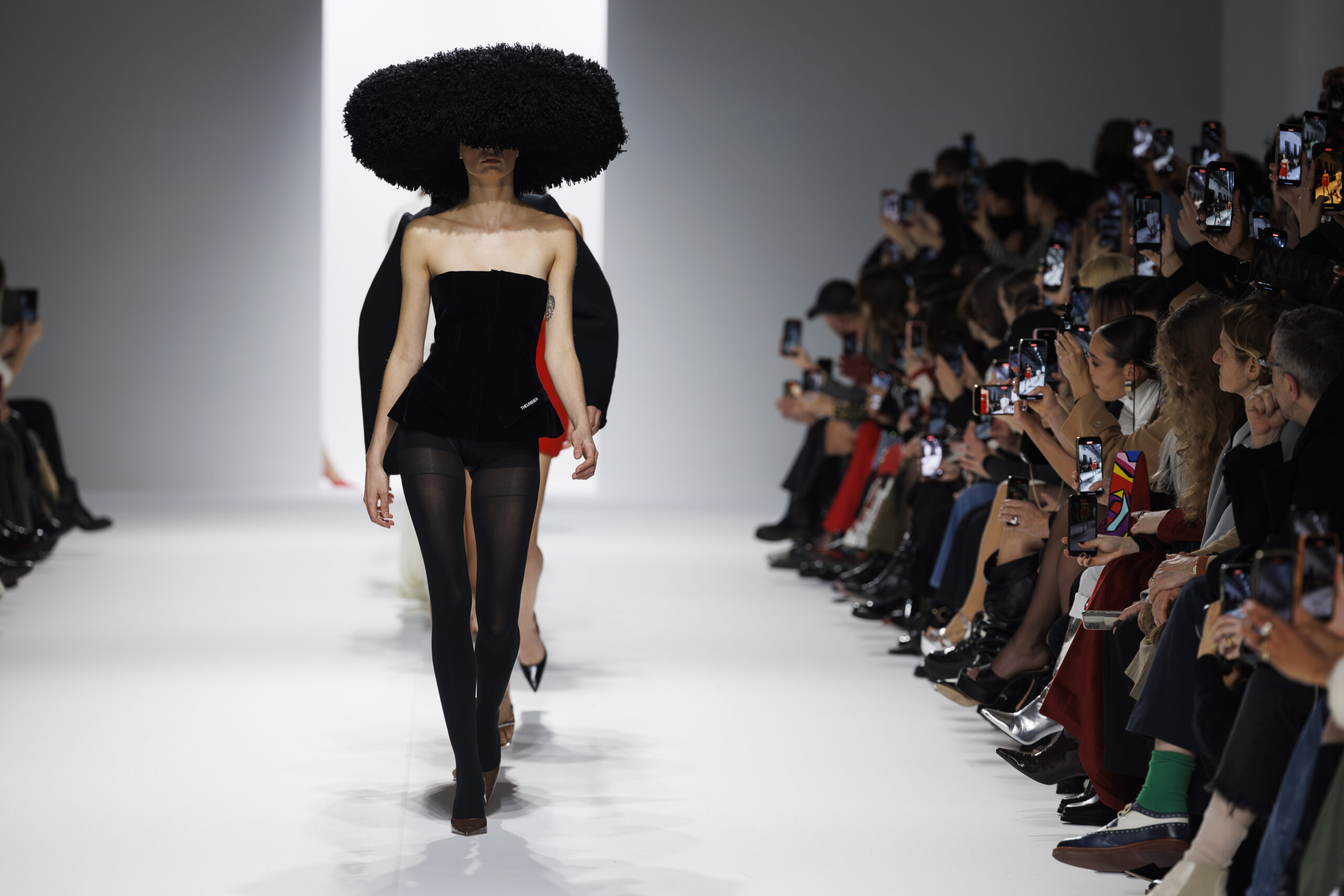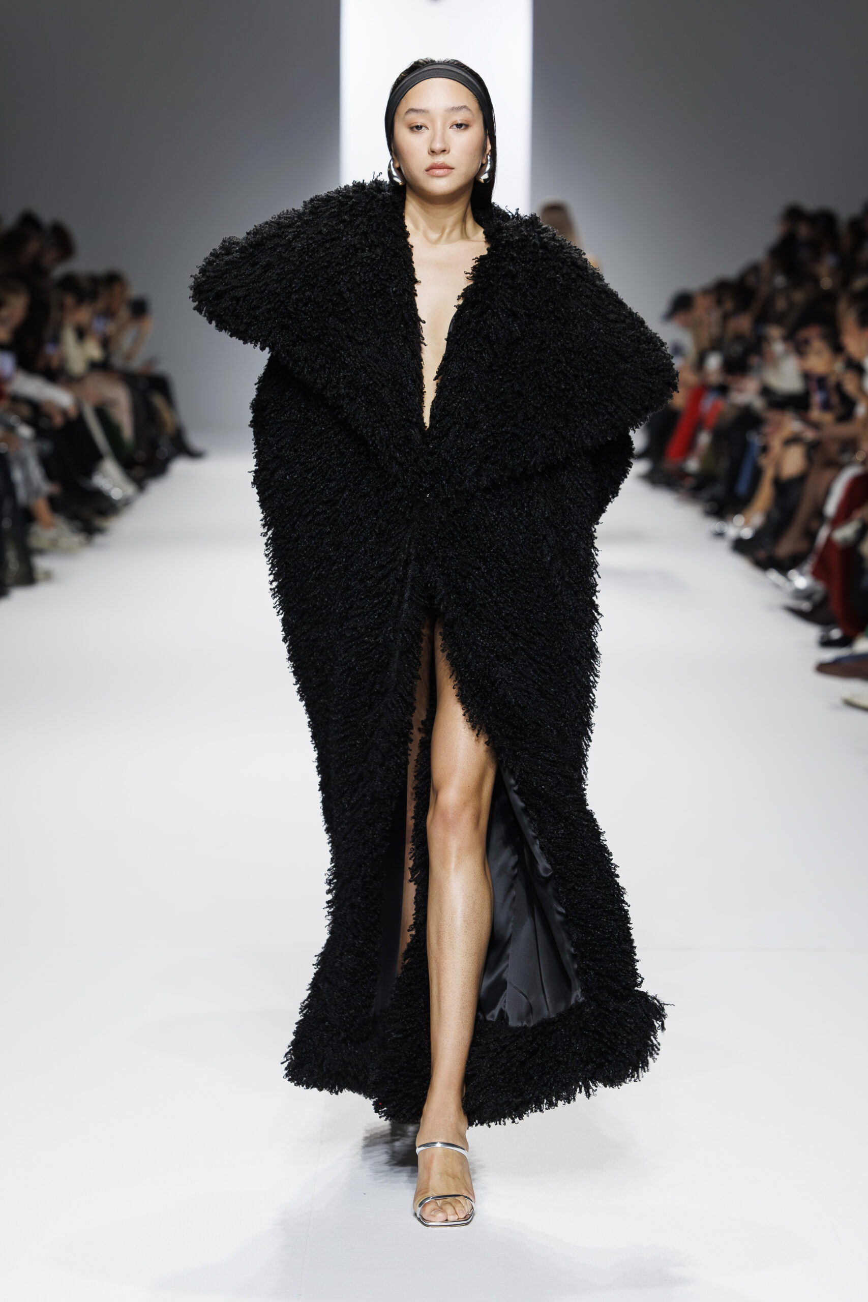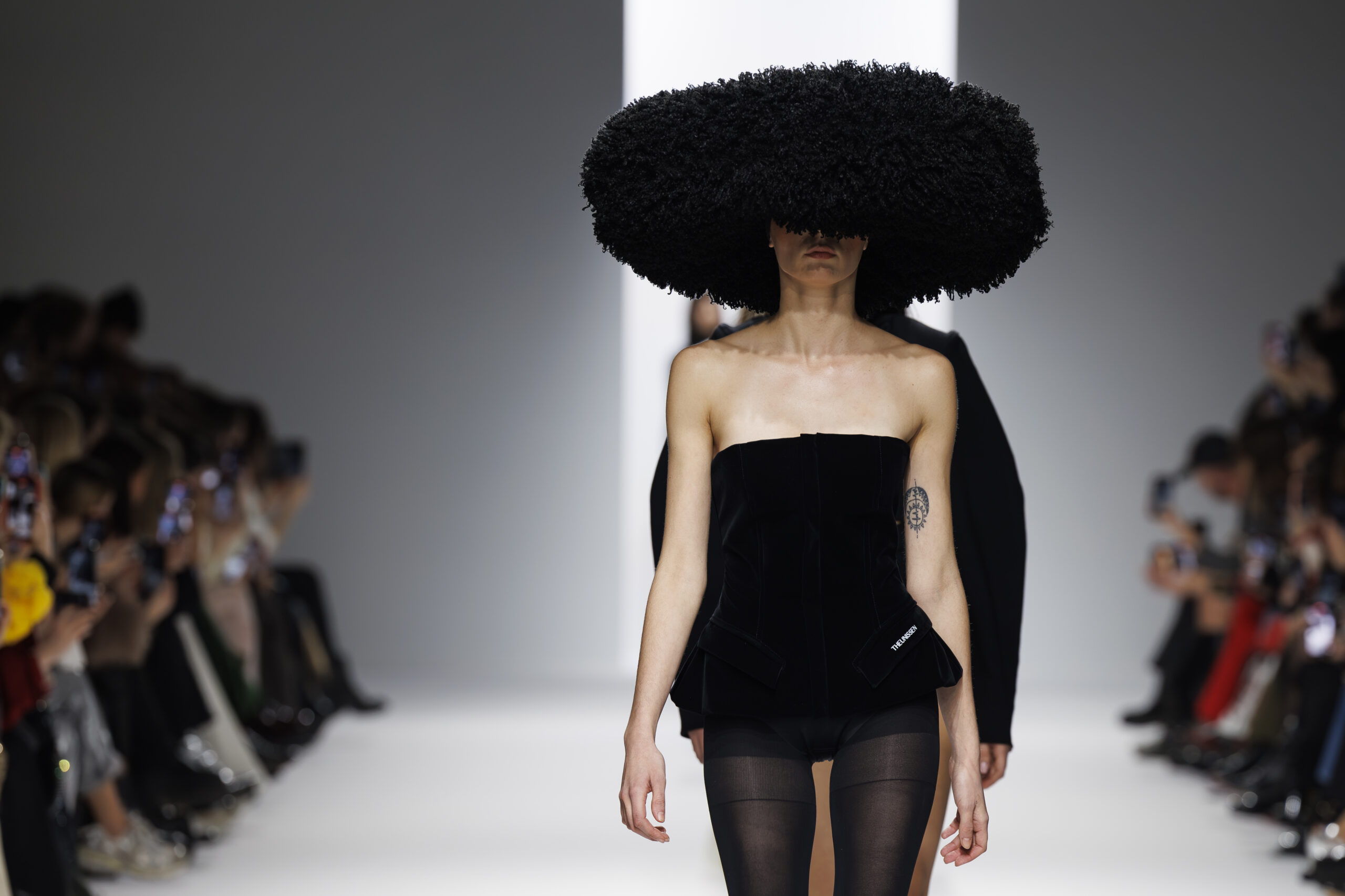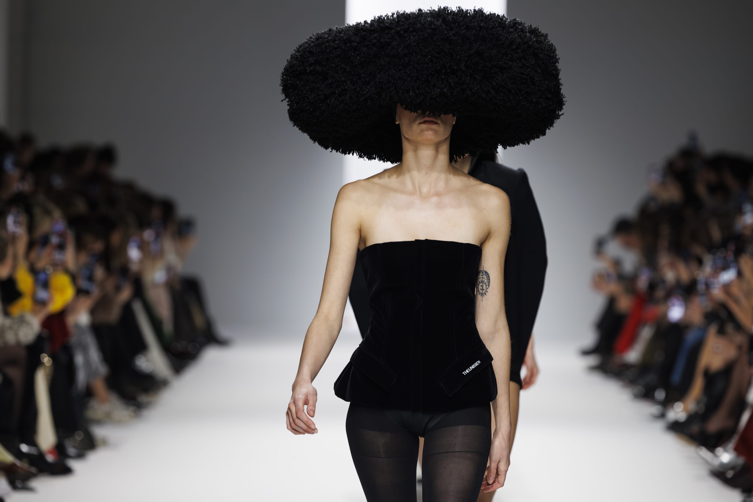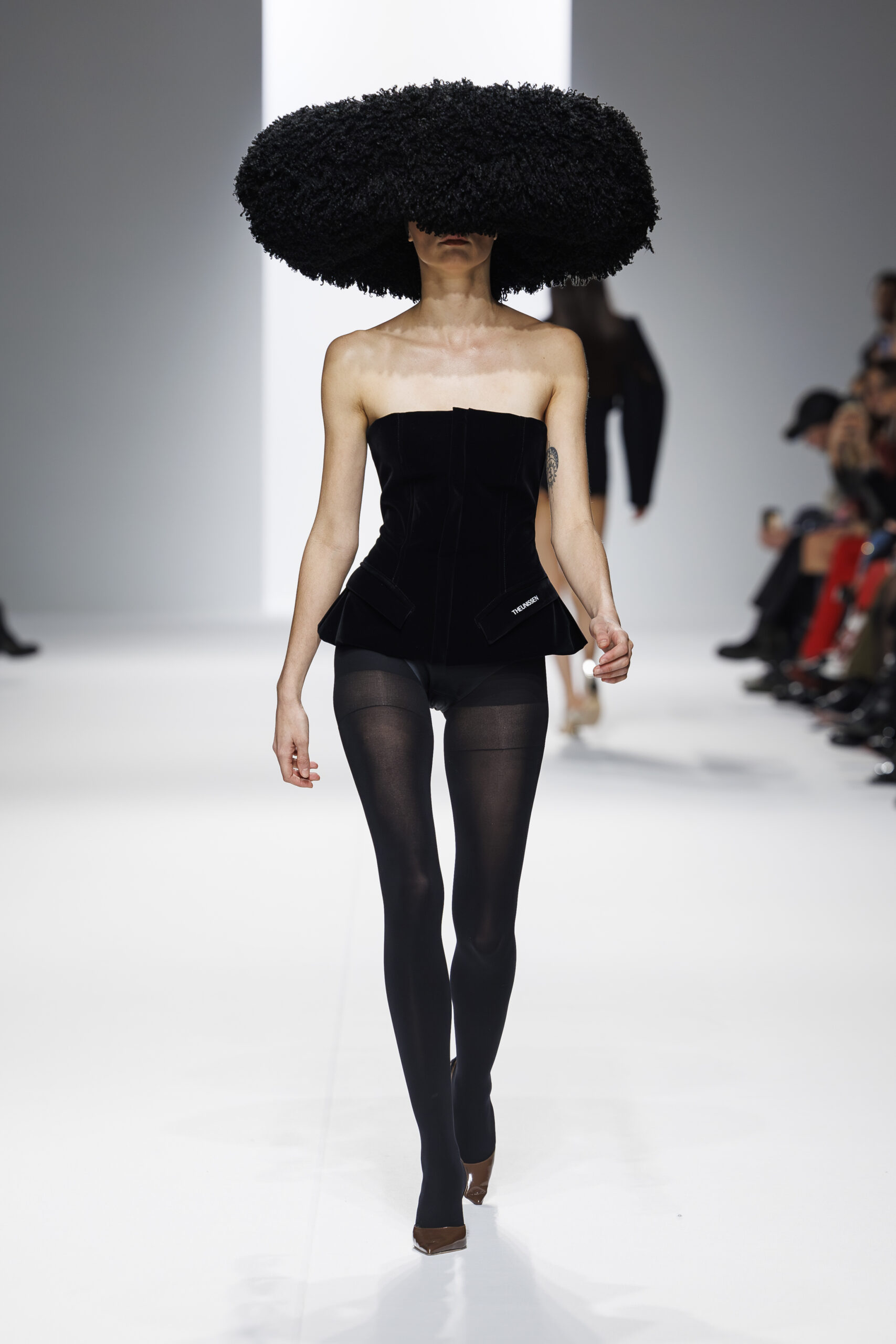 Ariane Theunissen, fidèle à sa vision artistique, continue d’explorer l’image de la femme moderne à travers des pièces où la rigueur des lignes rencontre la fluidité des mouvements. La collection met en lumière un jeu de transparence savamment dosé, où les coupes sculpturales soulignent avec audace les formes du corps. Cette saison, l’ajout d’accessoires surprenants, tels que des chapeaux en fourrure XXL, vient contraster avec la sobriété des tenues, ajoutant une touche de fantaisie à l’ensemble.