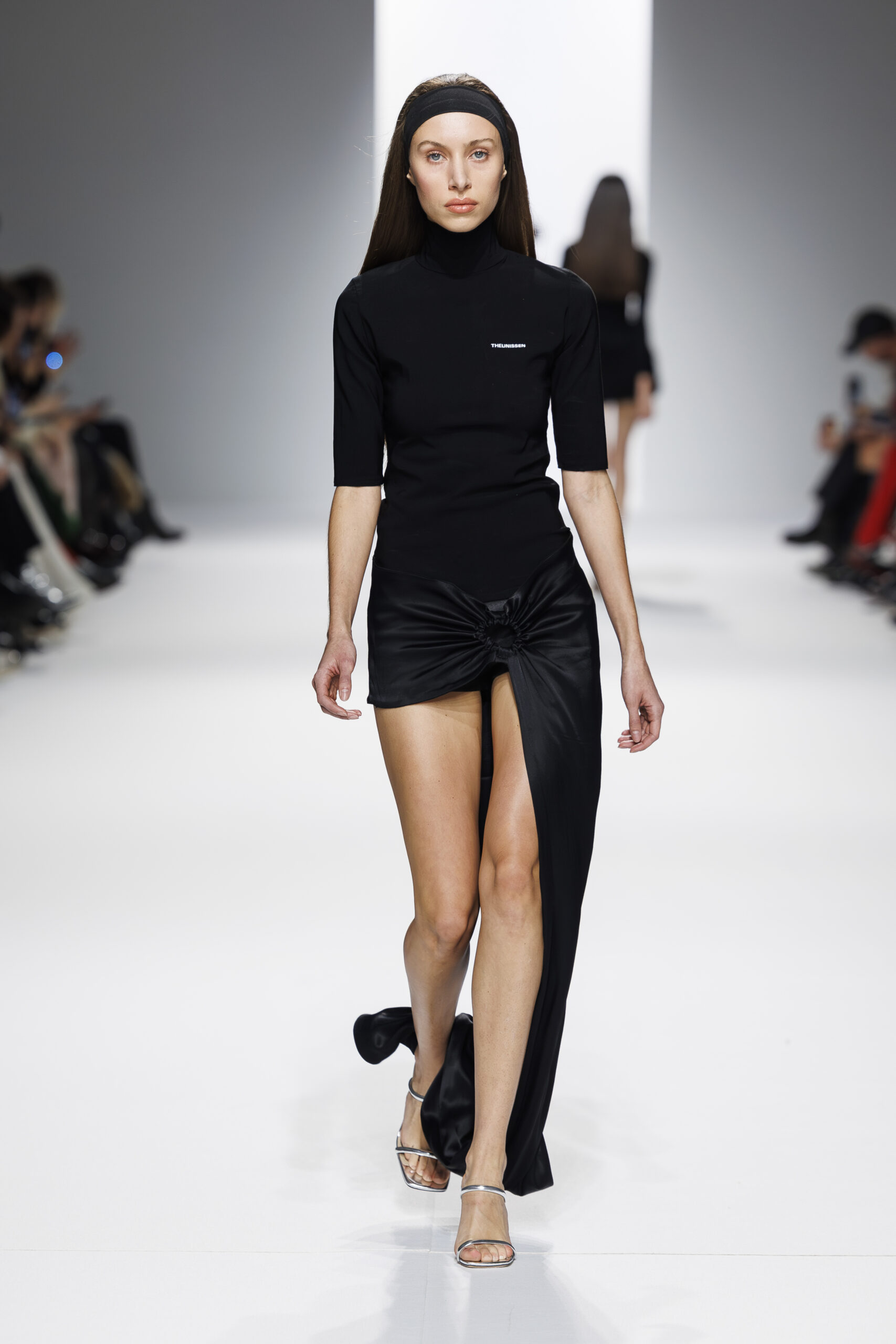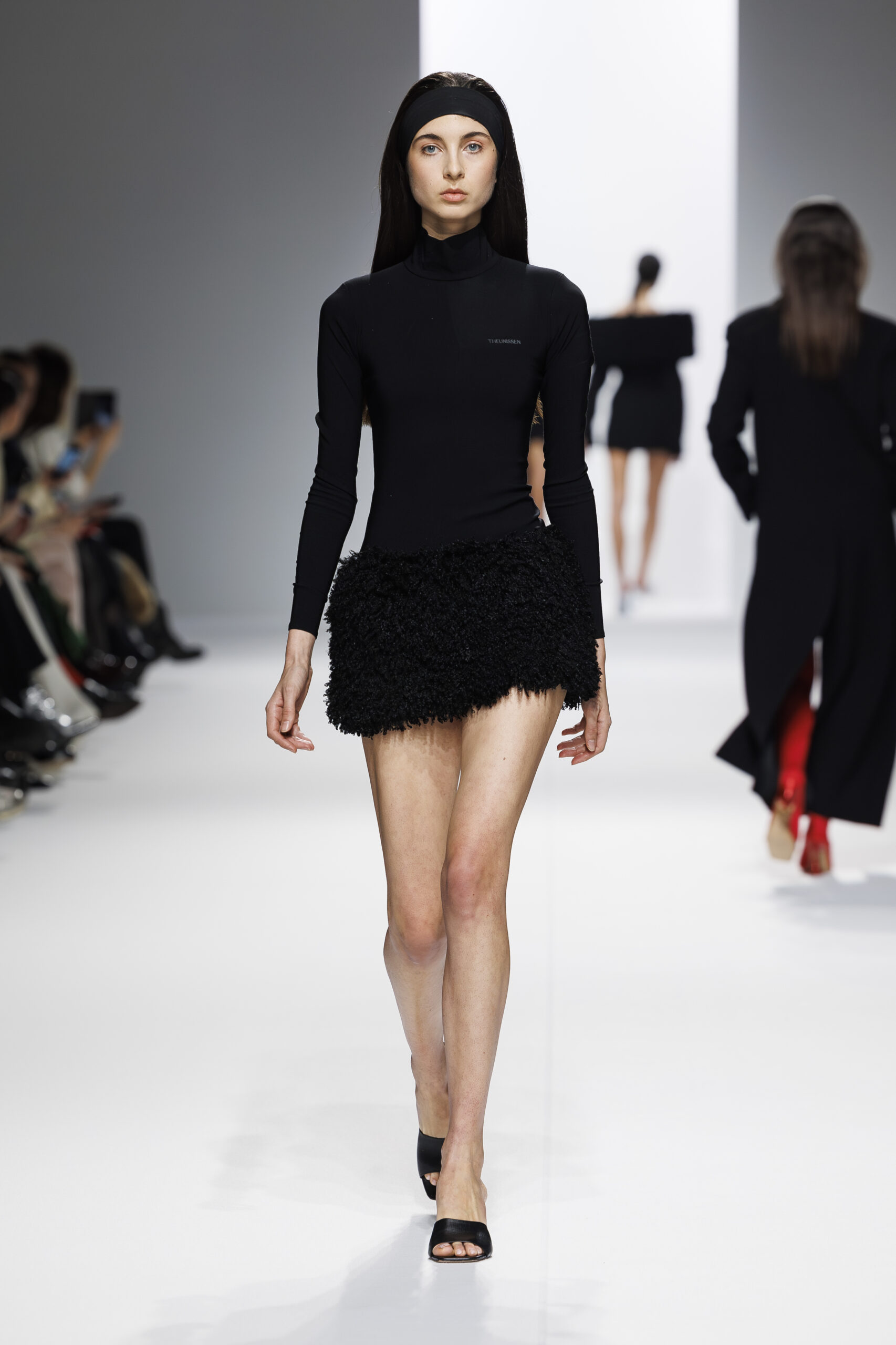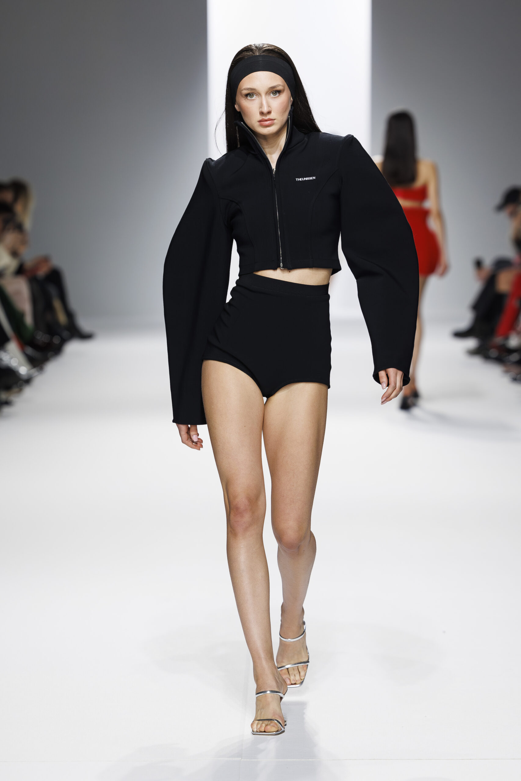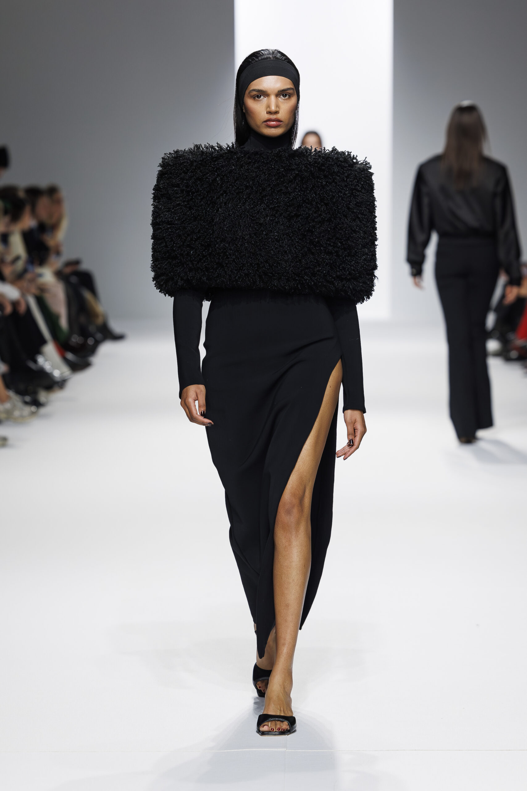 Ariane Theunissen, fidèle à sa vision artistique, continue d’explorer l’image de la femme moderne à travers des pièces où la rigueur des lignes rencontre la fluidité des mouvements. La collection met en lumière un jeu de transparence savamment dosé, où les coupes sculpturales soulignent avec audace les formes du corps. Cette saison, l’ajout d’accessoires surprenants, tels que des chapeaux en fourrure XXL, vient contraster avec la sobriété des tenues, ajoutant une touche de fantaisie à l’ensemble.