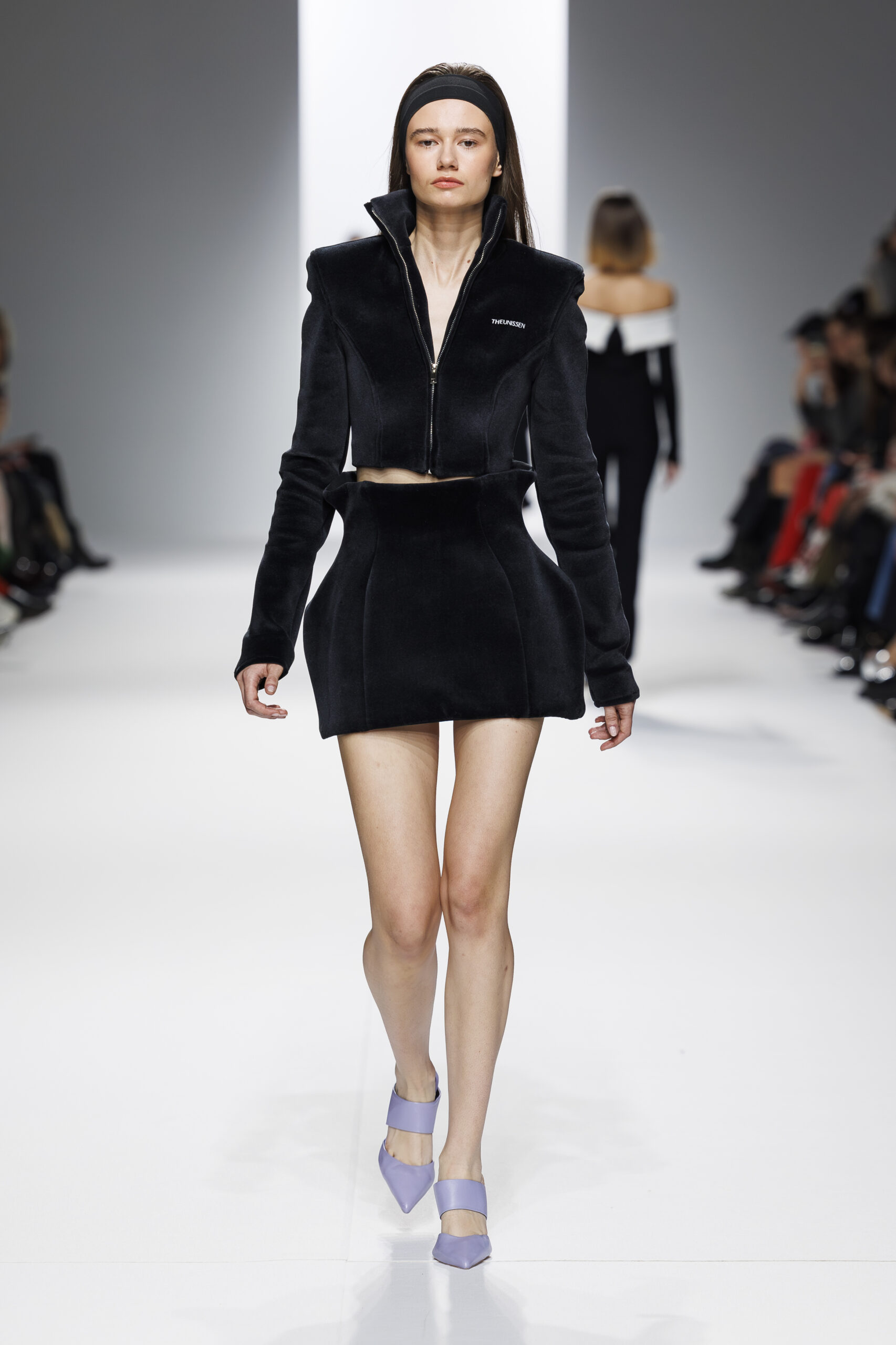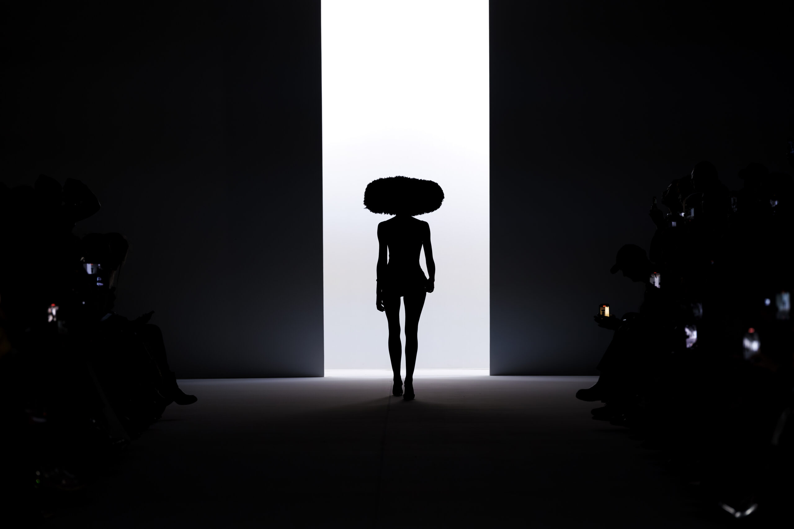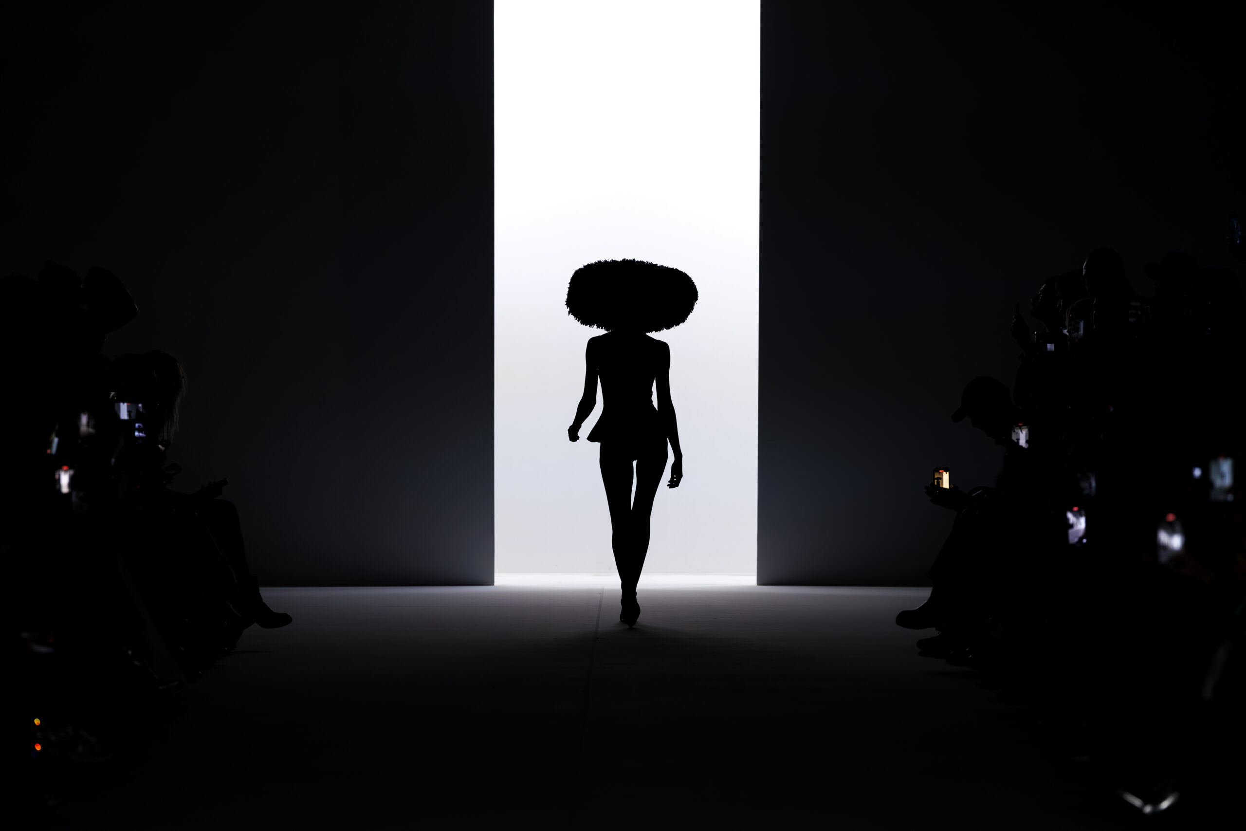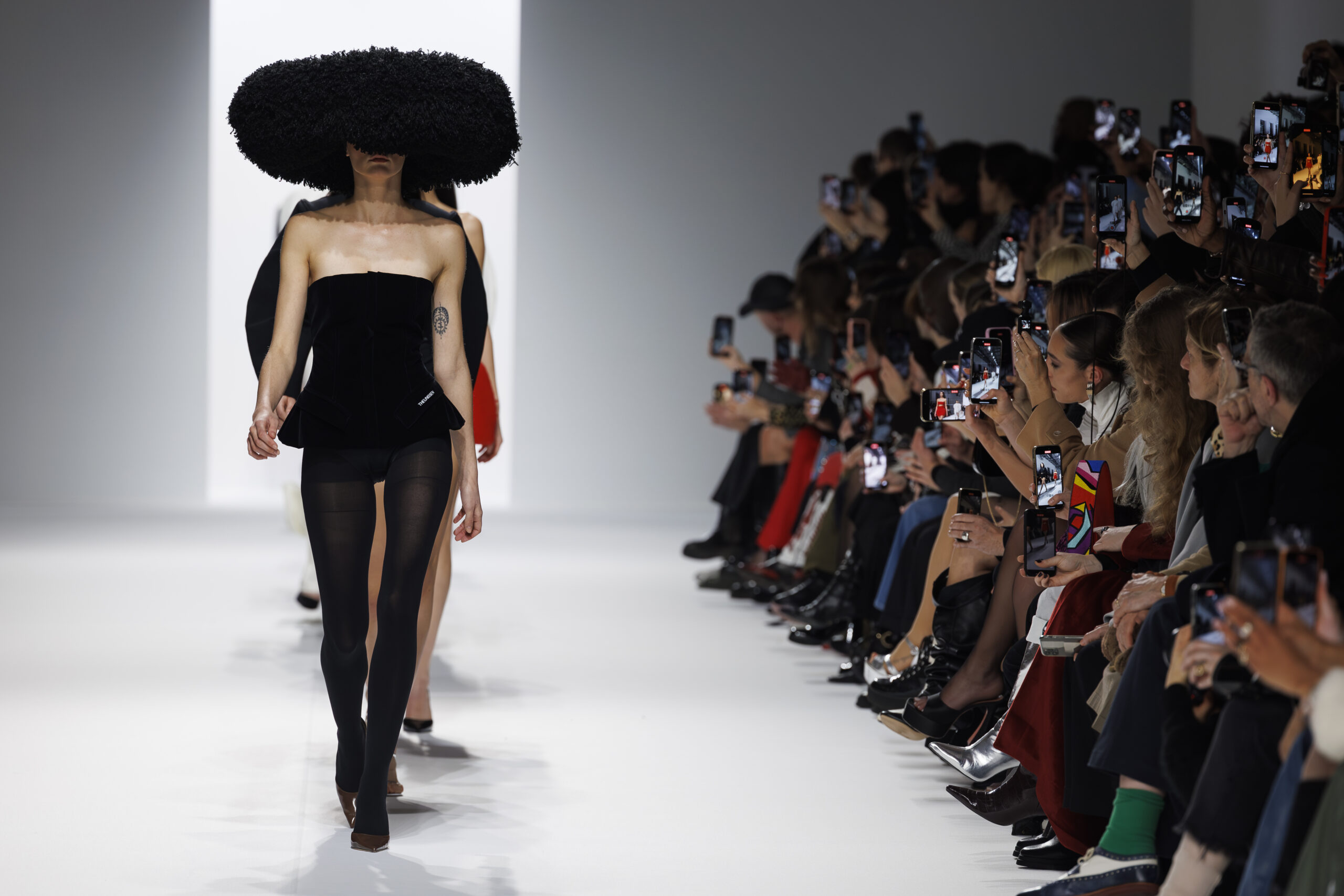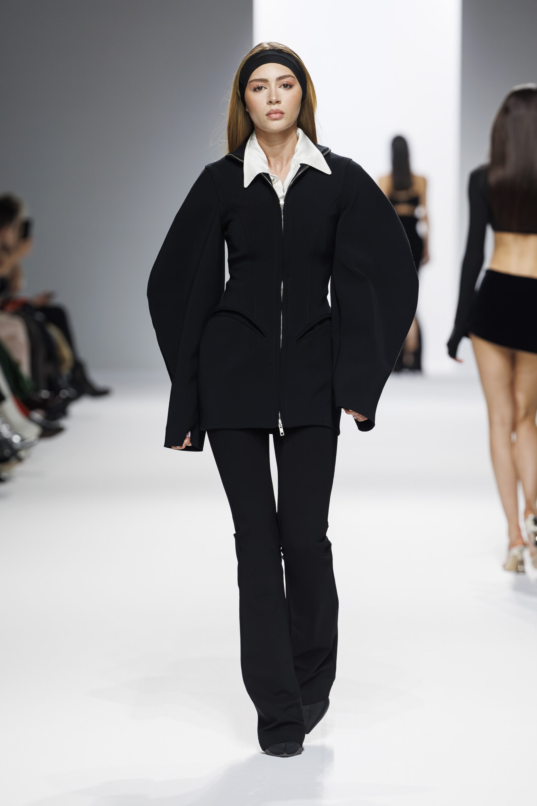 Ariane Theunissen, fidèle à sa vision artistique, continue d’explorer l’image de la femme moderne à travers des pièces où la rigueur des lignes rencontre la fluidité des mouvements. La collection met en lumière un jeu de transparence savamment dosé, où les coupes sculpturales soulignent avec audace les formes du corps. Cette saison, l’ajout d’accessoires surprenants, tels que des chapeaux en fourrure XXL, vient contraster avec la sobriété des tenues, ajoutant une touche de fantaisie à l’ensemble.