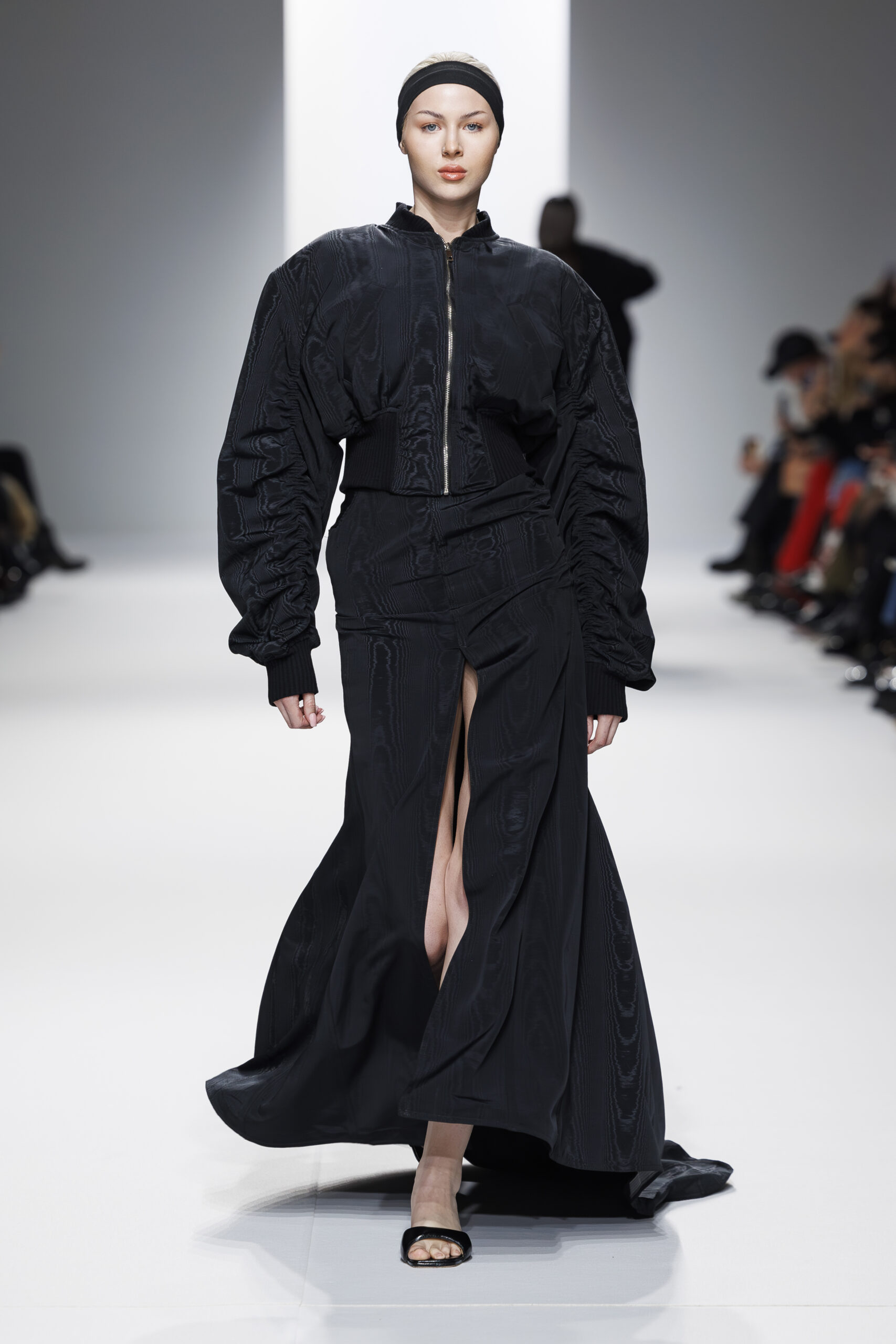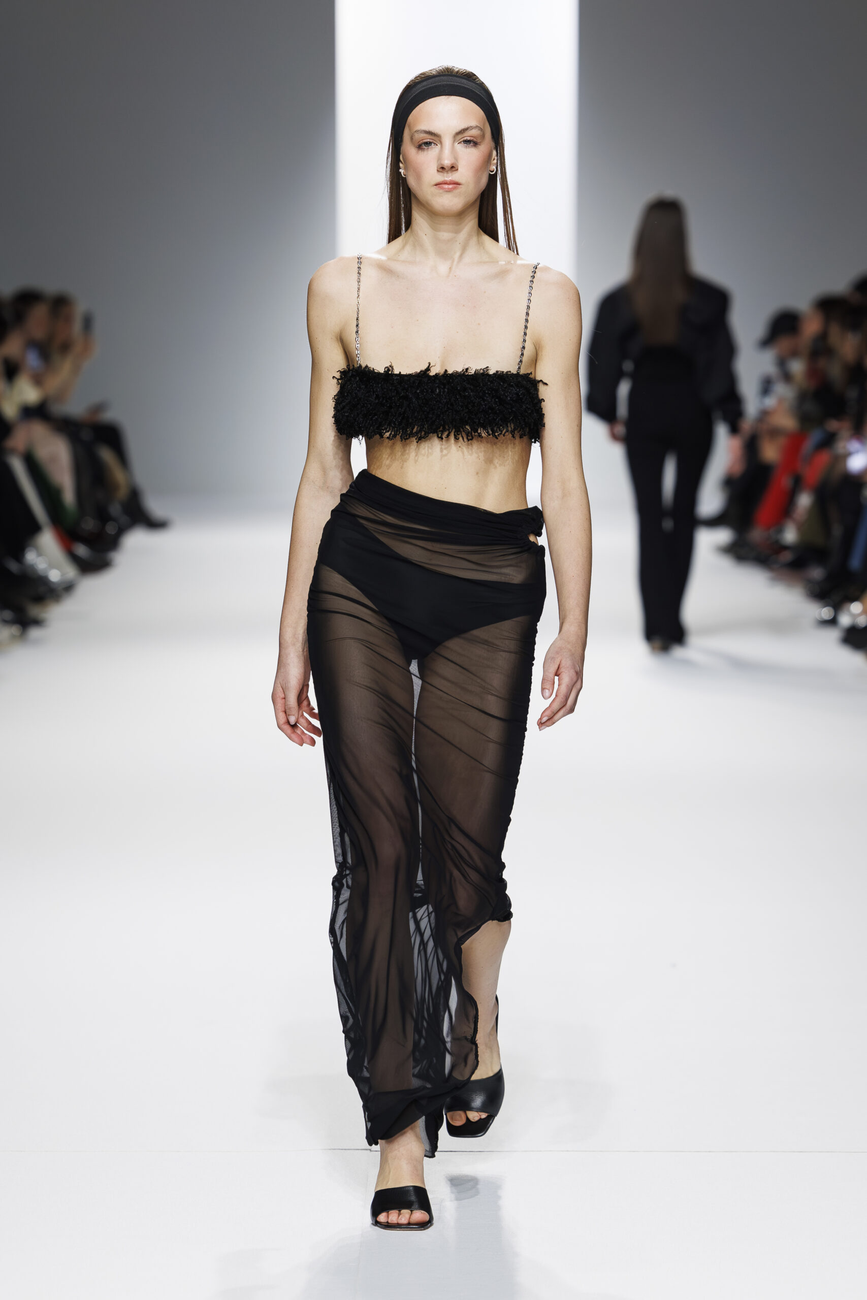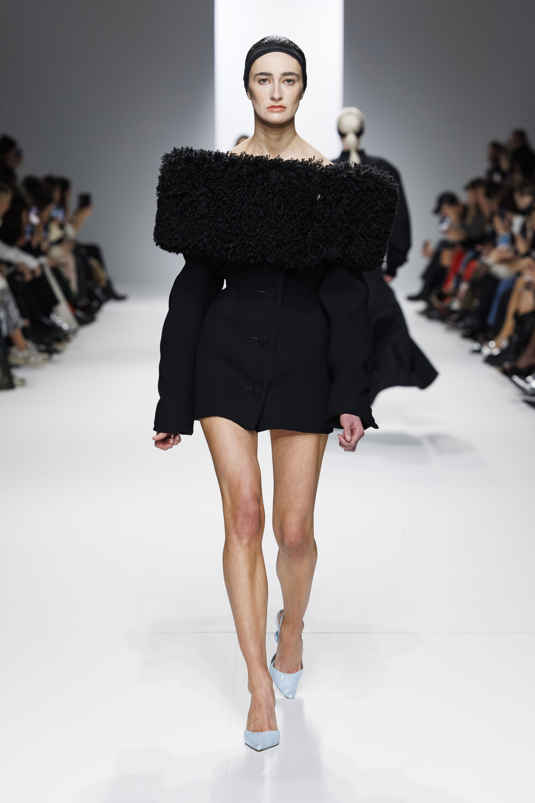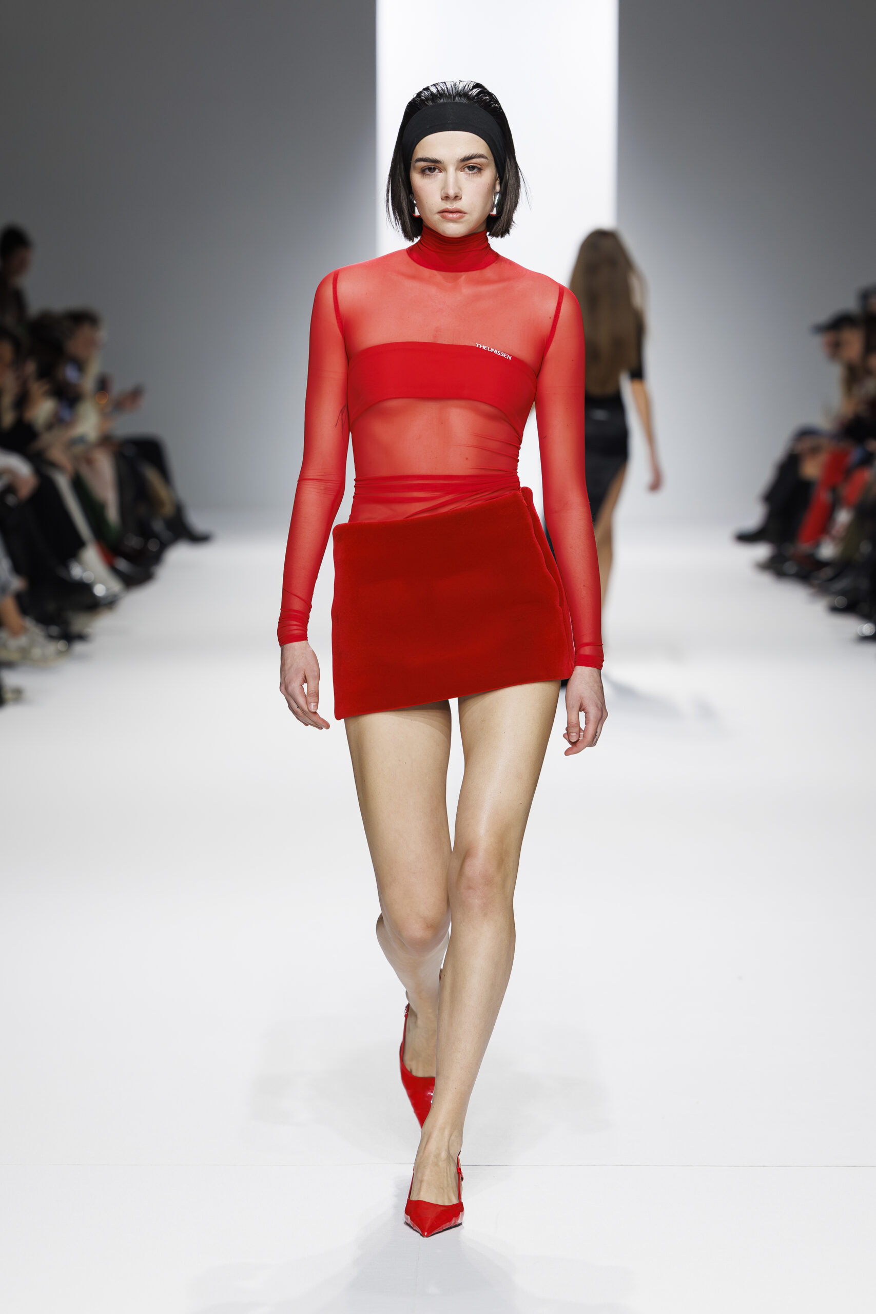 Ariane Theunissen, fidèle à sa vision artistique, continue d’explorer l’image de la femme moderne à travers des pièces où la rigueur des lignes rencontre la fluidité des mouvements. La collection met en lumière un jeu de transparence savamment dosé, où les coupes sculpturales soulignent avec audace les formes du corps. Cette saison, l’ajout d’accessoires surprenants, tels que des chapeaux en fourrure XXL, vient contraster avec la sobriété des tenues, ajoutant une touche de fantaisie à l’ensemble.