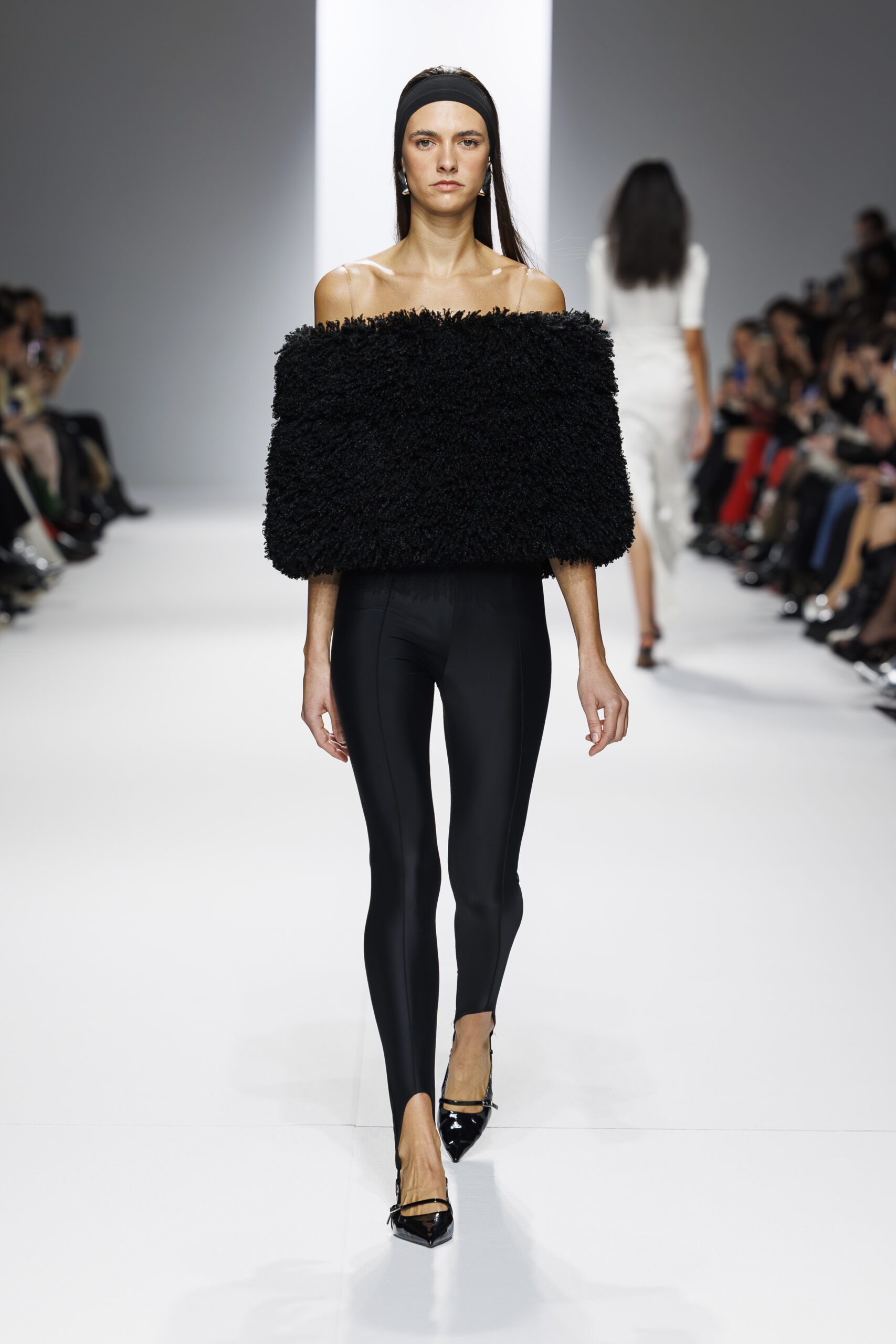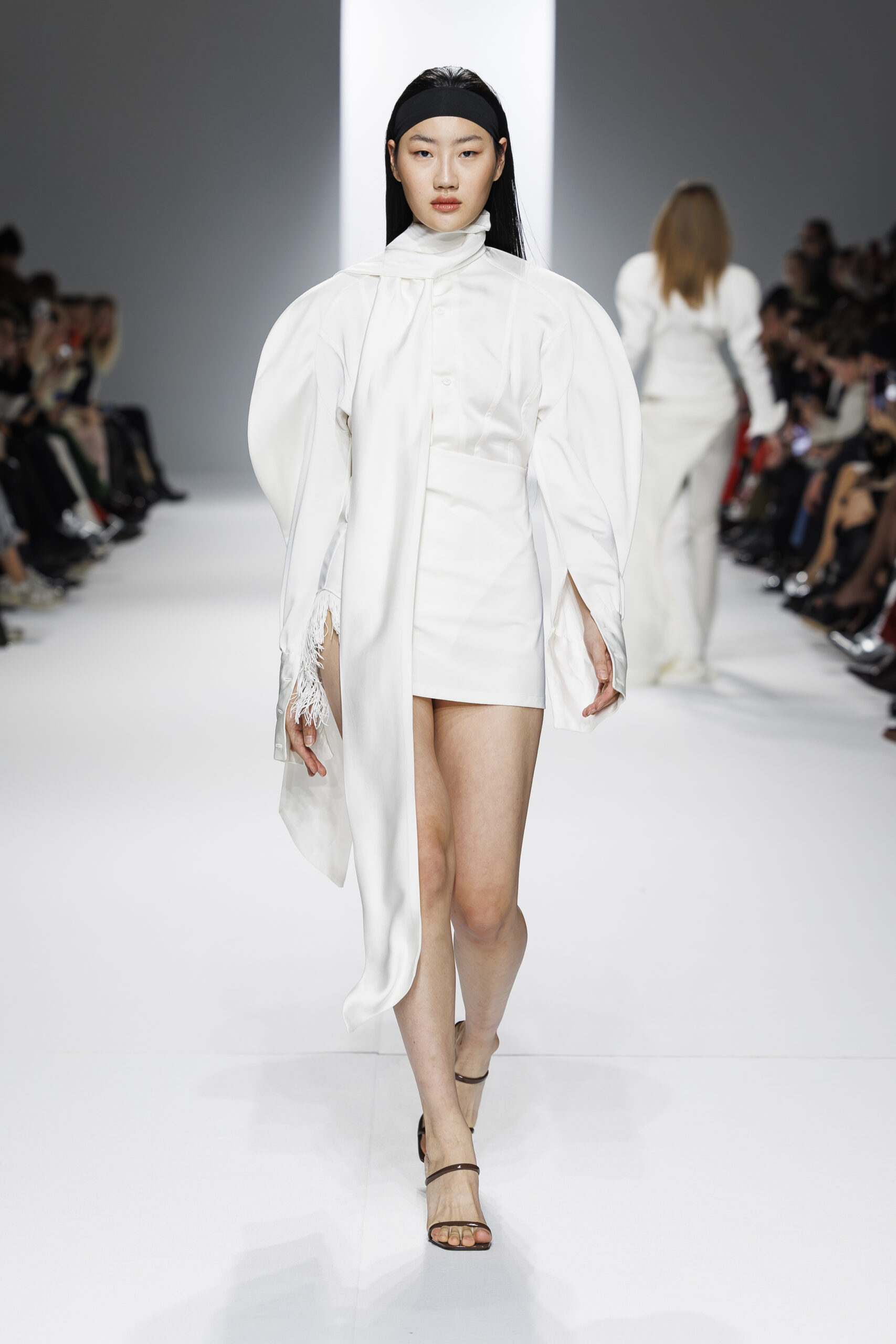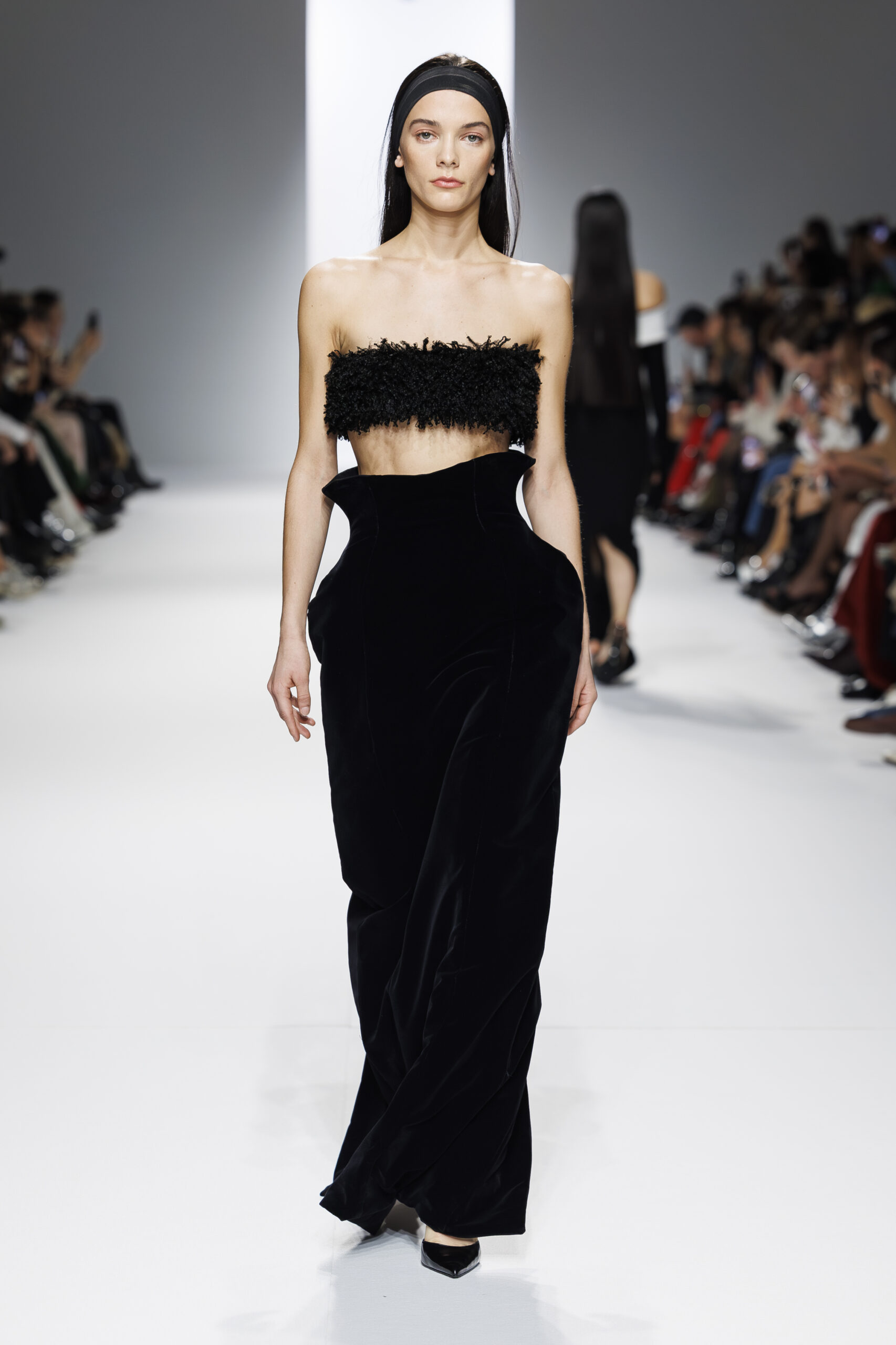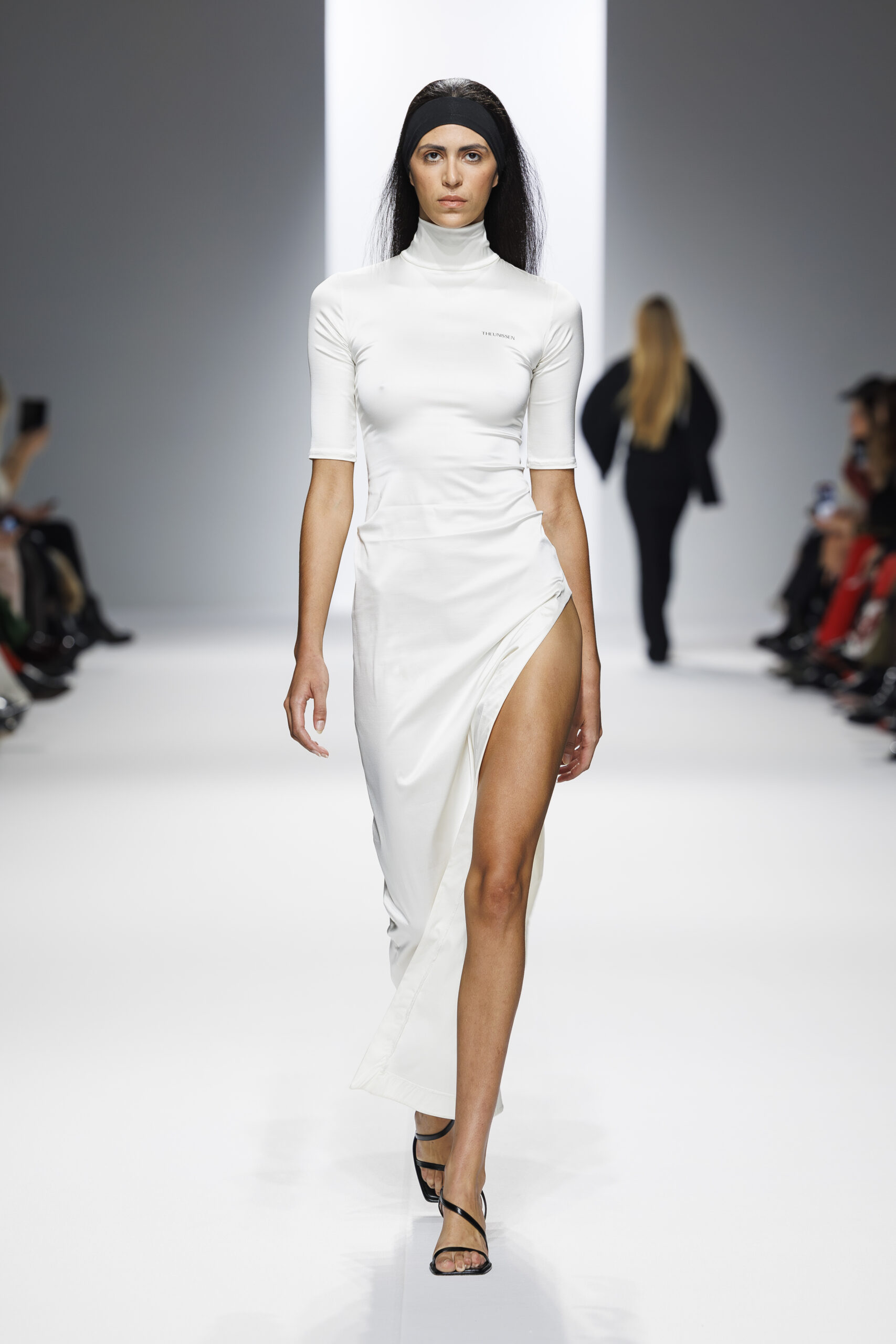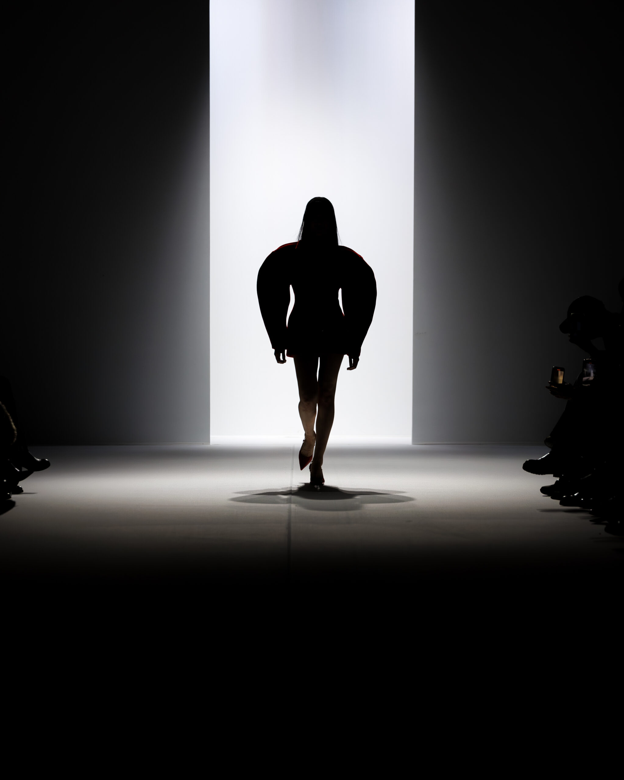 Ariane Theunissen, fidèle à sa vision artistique, continue d’explorer l’image de la femme moderne à travers des pièces où la rigueur des lignes rencontre la fluidité des mouvements. La collection met en lumière un jeu de transparence savamment dosé, où les coupes sculpturales soulignent avec audace les formes du corps. Cette saison, l’ajout d’accessoires surprenants, tels que des chapeaux en fourrure XXL, vient contraster avec la sobriété des tenues, ajoutant une touche de fantaisie à l’ensemble.