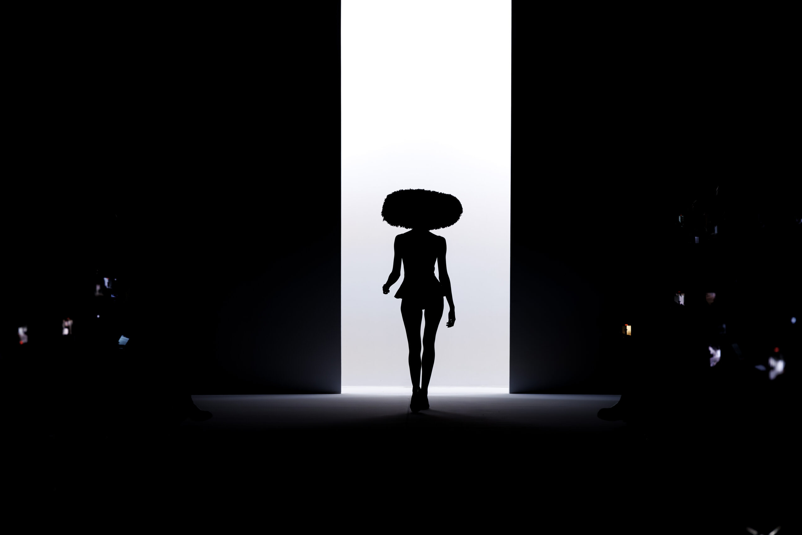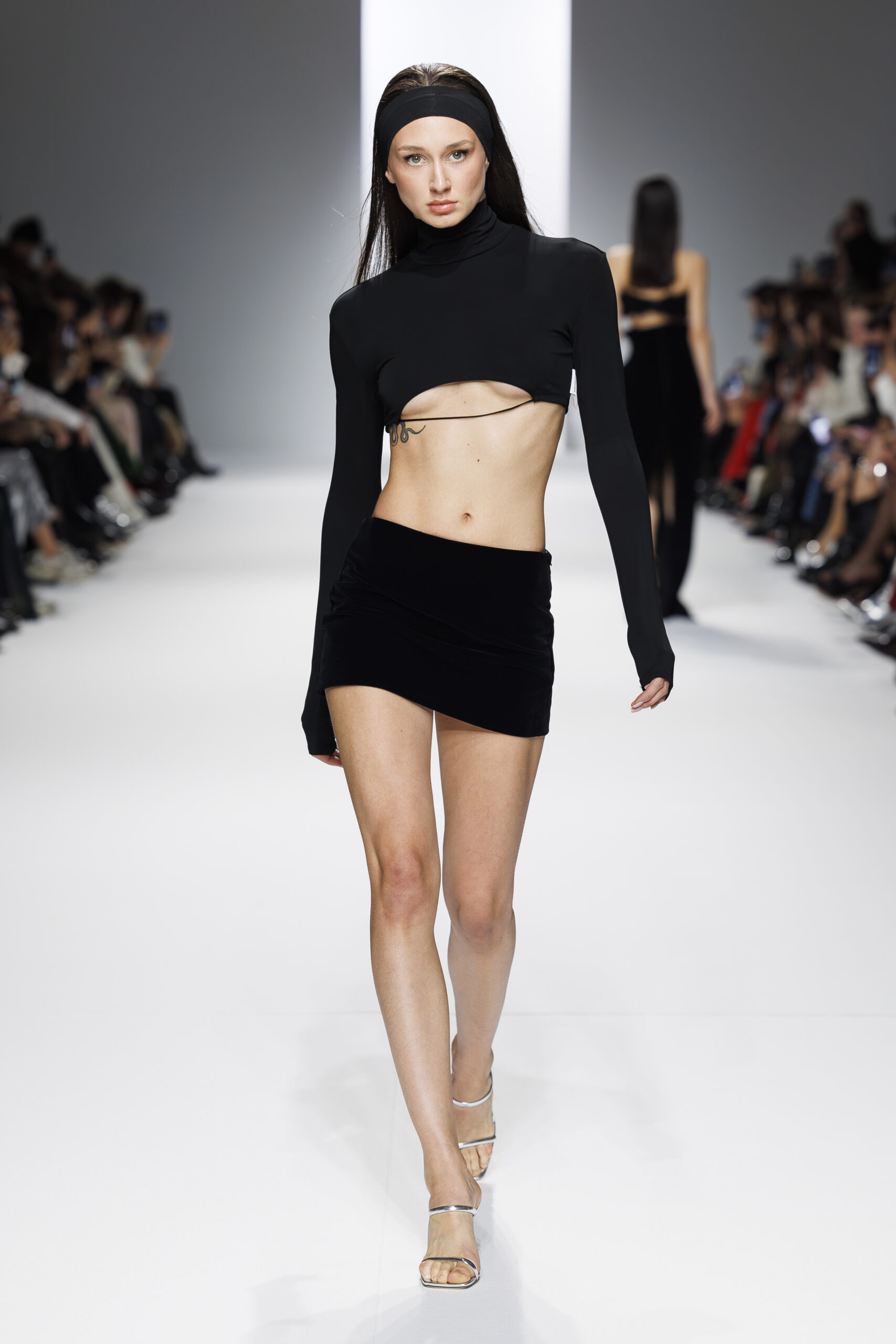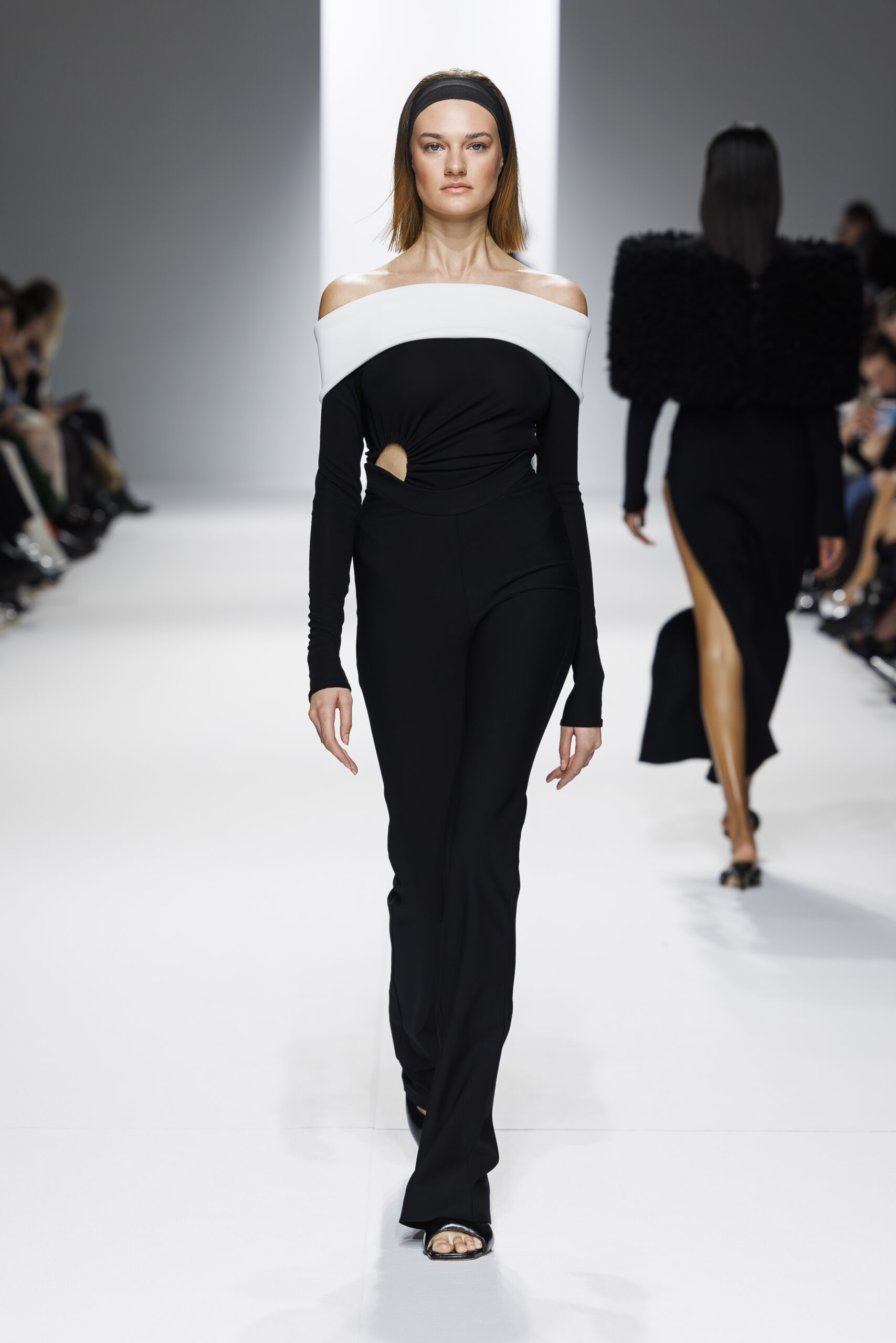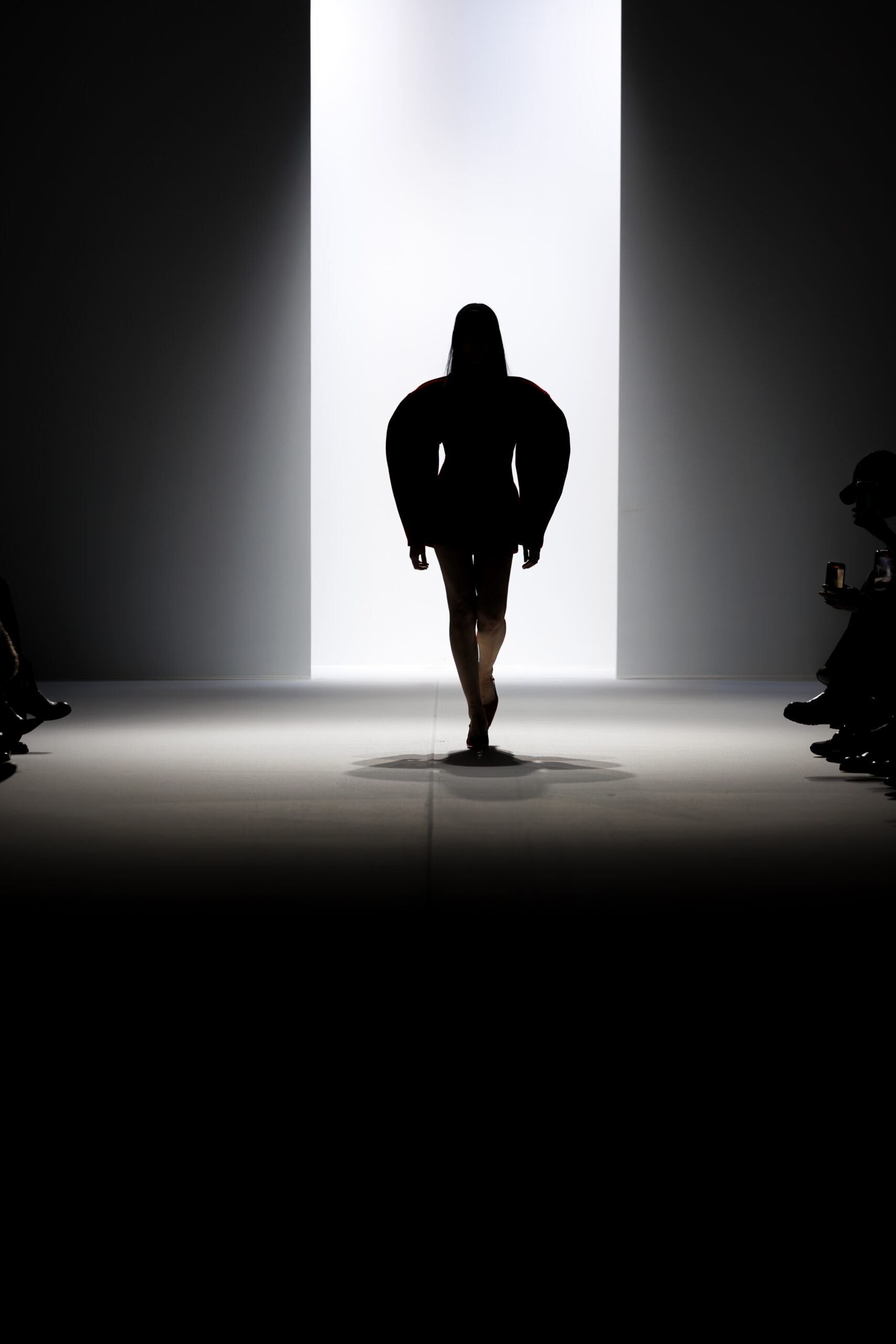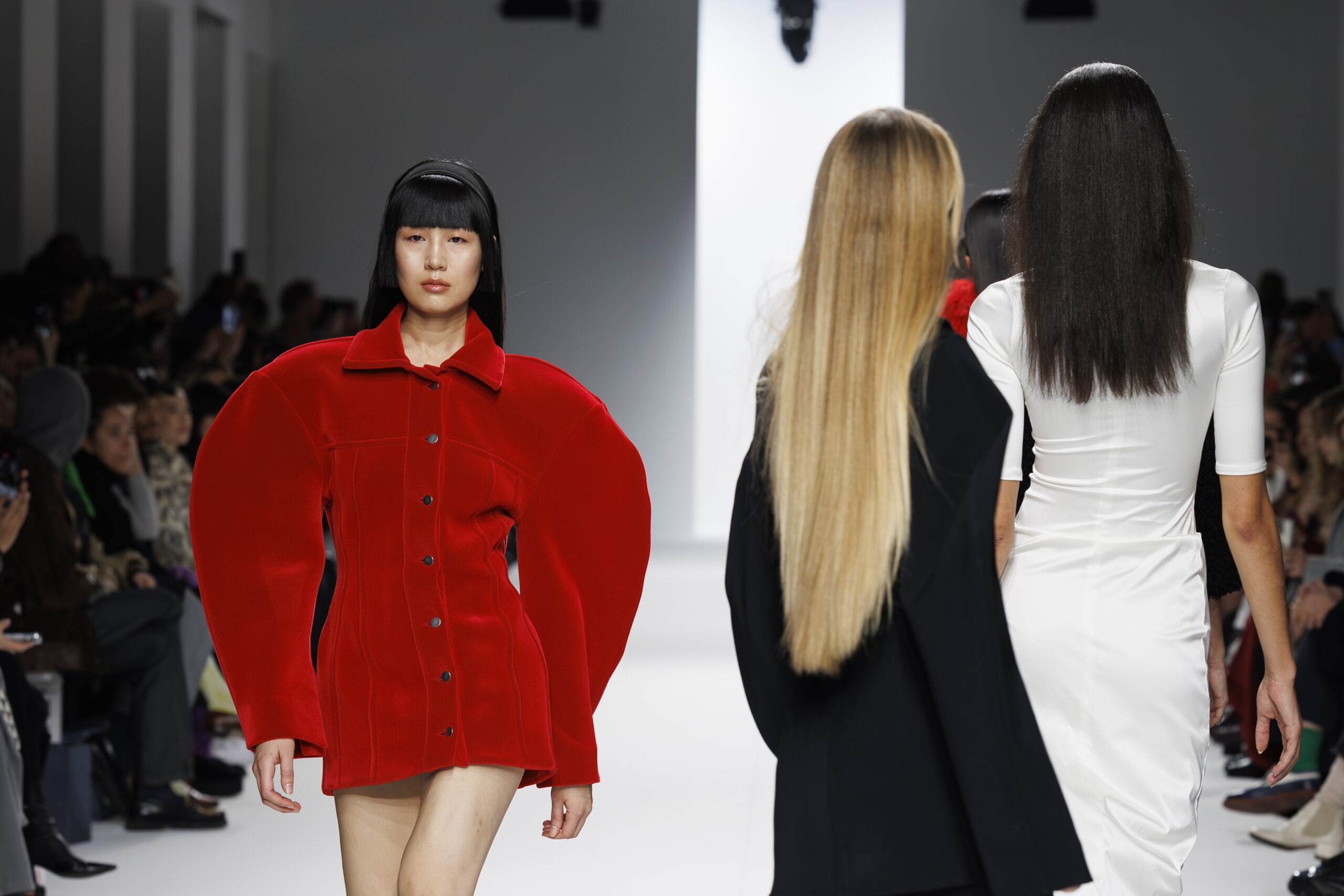 Ariane Theunissen, fidèle à sa vision artistique, continue d’explorer l’image de la femme moderne à travers des pièces où la rigueur des lignes rencontre la fluidité des mouvements. La collection met en lumière un jeu de transparence savamment dosé, où les coupes sculpturales soulignent avec audace les formes du corps. Cette saison, l’ajout d’accessoires surprenants, tels que des chapeaux en fourrure XXL, vient contraster avec la sobriété des tenues, ajoutant une touche de fantaisie à l’ensemble.