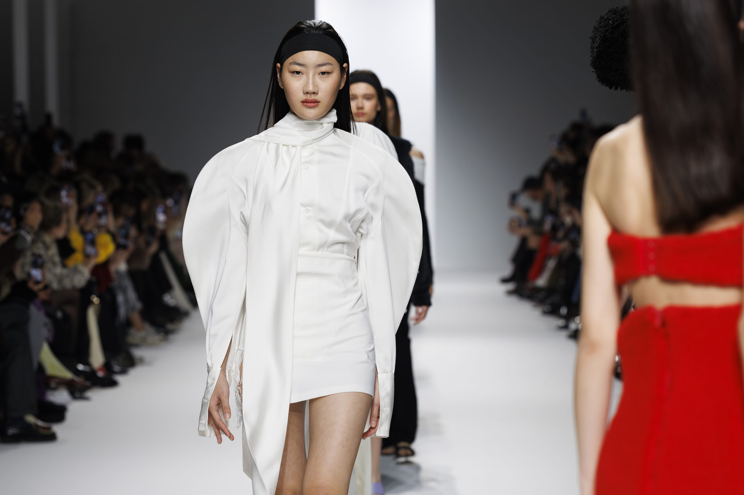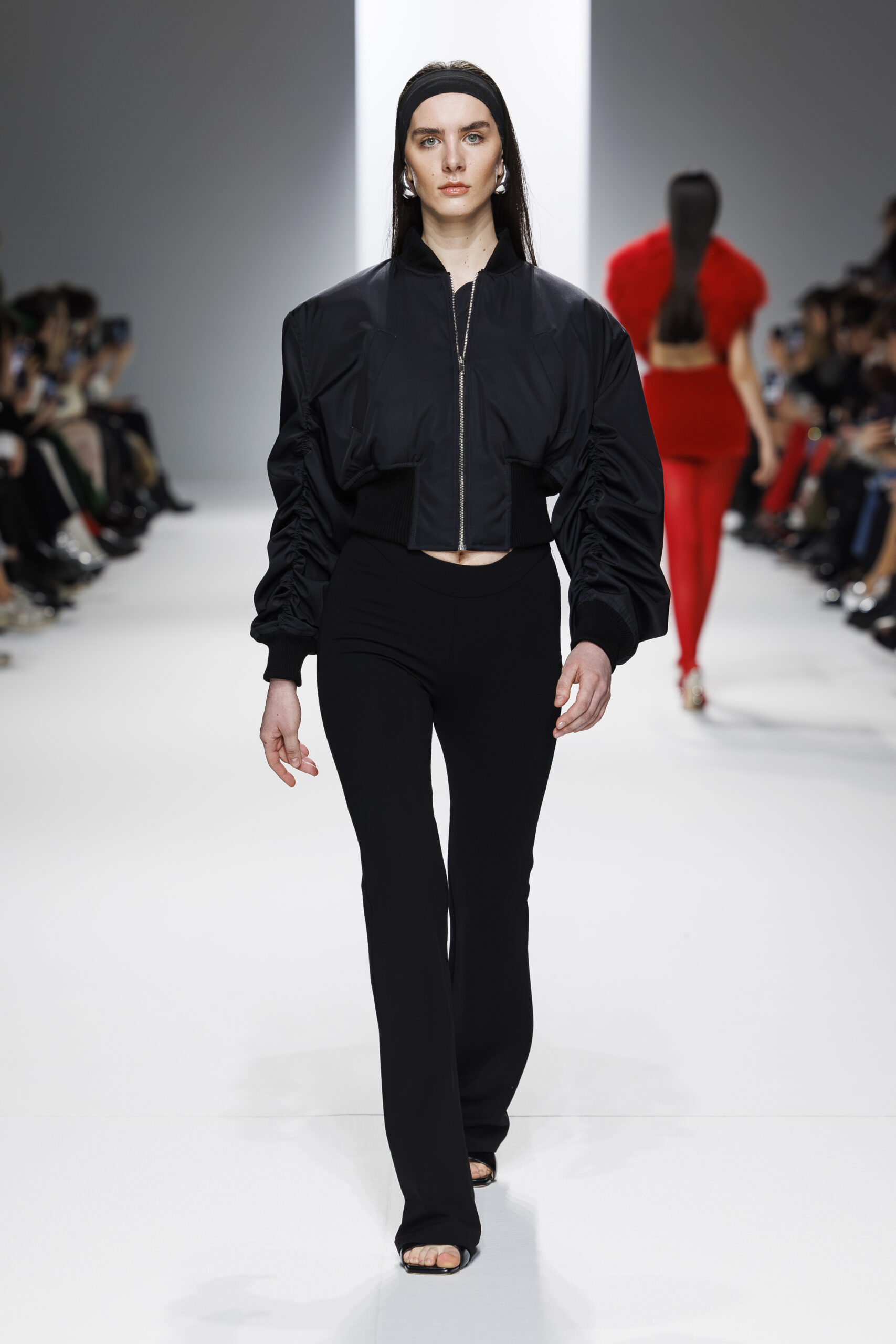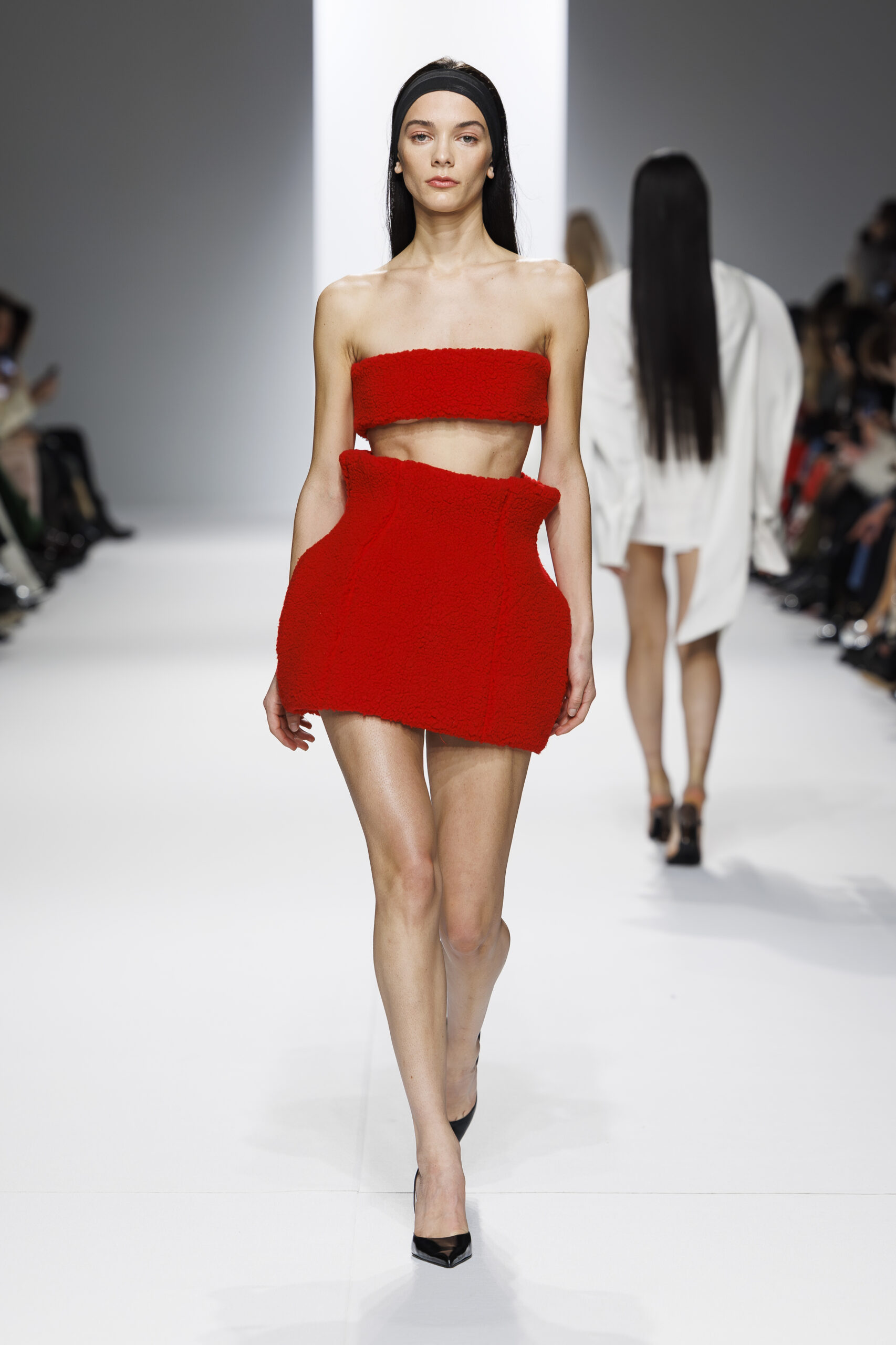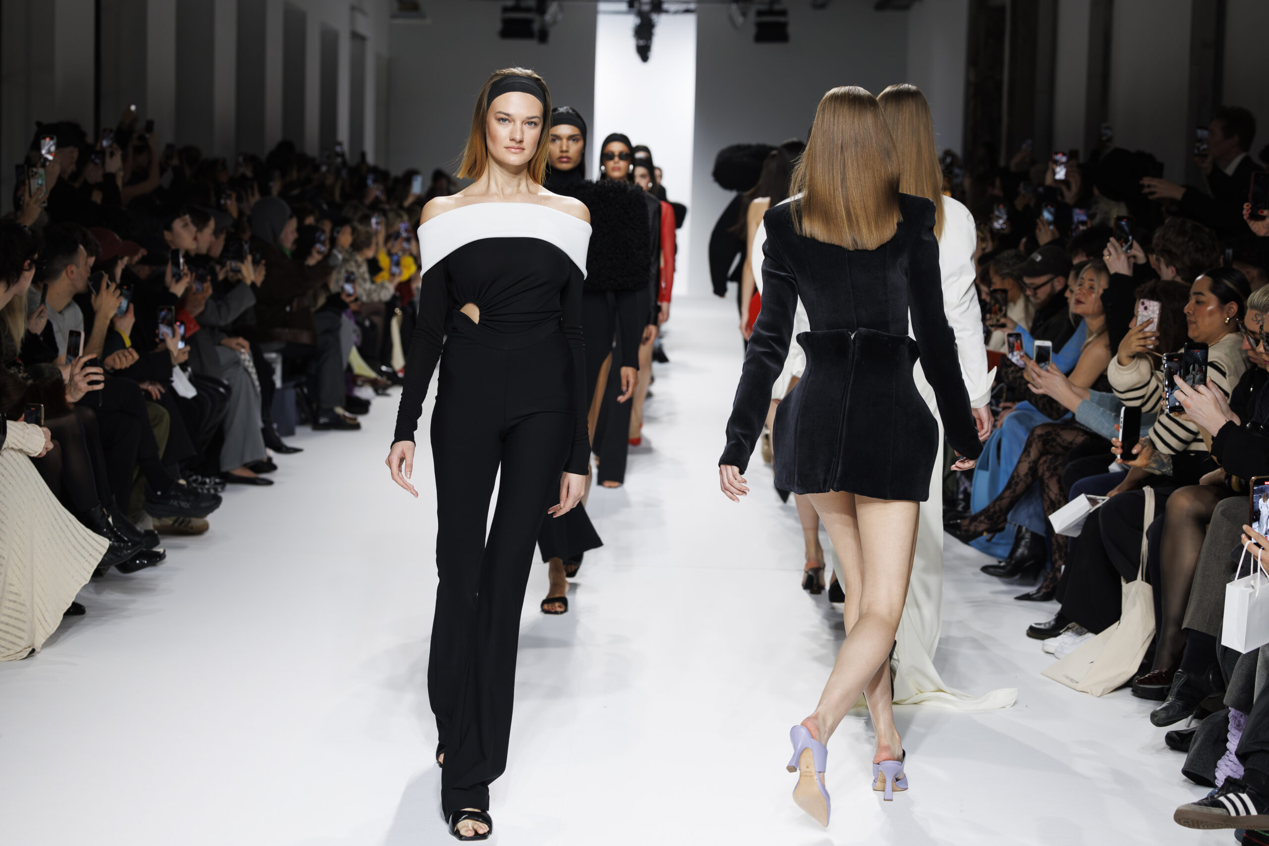 Ariane Theunissen, fidèle à sa vision artistique, continue d’explorer l’image de la femme moderne à travers des pièces où la rigueur des lignes rencontre la fluidité des mouvements. La collection met en lumière un jeu de transparence savamment dosé, où les coupes sculpturales soulignent avec audace les formes du corps. Cette saison, l’ajout d’accessoires surprenants, tels que des chapeaux en fourrure XXL, vient contraster avec la sobriété des tenues, ajoutant une touche de fantaisie à l’ensemble.