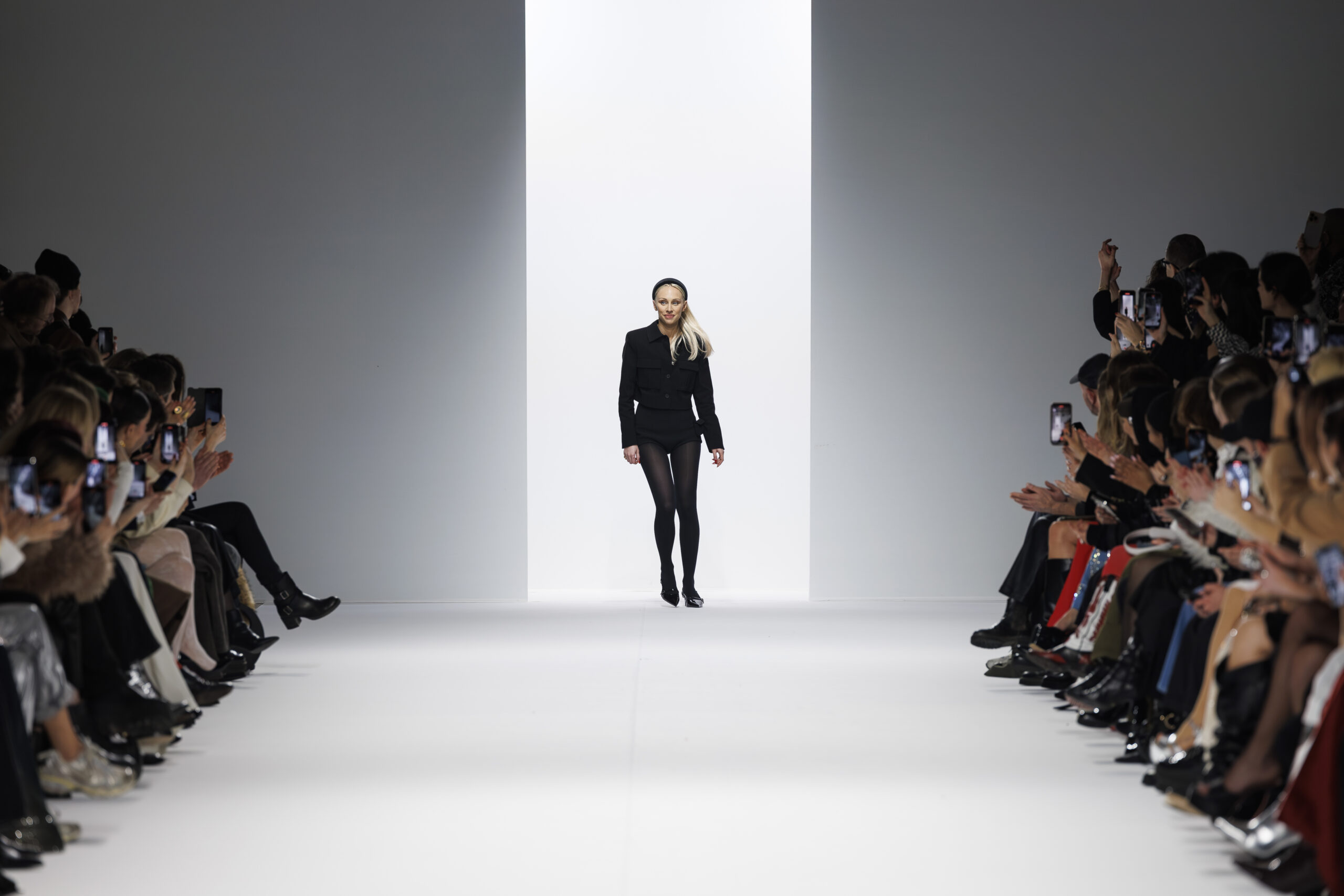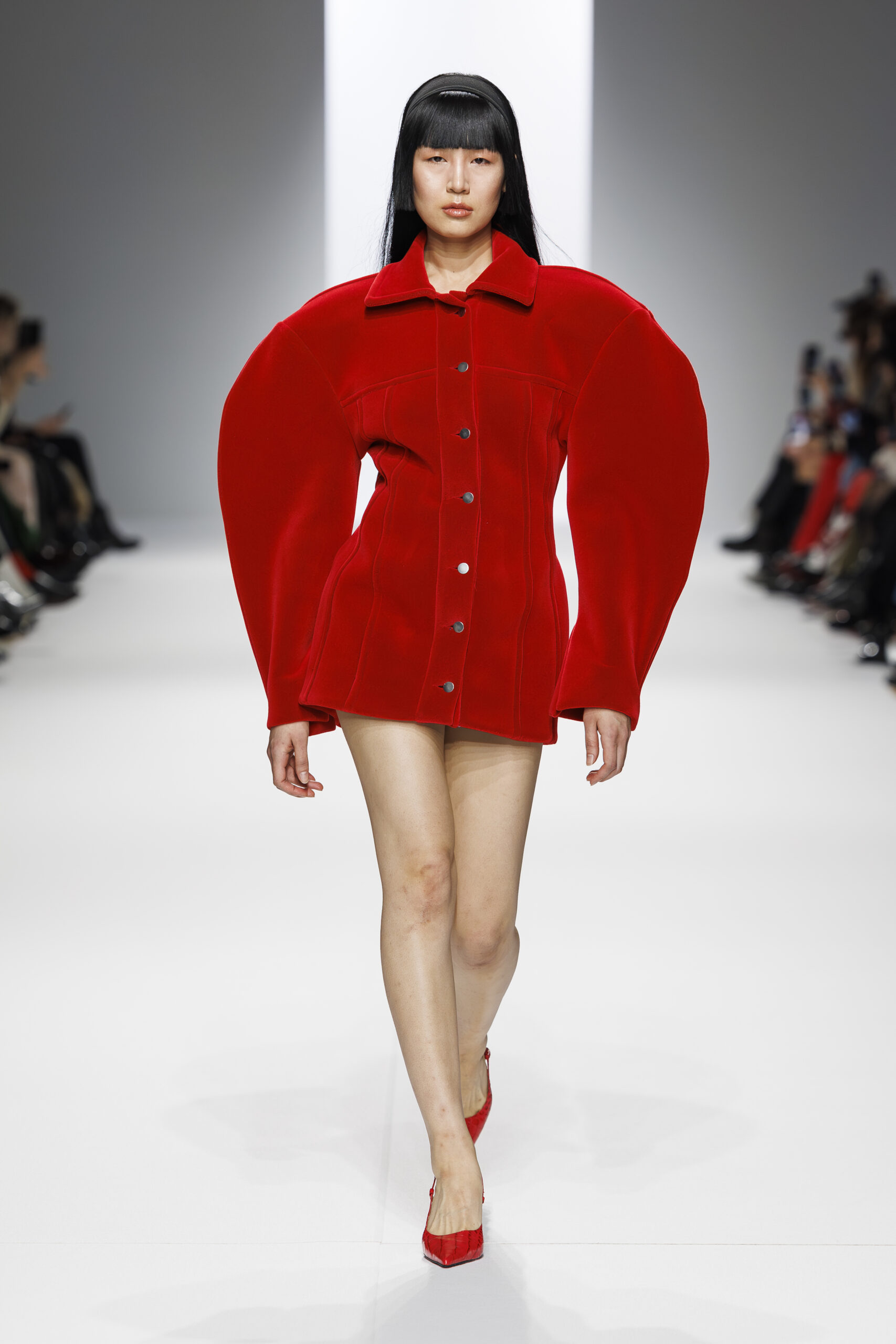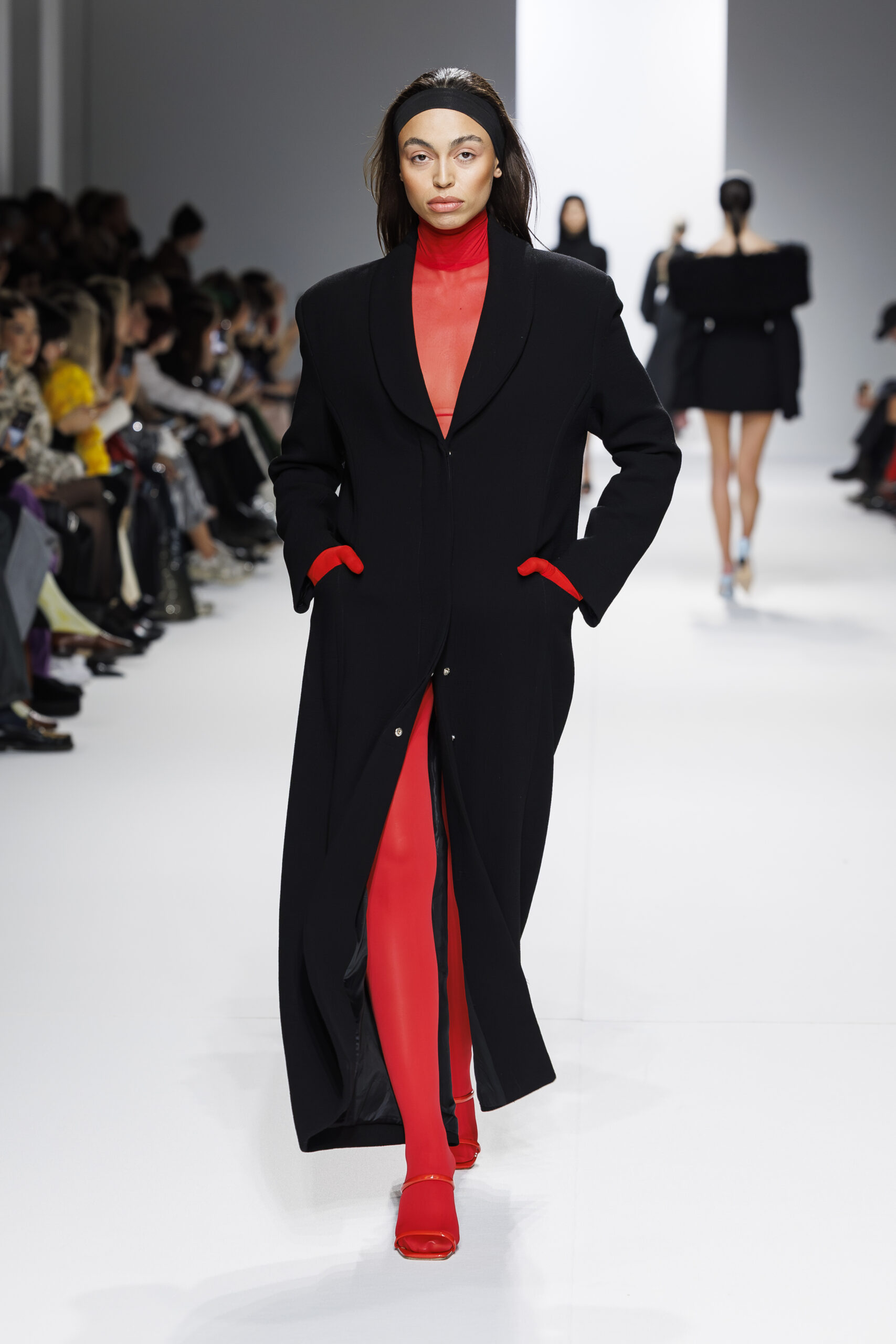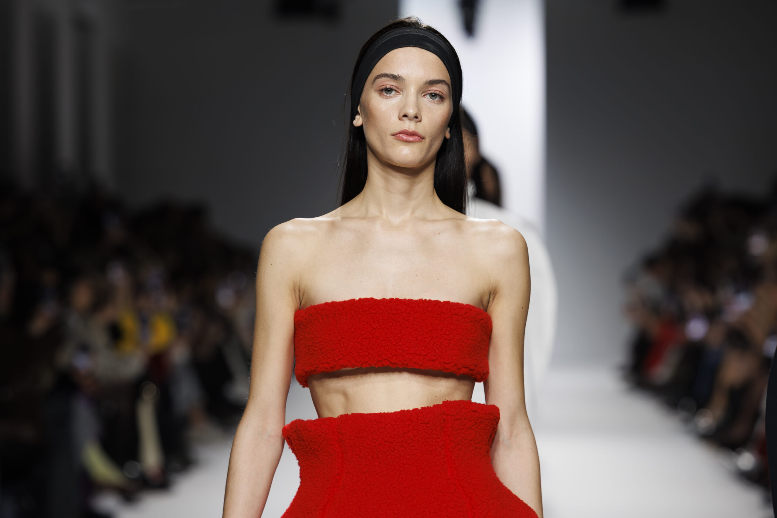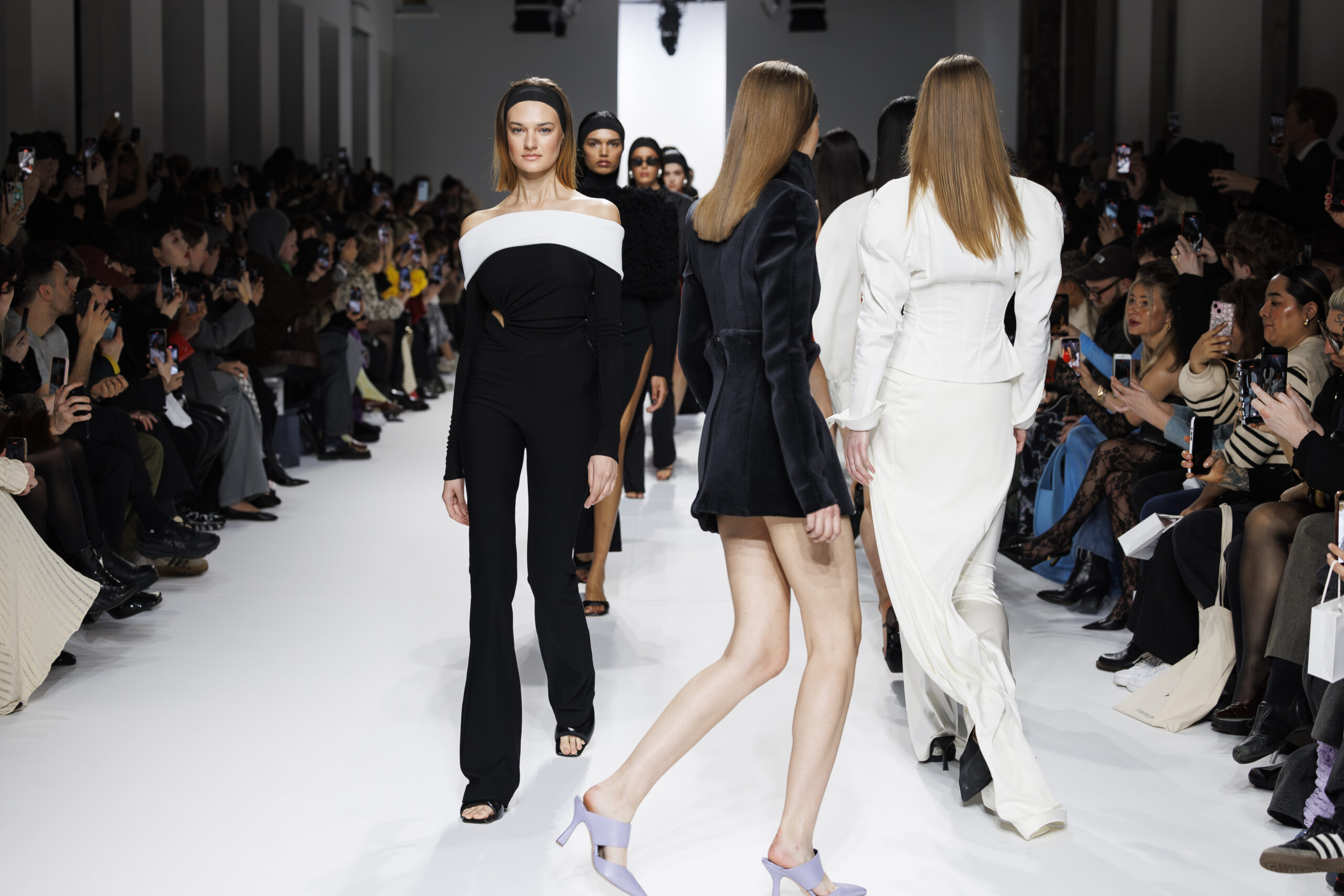 Ariane Theunissen, fidèle à sa vision artistique, continue d’explorer l’image de la femme moderne à travers des pièces où la rigueur des lignes rencontre la fluidité des mouvements. La collection met en lumière un jeu de transparence savamment dosé, où les coupes sculpturales soulignent avec audace les formes du corps. Cette saison, l’ajout d’accessoires surprenants, tels que des chapeaux en fourrure XXL, vient contraster avec la sobriété des tenues, ajoutant une touche de fantaisie à l’ensemble.