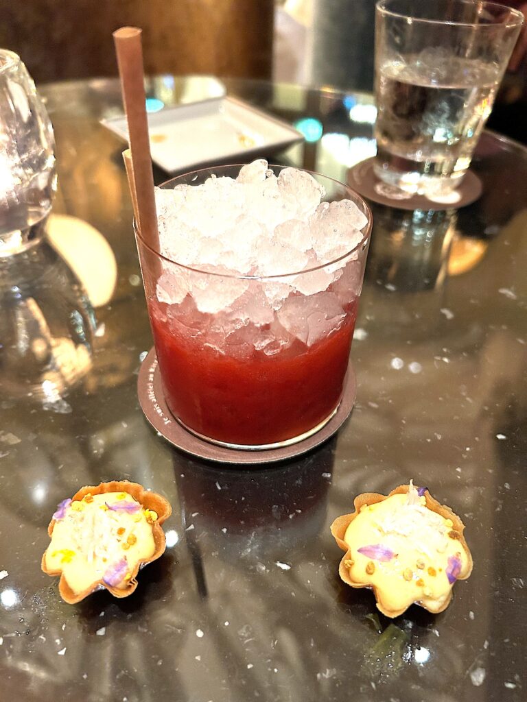 Les Ambassadeurs, le Bar de L’Hôtel de Crillon, a initié une approche hardie. A Sense of Taste réalise un focus sur les fragrances de saison. Kevin Rigault et son équipe ont extrapolé les saveurs jusqu’à la quintessence. Olive, Carot, Walnut, Kiwi et quelques autres sont envisagés par l’épure. Olive encapsule du Roku Suntory infusé avec des olives noires, du Mancino Vermouth blanc, de l’olive Brine, de la London Essence Tonic. Le soyeux s’adjoint à la salinité portée par la saumure d’olive créant un instant en délicatesse. Le cocktail s’allie en perfection avec le Millefeuille chocolat du Brésil, oscillant entre le craquant du feuilleté, la volupté du chocolat, le poudré, le salin.