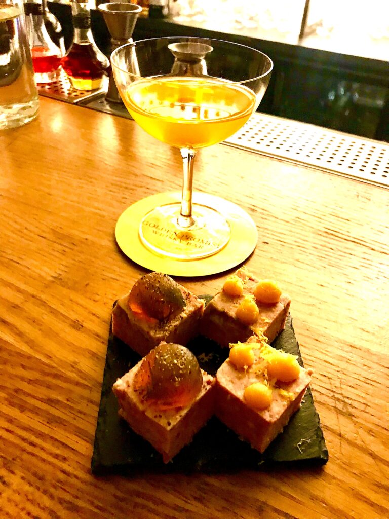 Le Golden Promise célèbre les spiritueux en quintessence. Liquides rares de par le monde, whiskys d’esthètes, chaque référence se distingue. En parallèle, la carte se décline en intrigants cocktails. Le triumvirat créatif, Thomas Frenay, Sullivan Carpentier et Raphaël Lemunbach, oscille entre la recherche du jeu et du paradoxe. Leur Bomore 65 recrée les caractéristiques du spiritueux éponyme, flacon mythique, édition limitée. Ses accents de tabac brun, de sumac, de marc de café, se parfont au contact d’une terrine de cochon, pâte de miso blanc, aneth et citrus du chef Utsumi Ryuichi.