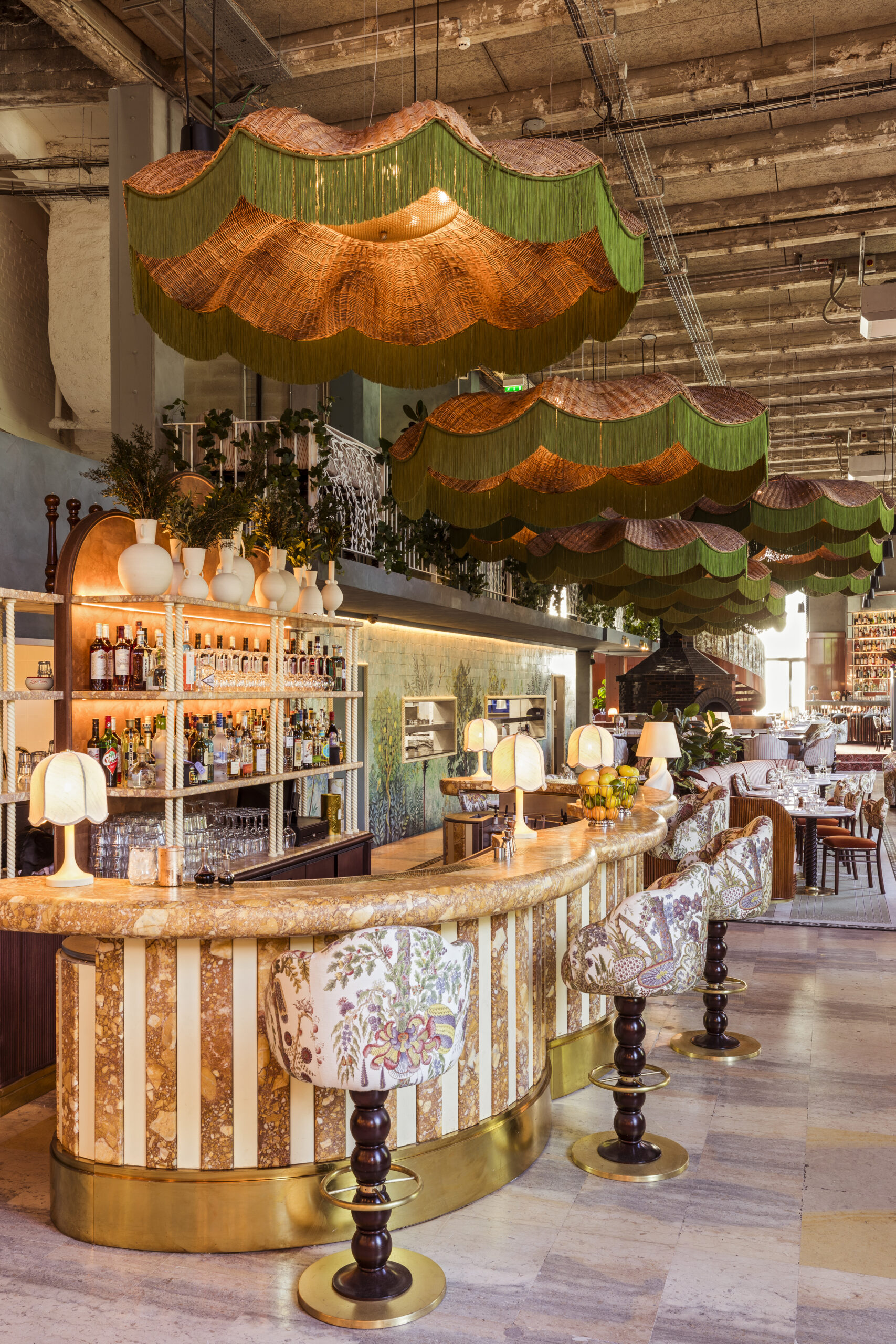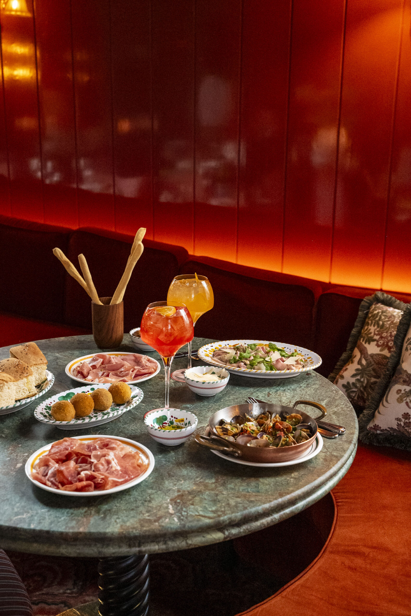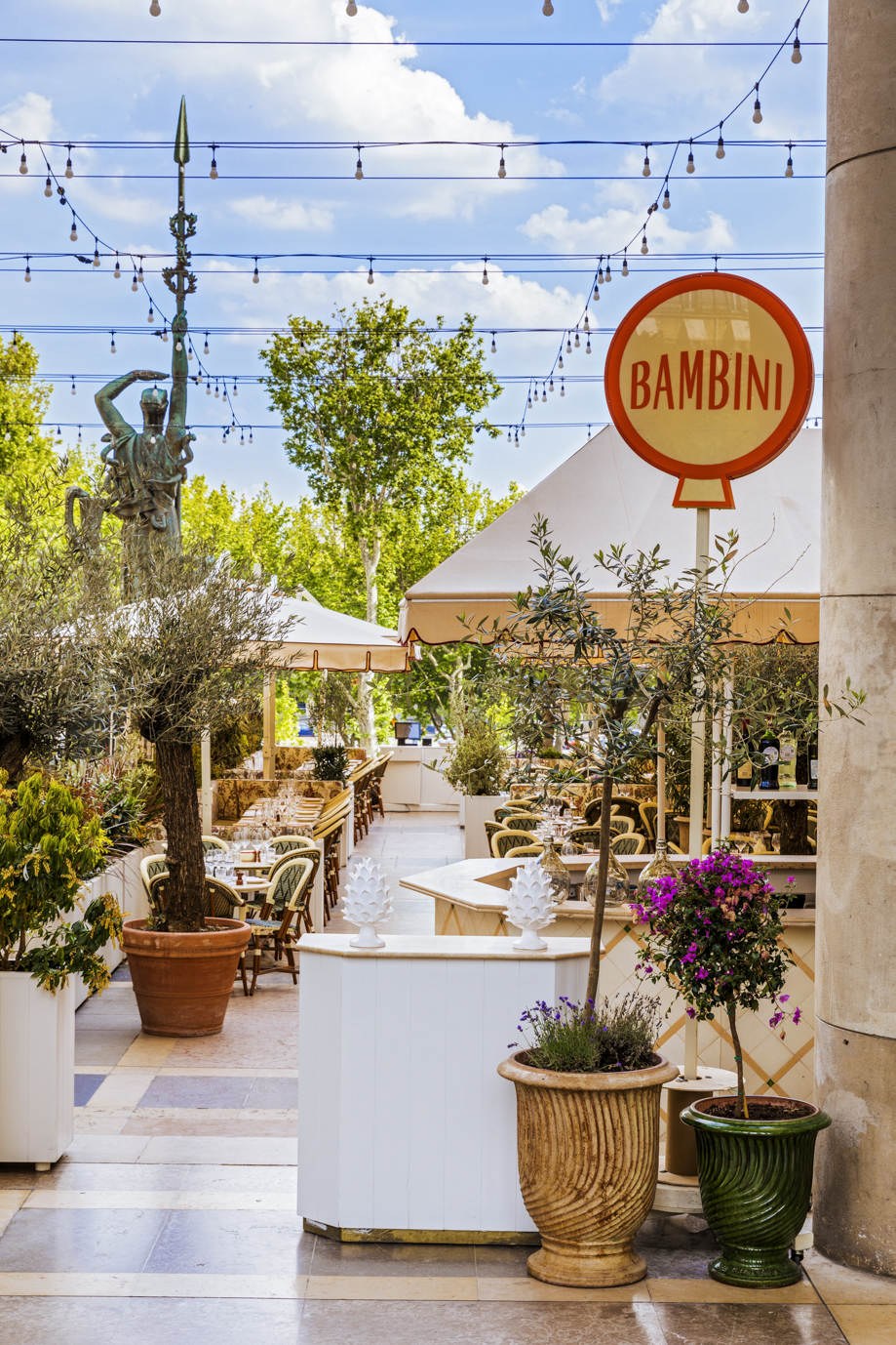 Dès l’entrée, Bambini séduit par son décor à la fois ludique et raffiné, fruit de l’imagination fertile de Friedmann et Versace. L’ambiance y est théâtrale, évoquant les couleurs et l’insouciance de l’Italie festive. Chaque détail du lieu, des couleurs vives aux éléments de décoration choisis avec soin, contribue à créer une atmosphère immersive et chaleureuse qui rappelle la dolce vita.