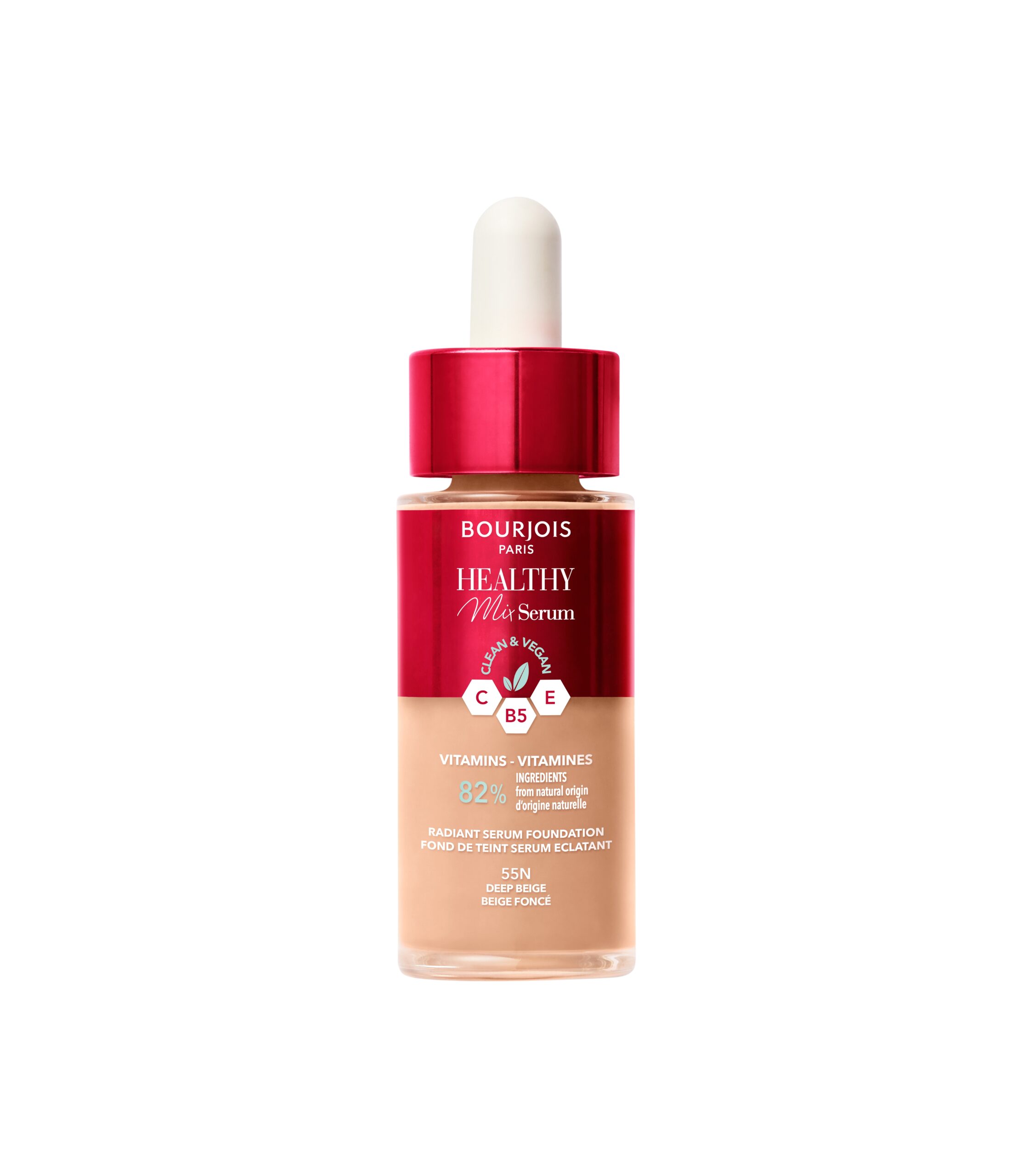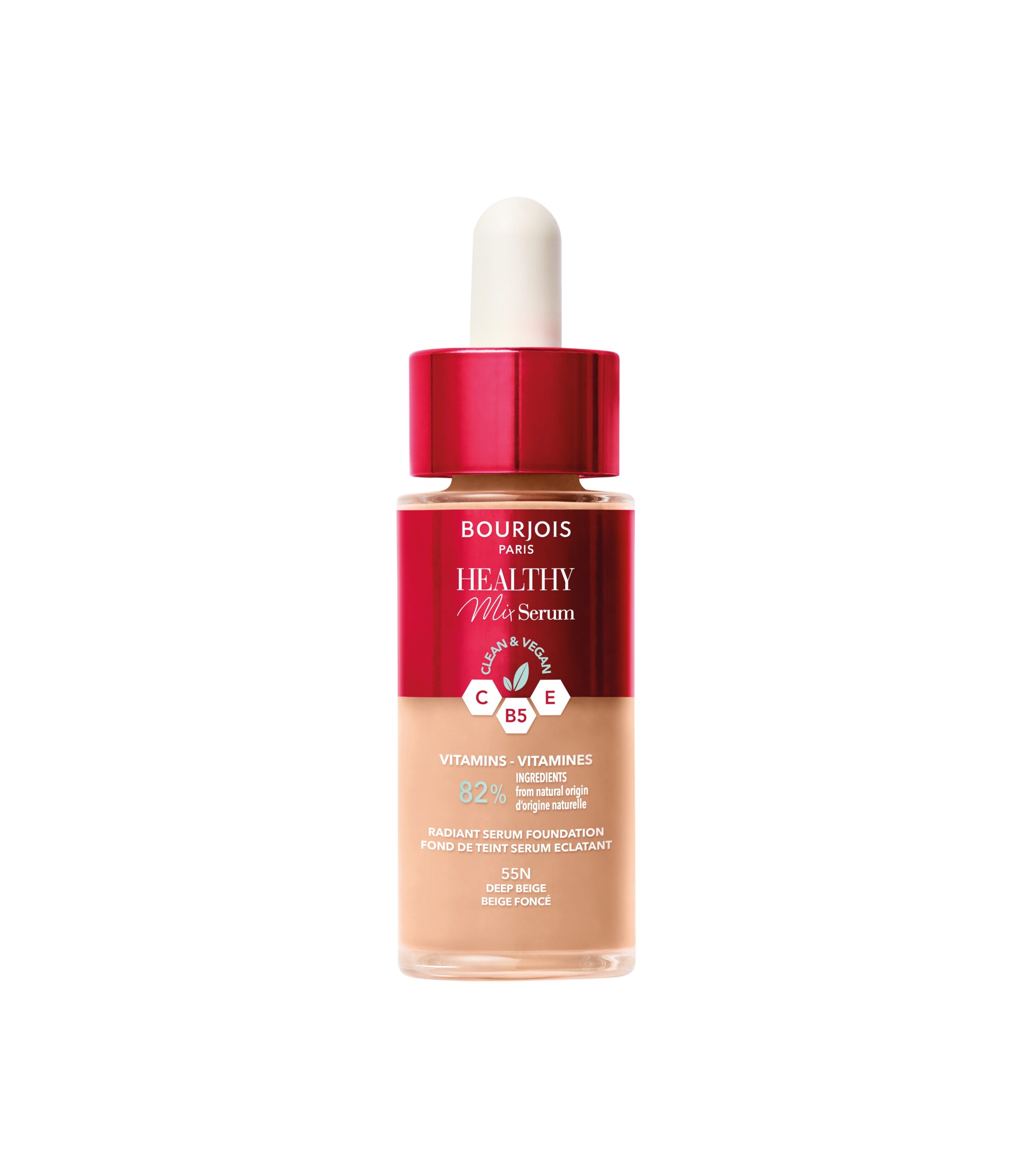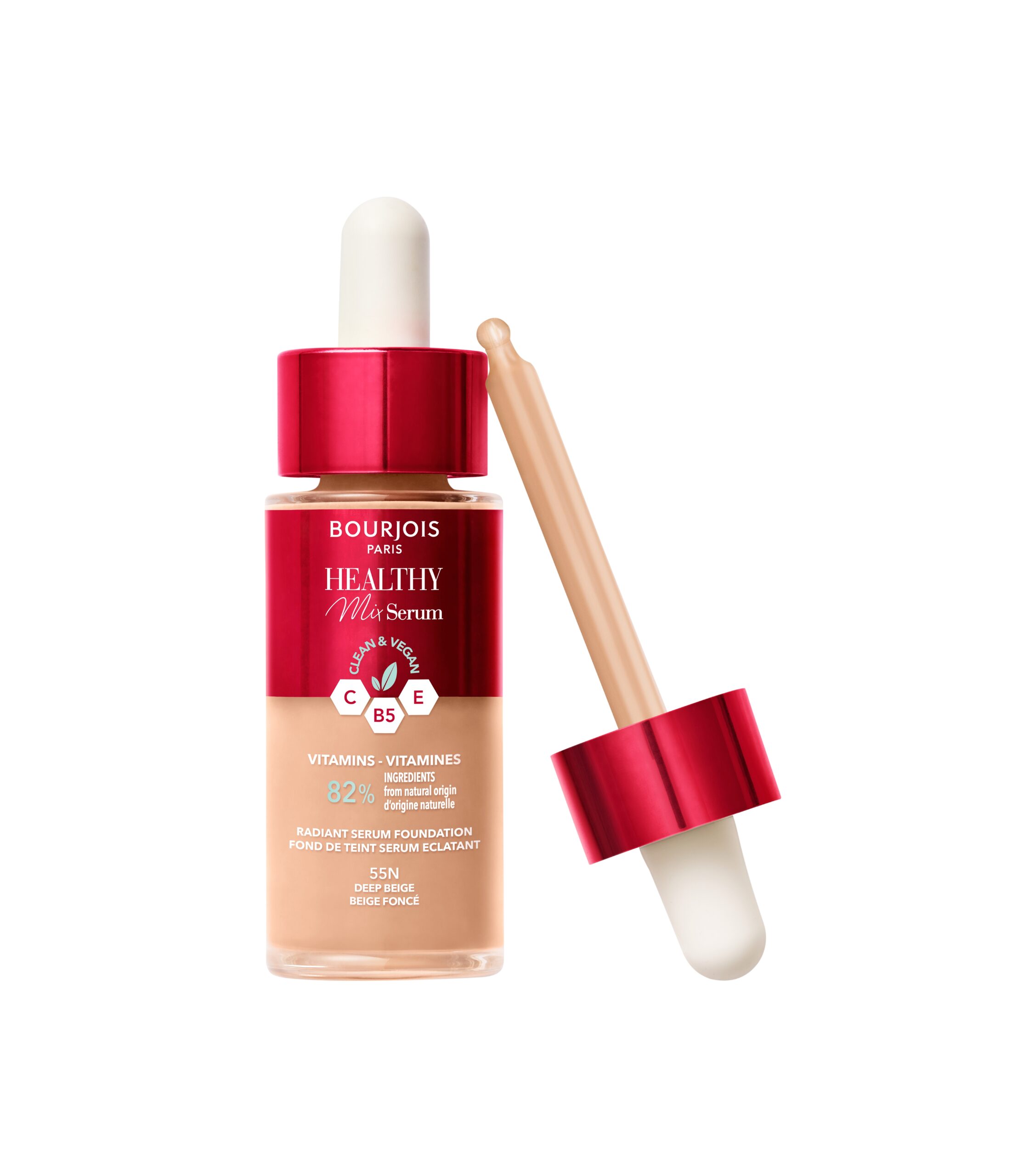Le Fond de Teint Sérum Healthy Mix est disponible dans une palette de 9 teintes adaptées à toutes les carnations, garantissant ainsi un teint uniforme et lumineux. Son flacon en verre de qualité supérieure, avec une étiquette et un couvercle rouges métalliques élégants, en font un produit à la fois performant et esthétiquement plaisant.