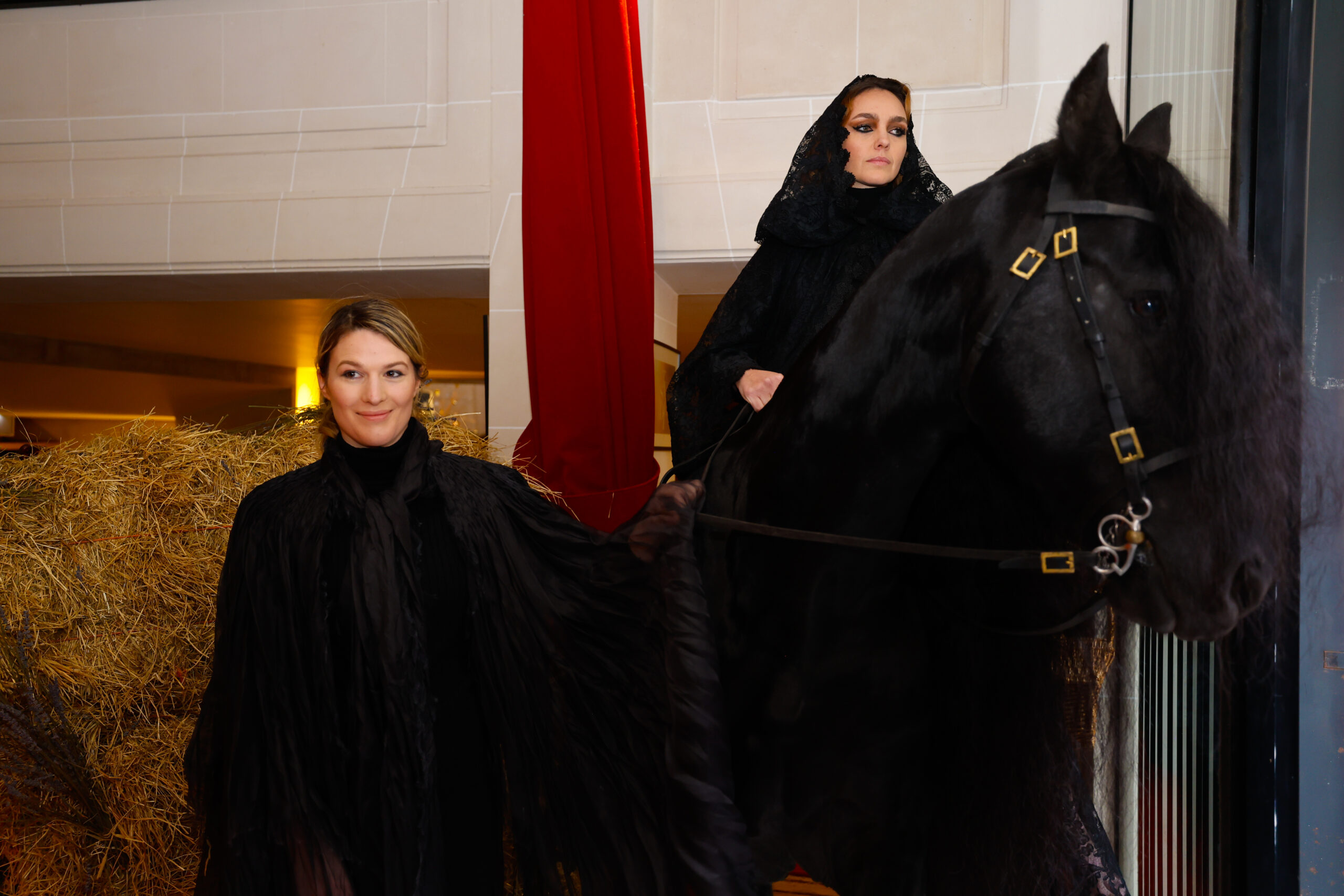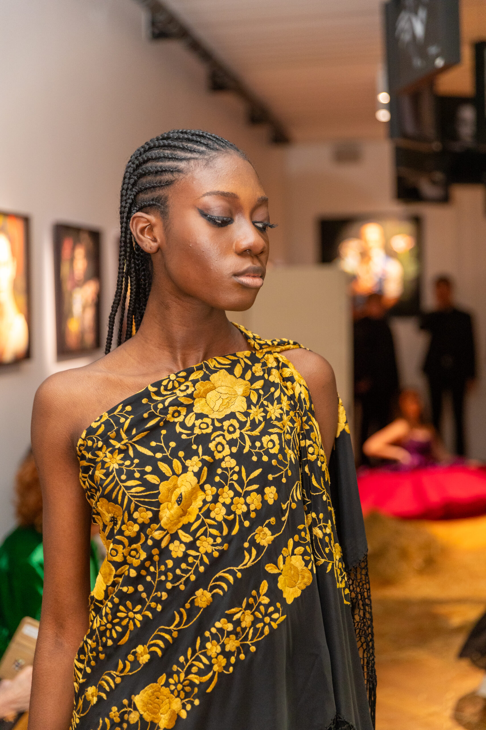 Des robes drapées aux capes majestueuses, en passant par des ensembles équestres revisités, chaque pièce raconte une histoire de guérison et de pouvoir féminin. Les tissus, tels que la soie, l’organza et le raphia, sont sublimés par des broderies minutieuses, des perles et des coquillages, créant une harmonie visuelle évoquant les éléments naturels et le sacré.