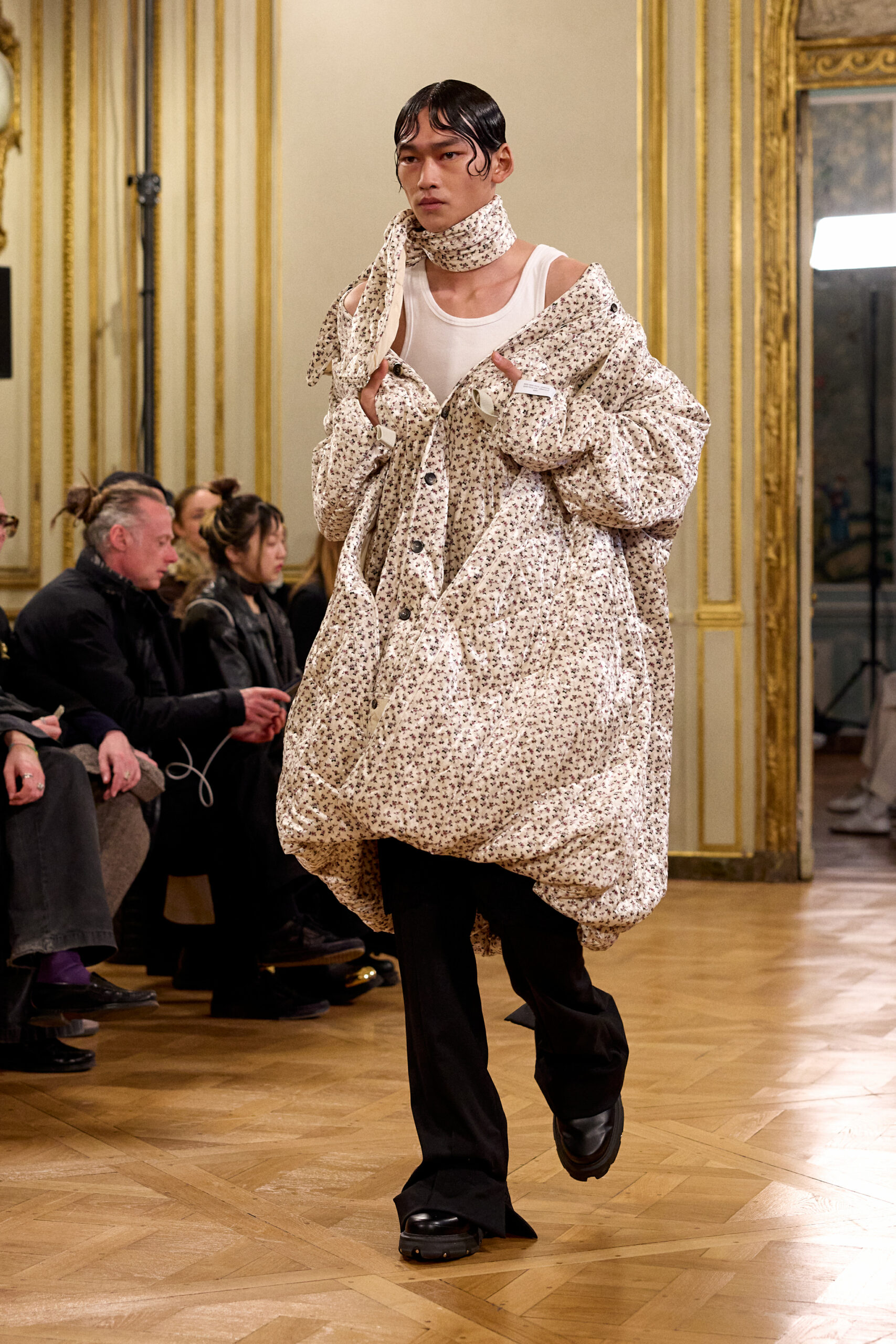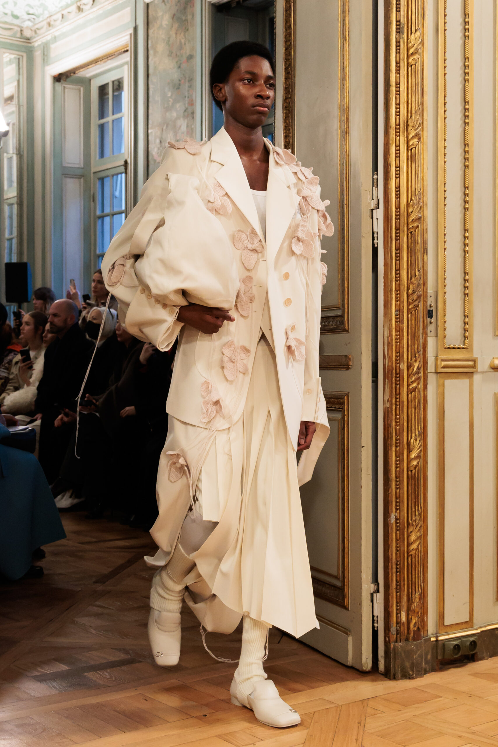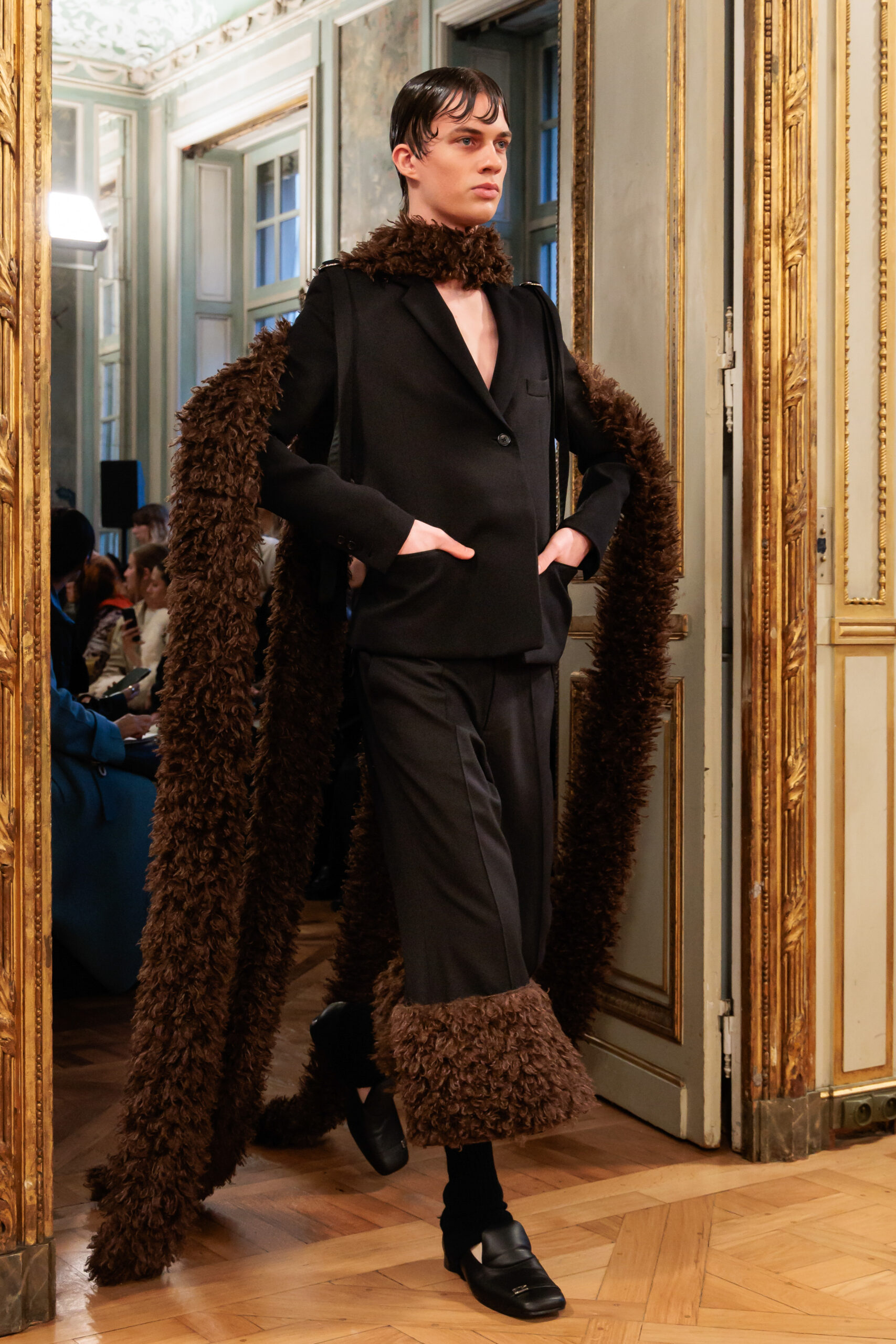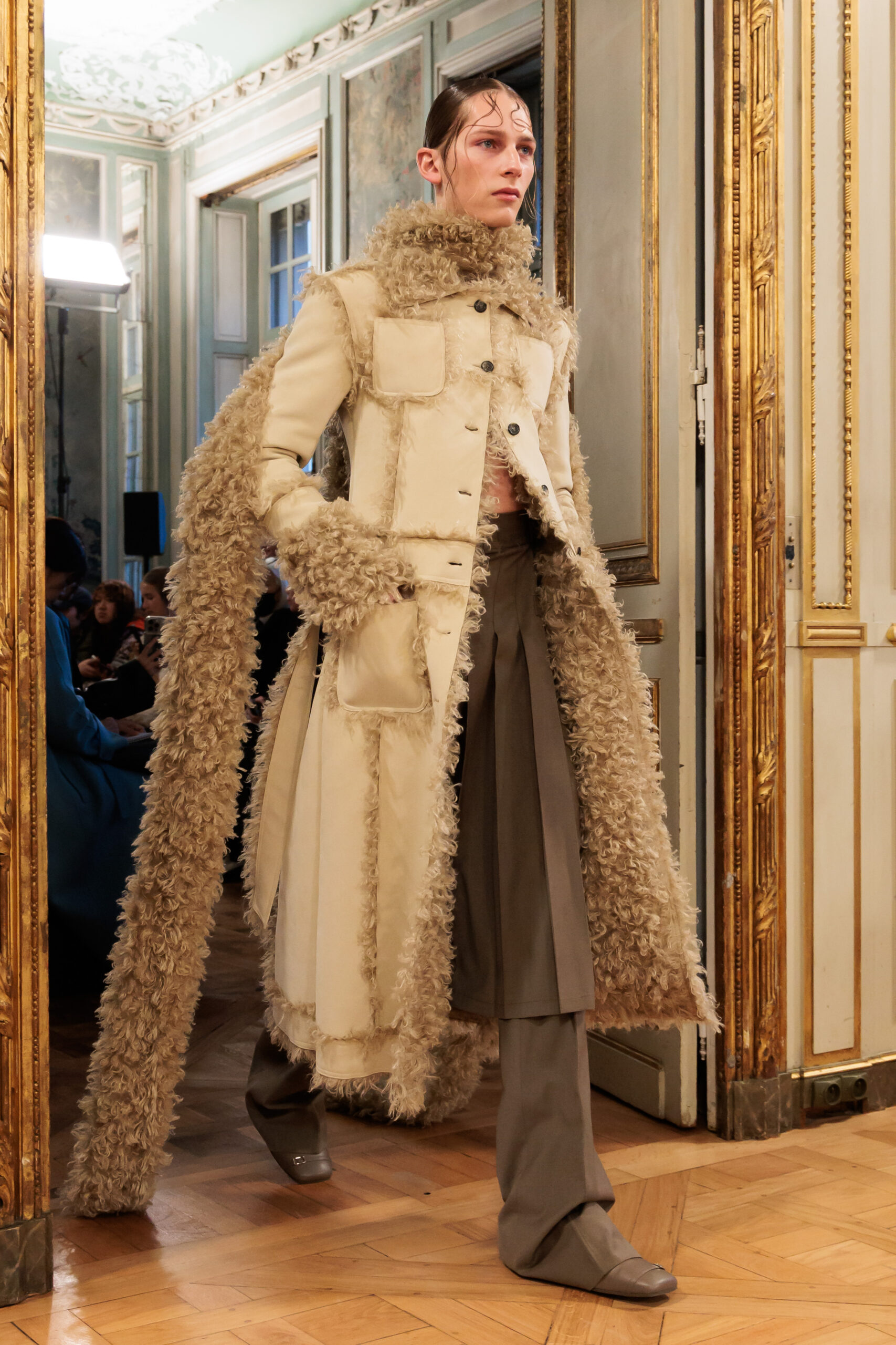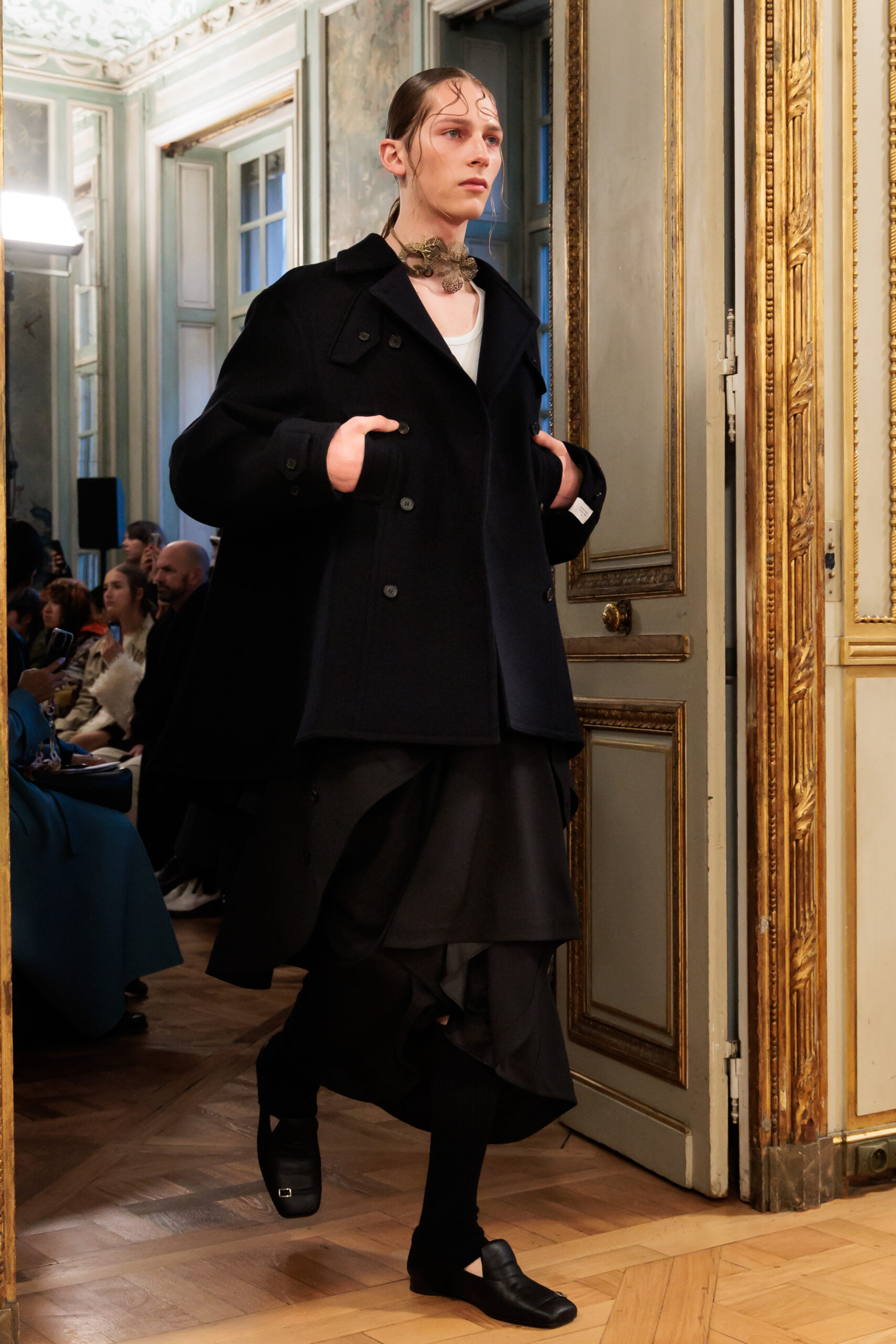 Tout au long de la collection, les vêtements subissent une transformation, avec des manteaux qui se transforment en vestes et des trench-coats qui se mélangent avec des manteaux formels grâce à des techniques innovantes de coupe de patrons et de drapage à la main. Ces pièces, imprégnées de taille sartoriale, témoignent de l’engagement de Rokh à repousser les limites de la mode tout en honorant les traditions intemporelles.