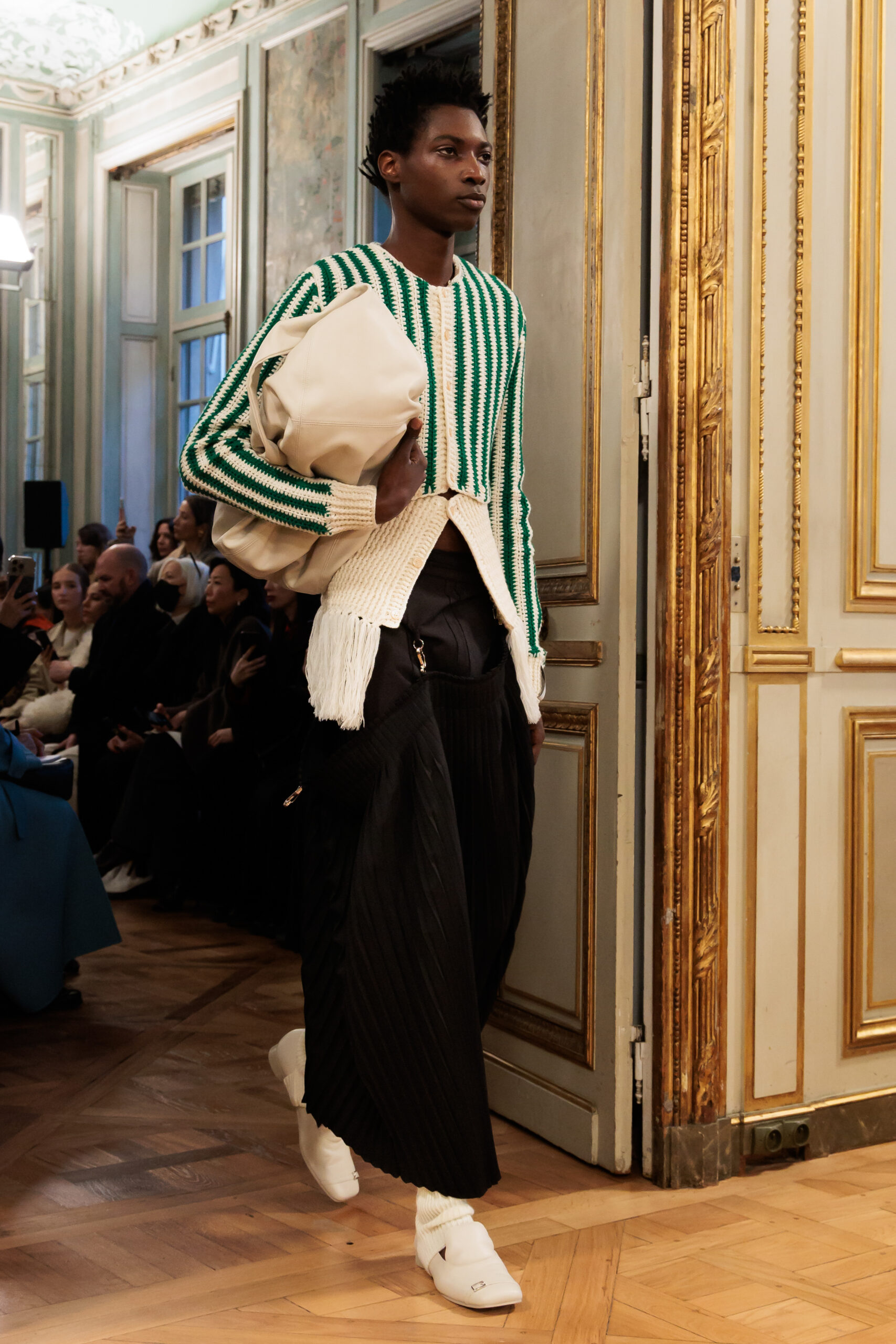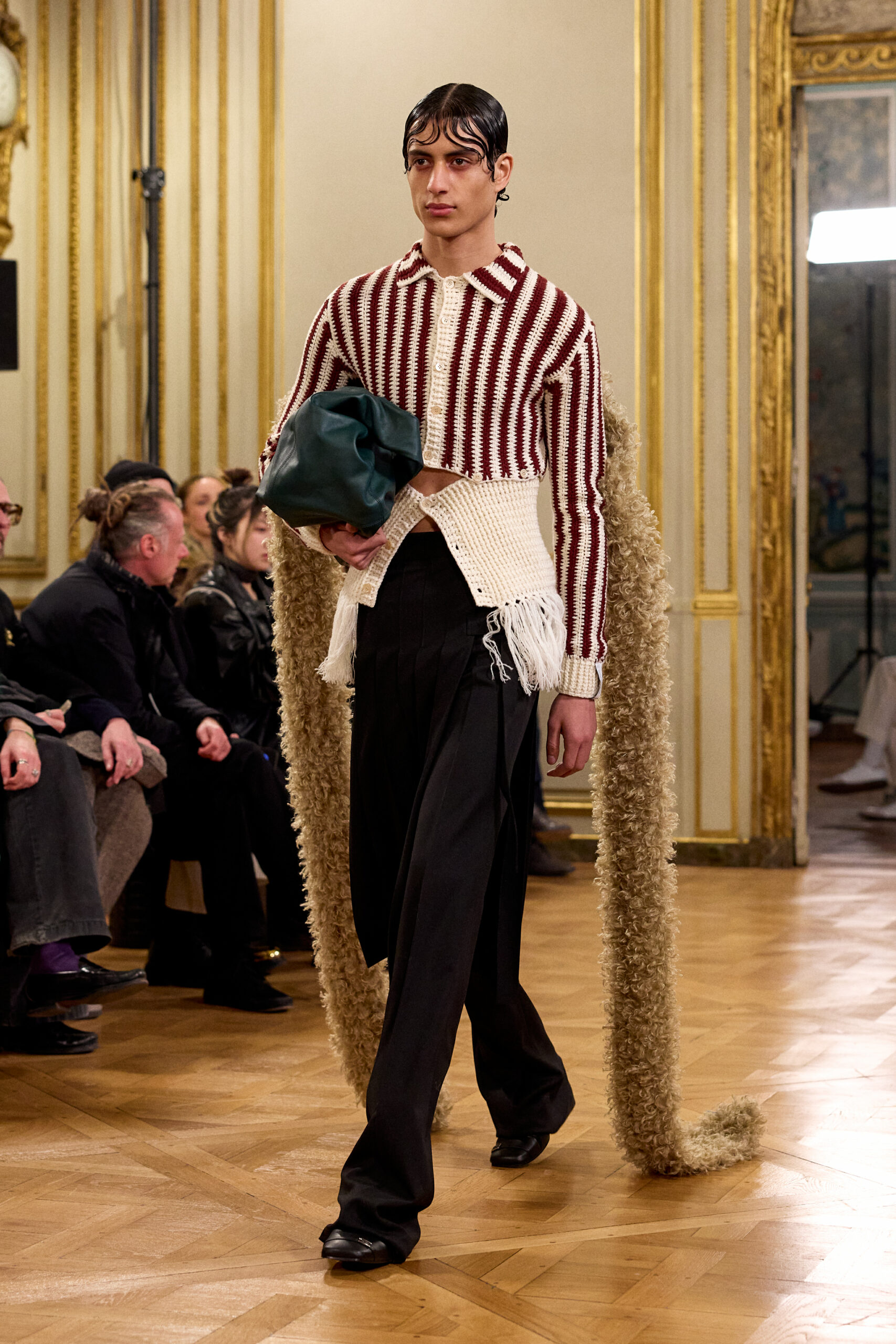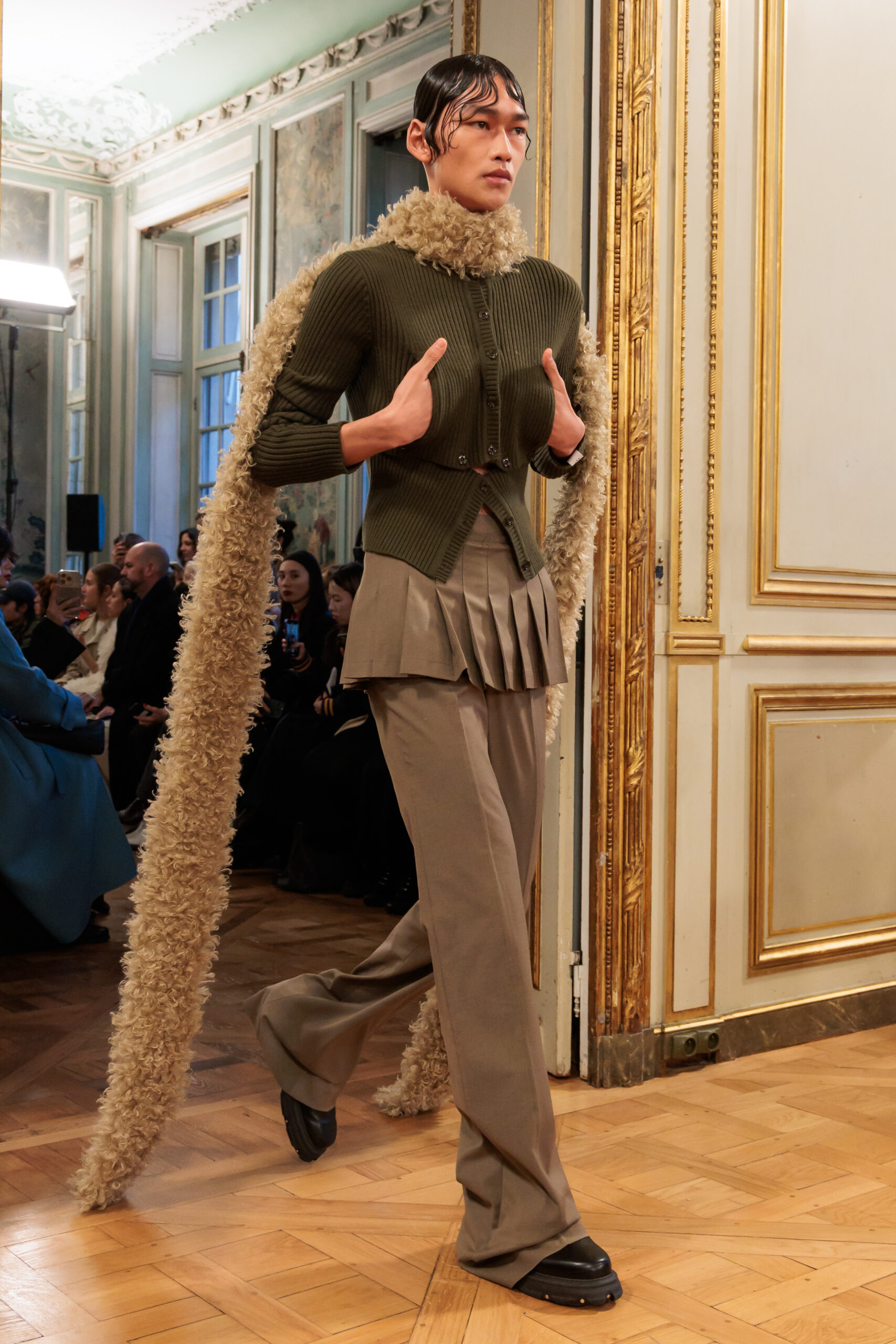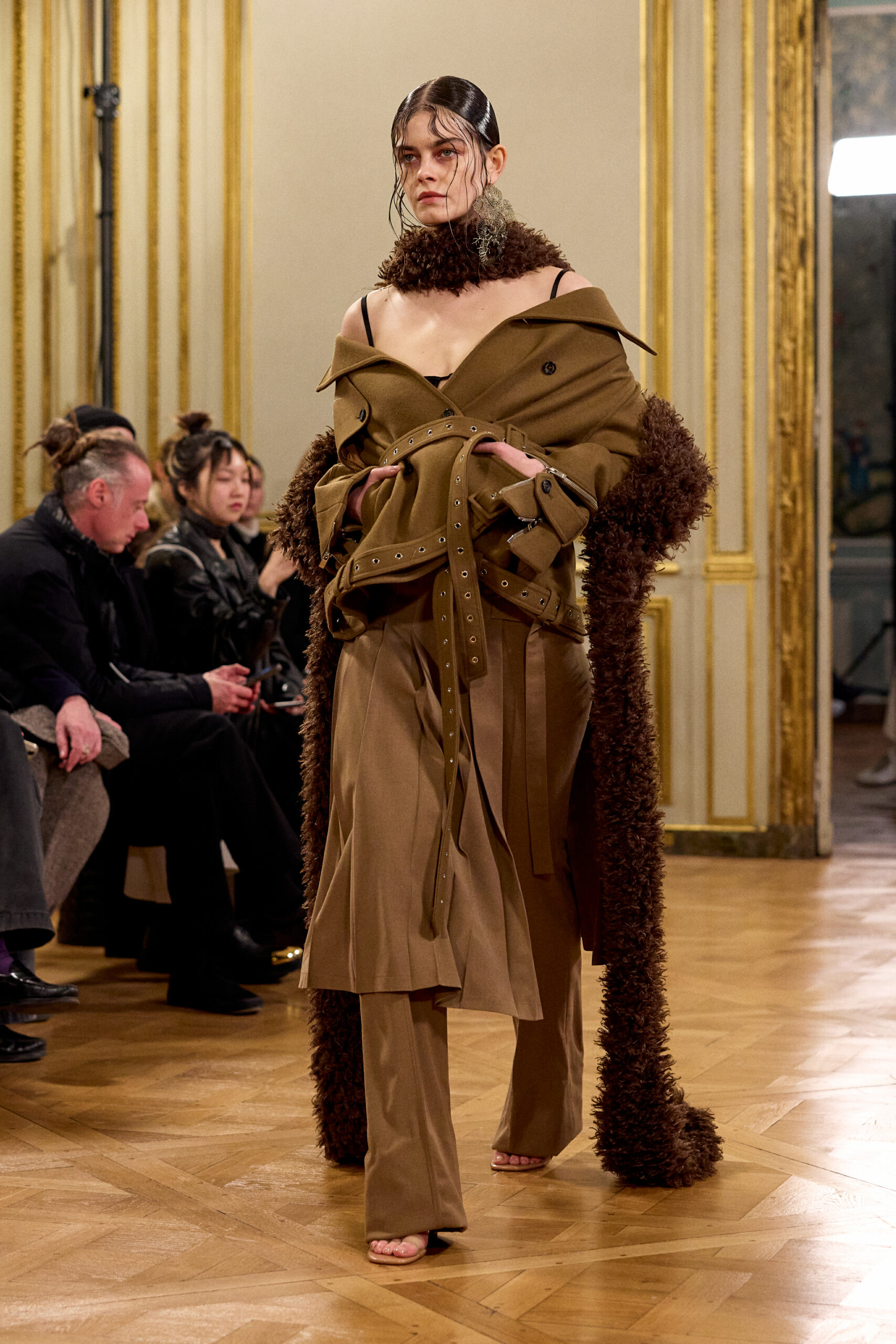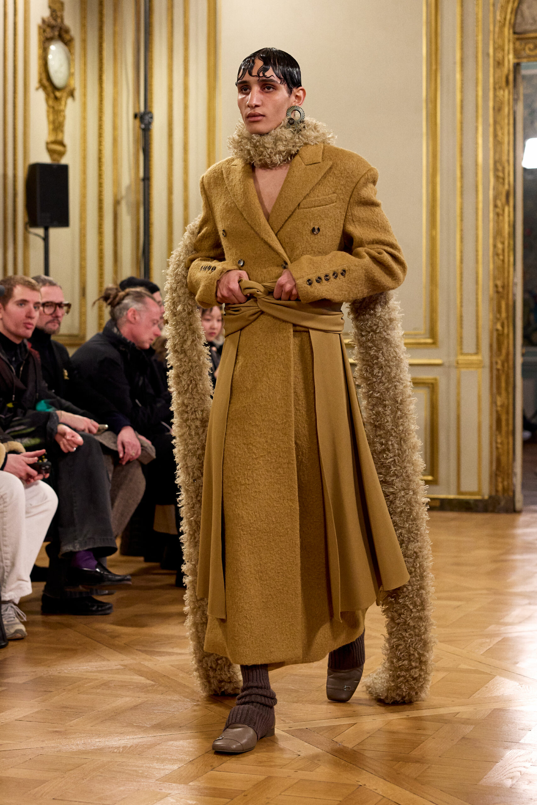 Tout au long de la collection, les vêtements subissent une transformation, avec des manteaux qui se transforment en vestes et des trench-coats qui se mélangent avec des manteaux formels grâce à des techniques innovantes de coupe de patrons et de drapage à la main. Ces pièces, imprégnées de taille sartoriale, témoignent de l’engagement de Rokh à repousser les limites de la mode tout en honorant les traditions intemporelles.