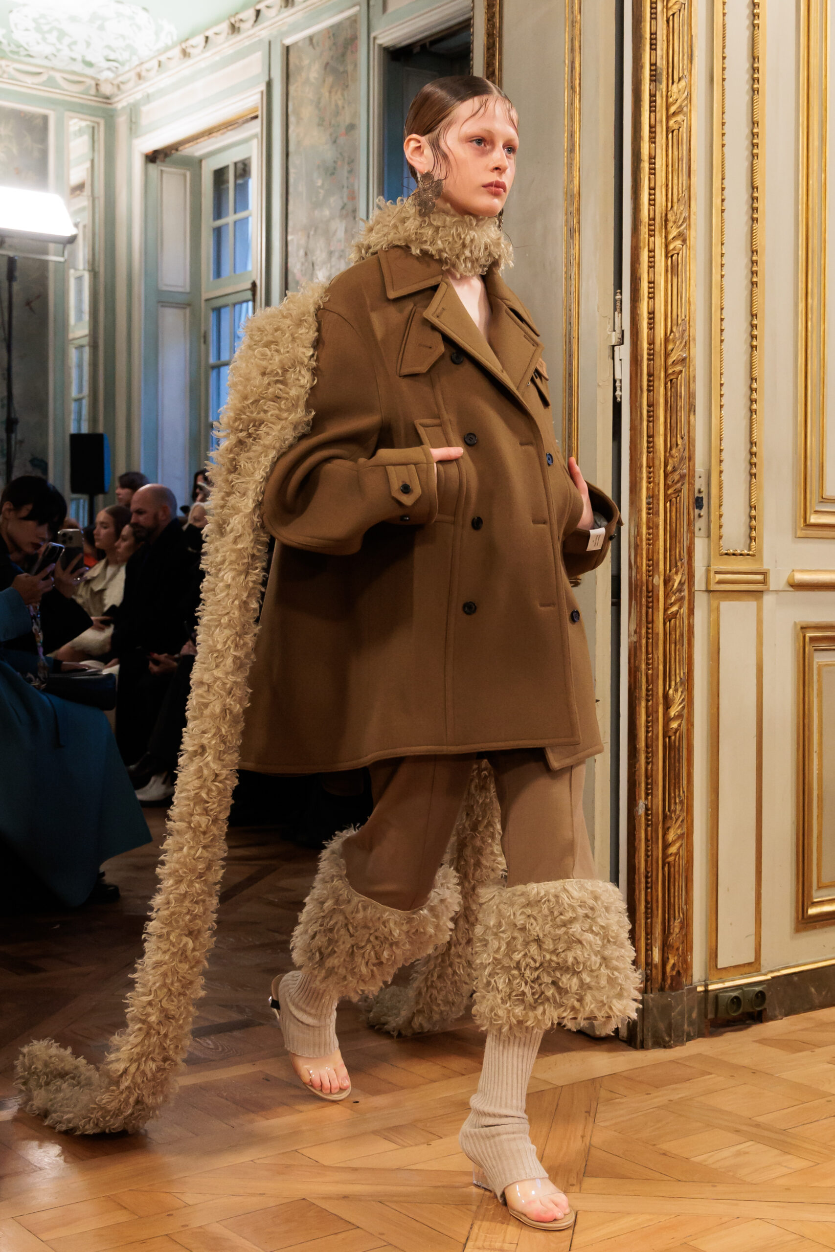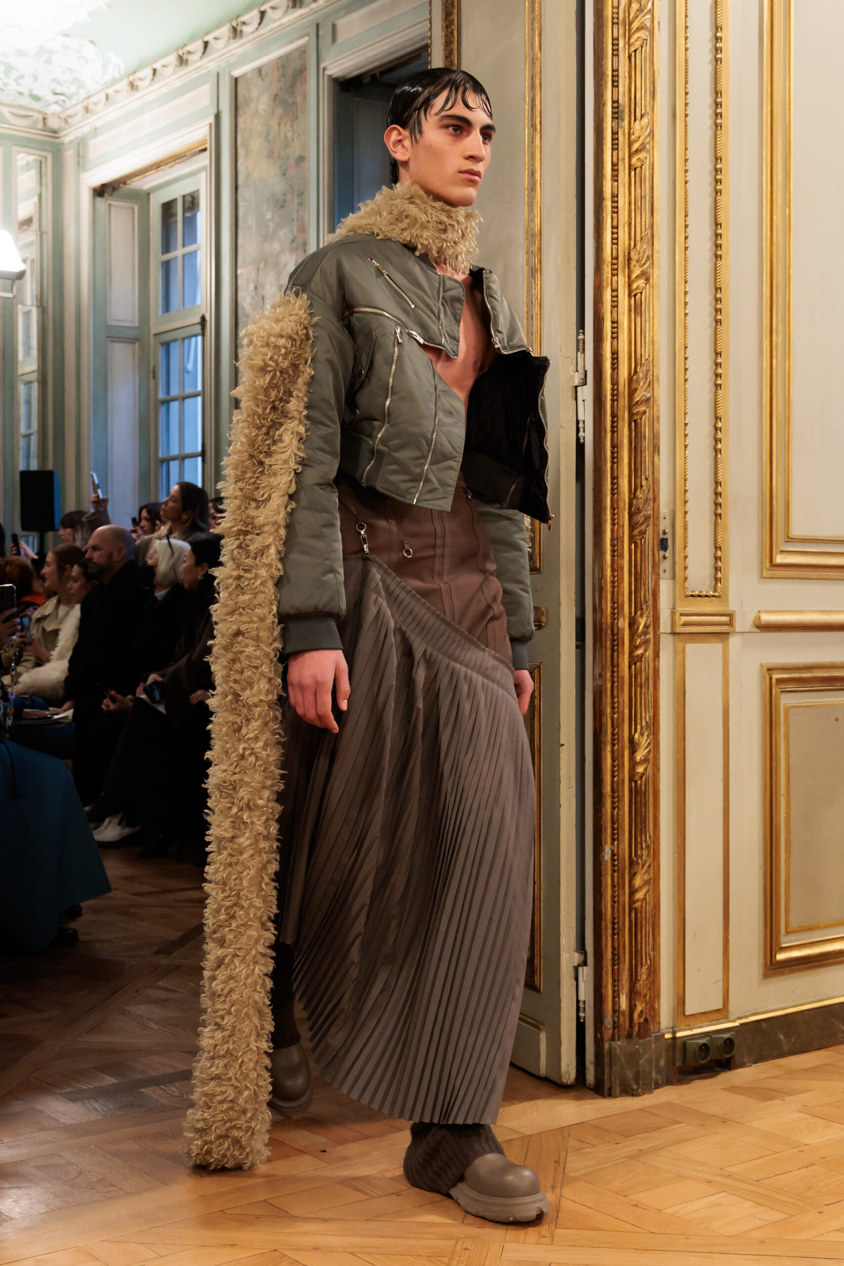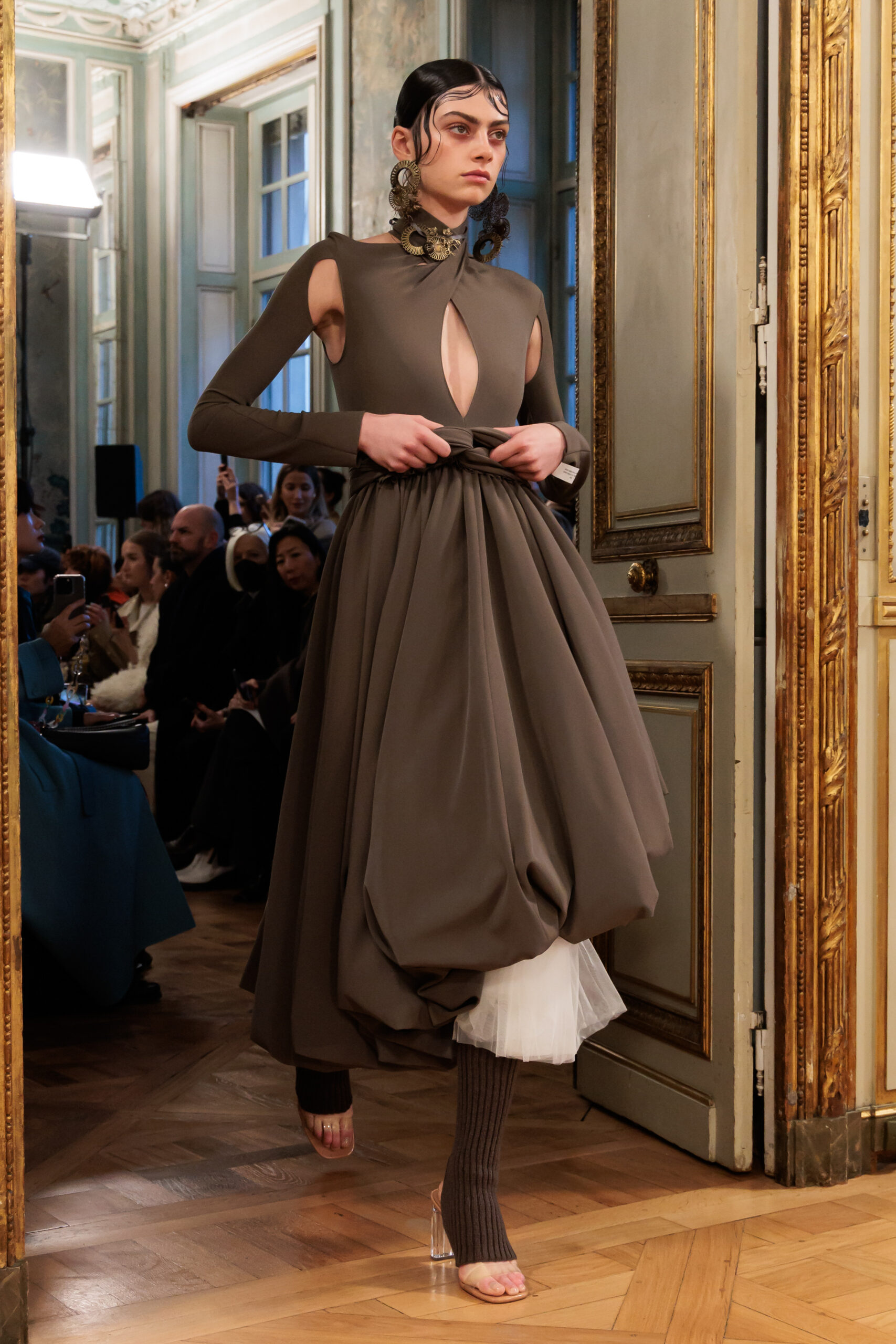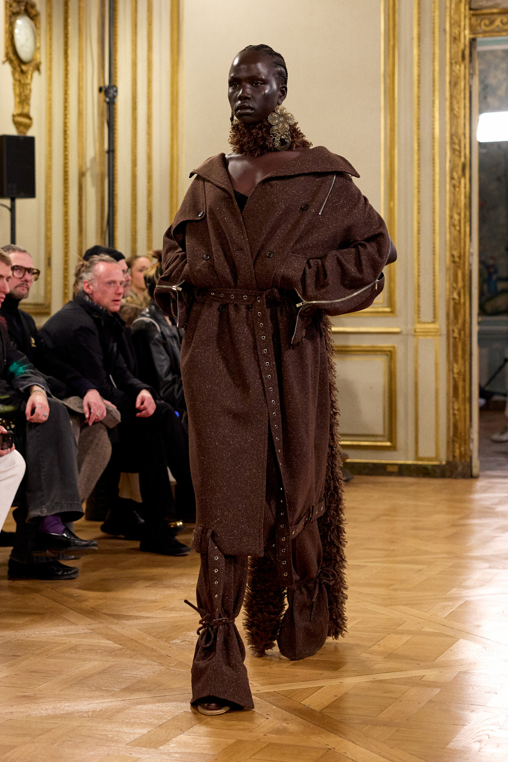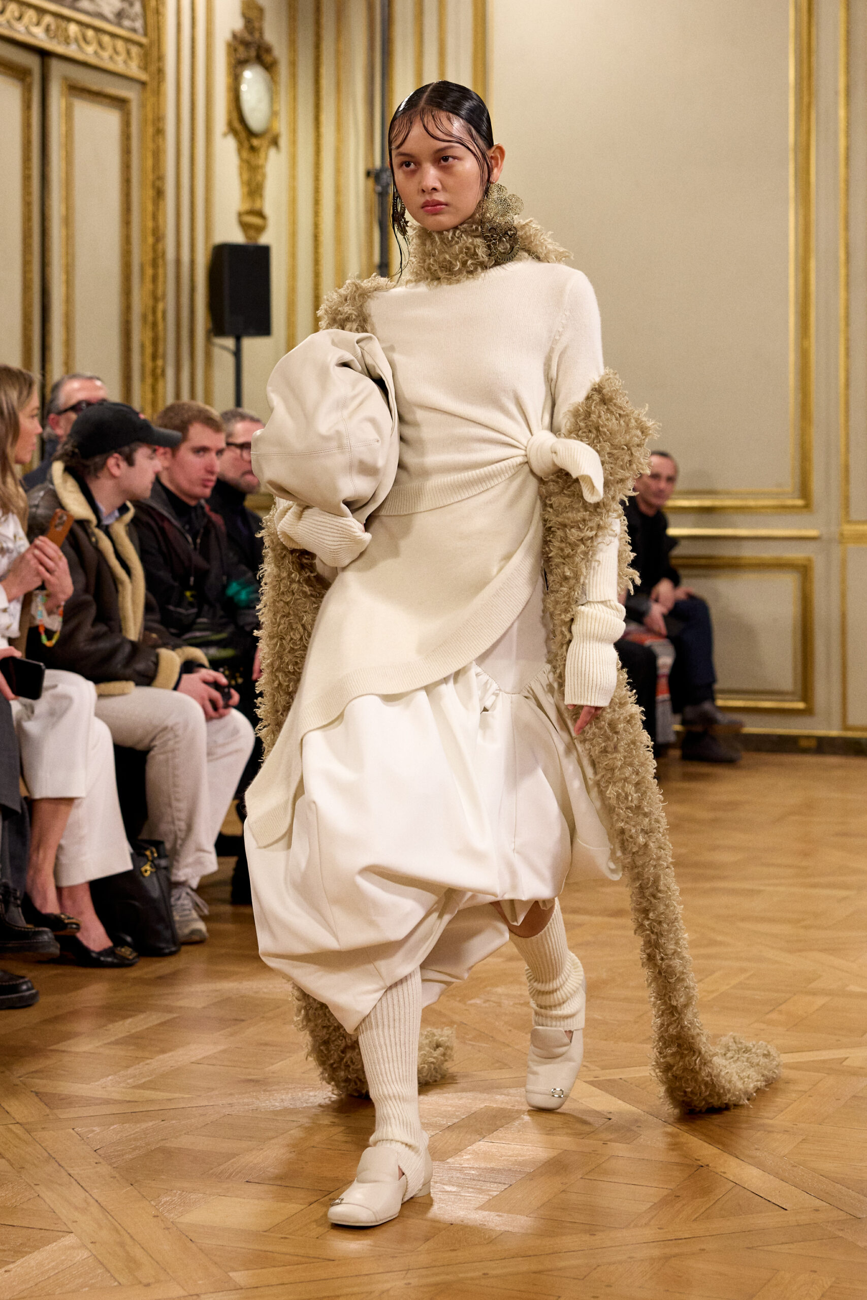Tout au long de la collection, les vêtements subissent une transformation, avec des manteaux qui se transforment en vestes et des trench-coats qui se mélangent avec des manteaux formels grâce à des techniques innovantes de coupe de patrons et de drapage à la main. Ces pièces, imprégnées de taille sartoriale, témoignent de l’engagement de Rokh à repousser les limites de la mode tout en honorant les traditions intemporelles.