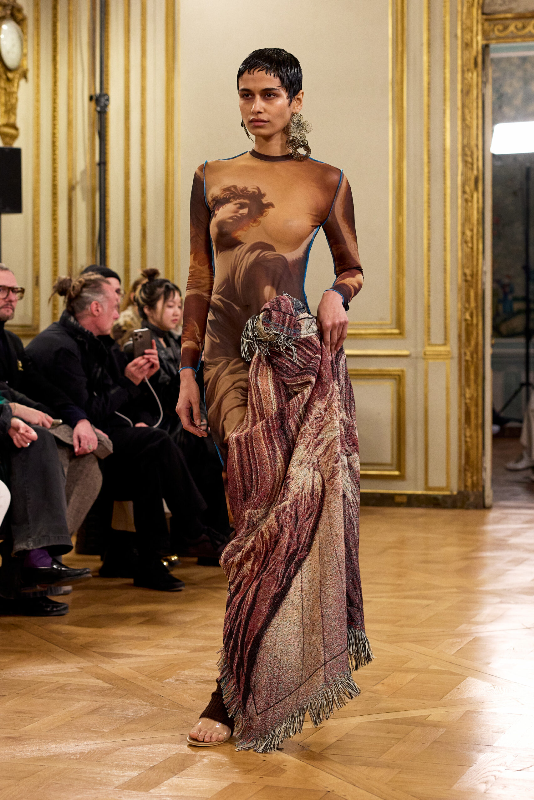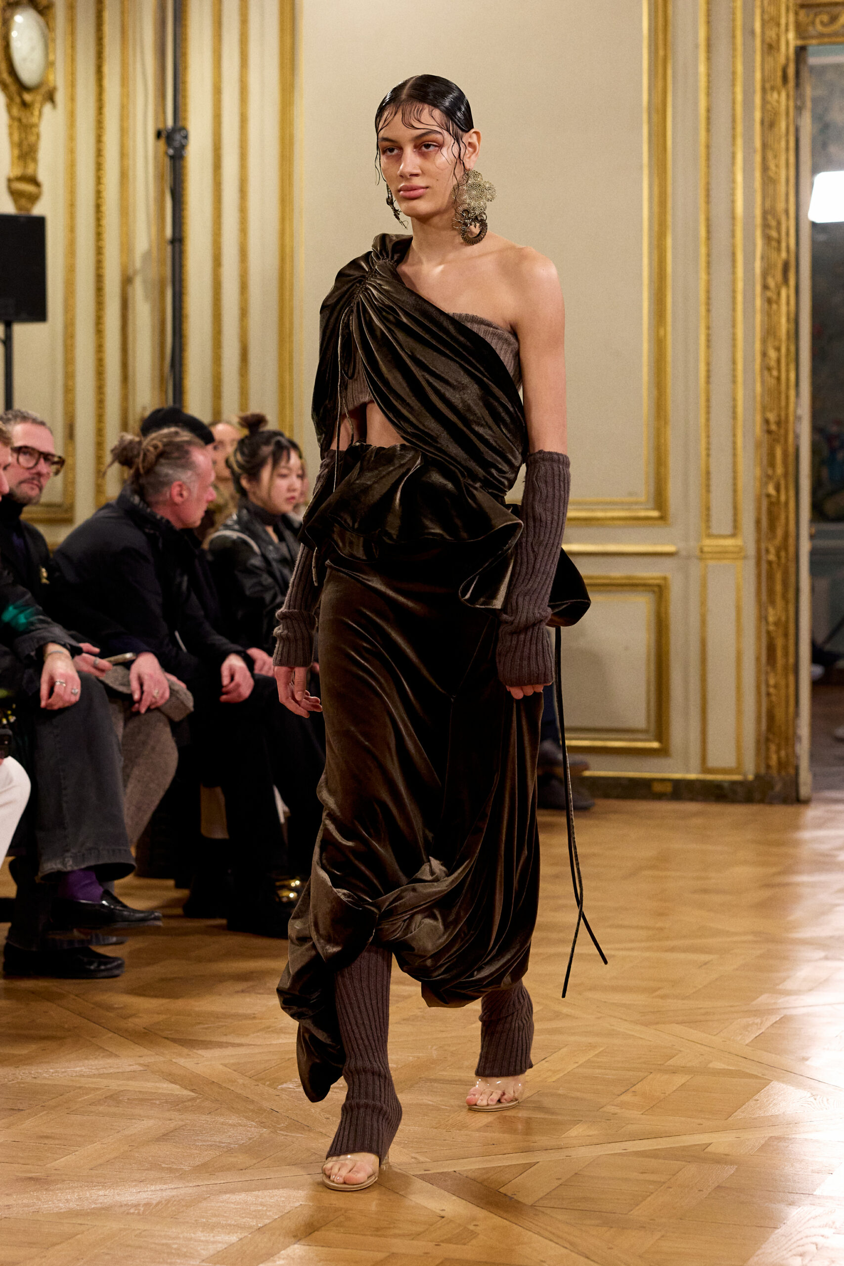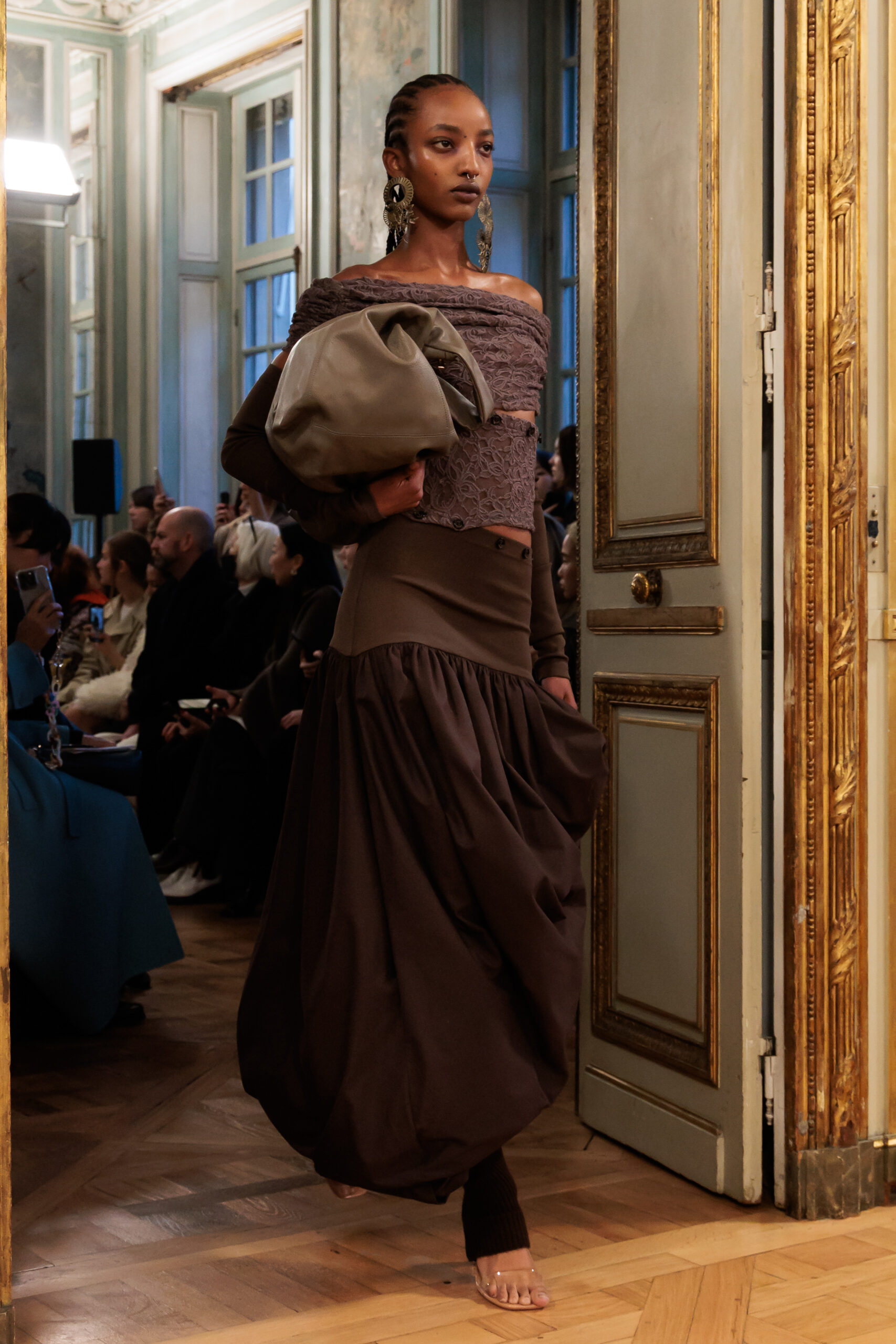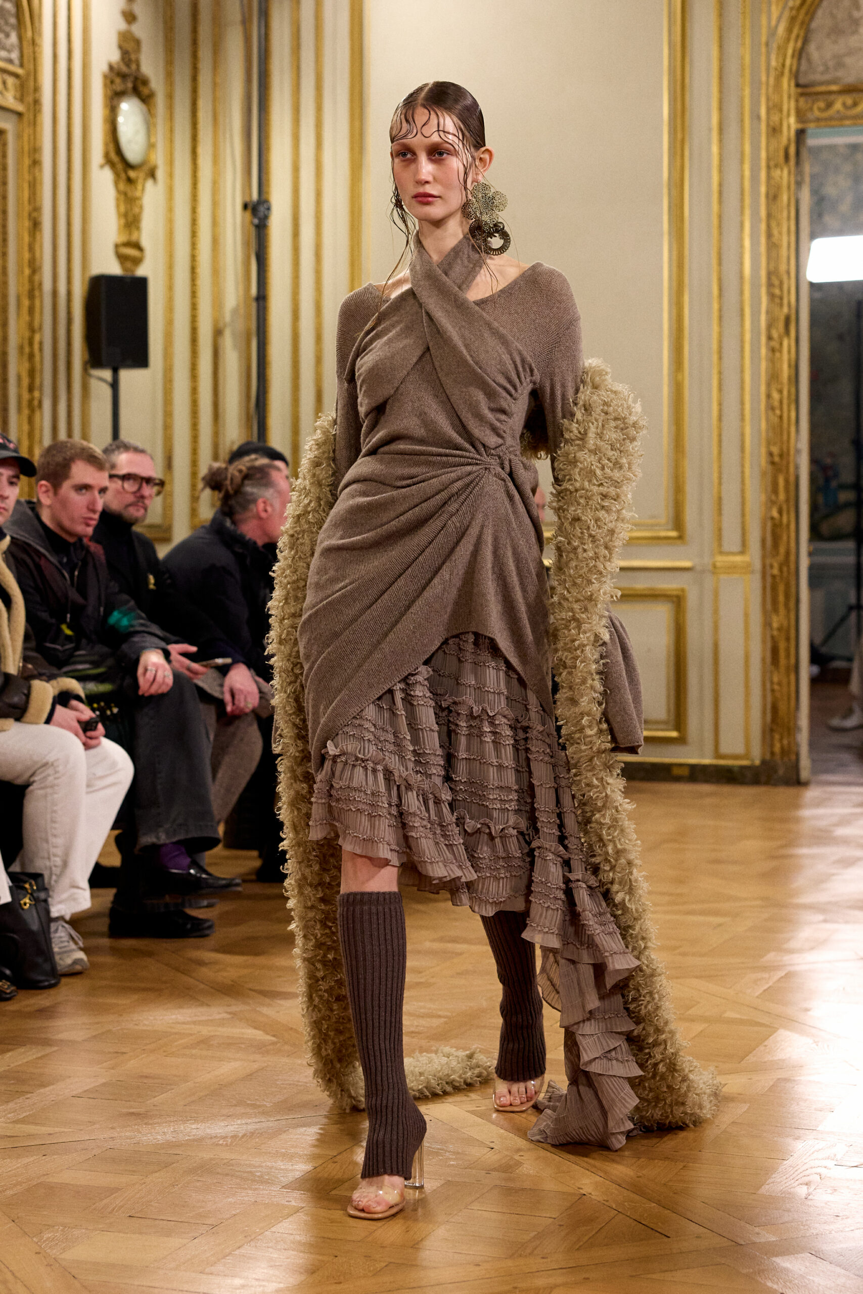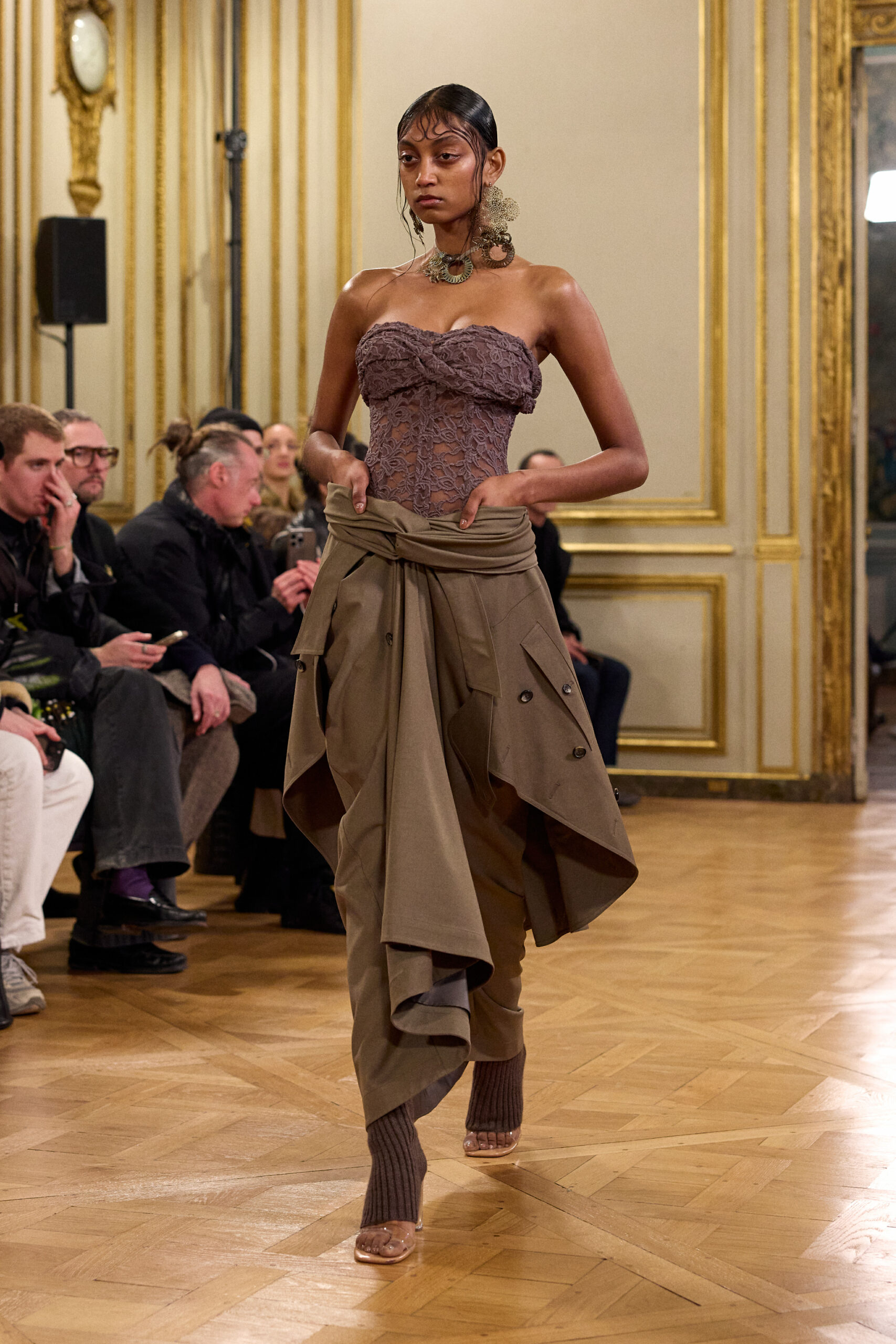 Tout au long de la collection, les vêtements subissent une transformation, avec des manteaux qui se transforment en vestes et des trench-coats qui se mélangent avec des manteaux formels grâce à des techniques innovantes de coupe de patrons et de drapage à la main. Ces pièces, imprégnées de taille sartoriale, témoignent de l’engagement de Rokh à repousser les limites de la mode tout en honorant les traditions intemporelles.