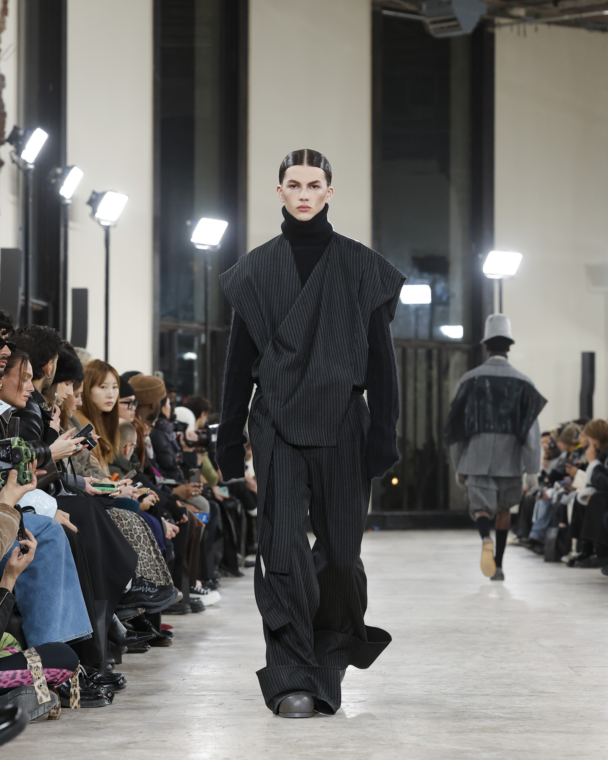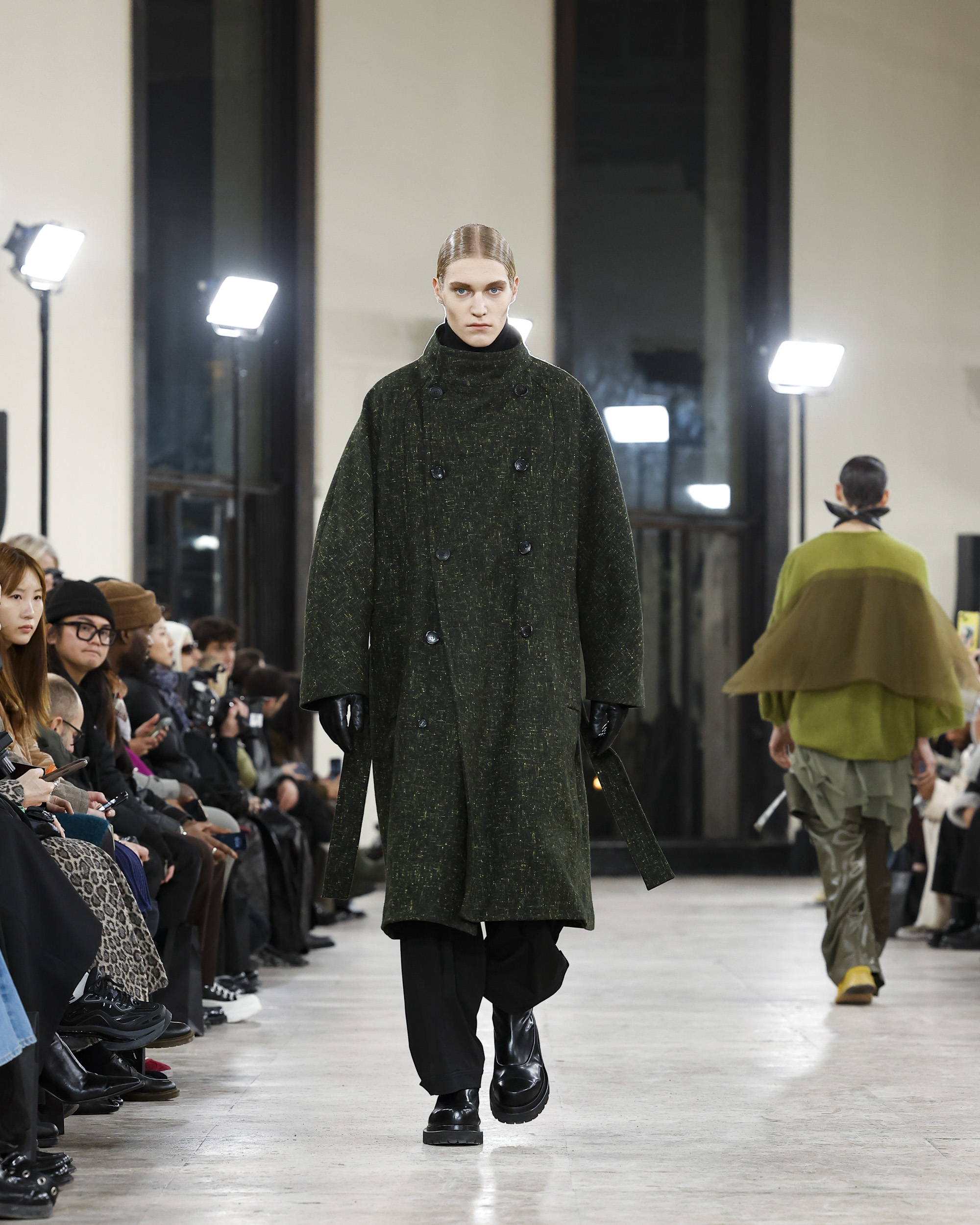 La modernité orientale de Songzio se dévoile à travers des silhouettes classiques – cocoon, dolman, et cloche – où courbes et angles coexistent, évoquant les armures anciennes par des pièces « placées », symétriques ou asymétriques. Cette dualité se poursuit avec des drapés et superpositions asymétriques qui ajoutent fluidité et imperfection, sculpturaux dans leur immobilité mais fluides dans le mouvement.
