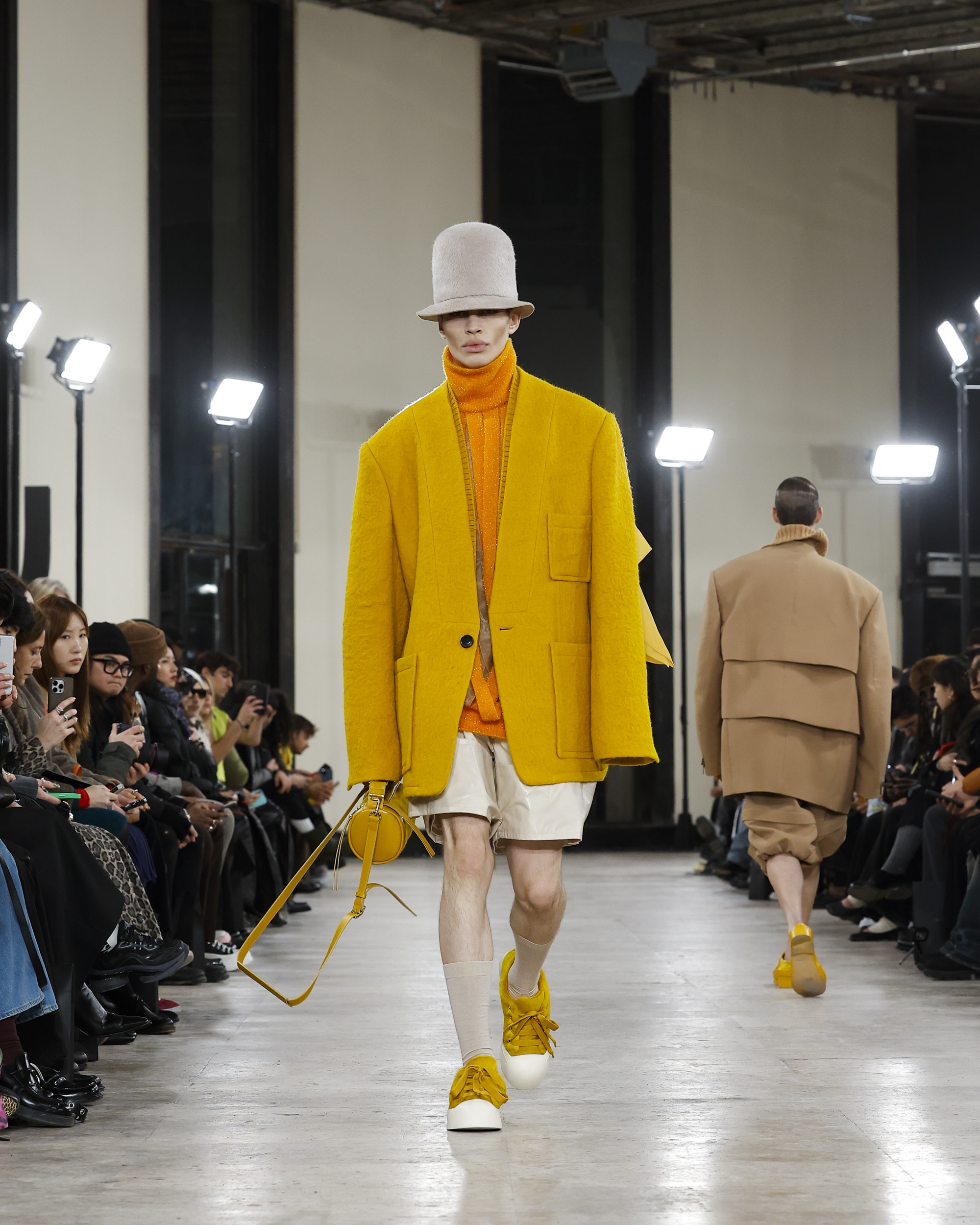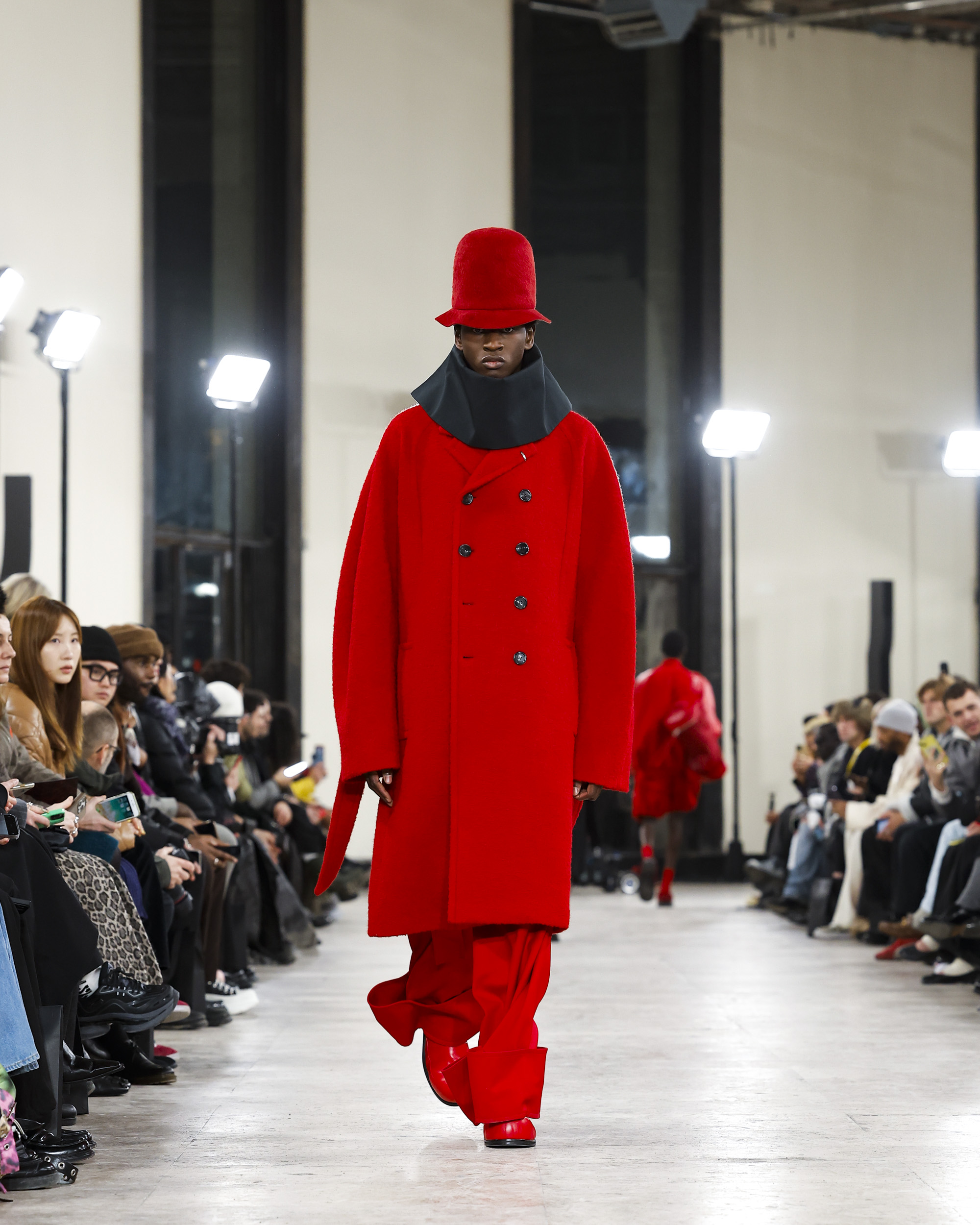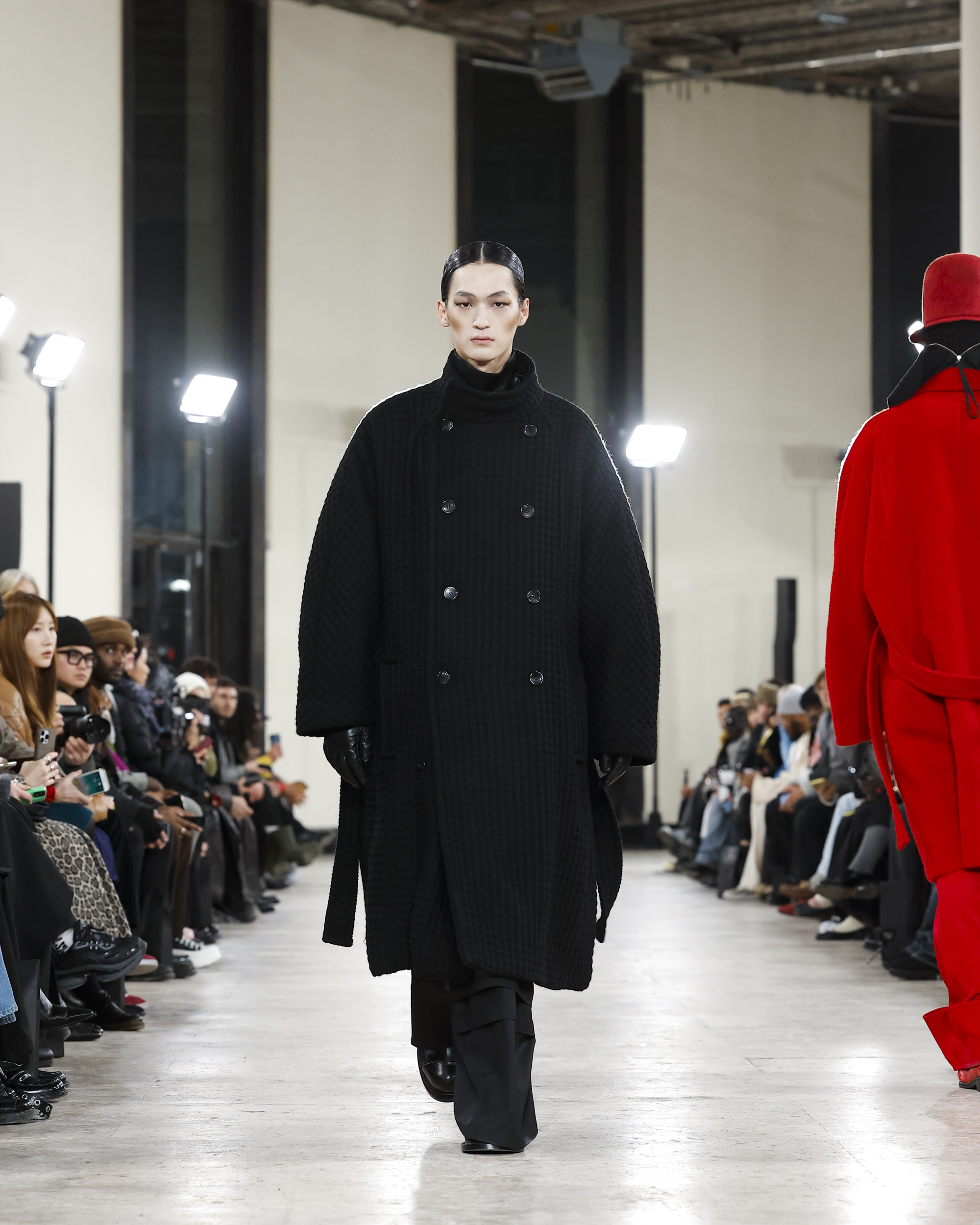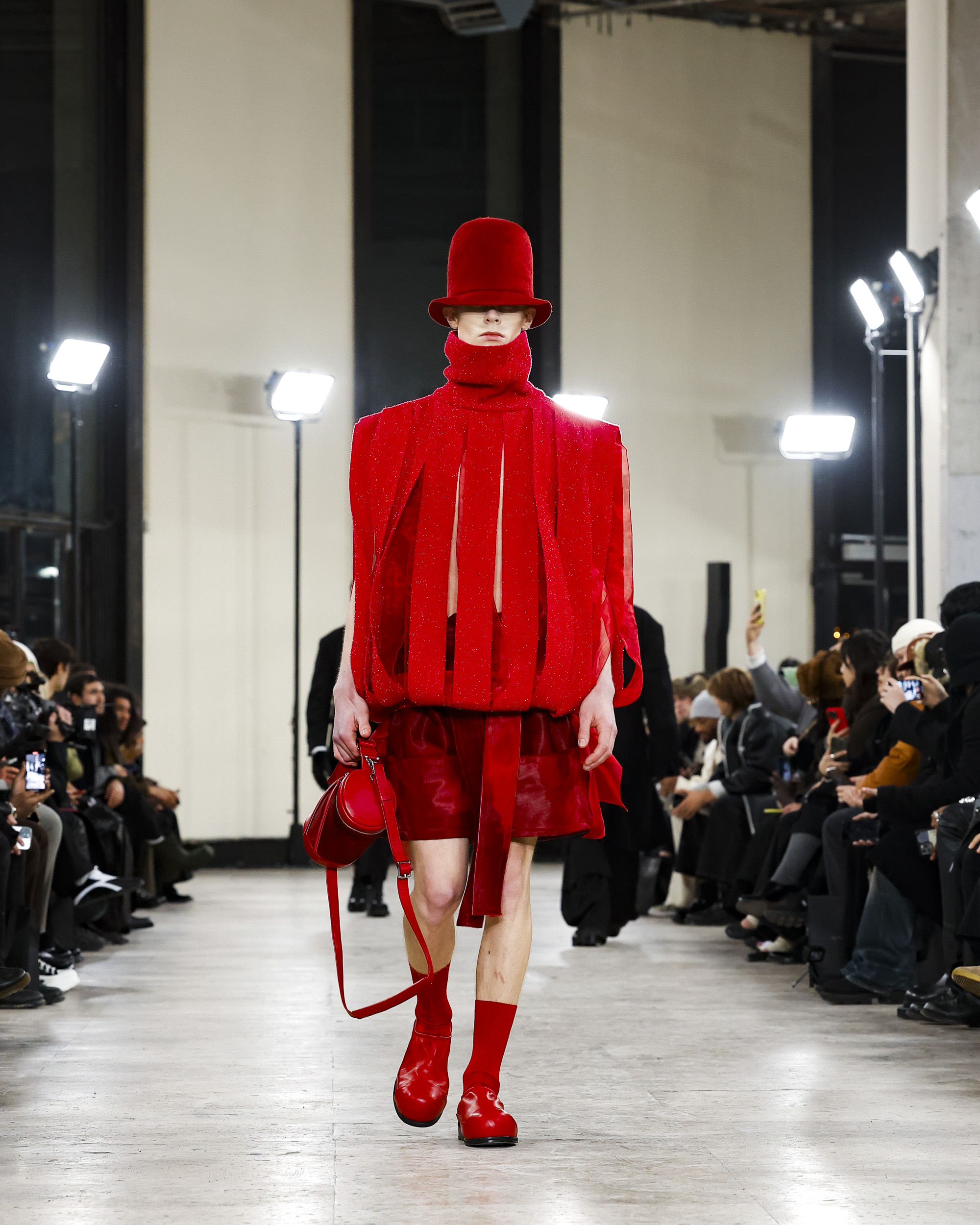 Les coupes verticales et horizontales sont prédominantes, reflétant la méthode de peinture de Songzio où les traits verticaux représentent l’objet et les horizontaux, ses émotions. Cette saison, la palette de couleurs audacieuse avec des rouges cardinaux et des jaunes dorés tranche avec les looks monochromes signature de la marque, mettant en avant des tissus métalliques, des tricots épais, des laines bouclées et tweedées, ainsi que du cuir, pour une élégance audacieuse et texturée.