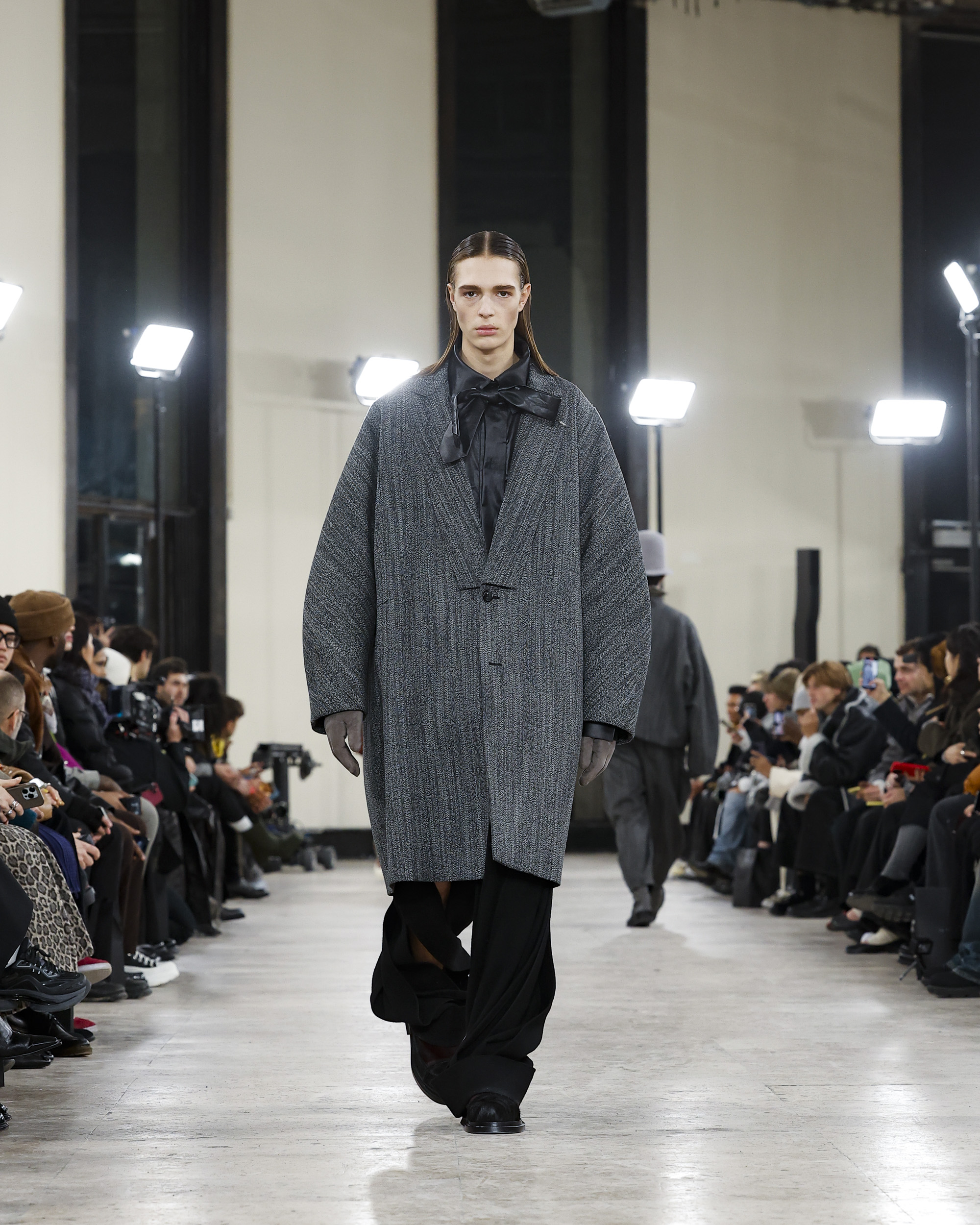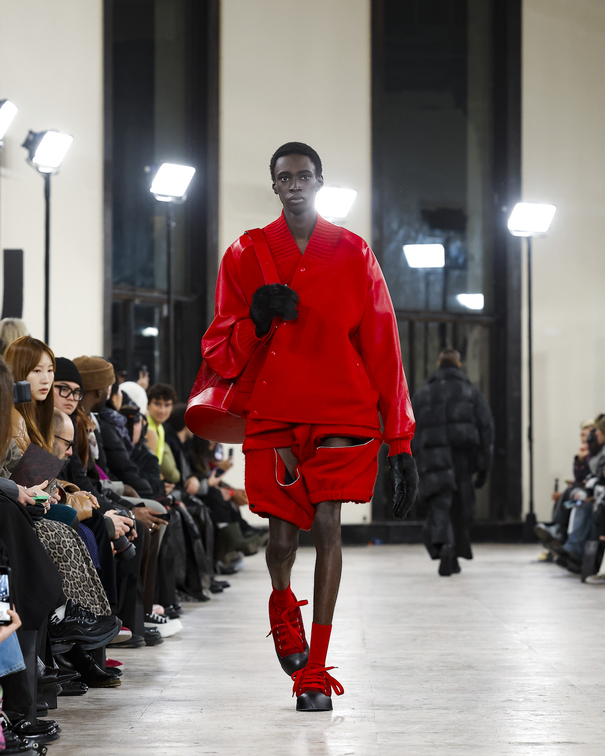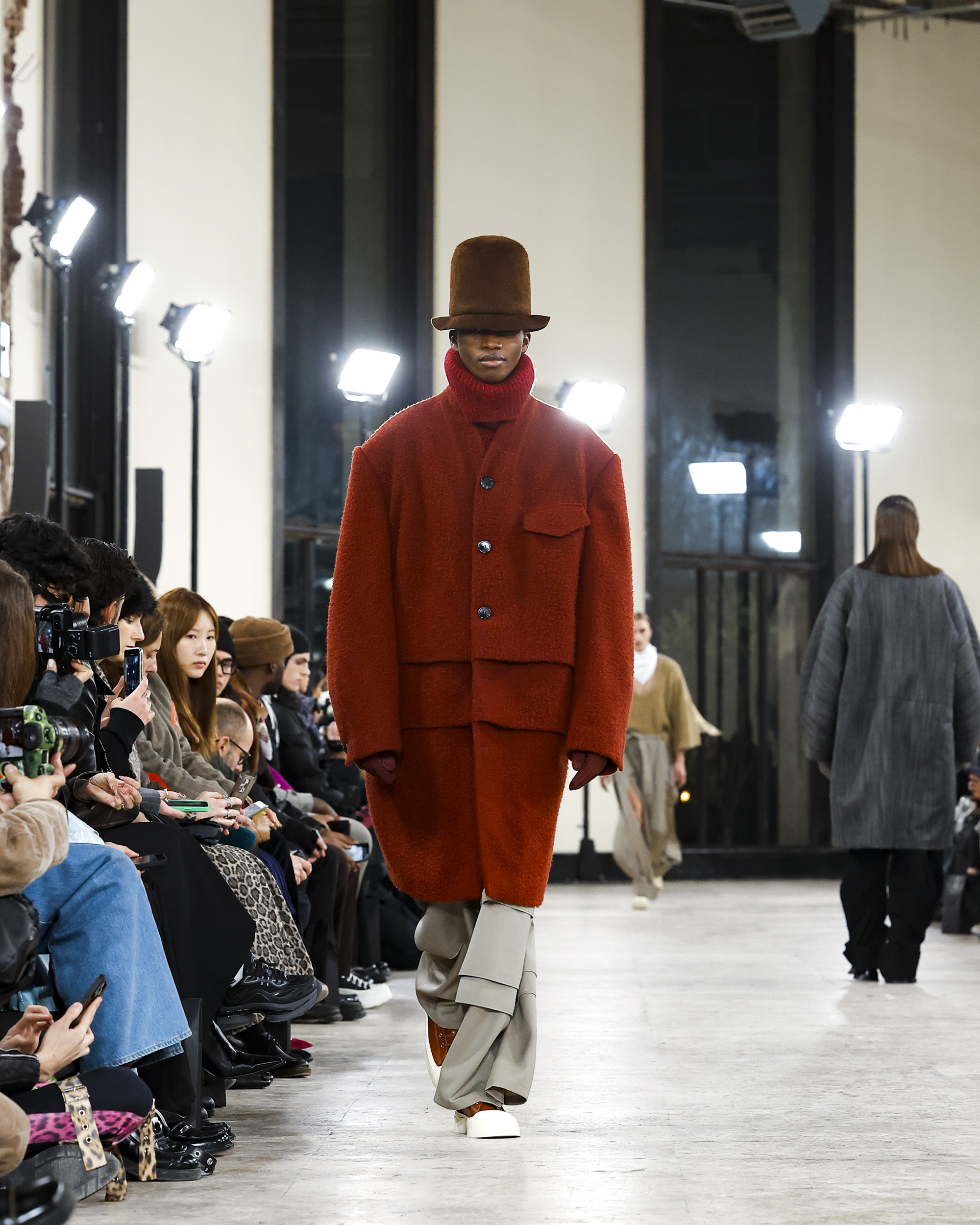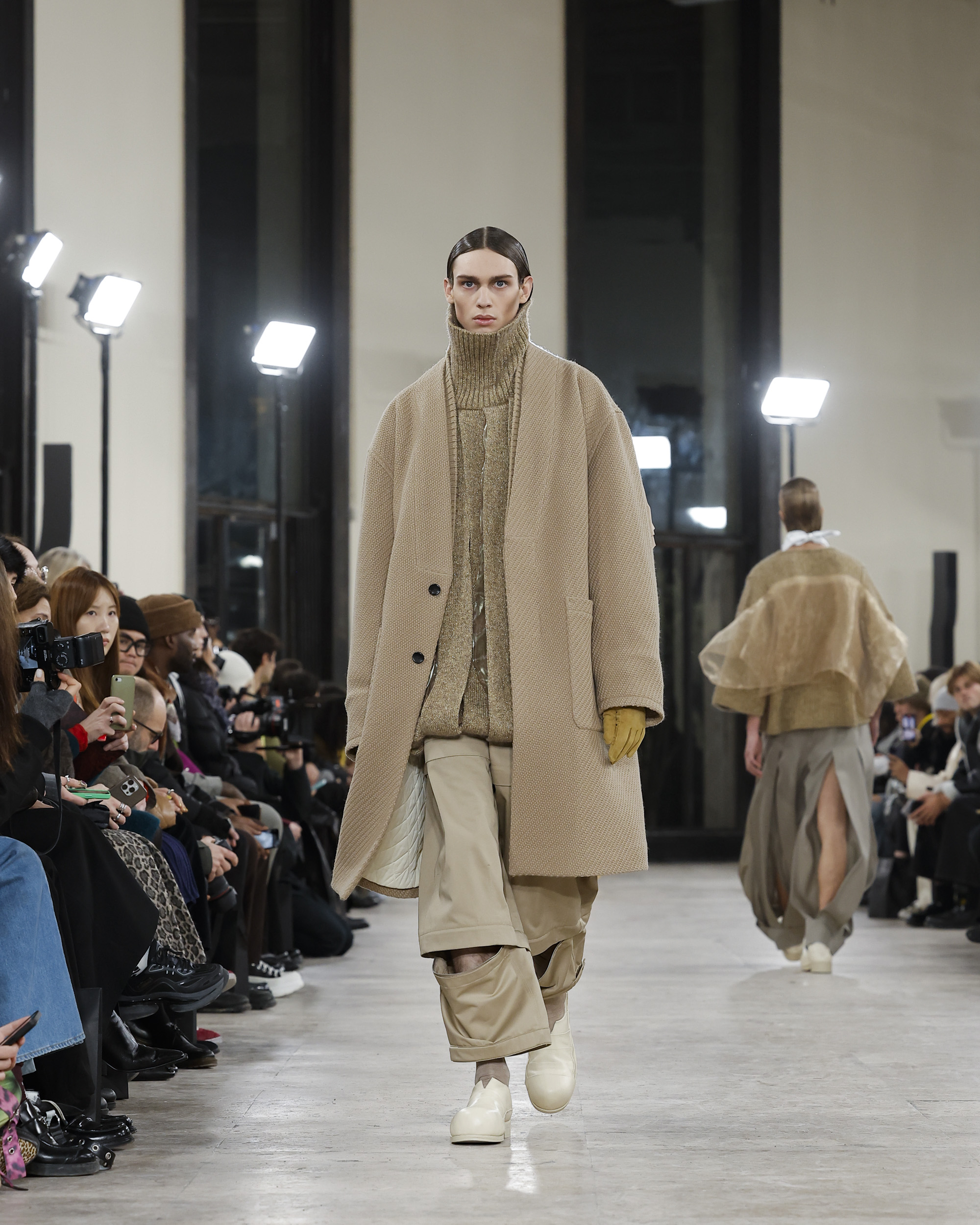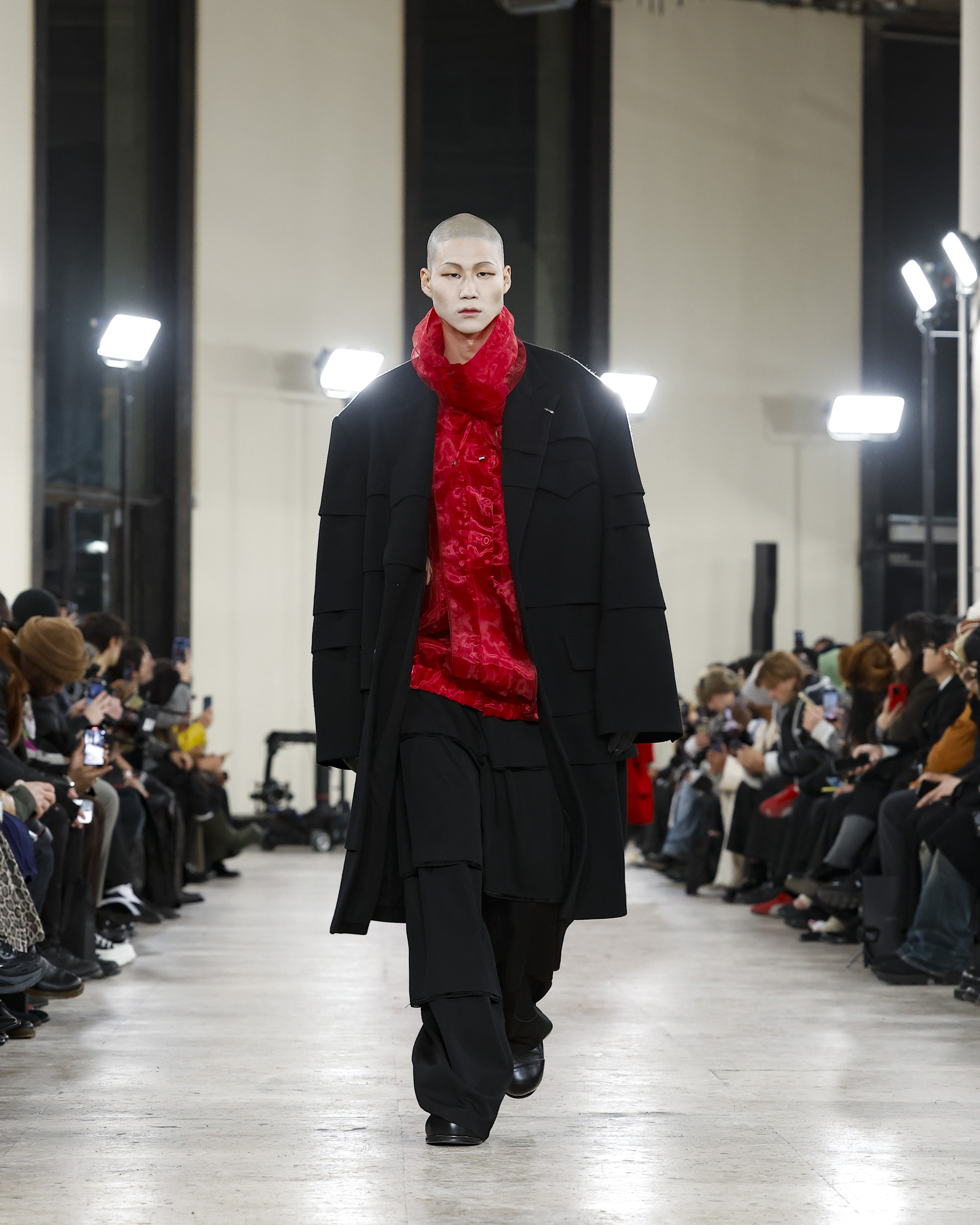 Les coupes verticales et horizontales sont prédominantes, reflétant la méthode de peinture de Songzio où les traits verticaux représentent l’objet et les horizontaux, ses émotions. Cette saison, la palette de couleurs audacieuse avec des rouges cardinaux et des jaunes dorés tranche avec les looks monochromes signature de la marque, mettant en avant des tissus métalliques, des tricots épais, des laines bouclées et tweedées, ainsi que du cuir, pour une élégance audacieuse et texturée.