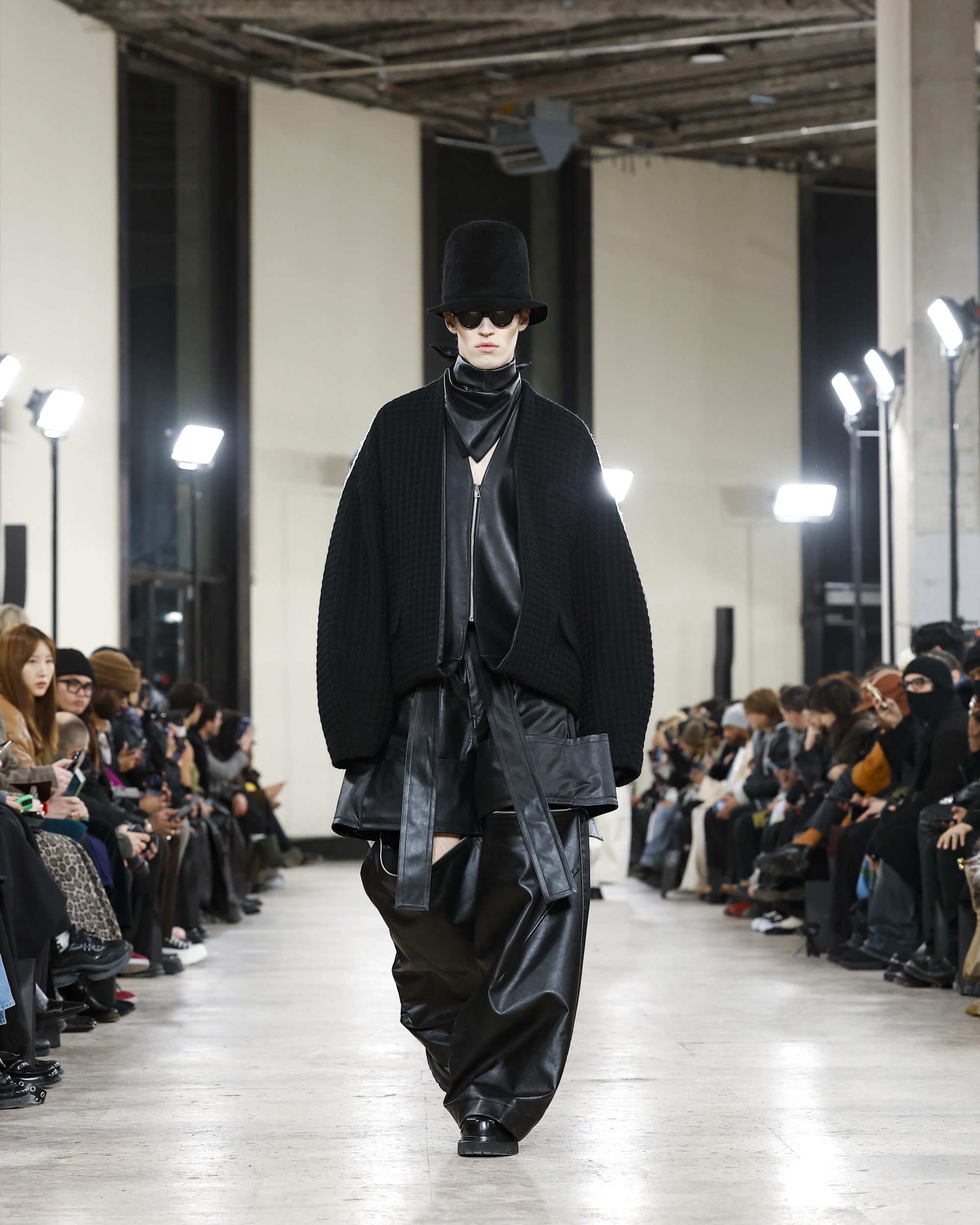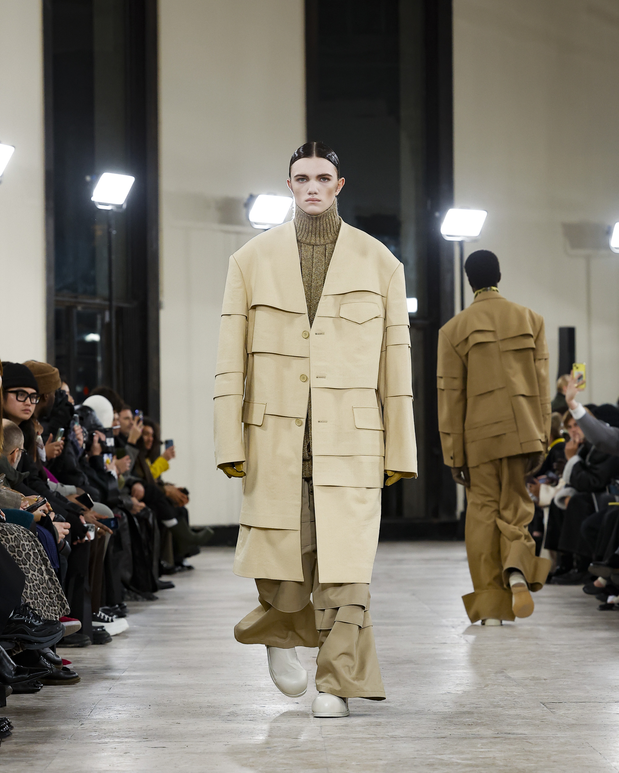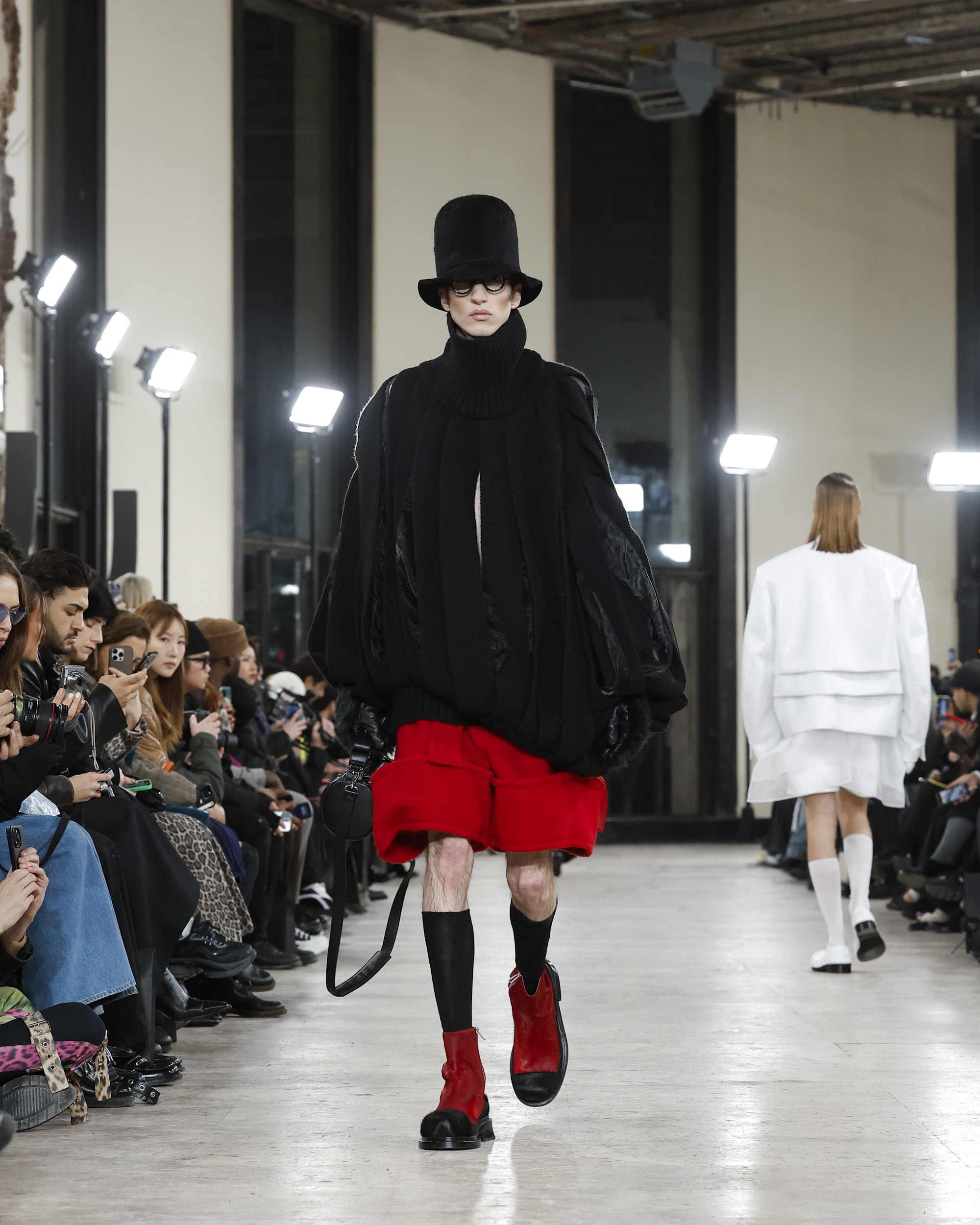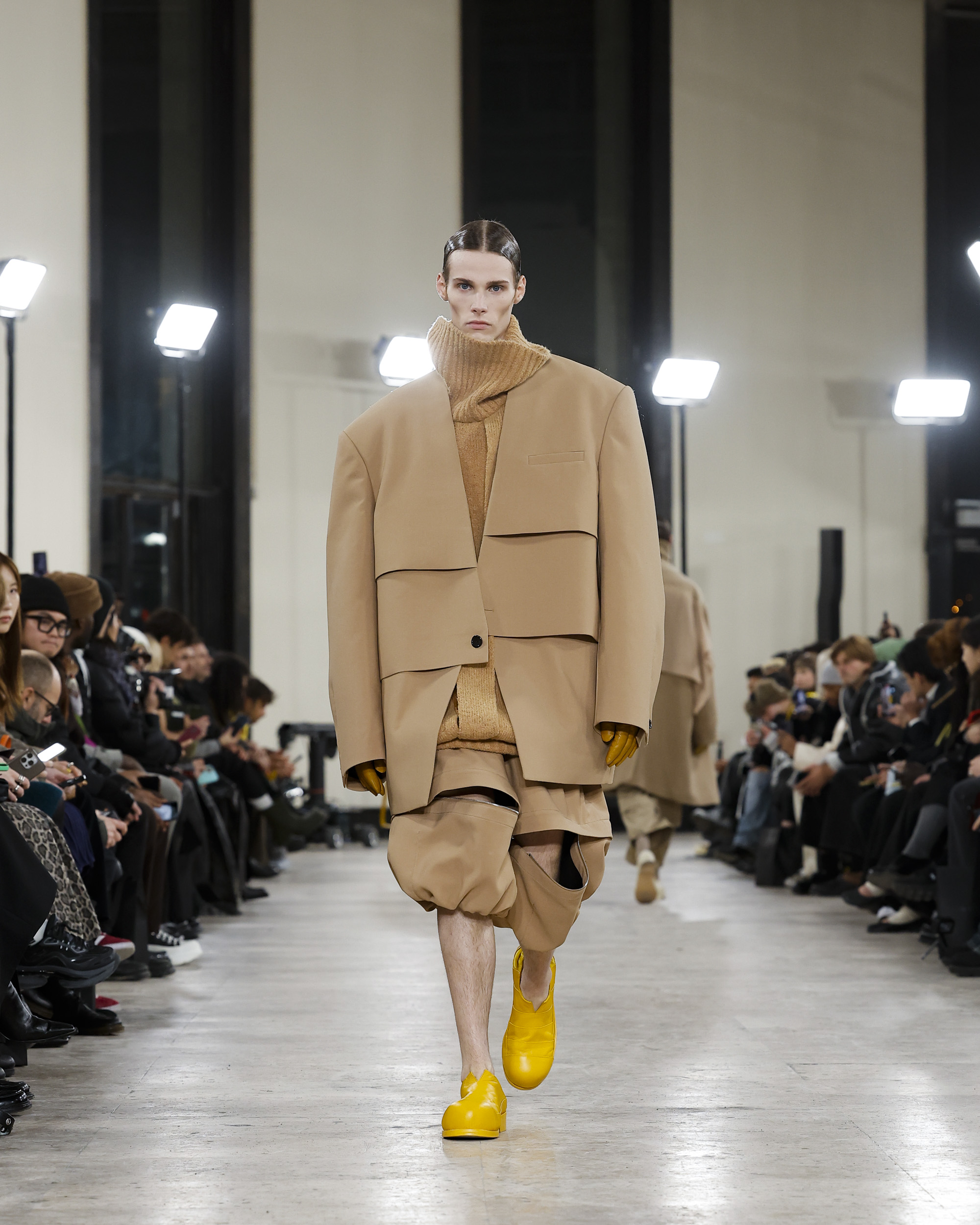 Les coupes verticales et horizontales sont prédominantes, reflétant la méthode de peinture de Songzio où les traits verticaux représentent l’objet et les horizontaux, ses émotions. Cette saison, la palette de couleurs audacieuse avec des rouges cardinaux et des jaunes dorés tranche avec les looks monochromes signature de la marque, mettant en avant des tissus métalliques, des tricots épais, des laines bouclées et tweedées, ainsi que du cuir, pour une élégance audacieuse et texturée.