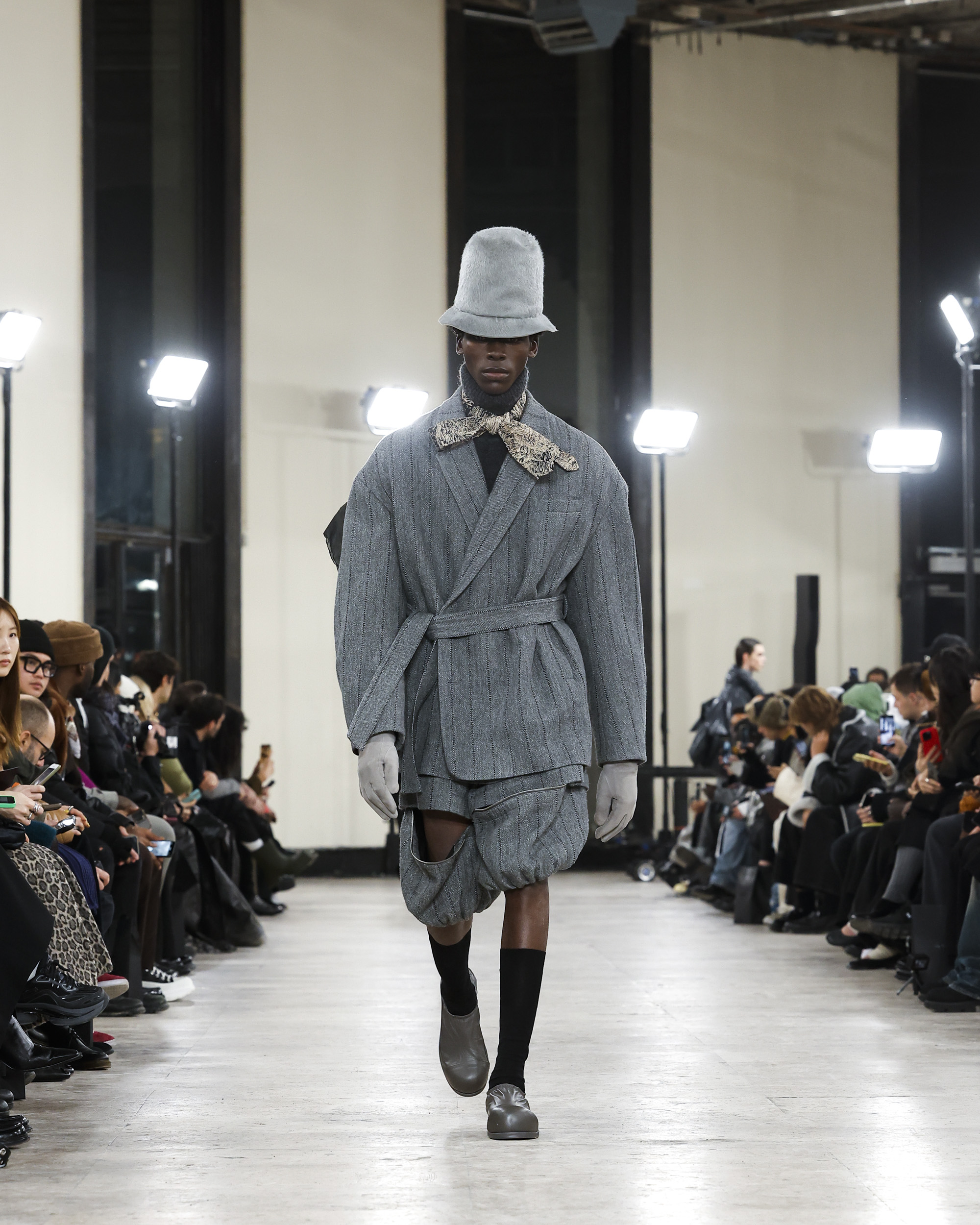 La modernité orientale de Songzio se dévoile à travers des silhouettes classiques – cocoon, dolman, et cloche – où courbes et angles coexistent, évoquant les armures anciennes par des pièces « placées », symétriques ou asymétriques. Cette dualité se poursuit avec des drapés et superpositions asymétriques qui ajoutent fluidité et imperfection, sculpturaux dans leur immobilité mais fluides dans le mouvement.
