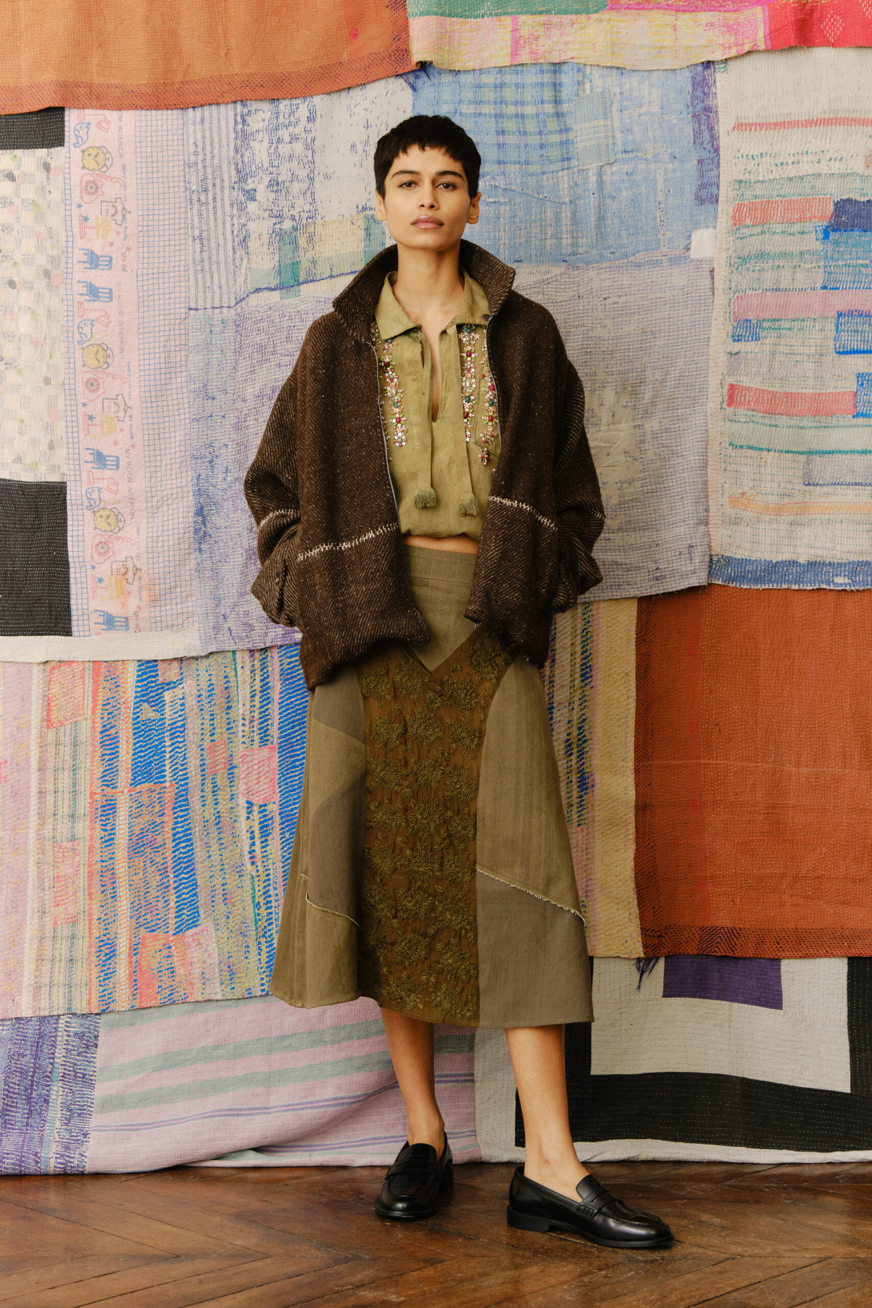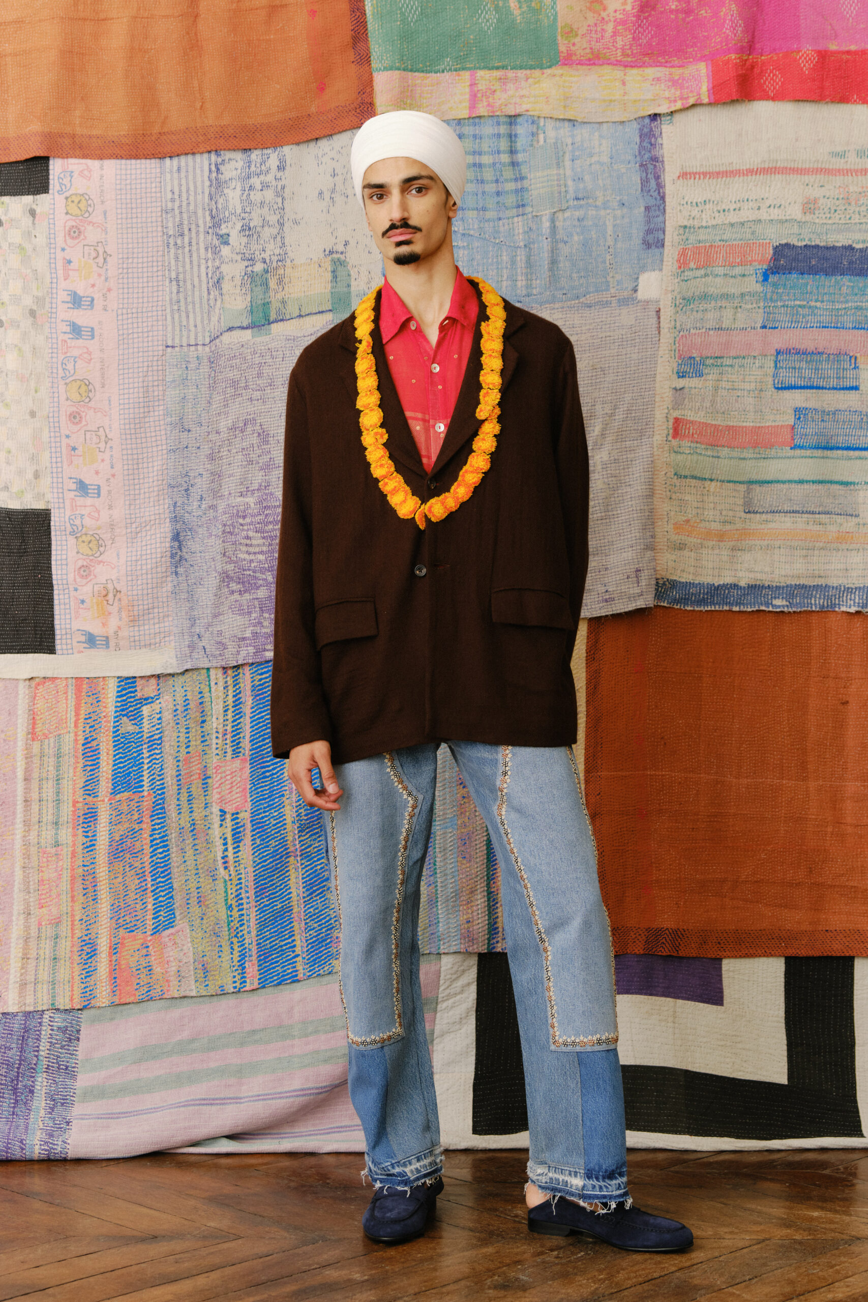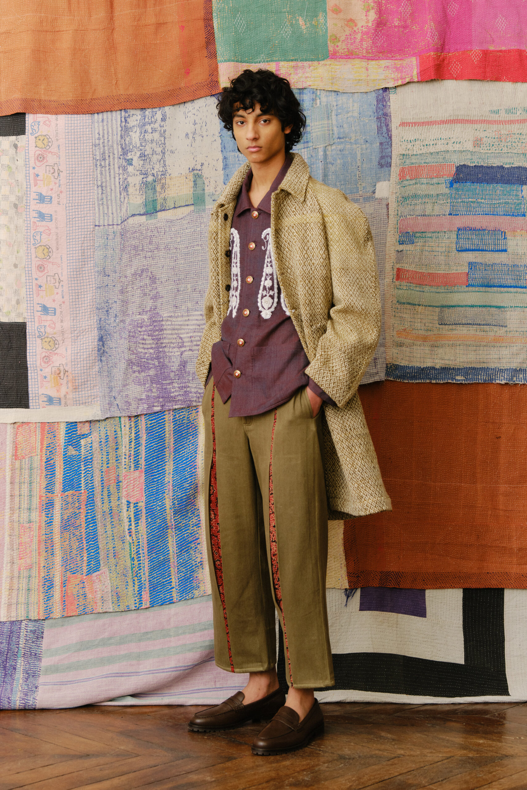 La collaboration avec la marque britannique iconique Baracuta est au cœur de la collection AW24, avec une réinterprétation du célèbre blouson Harrington G9. Utilisant des tissus matelassés et une doublure à carreaux tissée à la main, la collection introduit également des motifs brodés en trompe-l’œil et des tissus en laine imprimés à la main, témoignant de la richesse de l’artisanat indien.