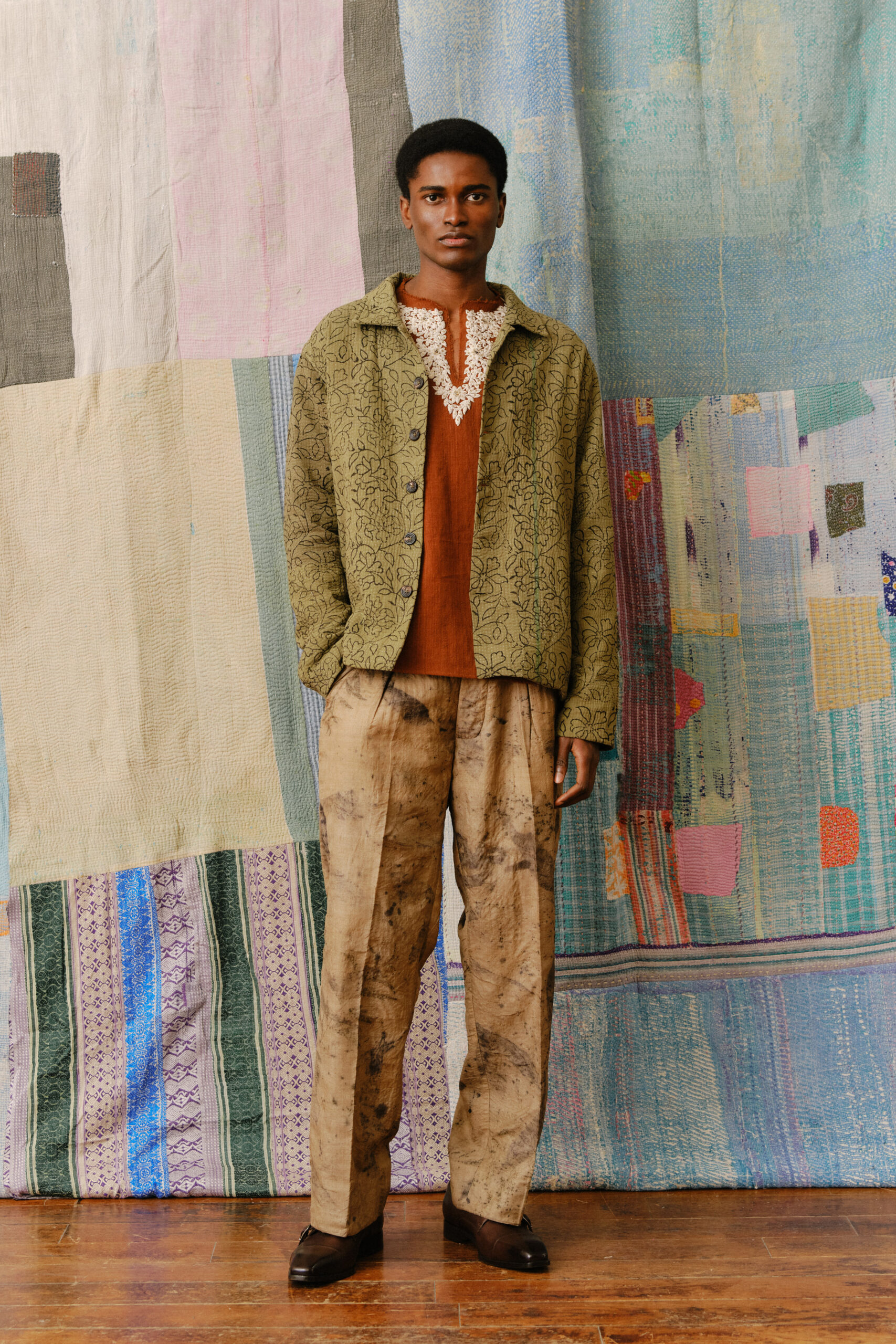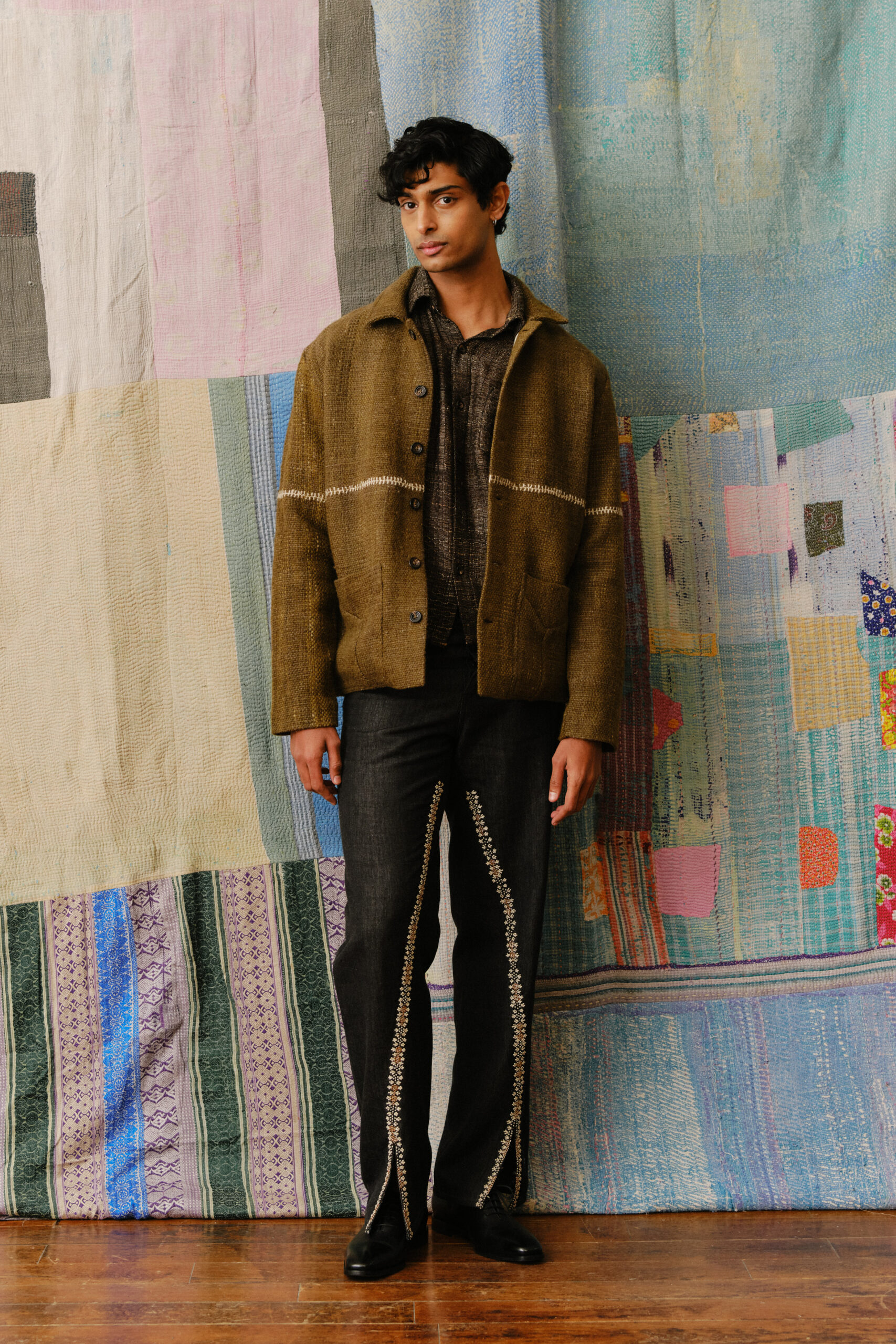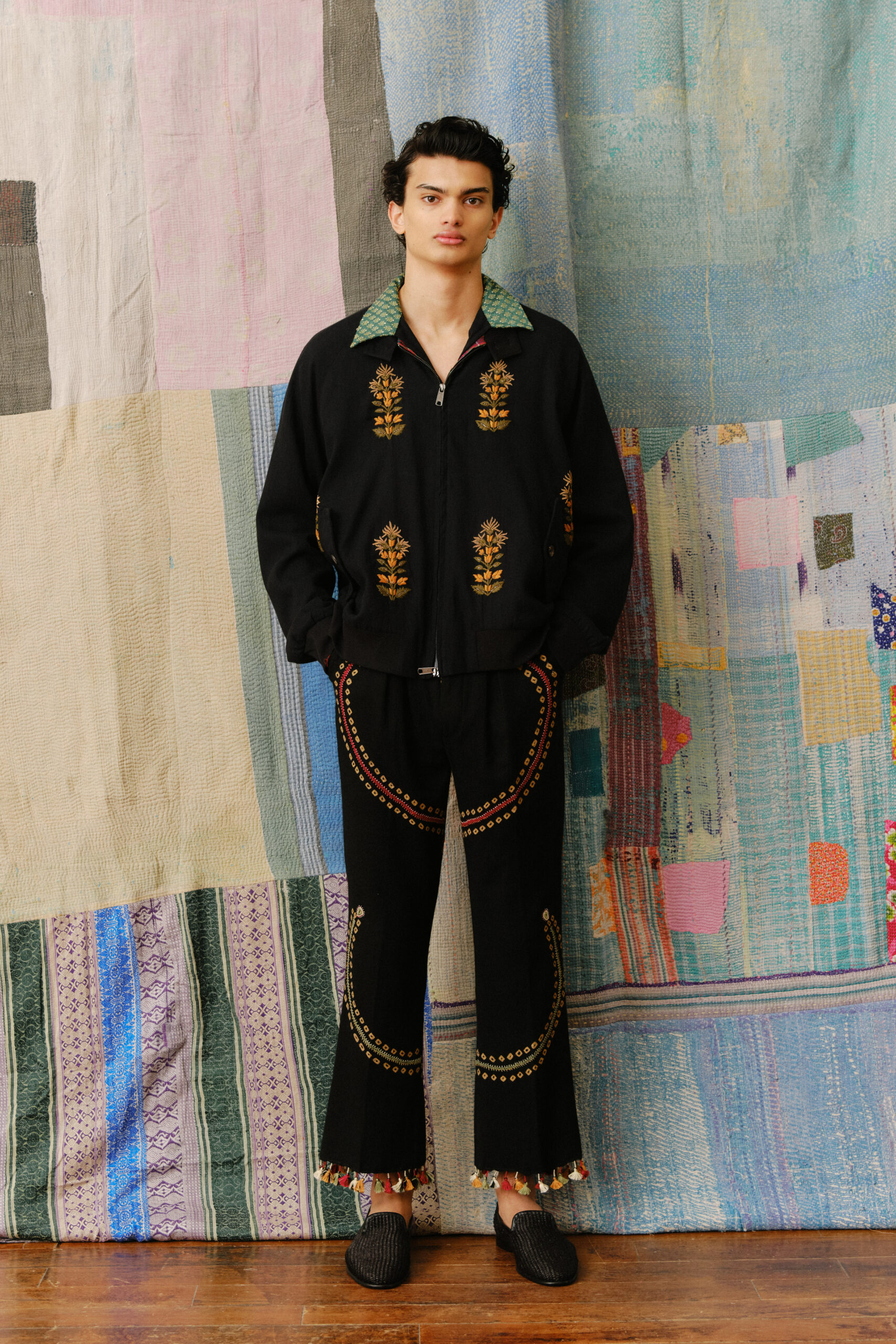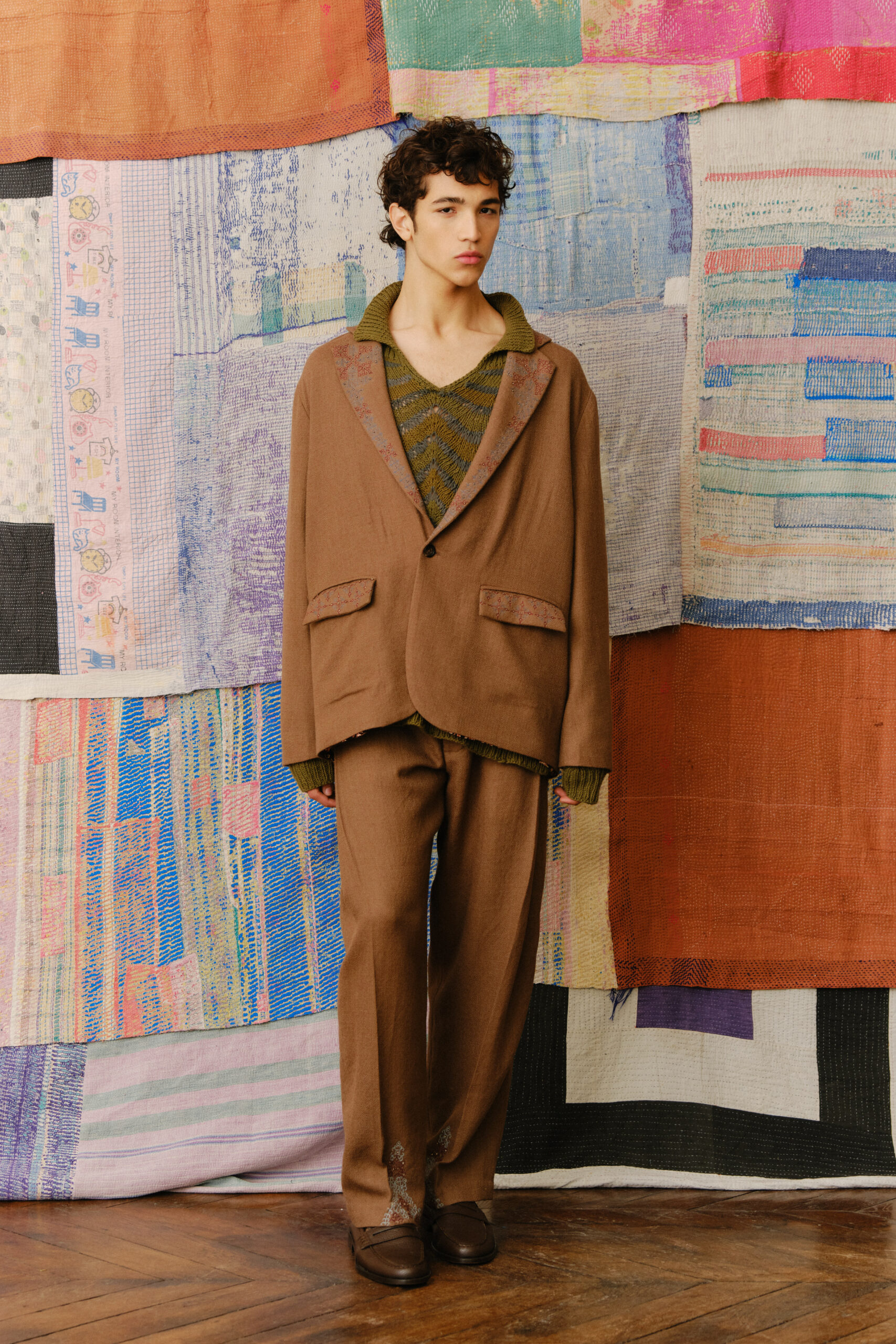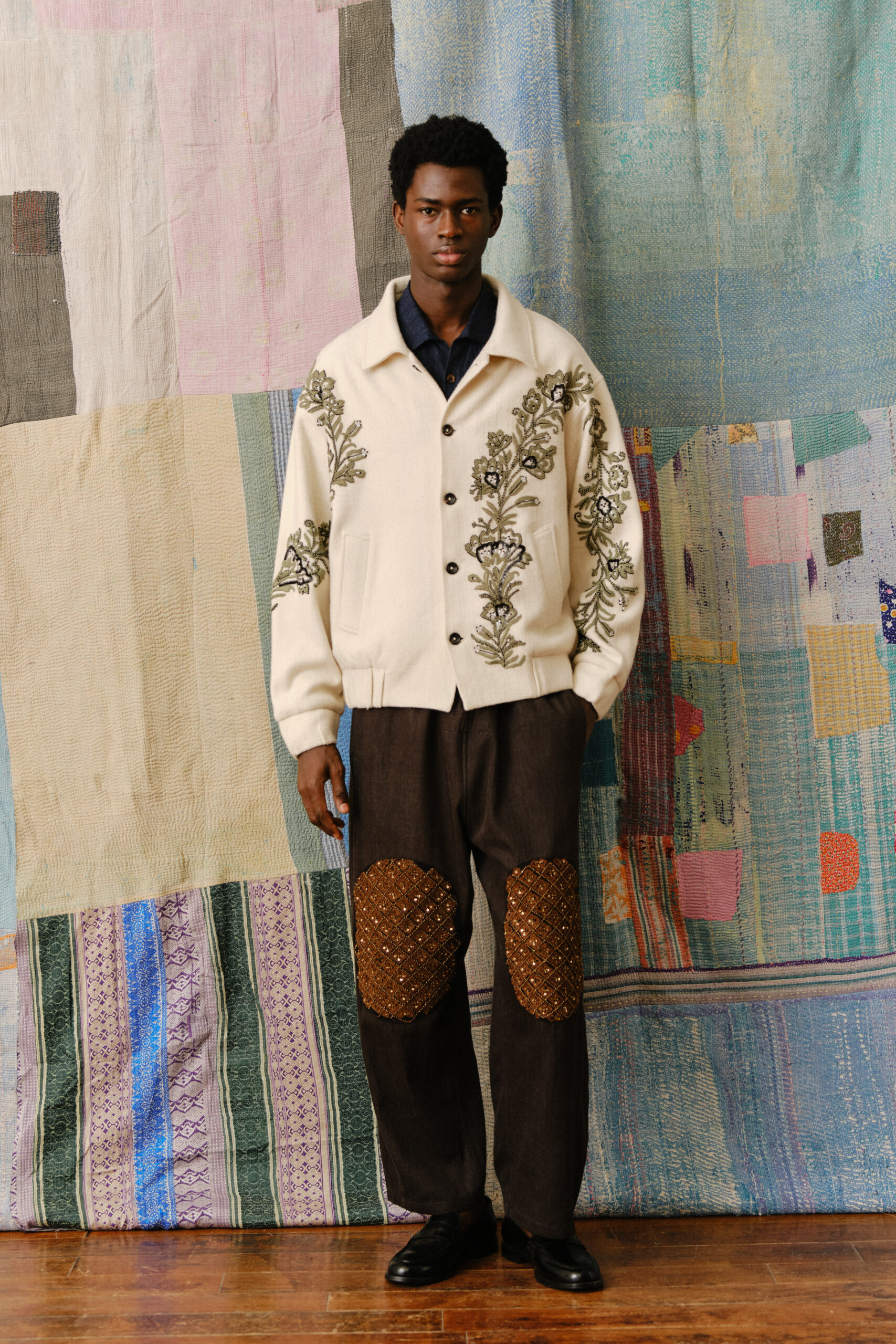La collaboration avec la marque britannique iconique Baracuta est au cœur de la collection AW24, avec une réinterprétation du célèbre blouson Harrington G9. Utilisant des tissus matelassés et une doublure à carreaux tissée à la main, la collection introduit également des motifs brodés en trompe-l’œil et des tissus en laine imprimés à la main, témoignant de la richesse de l’artisanat indien.