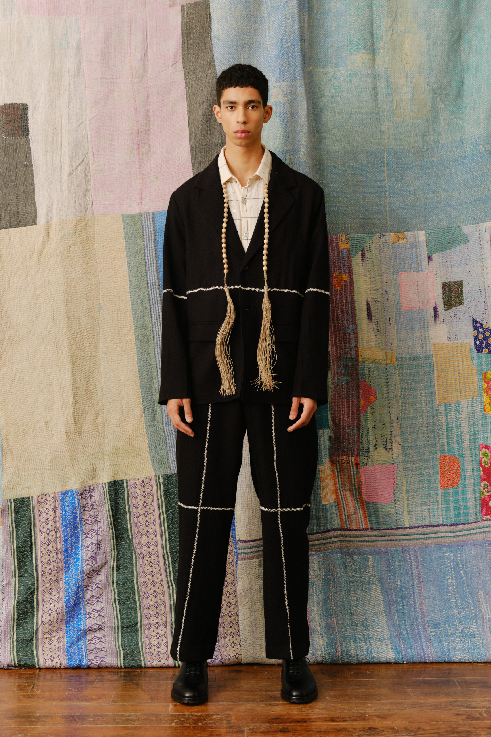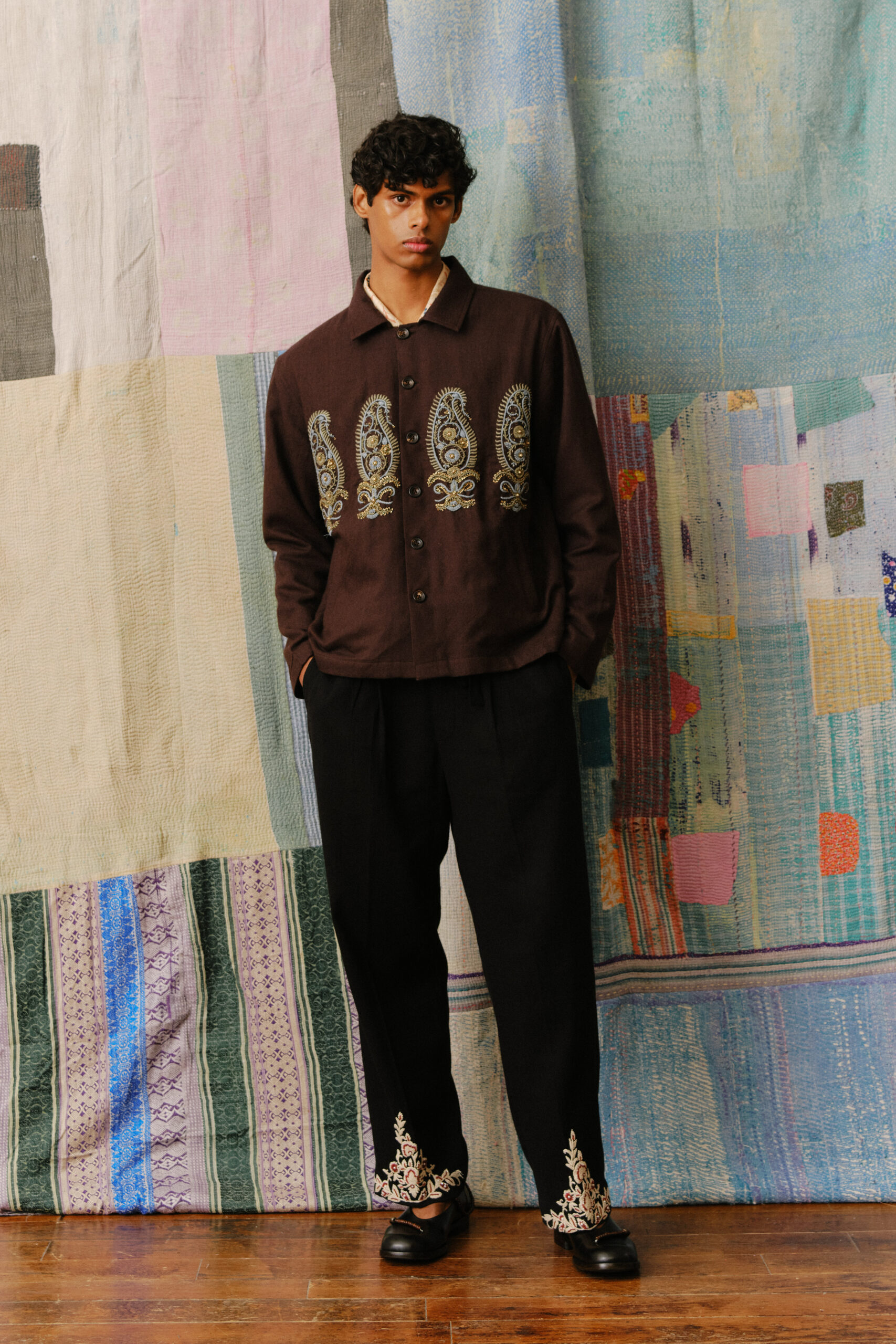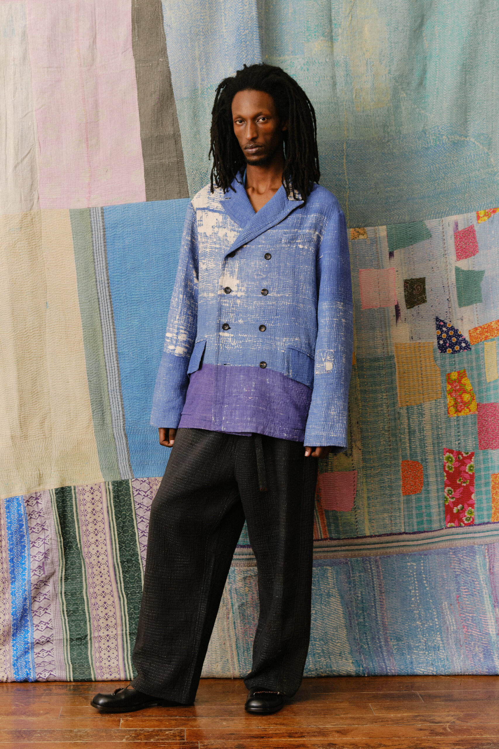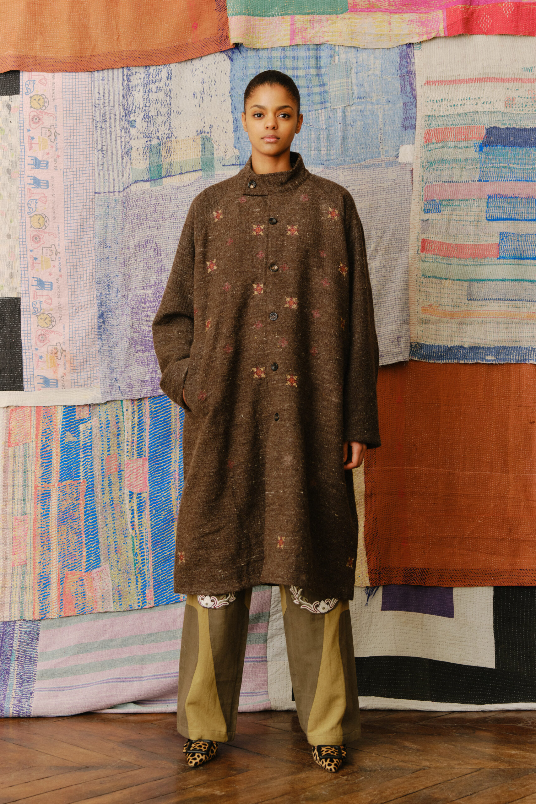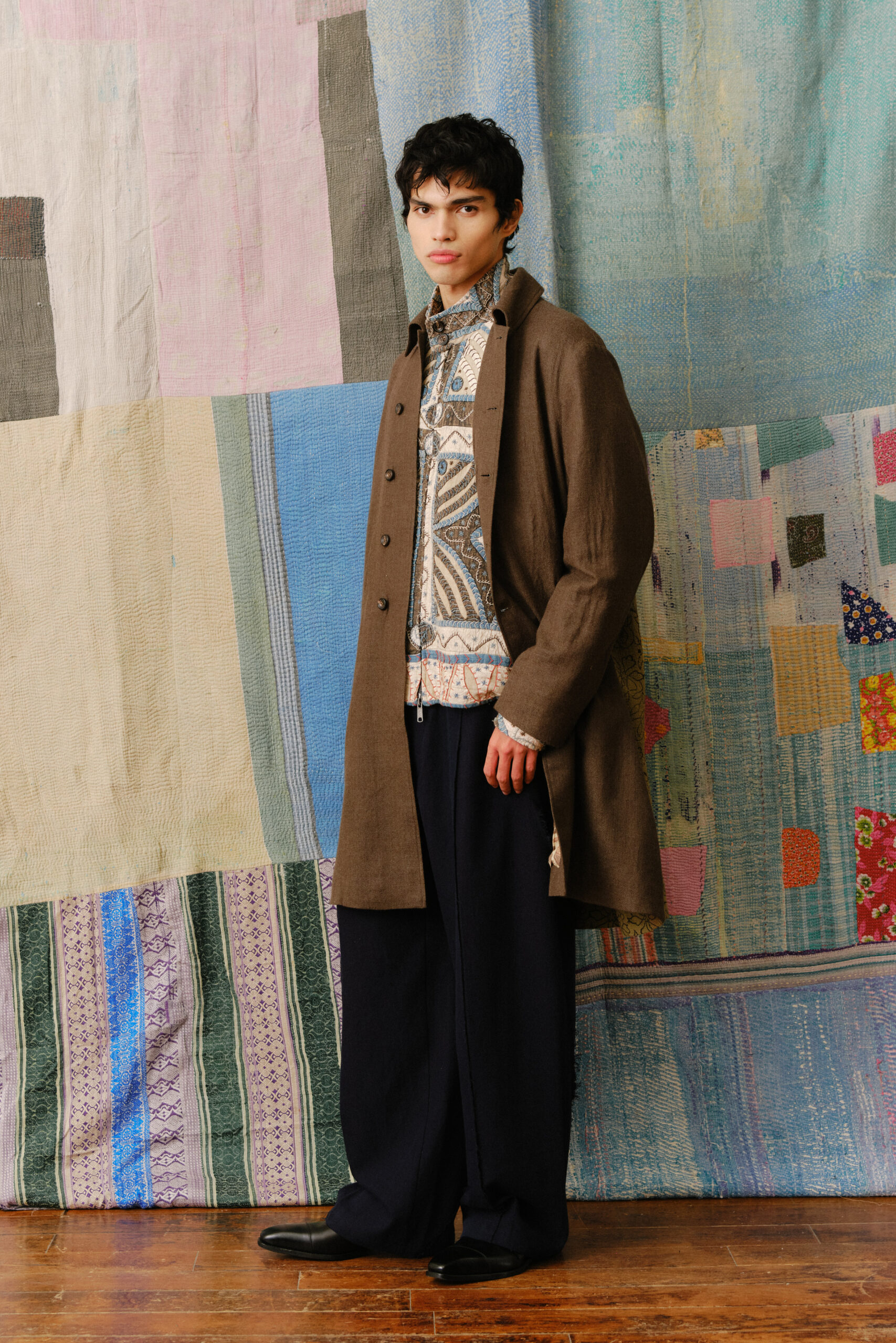 La collaboration avec la marque britannique iconique Baracuta est au cœur de la collection AW24, avec une réinterprétation du célèbre blouson Harrington G9. Utilisant des tissus matelassés et une doublure à carreaux tissée à la main, la collection introduit également des motifs brodés en trompe-l’œil et des tissus en laine imprimés à la main, témoignant de la richesse de l’artisanat indien.