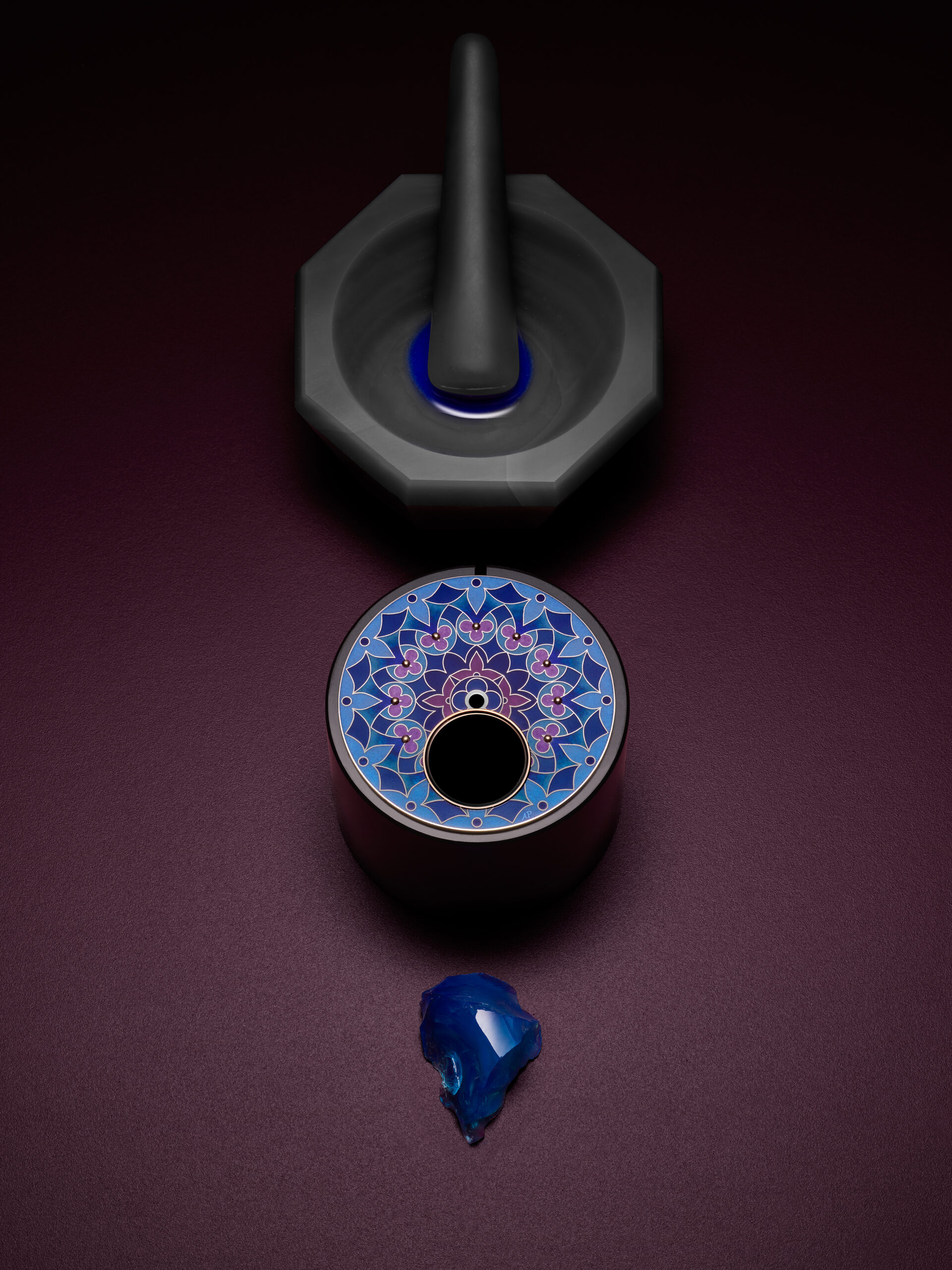 Le cadran de la Tambour Moon Tourbillon Volant Kaléidoscope est un chef-d’œuvre d’émail cloisonné contemporain. Cette technique ancestrale consiste à dessiner des motifs à l’aide de fils d’or, qui sont ensuite remplis d’émail. Pour cette montre, Louis Vuitton a confié cette tâche délicate à l’artisan Anita Porchet. La particularité de ce cadran réside dans le fait qu’il est entièrement consacré à l’émail cloisonné, sans aucune autre signature. Cela permet de mettre en valeur le travail exceptionnel d’Anita Porchet, qui a dû maîtriser les nuances les plus subtiles de violet en émaillage. Plusieurs semaines de recherche ont été nécessaires pour obtenir les teintes parfaites, avec des dégradés de violet intense et différentes nuances de bleus. Le résultat est hypnotique, renforcé par la mise en abyme des Fleurs de Monogram.