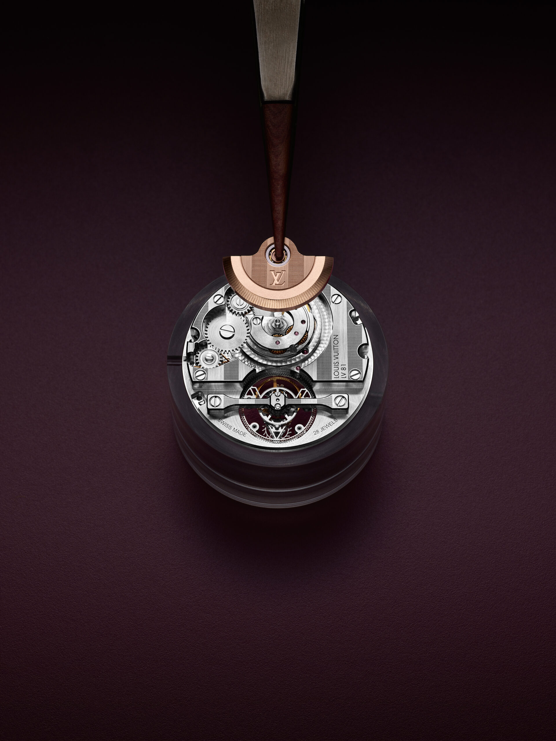Sous le cadran, bat le cœur de la Tambour Moon : le calibre LV 81 à tourbillon volant. Ce mouvement mécanique à remontage automatique, entièrement développé et assemblé par la Fabrique du Temps Louis Vuitton, est une prouesse horlogère. Le tourbillon volant, placé à 6 heures, arbore un design épuré avec le V de Gaston Vuitton au cœur de la cage. À l’arrière de la montre, une glace saphir permet d’admirer le micro-rotor et le mécanisme, dont le décor reprend les rayures emblématiques de la toile Trianon créée en 1858. C’est une véritable fusion entre tradition et singularité.