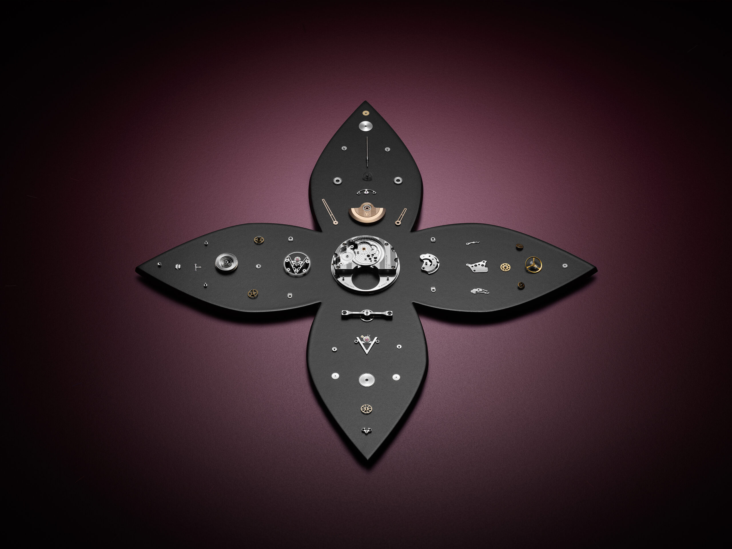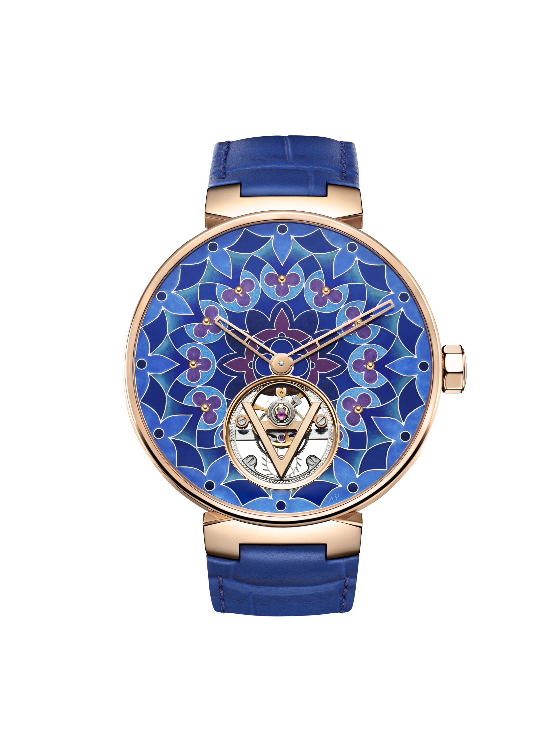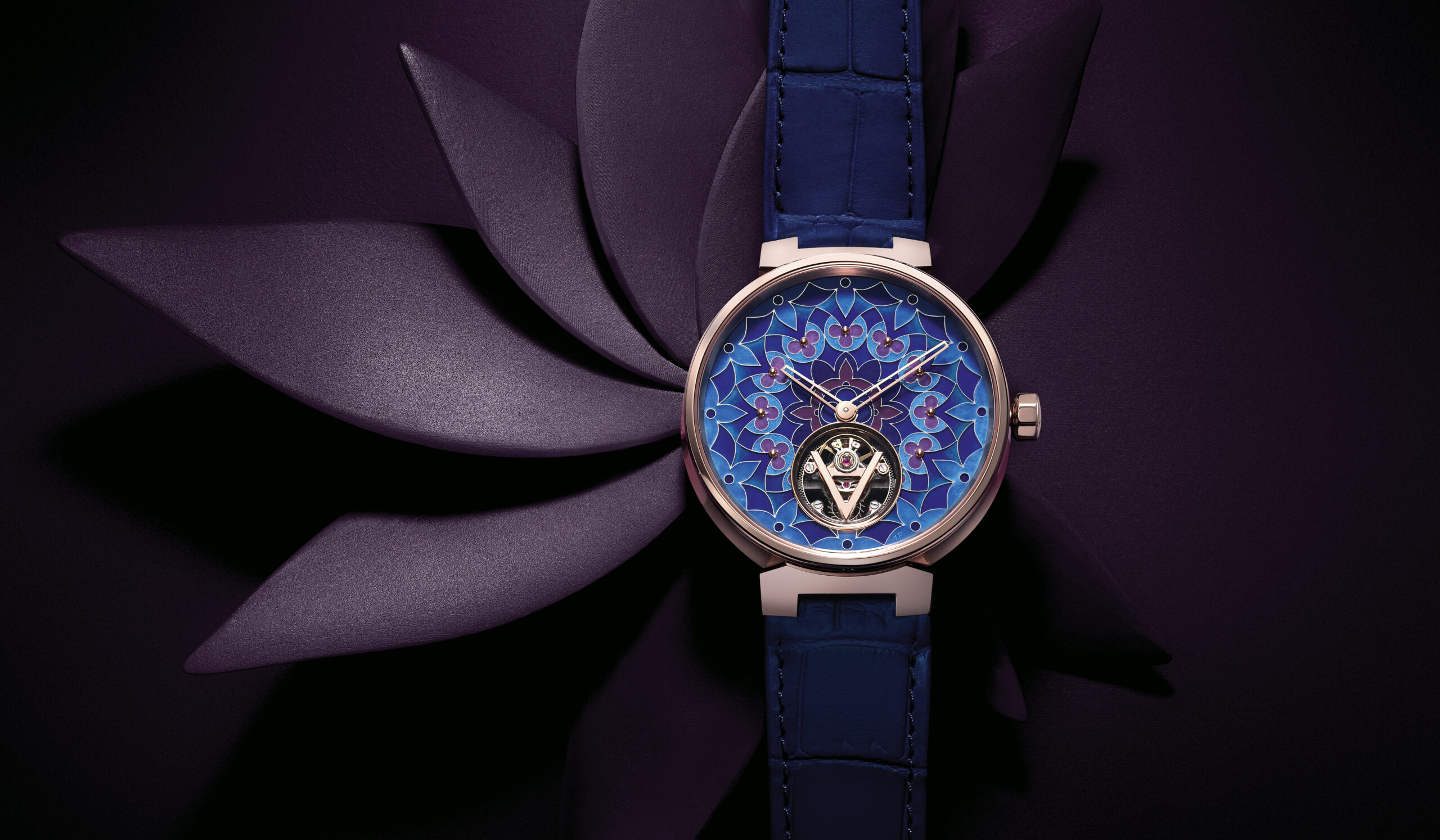 Le cadran de la Tambour Moon Tourbillon Volant Kaléidoscope est un chef-d’œuvre d’émail cloisonné contemporain. Cette technique ancestrale consiste à dessiner des motifs à l’aide de fils d’or, qui sont ensuite remplis d’émail. Pour cette montre, Louis Vuitton a confié cette tâche délicate à l’artisan Anita Porchet. La particularité de ce cadran réside dans le fait qu’il est entièrement consacré à l’émail cloisonné, sans aucune autre signature. Cela permet de mettre en valeur le travail exceptionnel d’Anita Porchet, qui a dû maîtriser les nuances les plus subtiles de violet en émaillage. Plusieurs semaines de recherche ont été nécessaires pour obtenir les teintes parfaites, avec des dégradés de violet intense et différentes nuances de bleus. Le résultat est hypnotique, renforcé par la mise en abyme des Fleurs de Monogram.