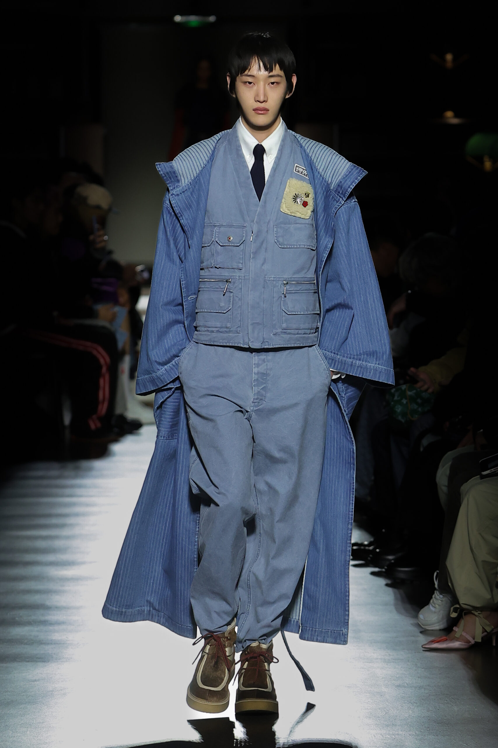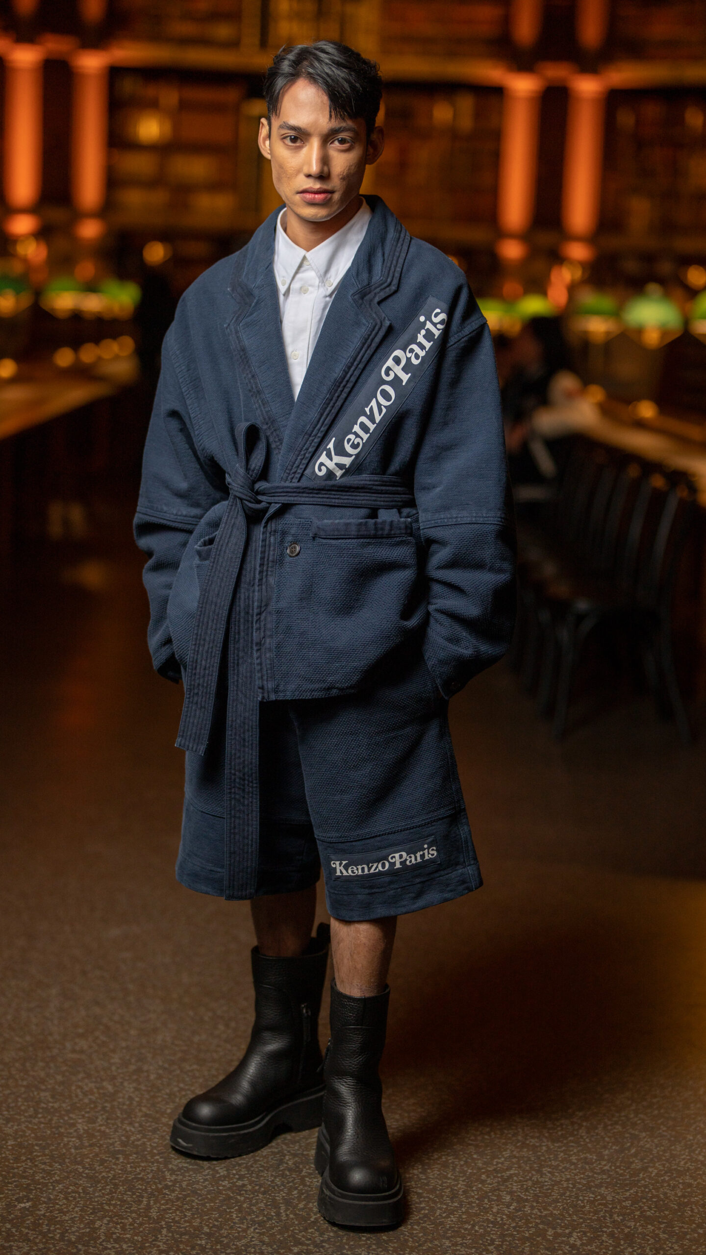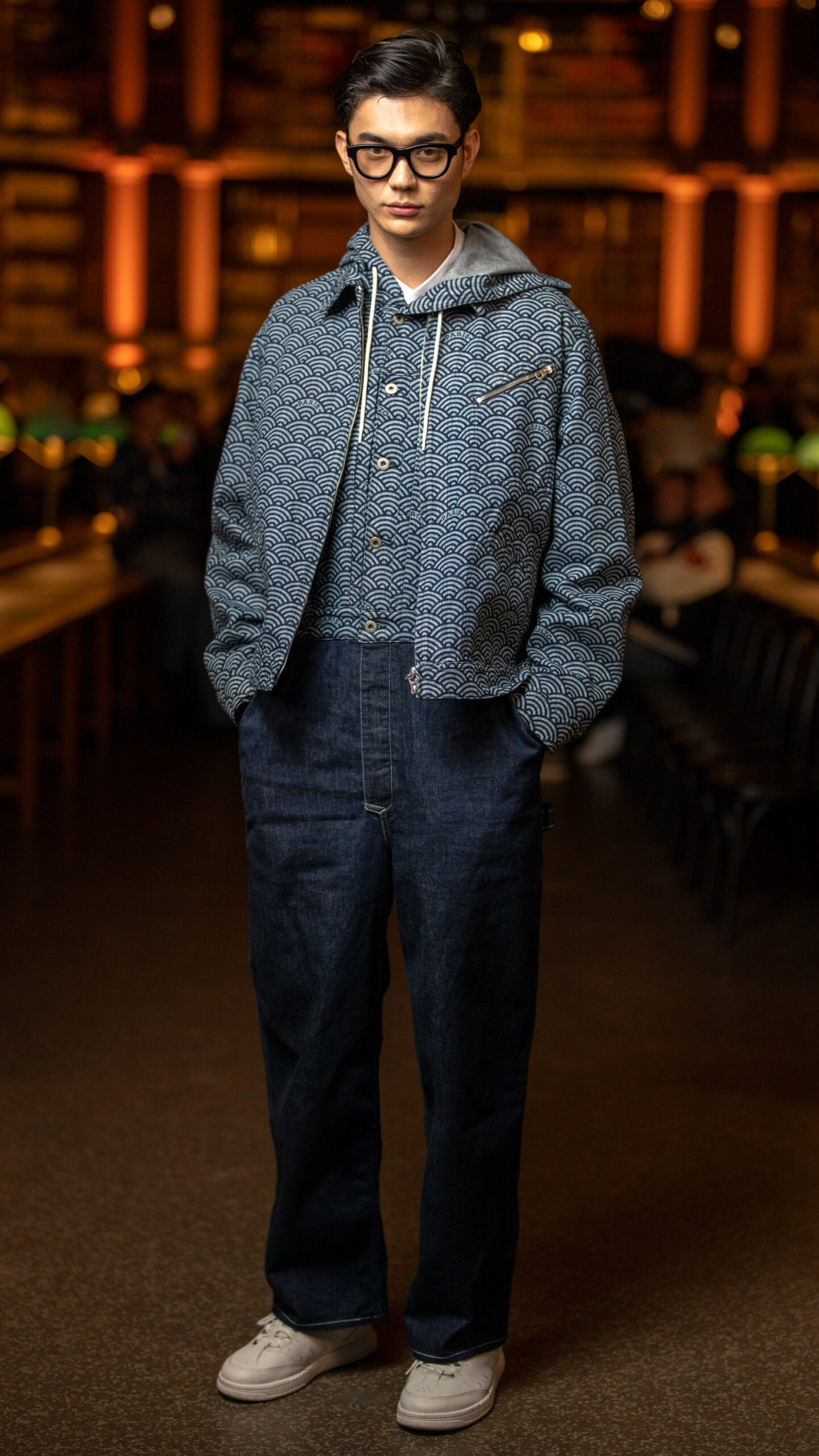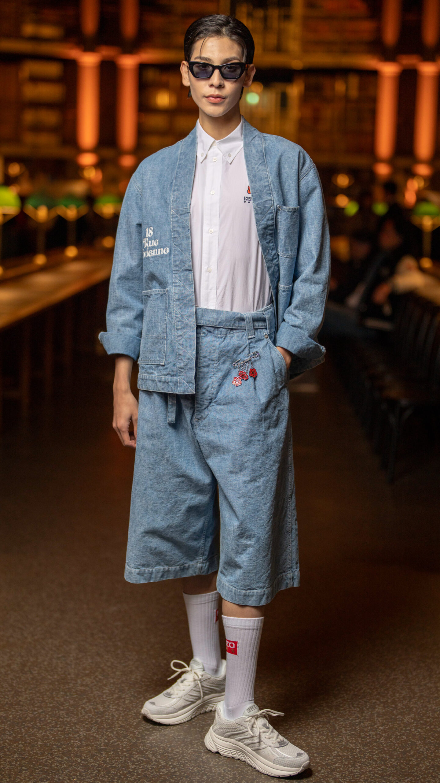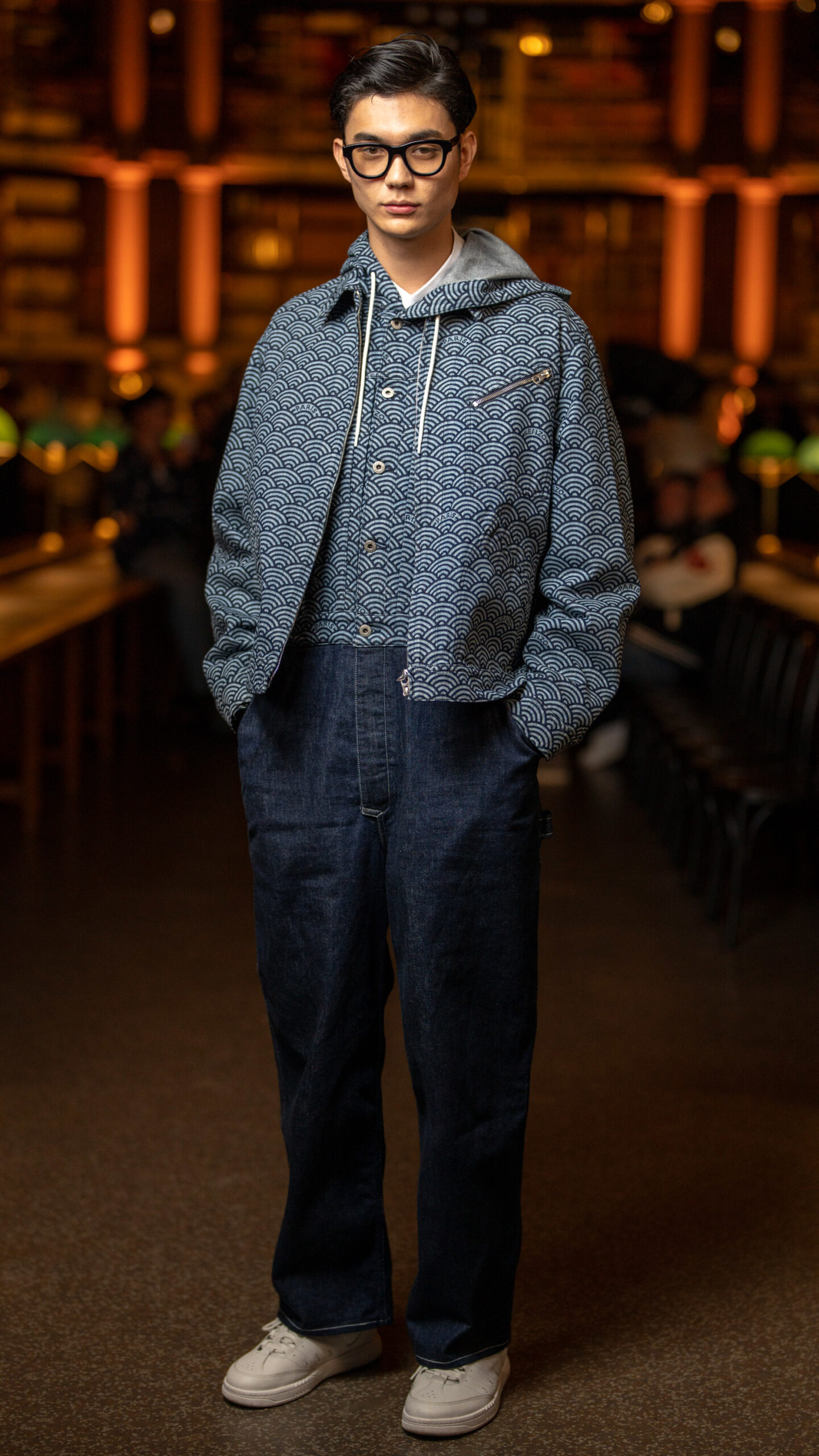 La collection met en avant les textures, du faux fourrure aux tricots tridimensionnels, en passant par les métalliques futuristes et les jacquards. Les costumes Gakuran, les cotons résistants et le denim dans diverses nuances renforcent l’écho entre passé et futur, tradition et innovation.