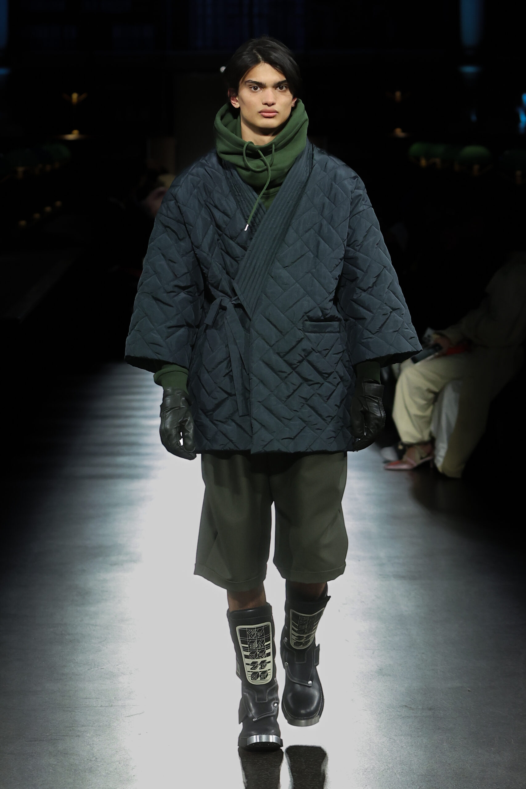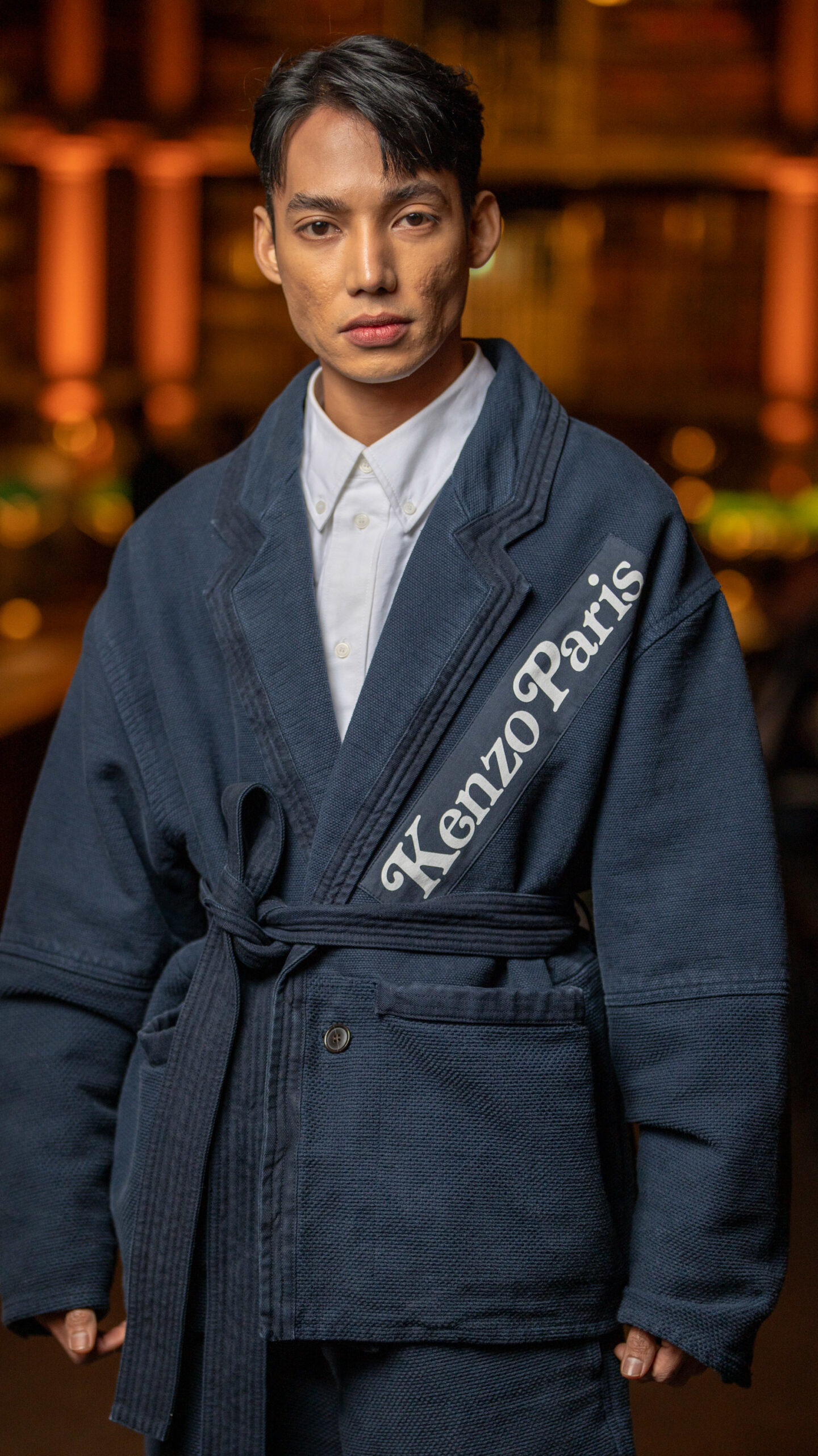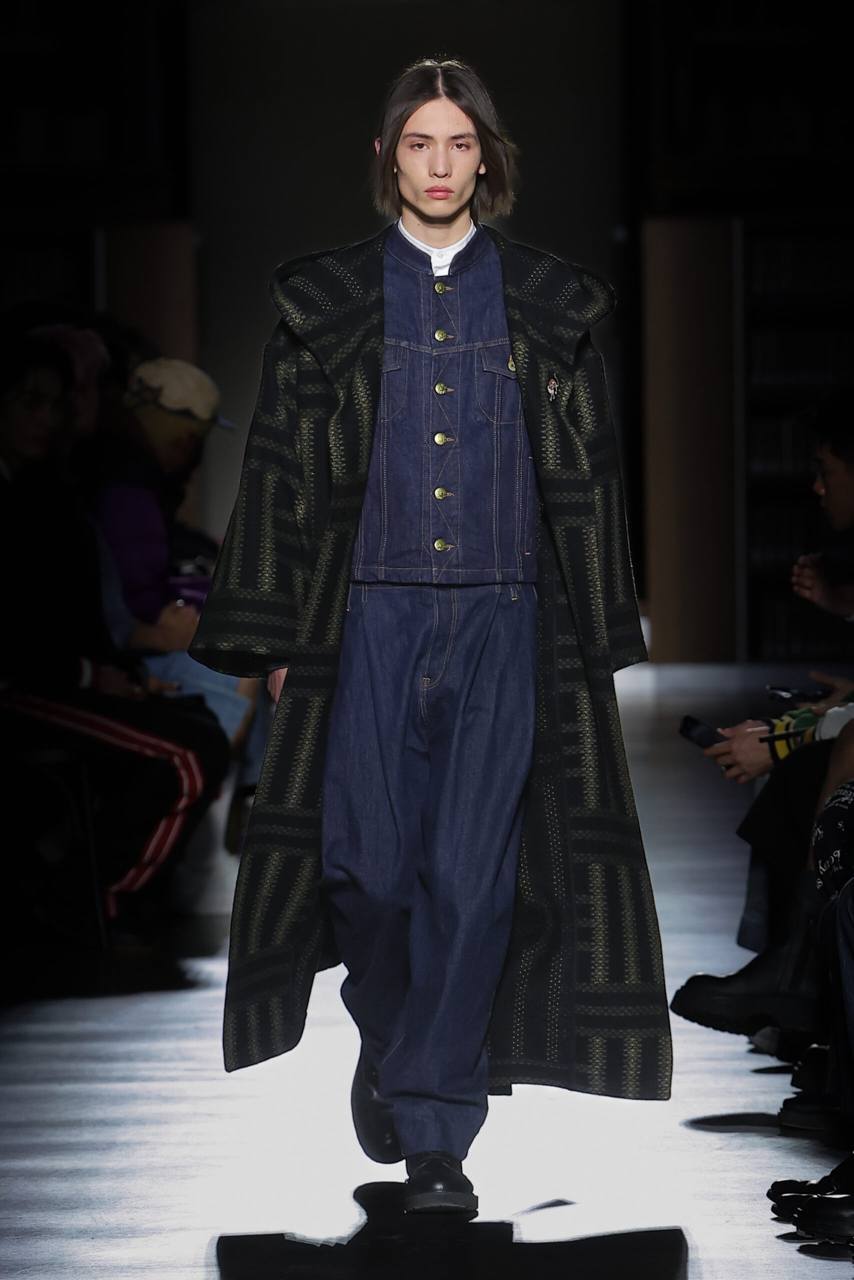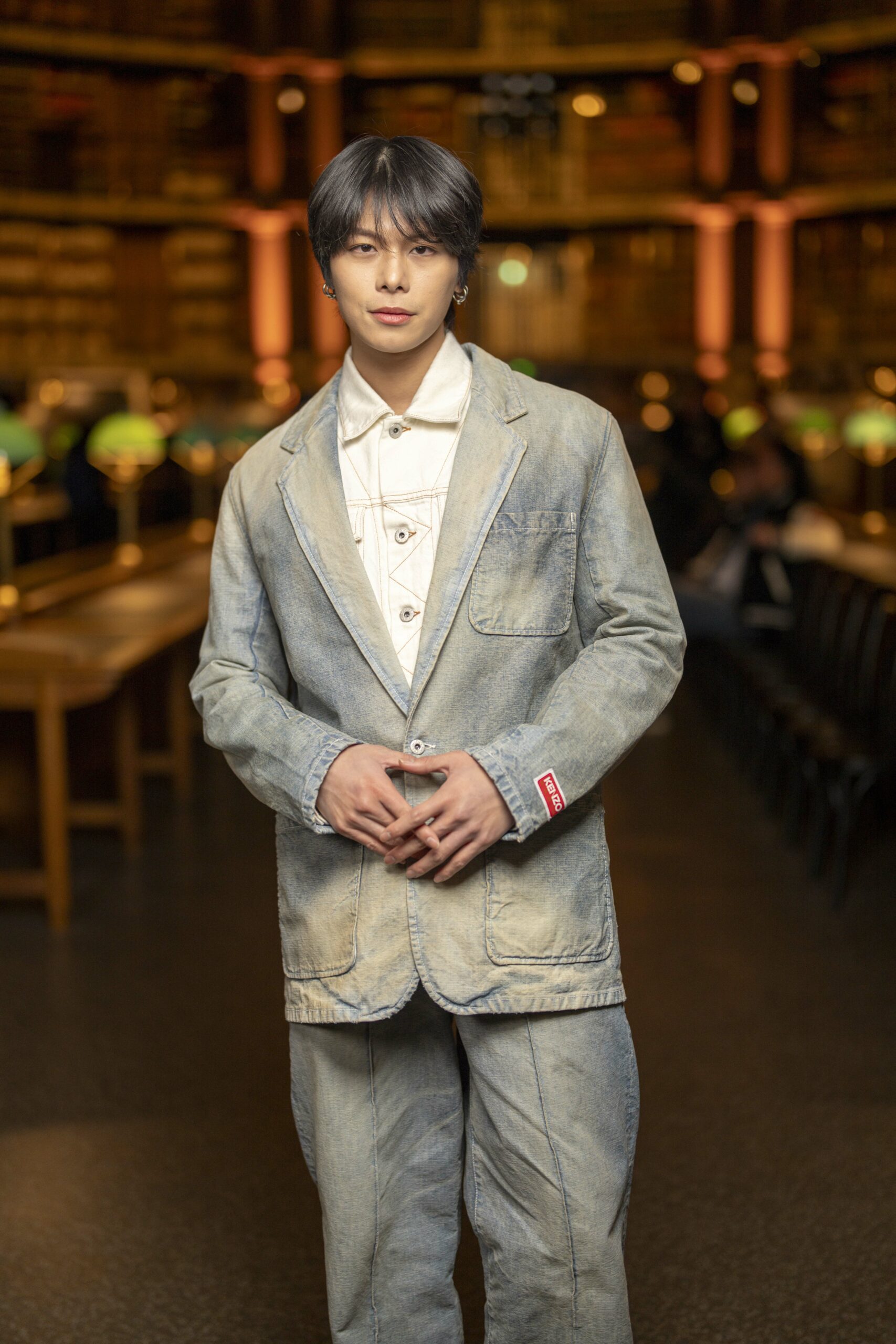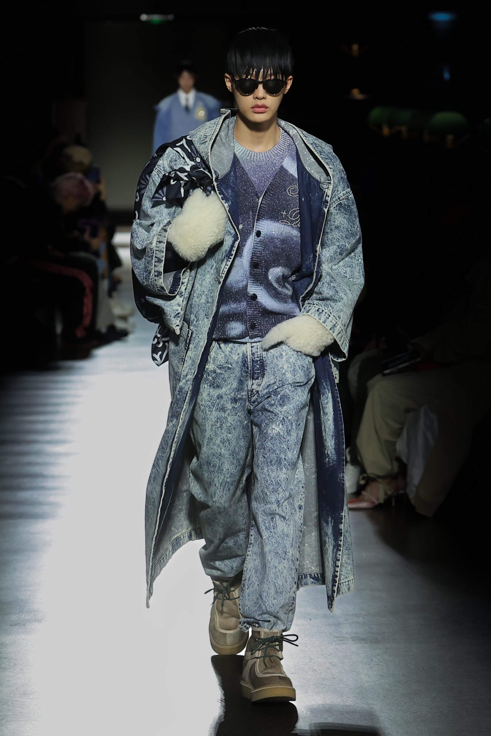 La collection met en avant les textures, du faux fourrure aux tricots tridimensionnels, en passant par les métalliques futuristes et les jacquards. Les costumes Gakuran, les cotons résistants et le denim dans diverses nuances renforcent l’écho entre passé et futur, tradition et innovation.