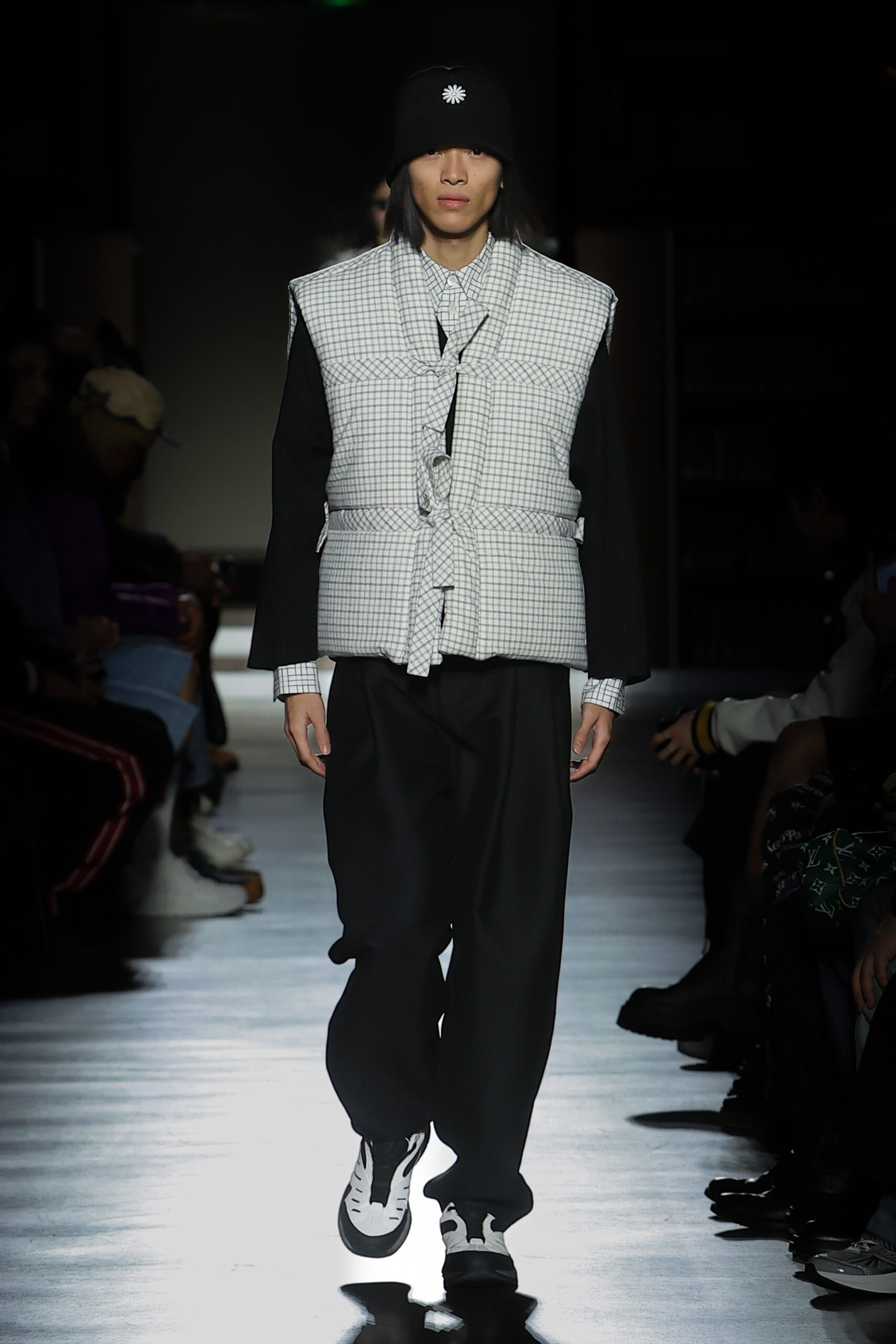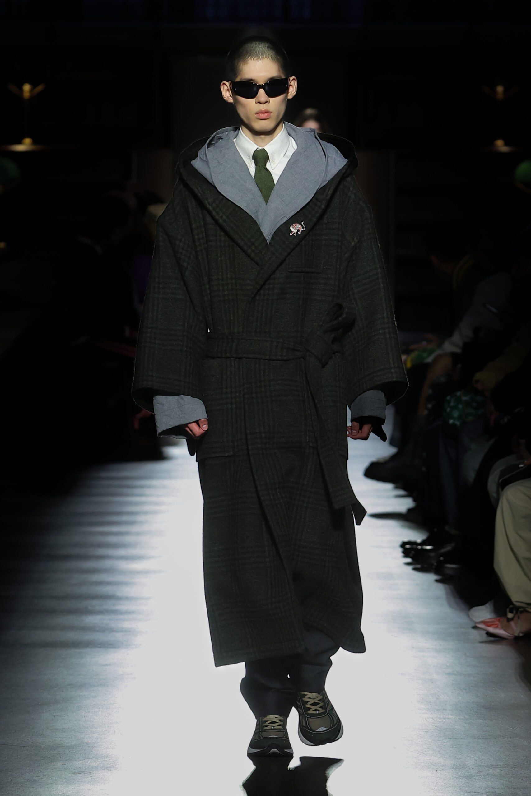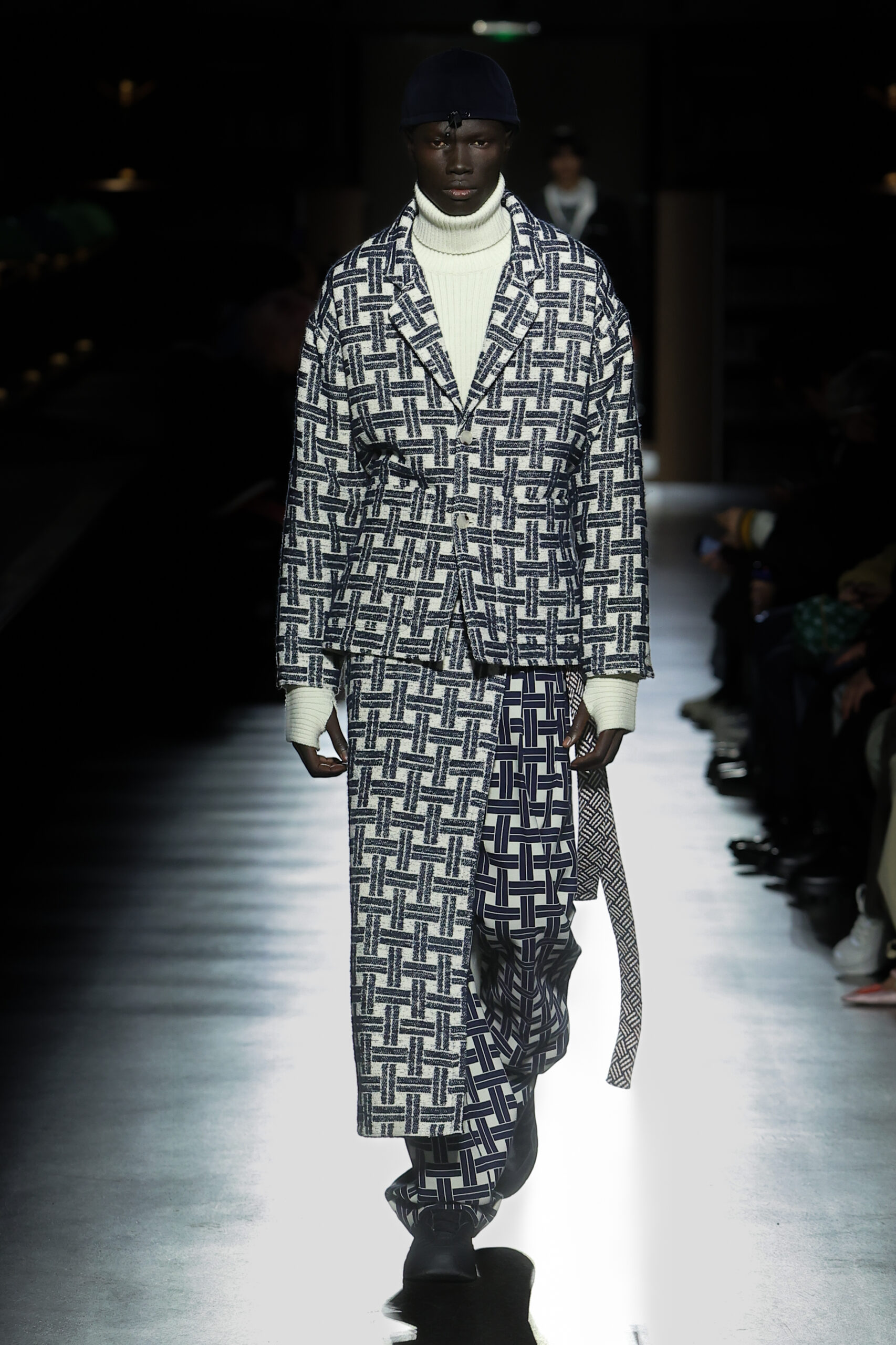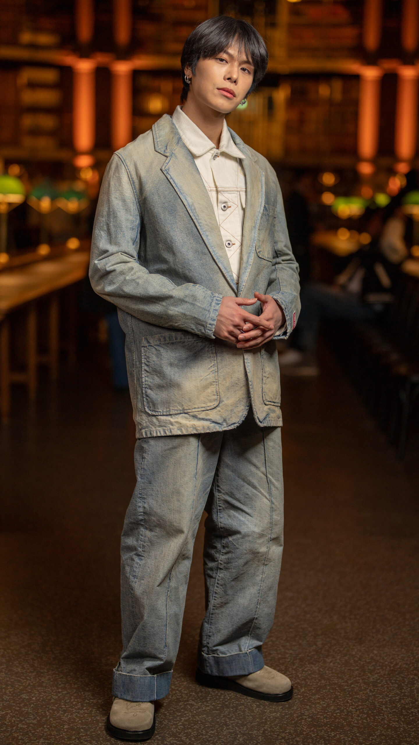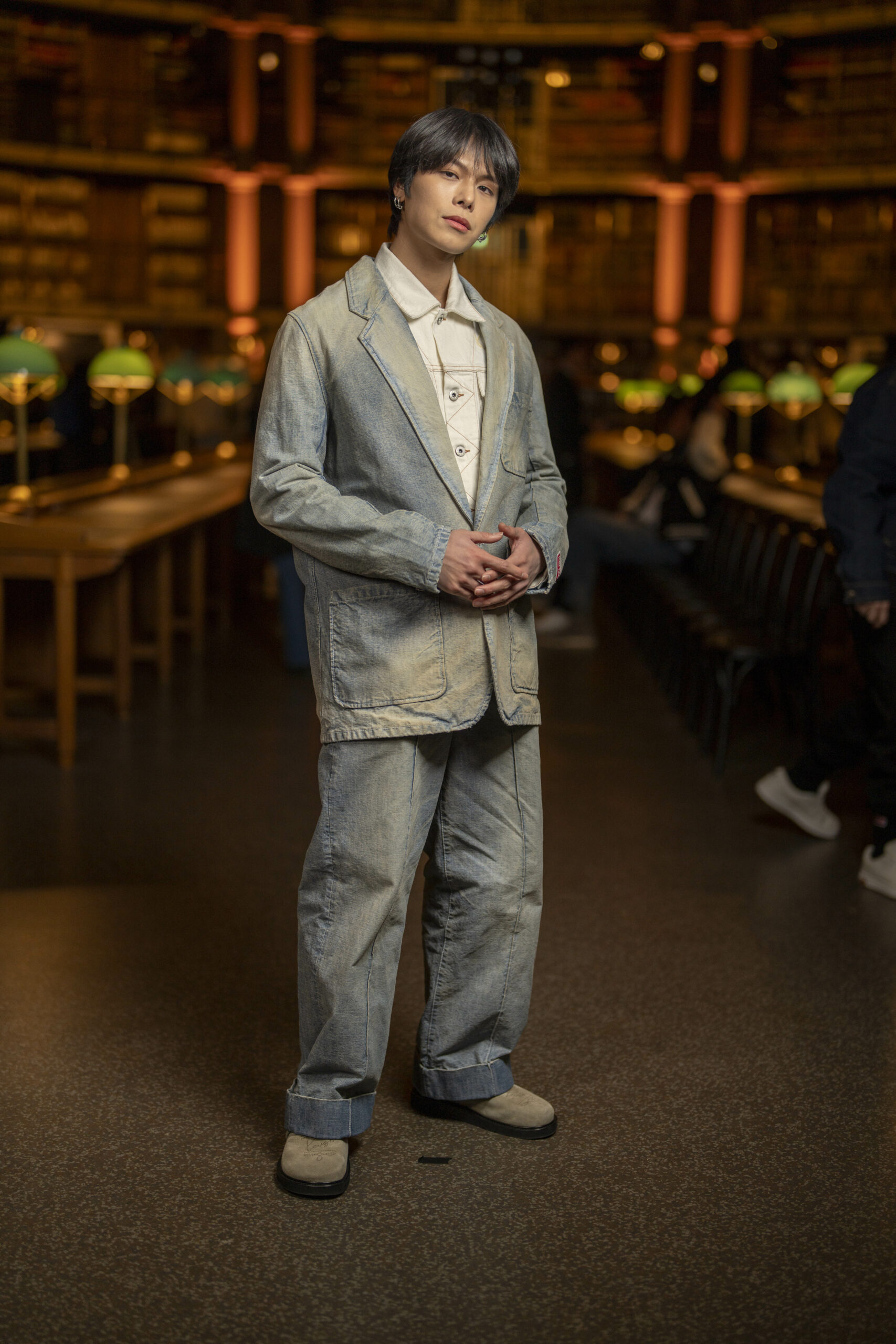 La collection met en avant les textures, du faux fourrure aux tricots tridimensionnels, en passant par les métalliques futuristes et les jacquards. Les costumes Gakuran, les cotons résistants et le denim dans diverses nuances renforcent l’écho entre passé et futur, tradition et innovation.