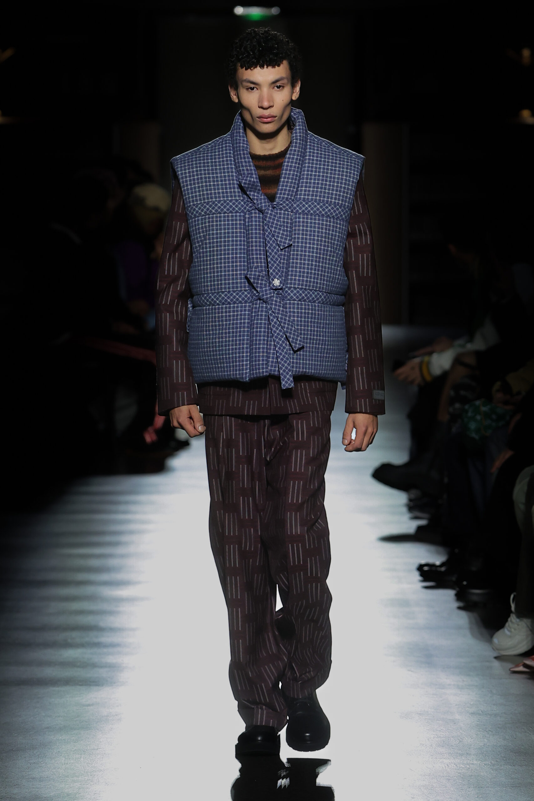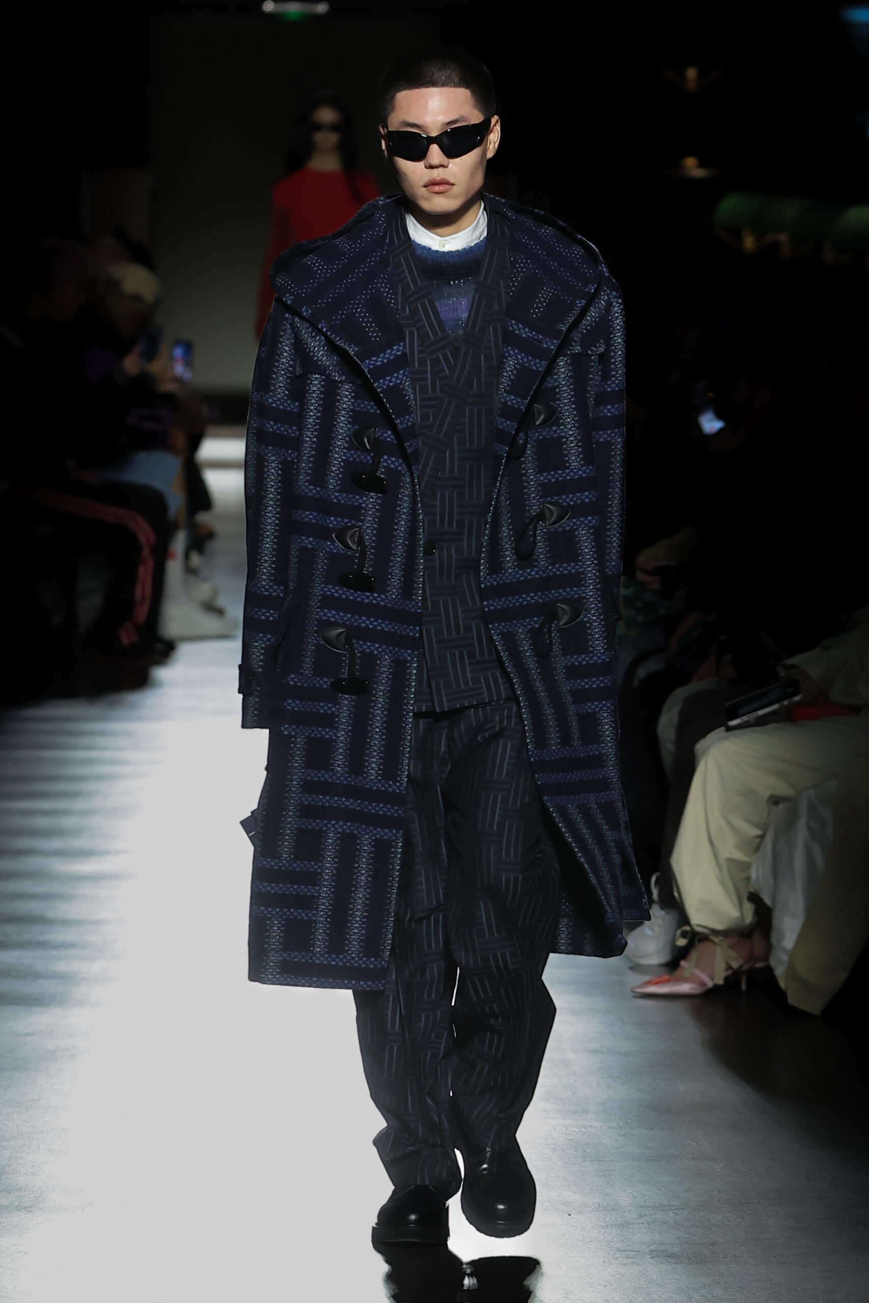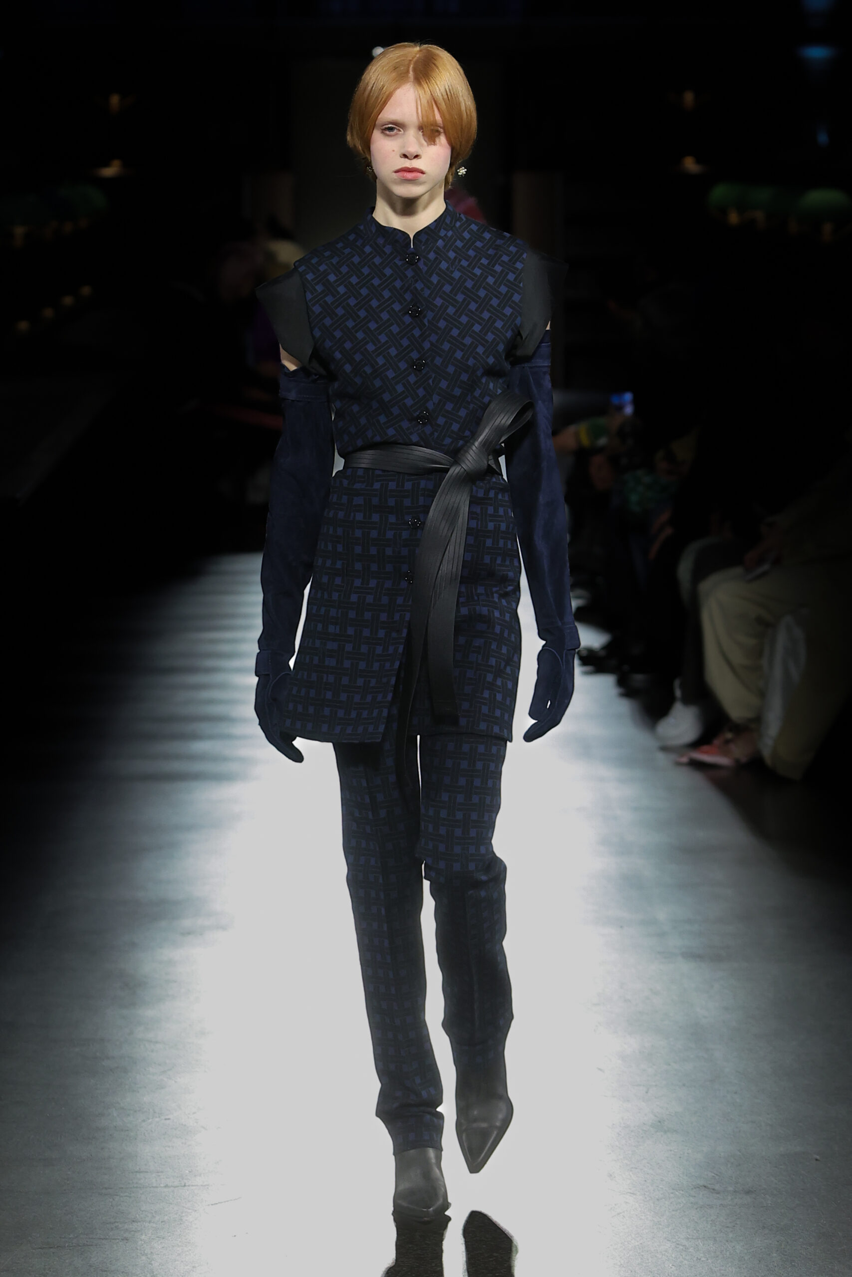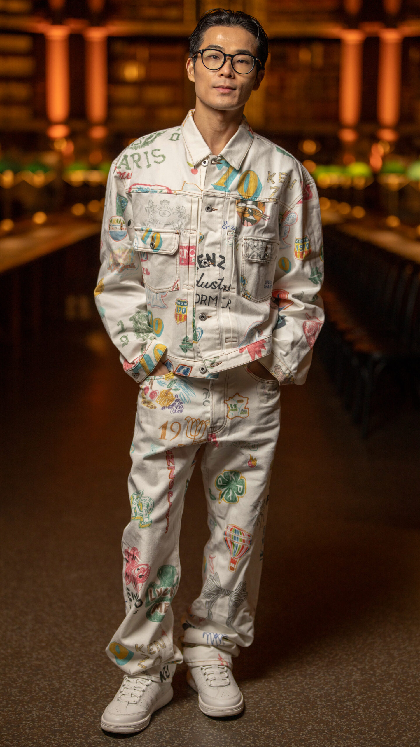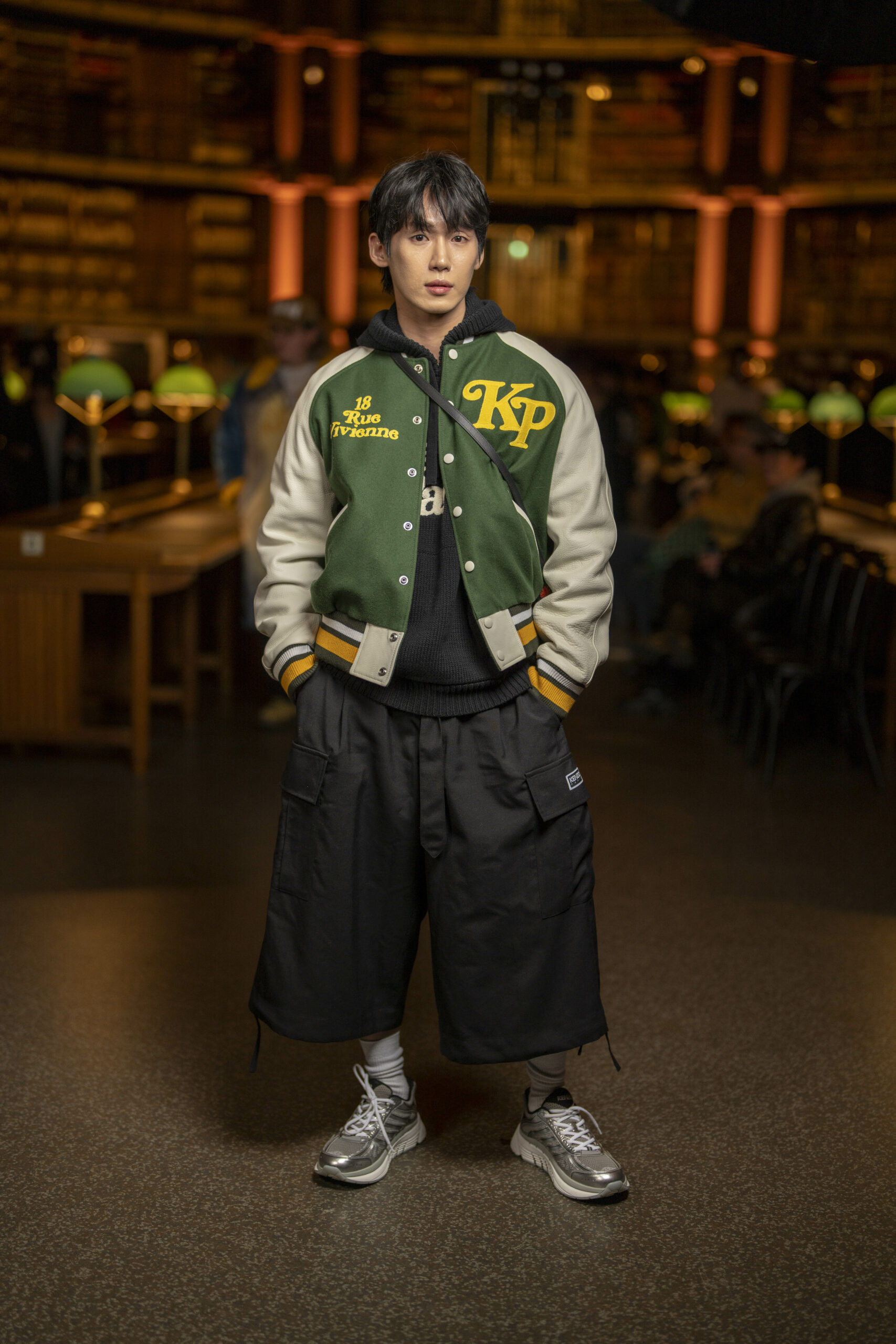 La collection met en avant les textures, du faux fourrure aux tricots tridimensionnels, en passant par les métalliques futuristes et les jacquards. Les costumes Gakuran, les cotons résistants et le denim dans diverses nuances renforcent l’écho entre passé et futur, tradition et innovation.