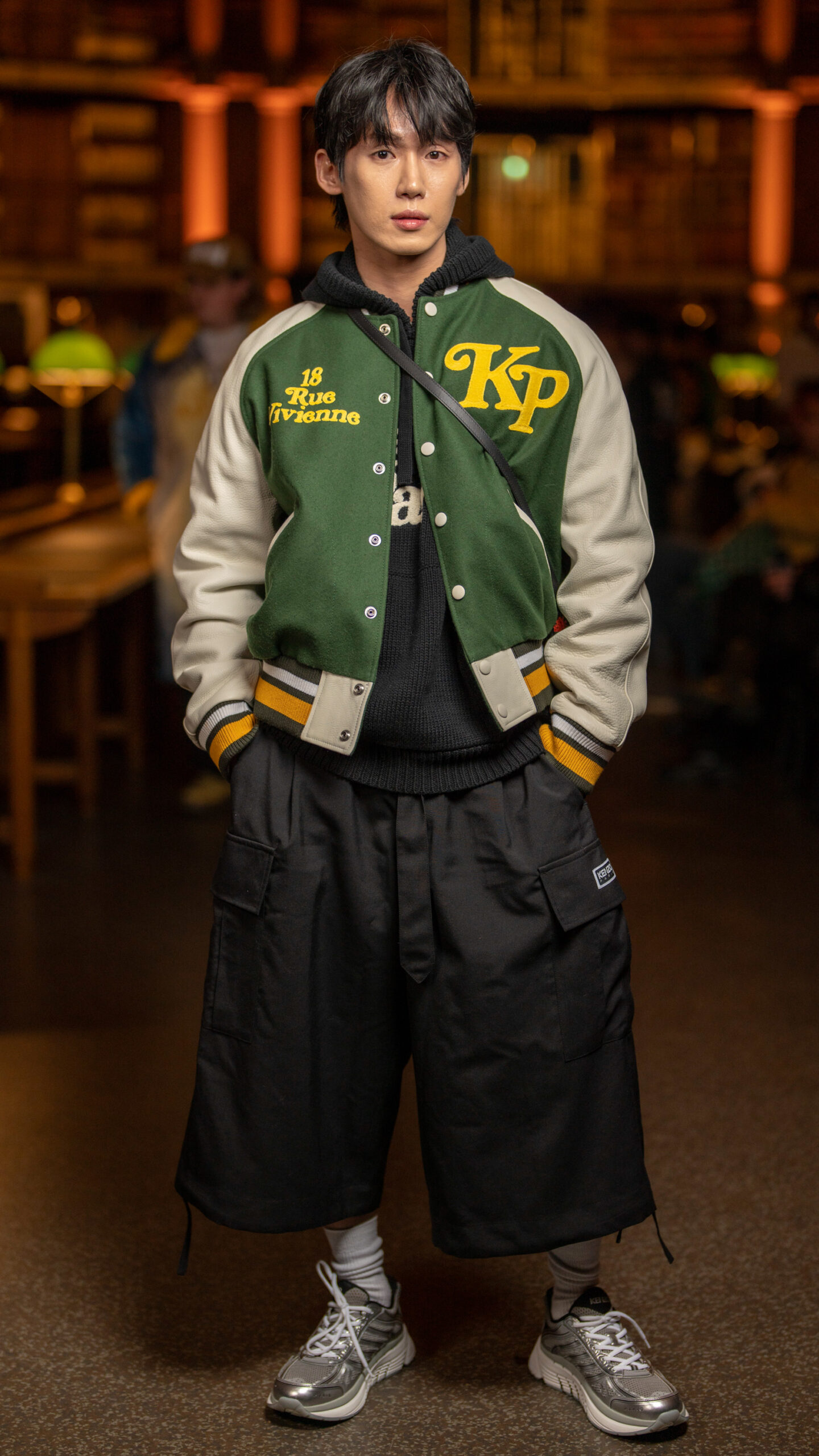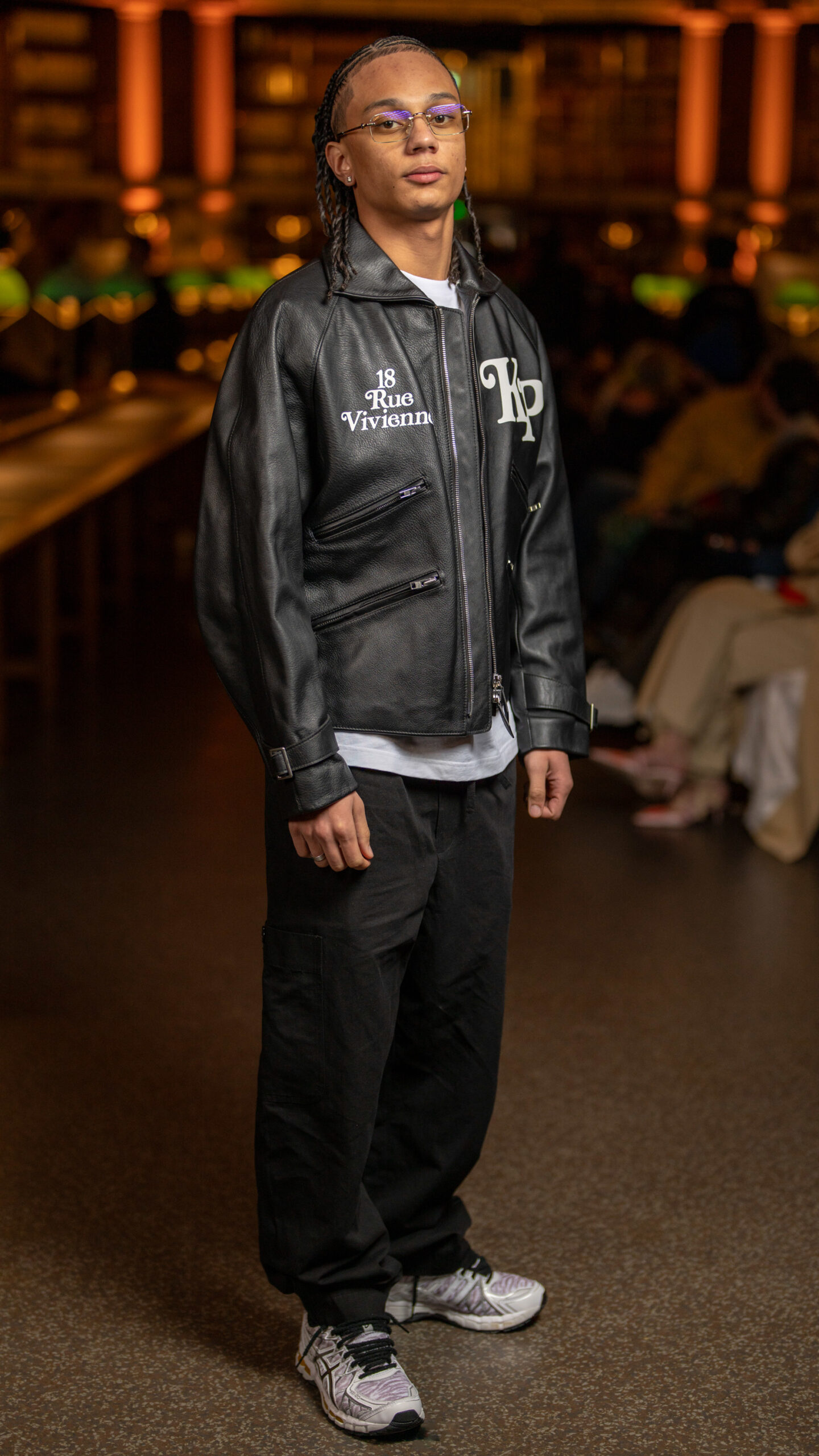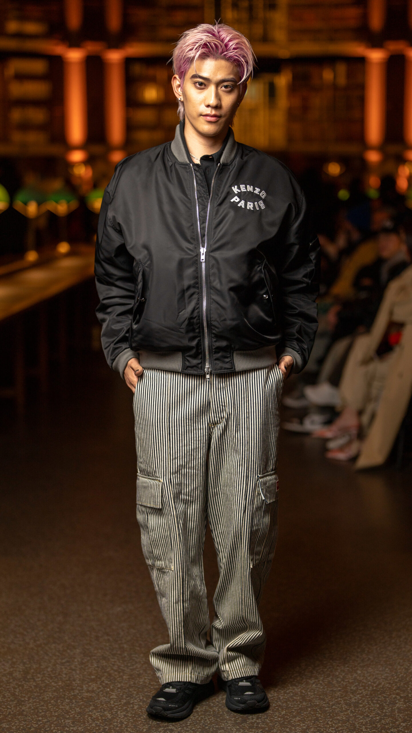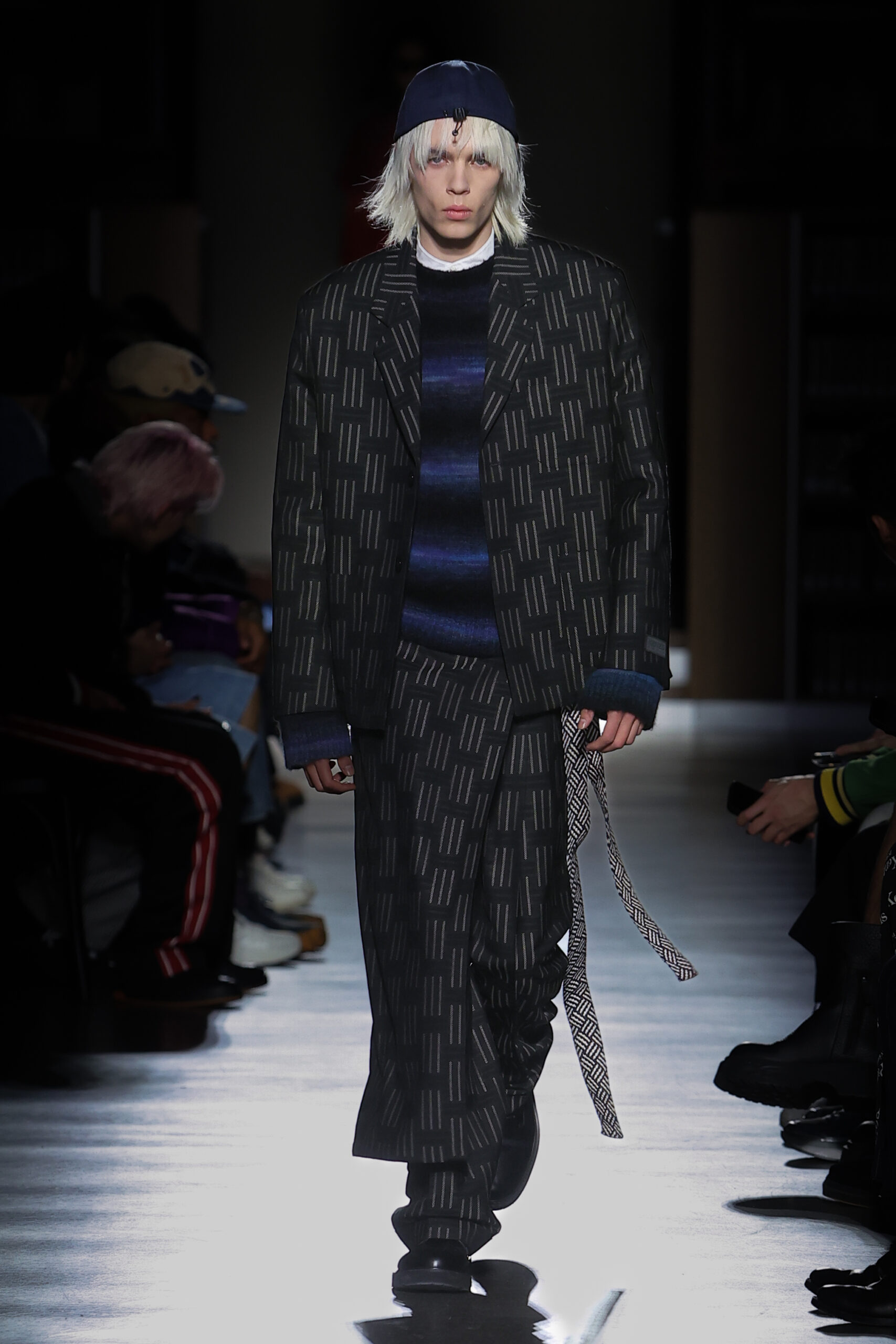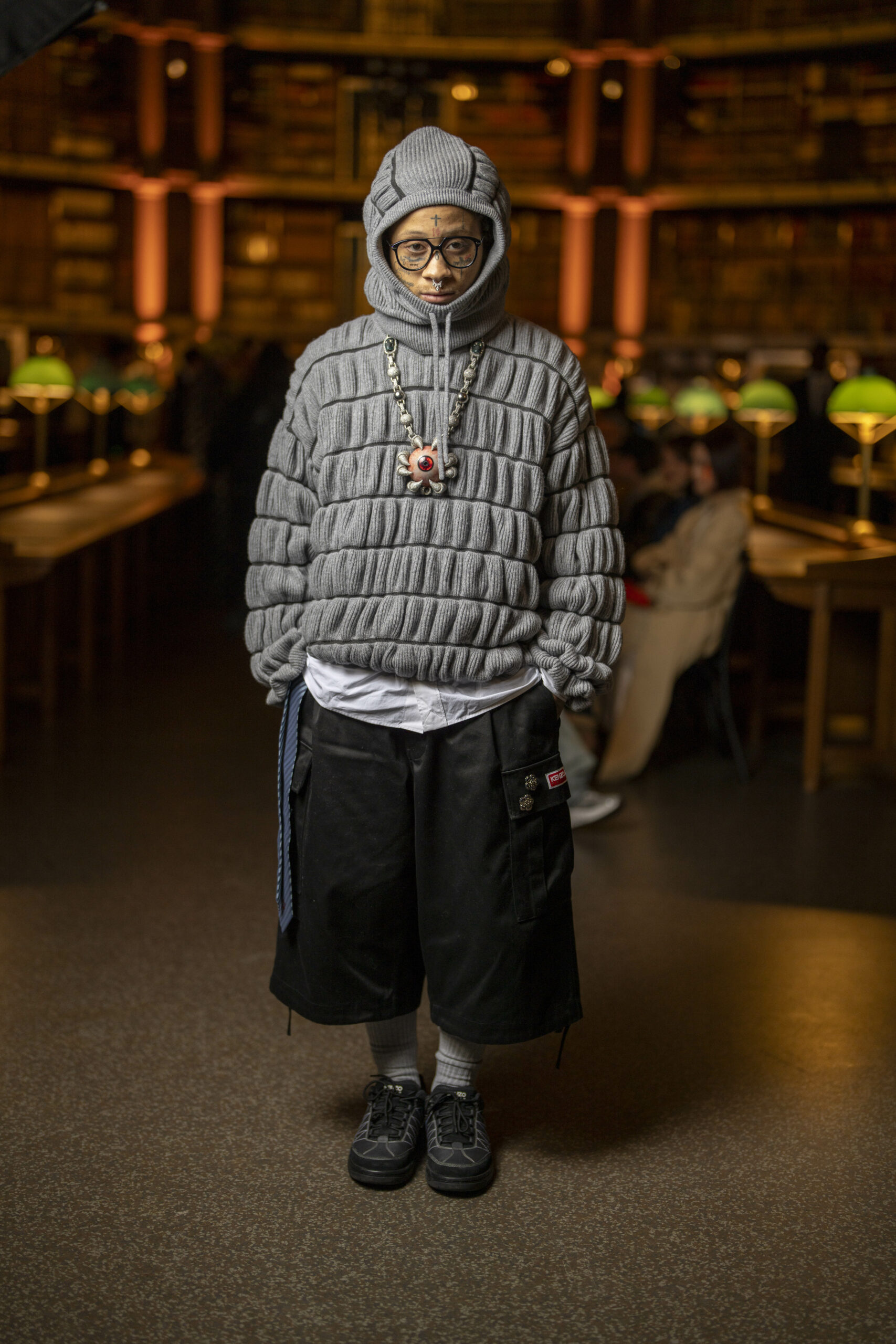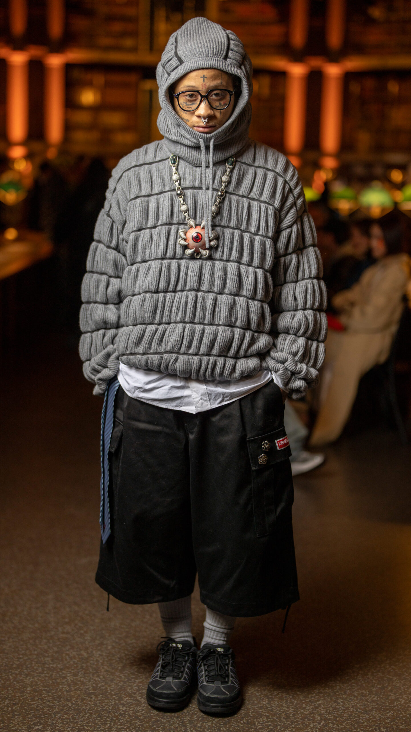 La collection met en avant les textures, du faux fourrure aux tricots tridimensionnels, en passant par les métalliques futuristes et les jacquards. Les costumes Gakuran, les cotons résistants et le denim dans diverses nuances renforcent l’écho entre passé et futur, tradition et innovation.
