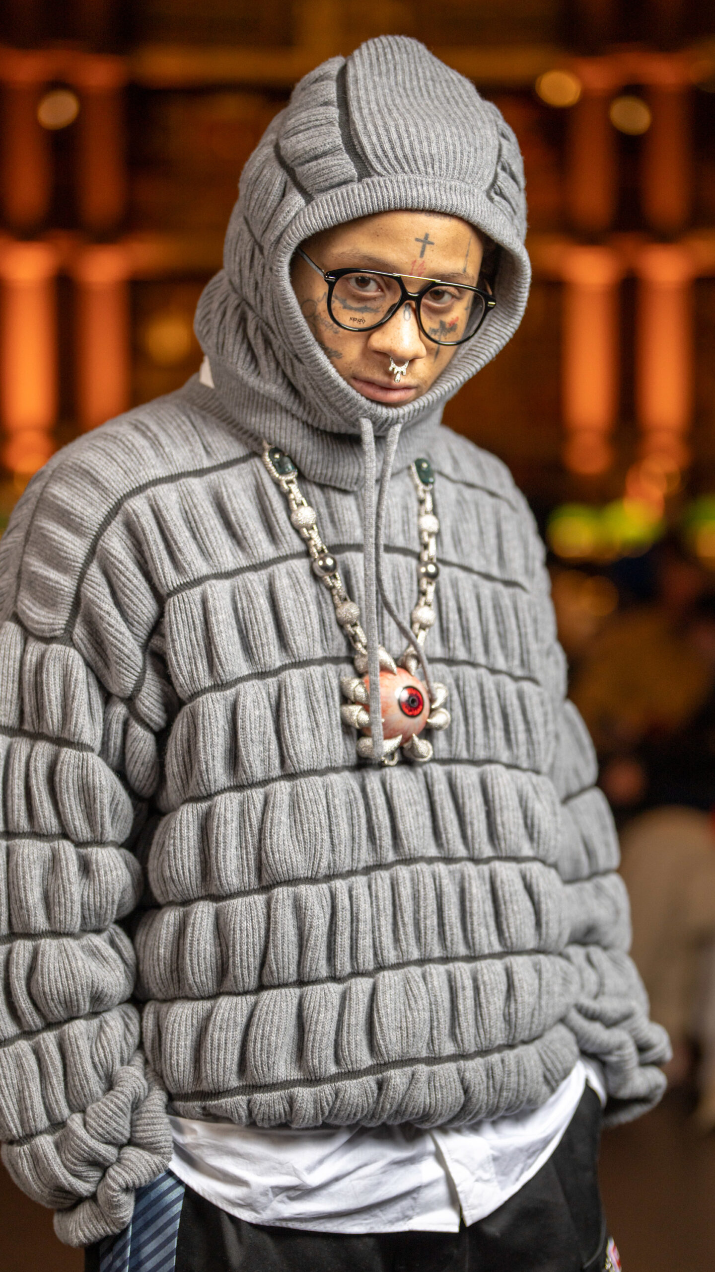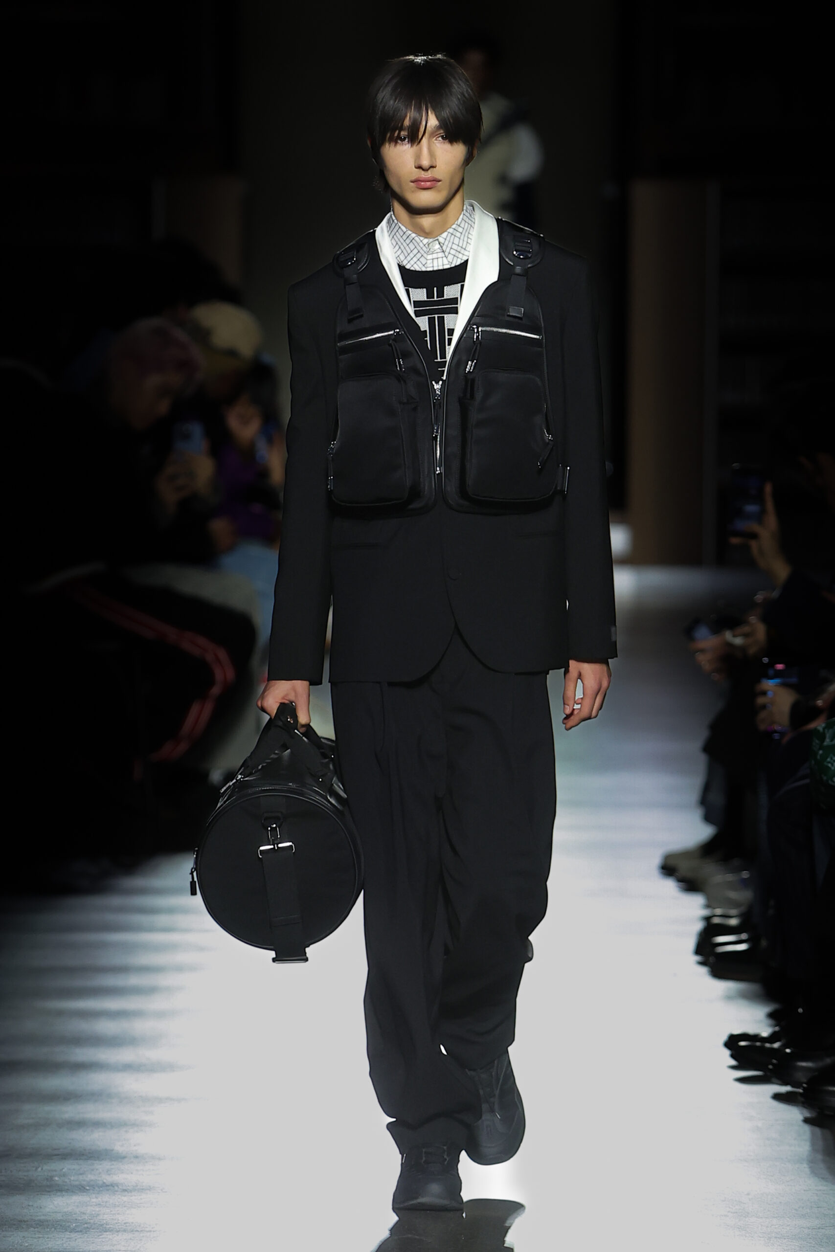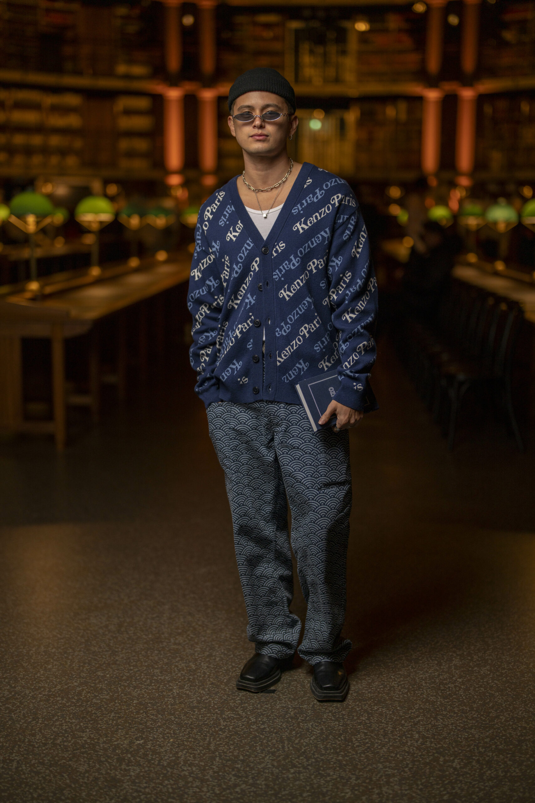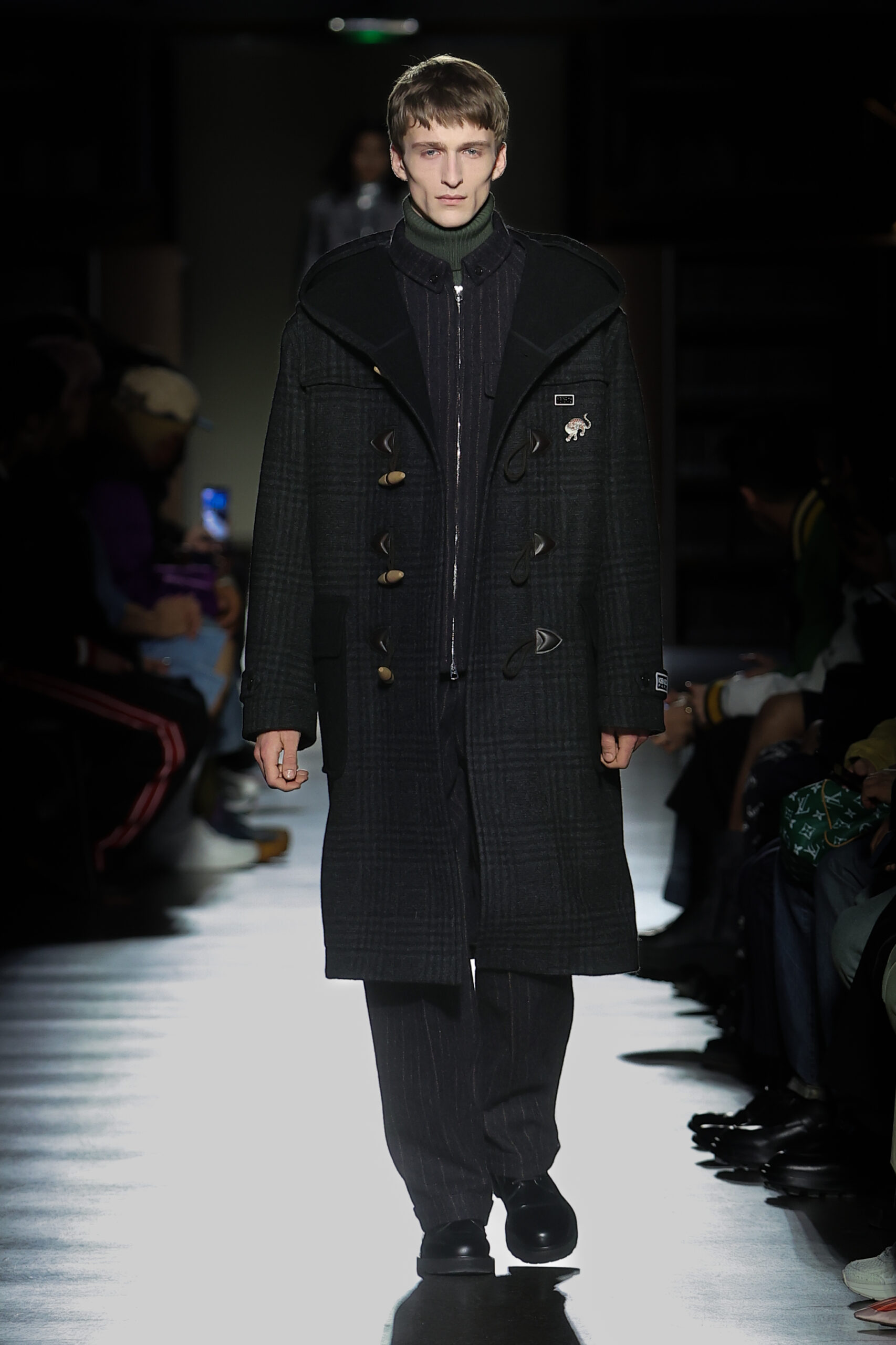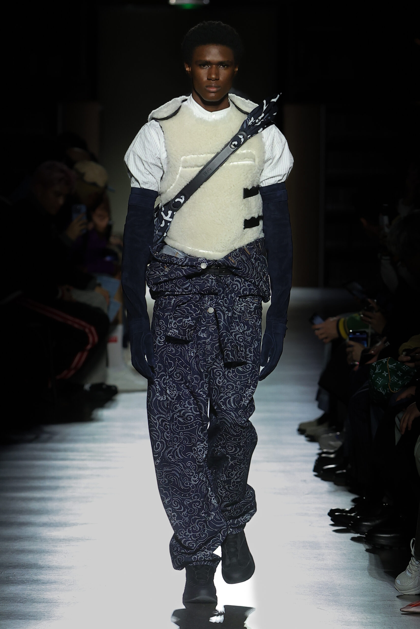 La collection met en avant les textures, du faux fourrure aux tricots tridimensionnels, en passant par les métalliques futuristes et les jacquards. Les costumes Gakuran, les cotons résistants et le denim dans diverses nuances renforcent l’écho entre passé et futur, tradition et innovation.