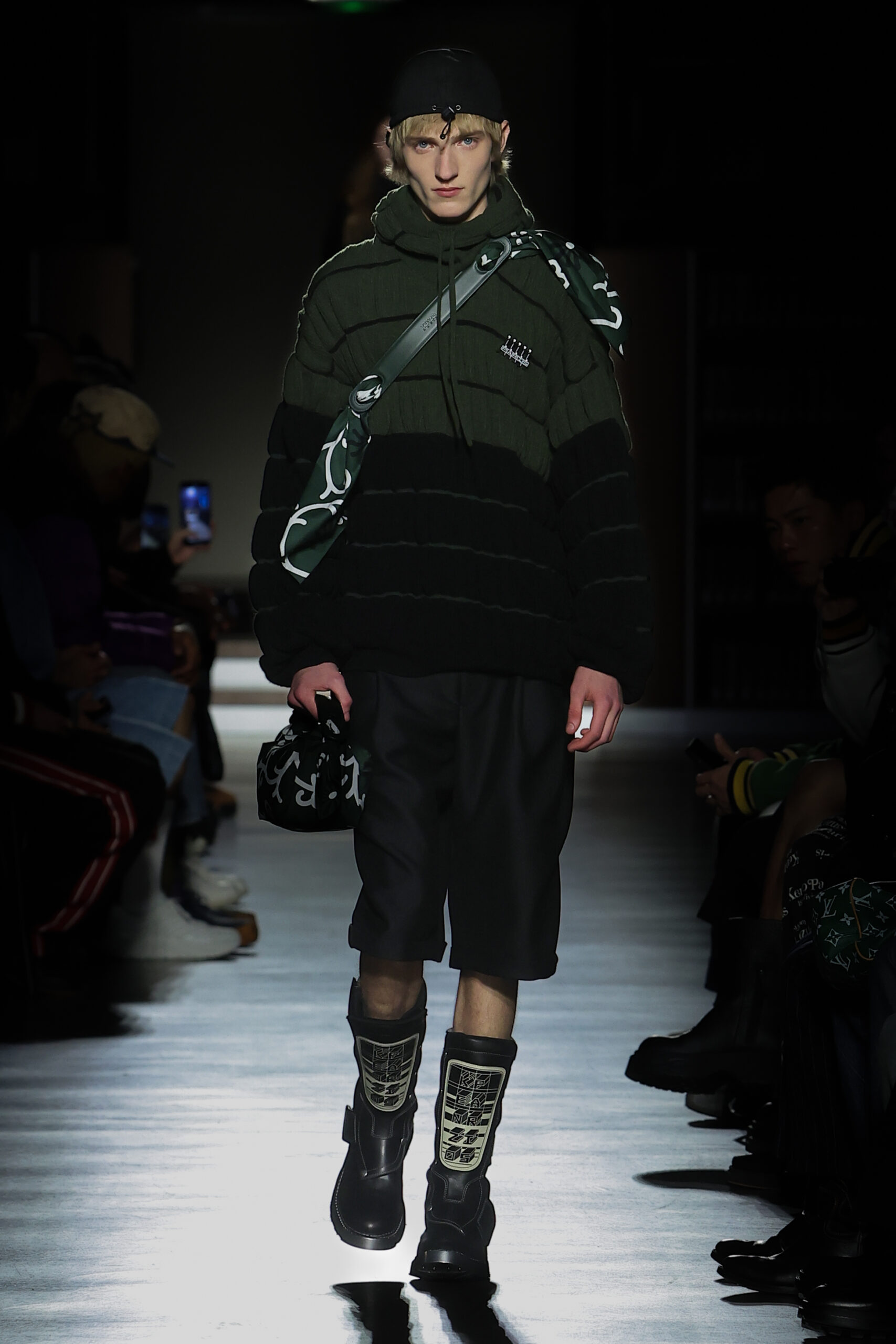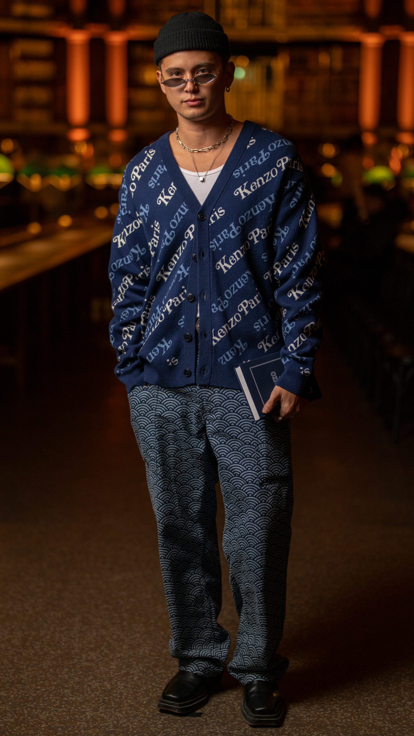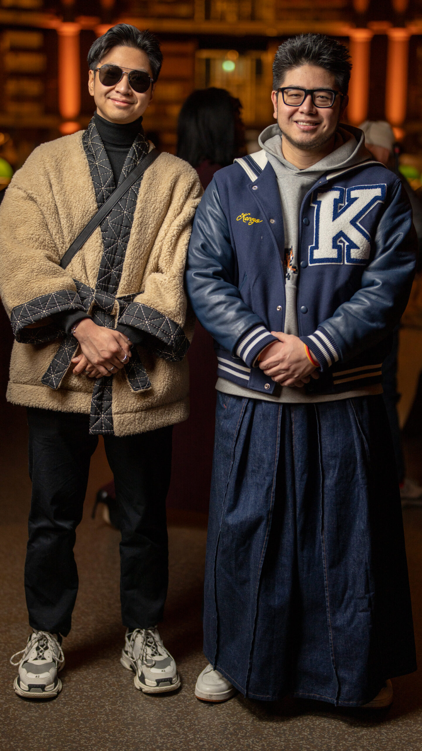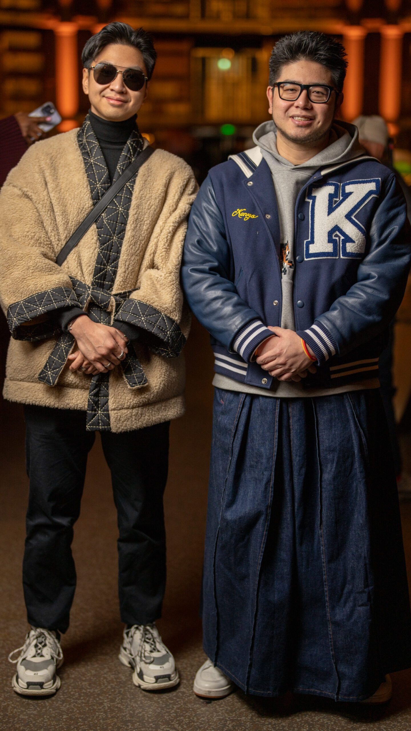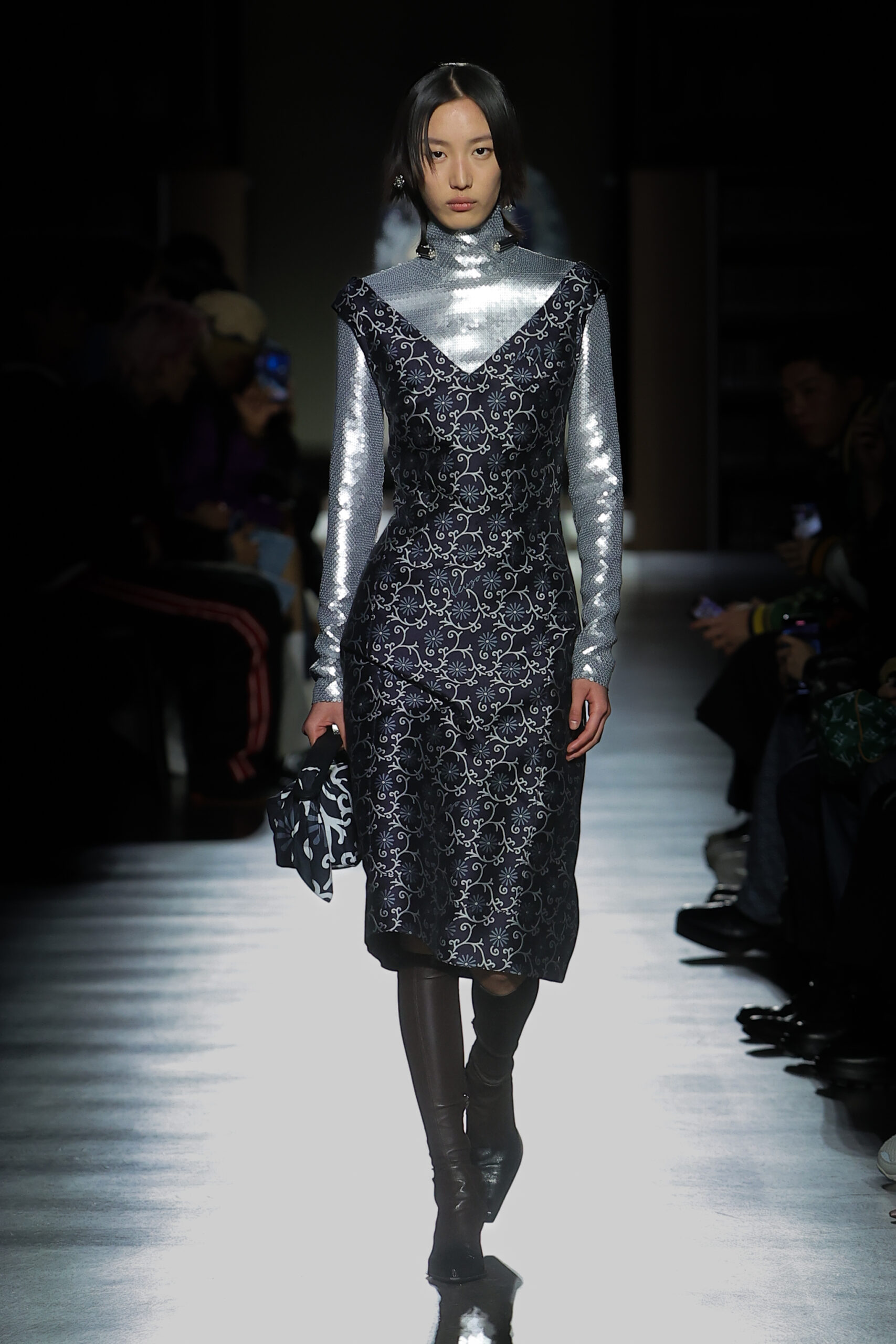 La collection met en avant les textures, du faux fourrure aux tricots tridimensionnels, en passant par les métalliques futuristes et les jacquards. Les costumes Gakuran, les cotons résistants et le denim dans diverses nuances renforcent l’écho entre passé et futur, tradition et innovation.