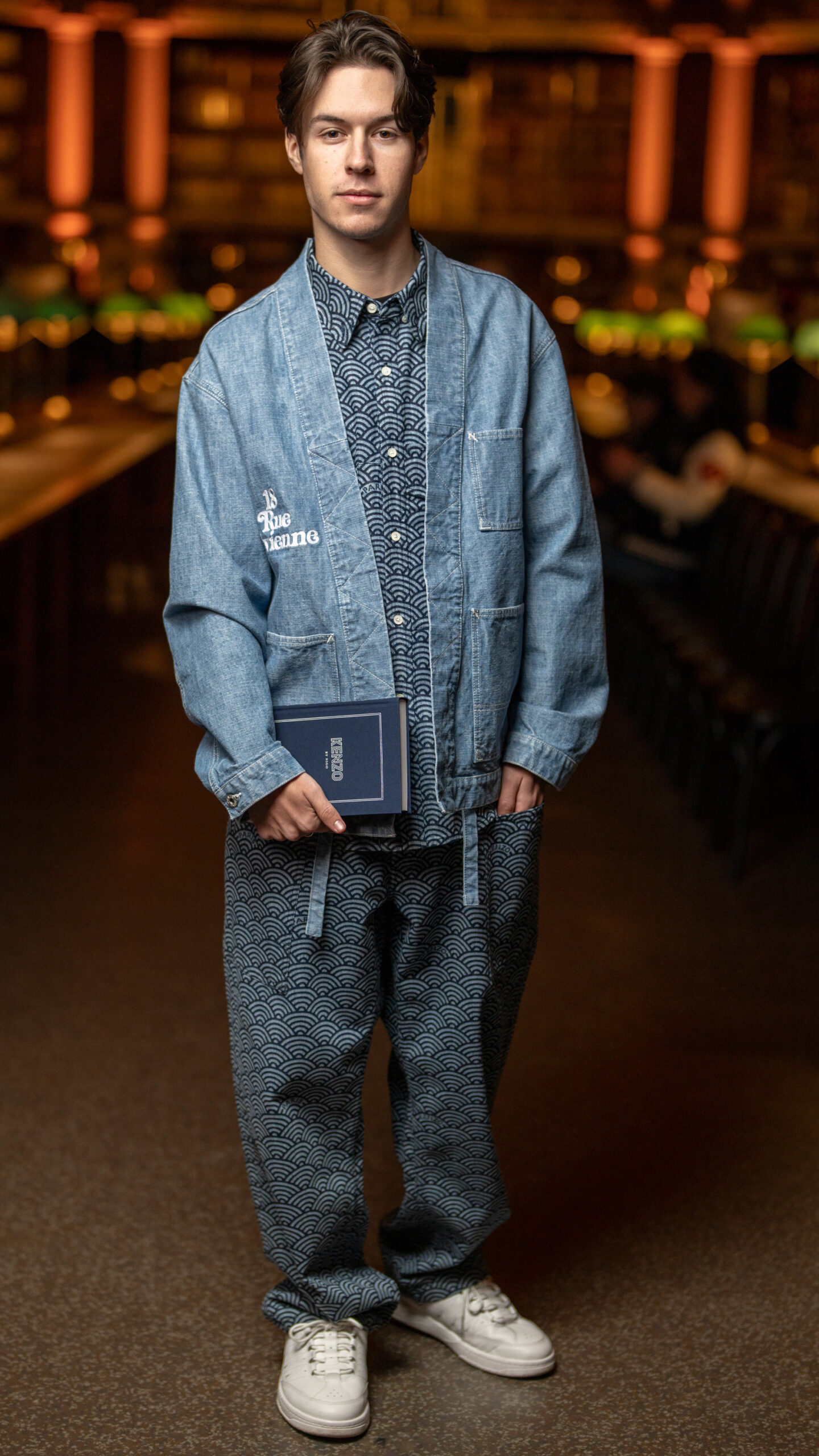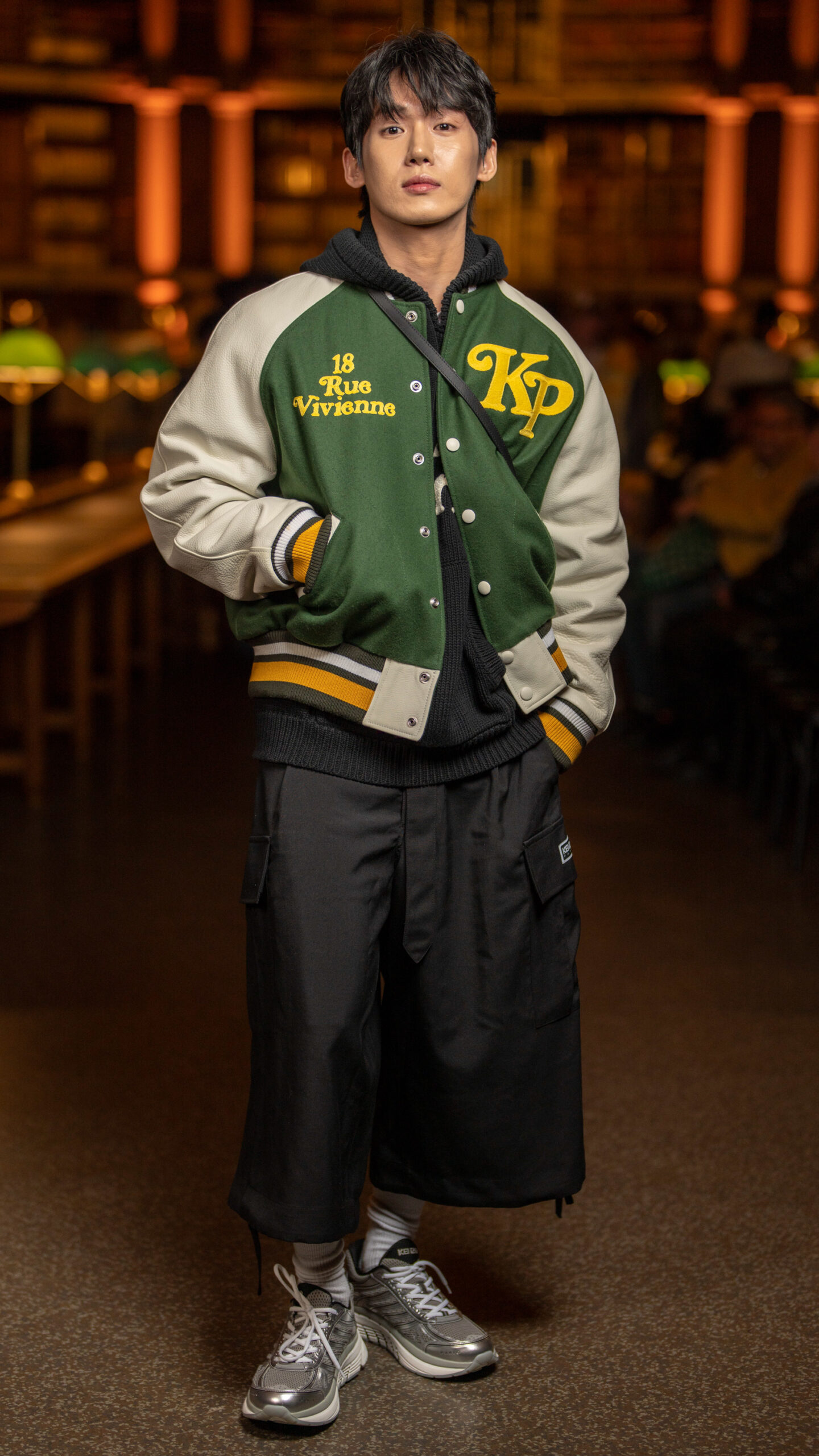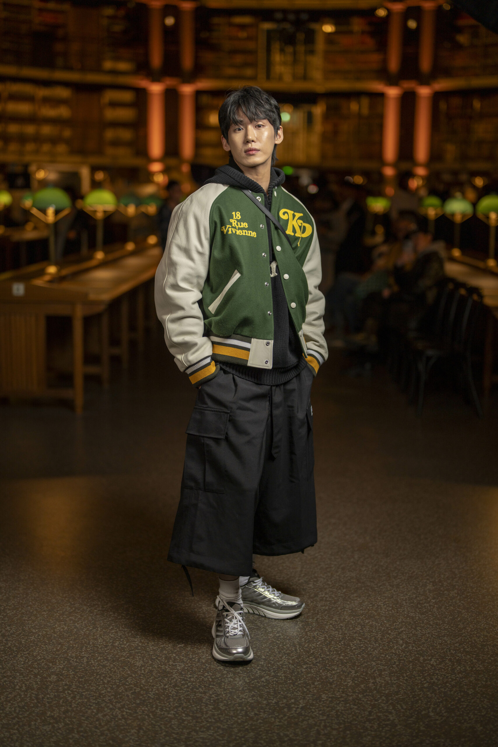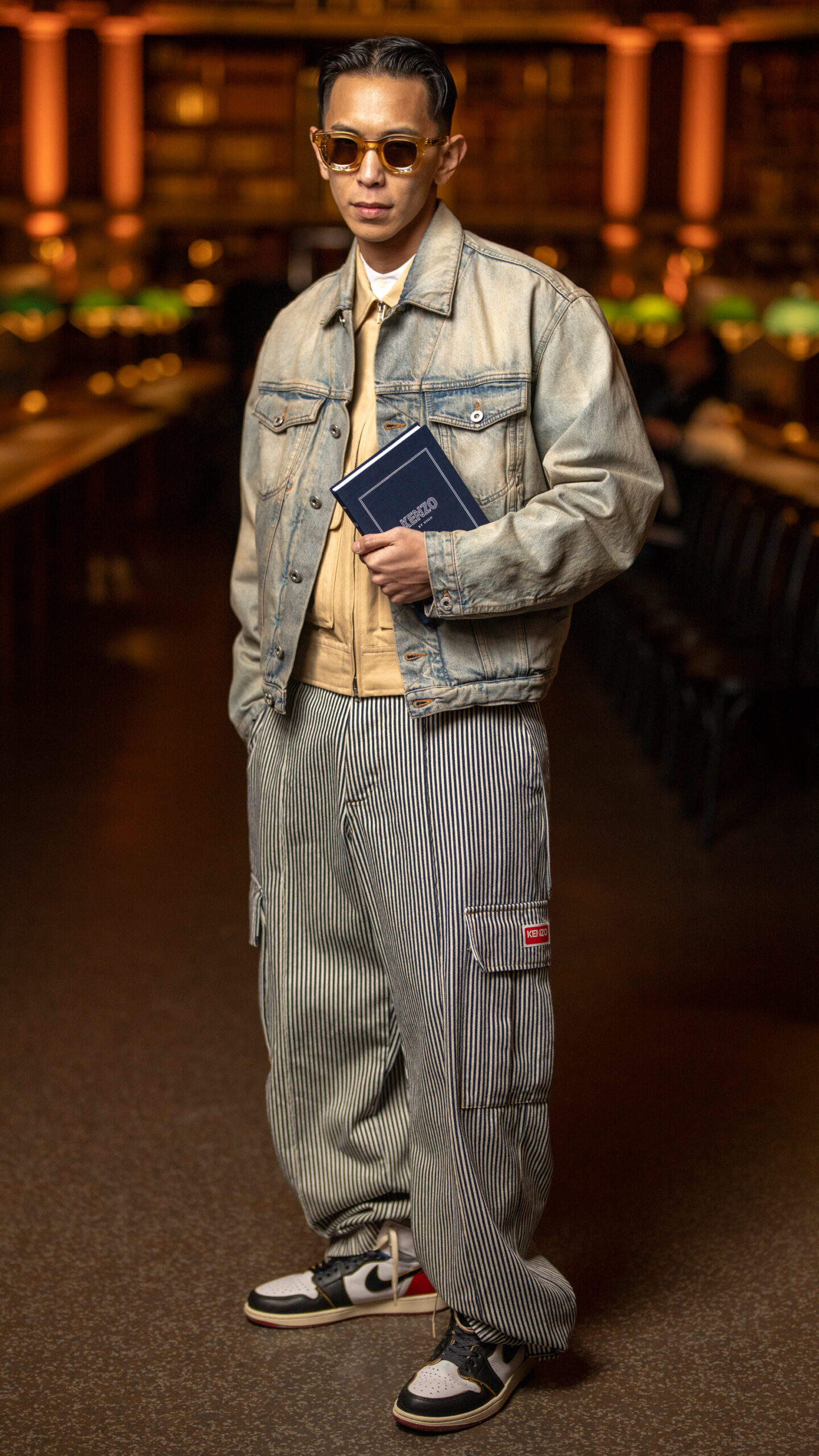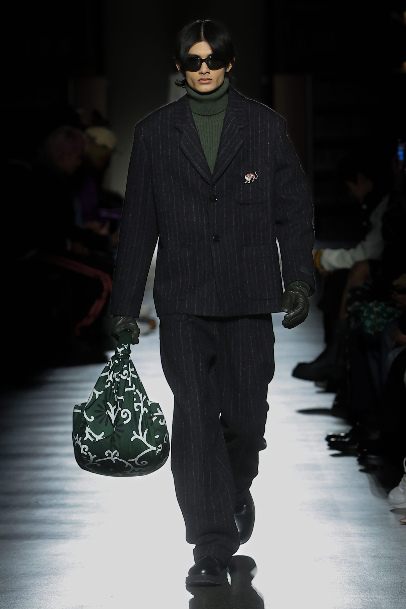 La collection met en avant les textures, du faux fourrure aux tricots tridimensionnels, en passant par les métalliques futuristes et les jacquards. Les costumes Gakuran, les cotons résistants et le denim dans diverses nuances renforcent l’écho entre passé et futur, tradition et innovation.