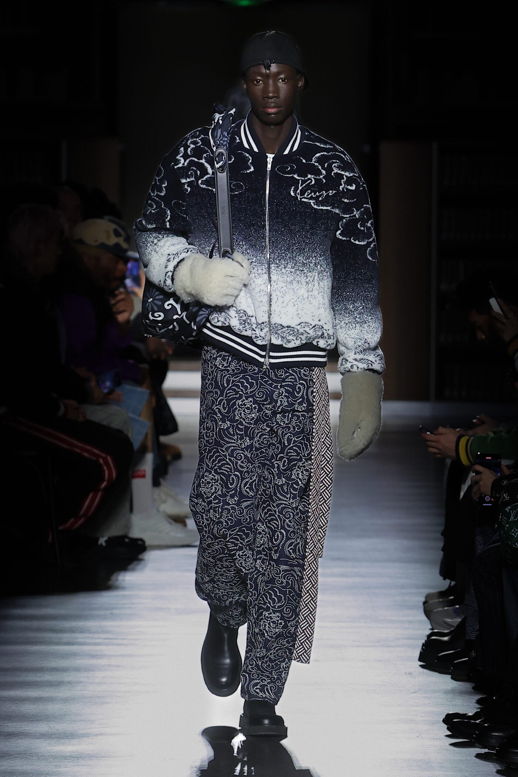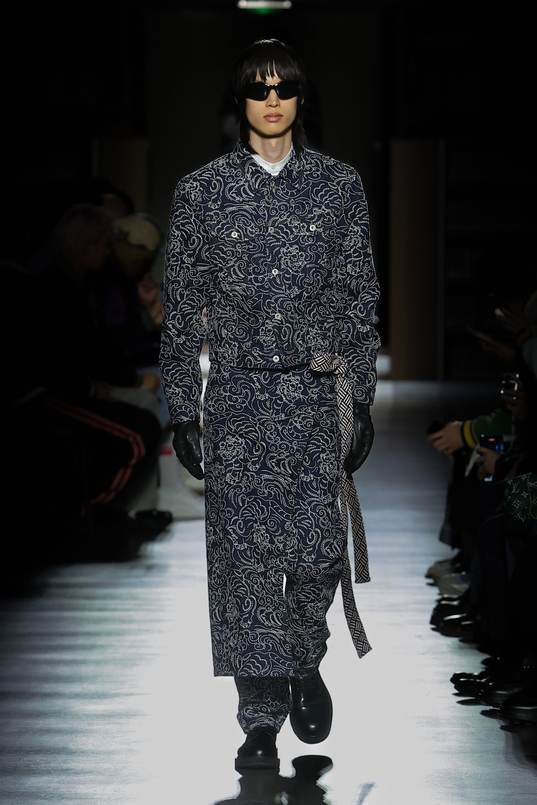 La collection mélange les détails et silhouettes japonaises traditionnelles avec des éléments de science-fiction, allant des manteaux kimono aux uniformes inspirés de la sci-fi. L’empreinte de l’histoire japonaise se manifeste dans les motifs et les techniques de fabrication, avec des clins d’œil à l’habillement utilitaire et militaire occidental. L’hommage musical à Ryuichi Sakamoto et Yukihiro Takahashi de Yellow Magic Orchestra (YMO) souligne l’interconnexion entre les inspirations occidentales et orientales.