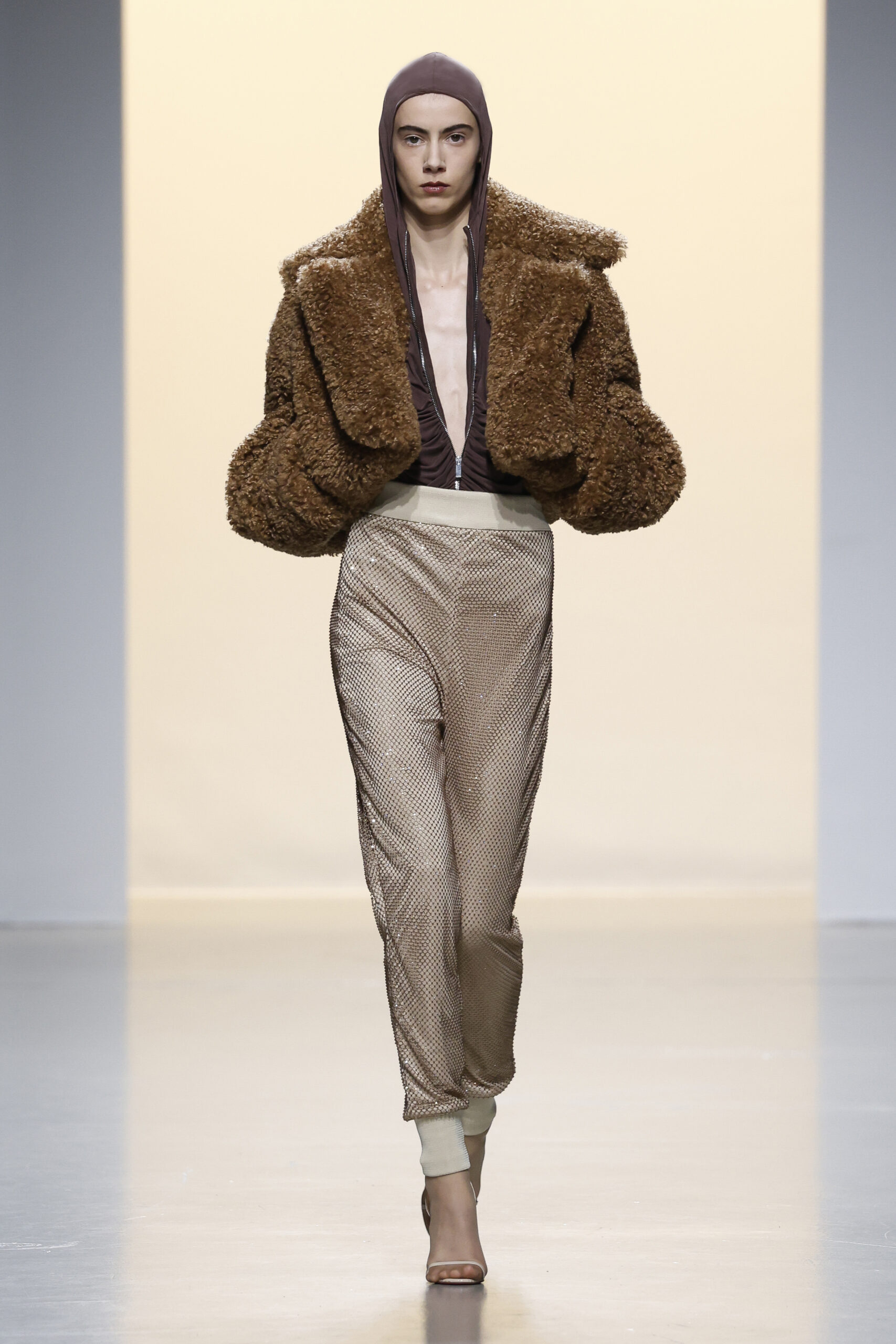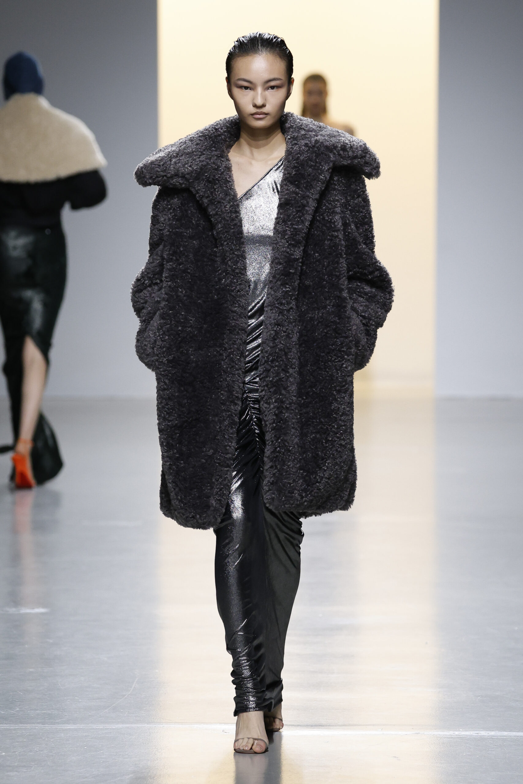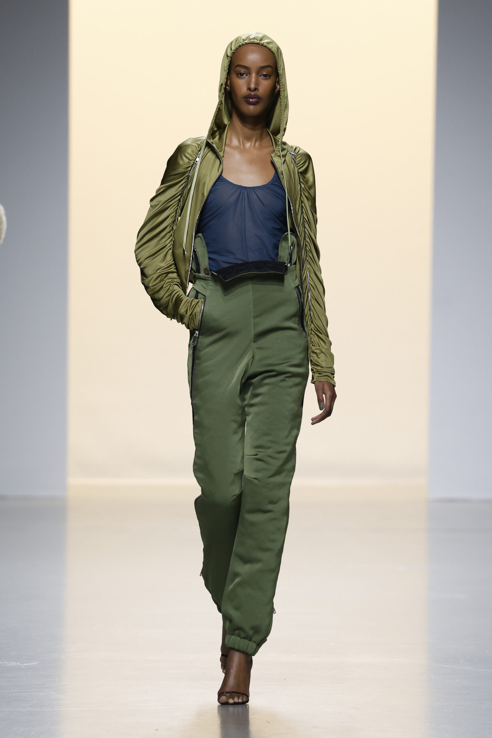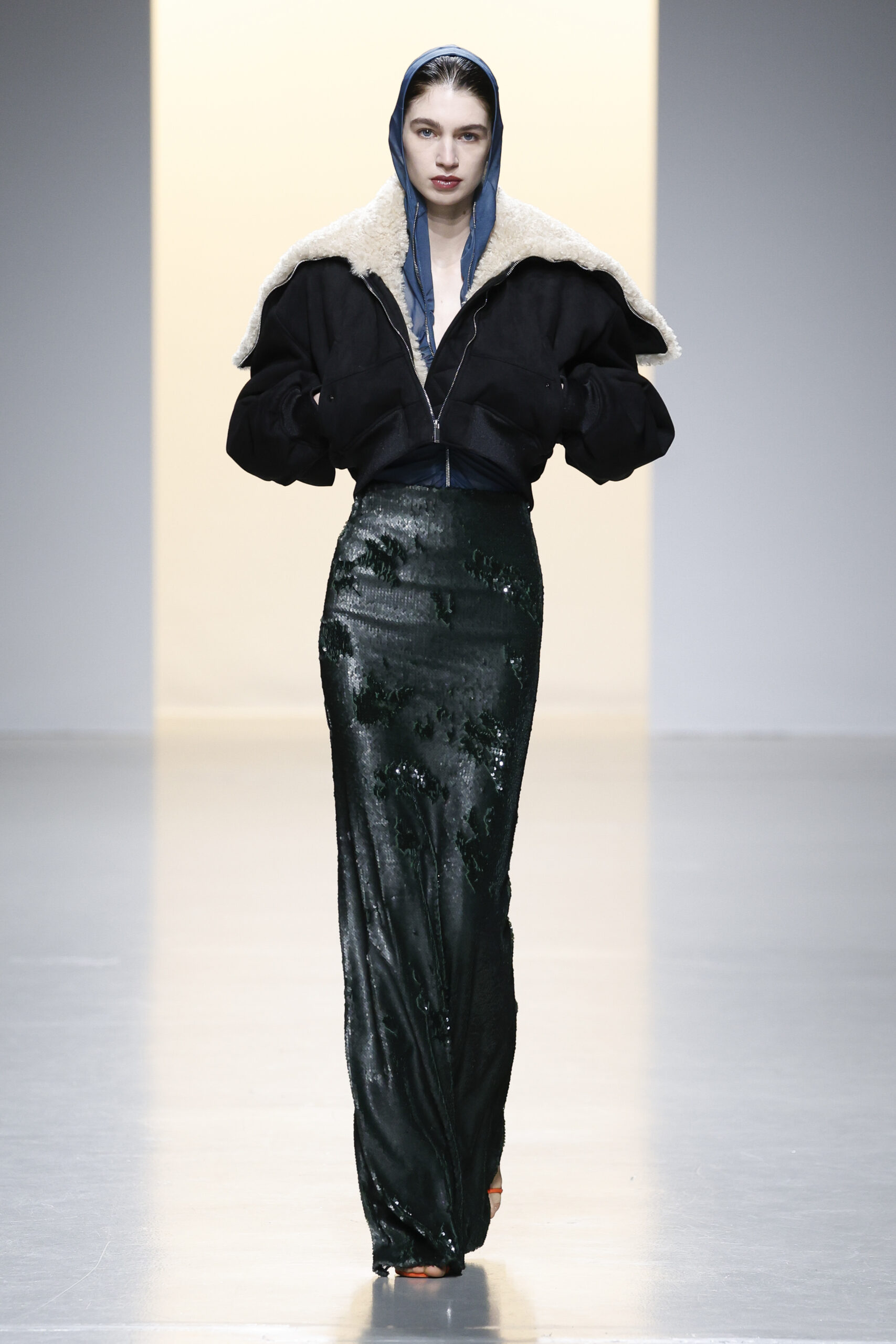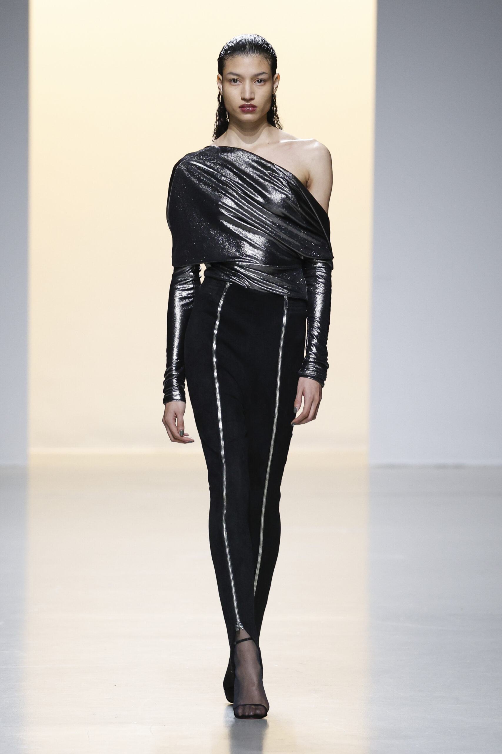 La collection introduit des tissus aux qualités minérales et extraterrestres, tels que le jersey argenté évoquant du mercure liquide, le mesh cristallin, les sequins reptiliens et le cracknyl, un tissu couture à la surface semblable à celle d’une météorite, créé à l’origine par Cristóbal Balenciaga. Ces matériaux, alliés aux tissus classiques d’ATLEIN, témoignent de la poursuite par Tron de l’exploration des alternatives véganes au cuir, avec des jerseys spéciaux imitant l’effet du nappa et du daim.
