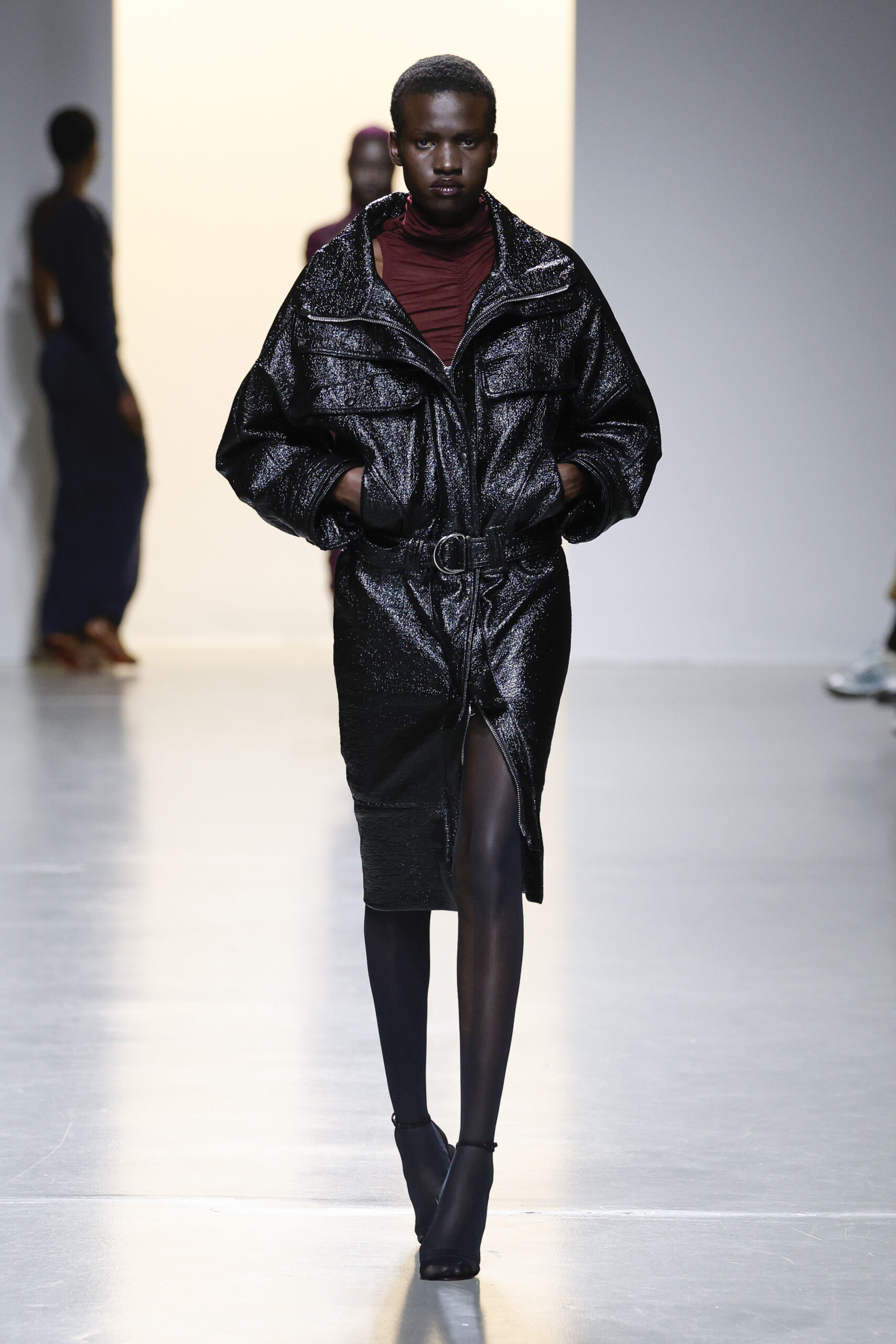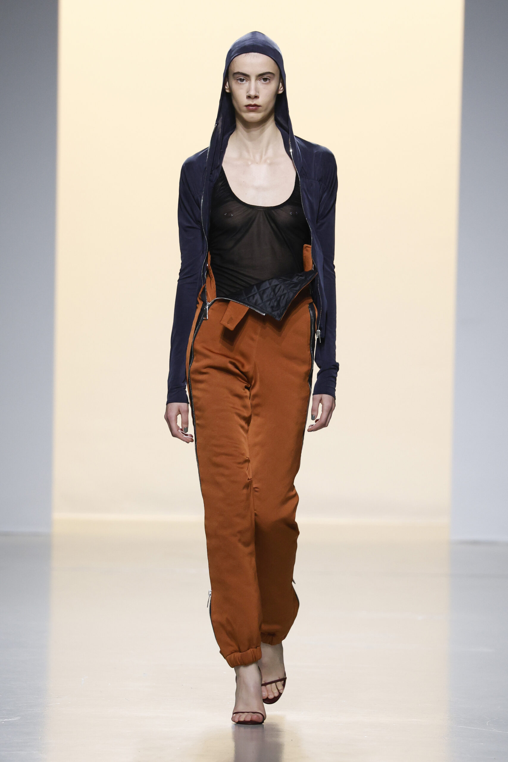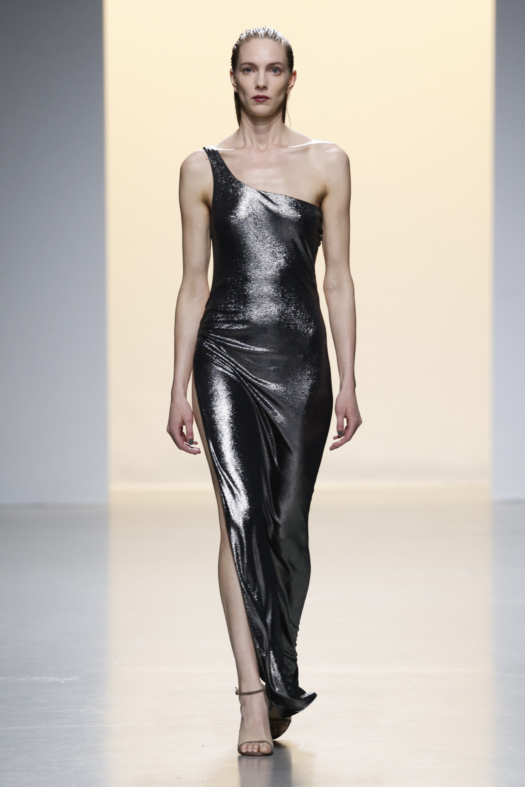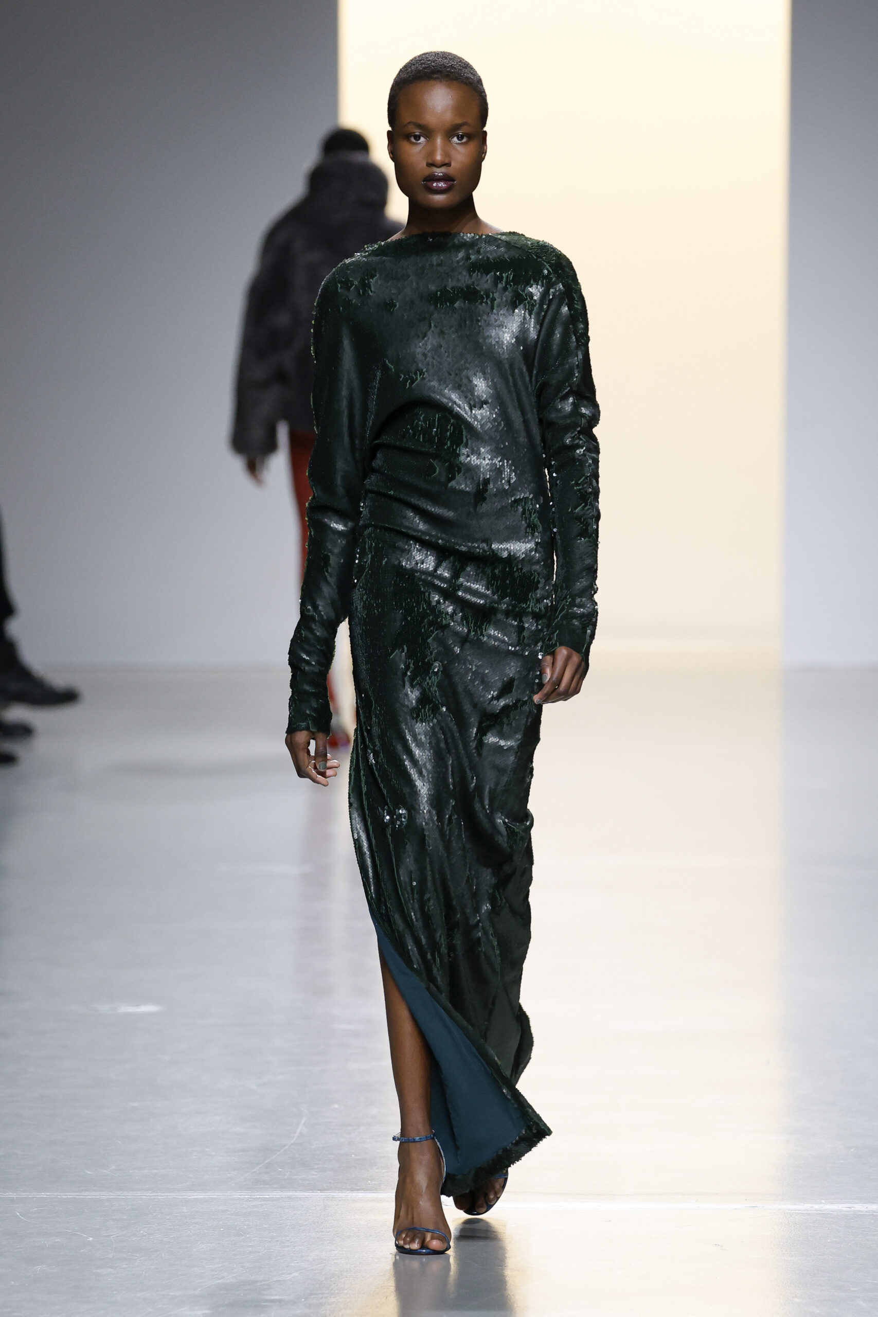 La collection introduit des tissus aux qualités minérales et extraterrestres, tels que le jersey argenté évoquant du mercure liquide, le mesh cristallin, les sequins reptiliens et le cracknyl, un tissu couture à la surface semblable à celle d’une météorite, créé à l’origine par Cristóbal Balenciaga. Ces matériaux, alliés aux tissus classiques d’ATLEIN, témoignent de la poursuite par Tron de l’exploration des alternatives véganes au cuir, avec des jerseys spéciaux imitant l’effet du nappa et du daim.
