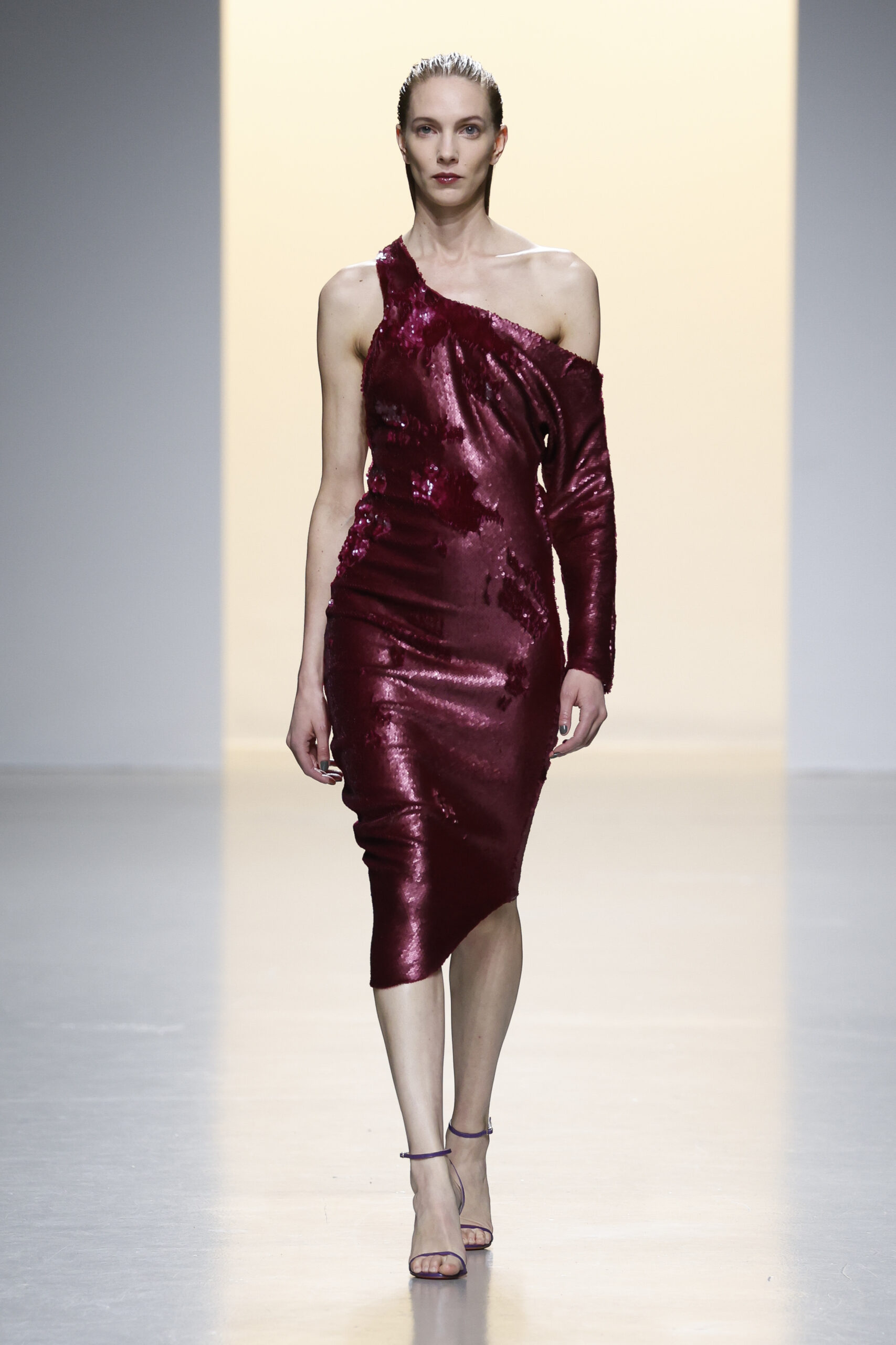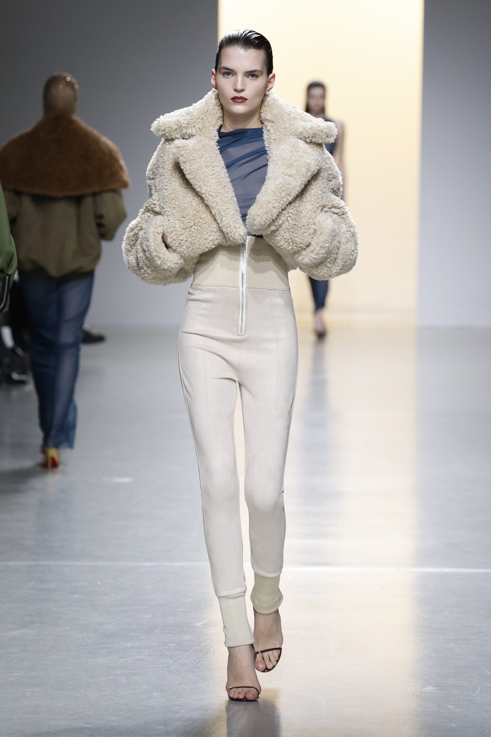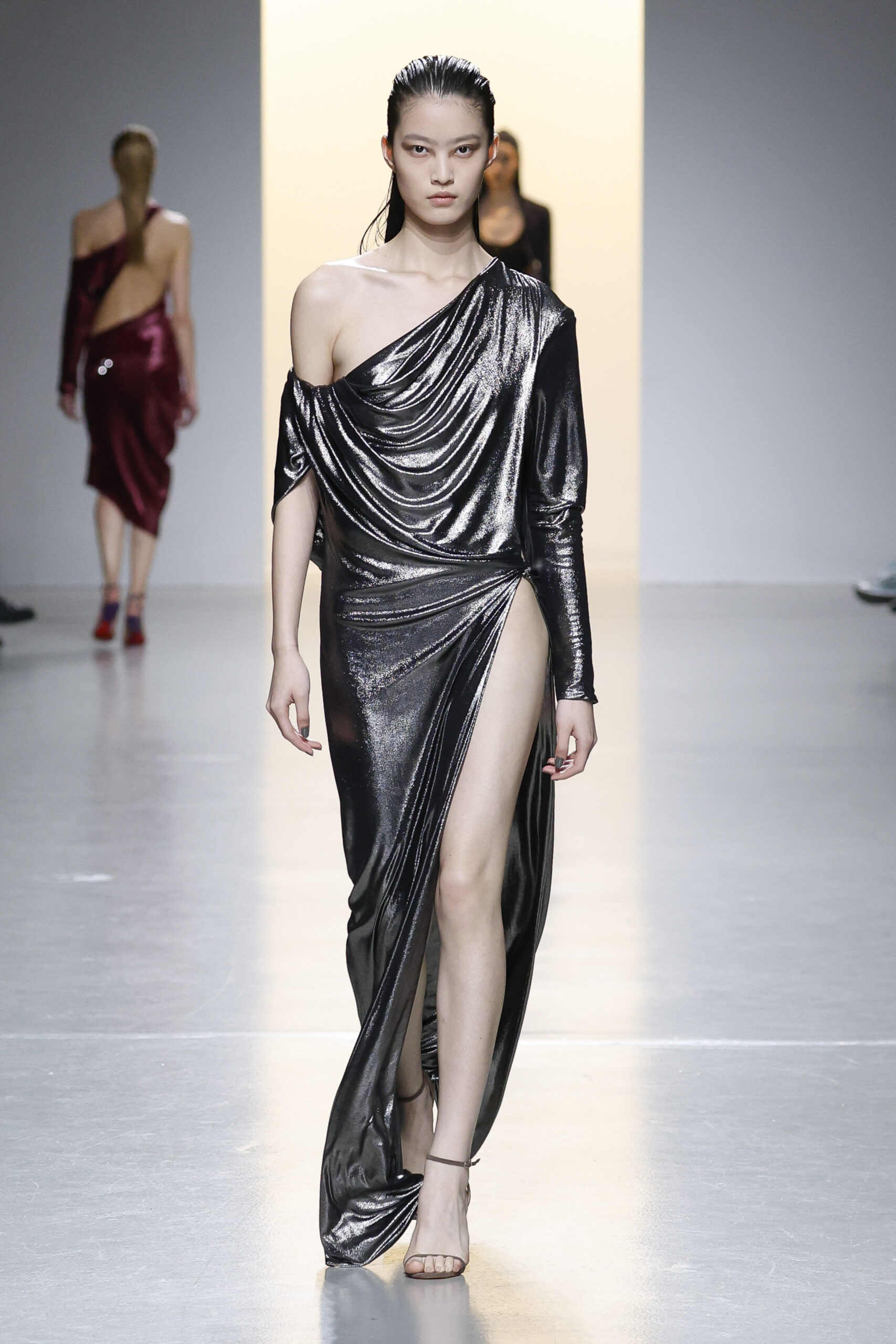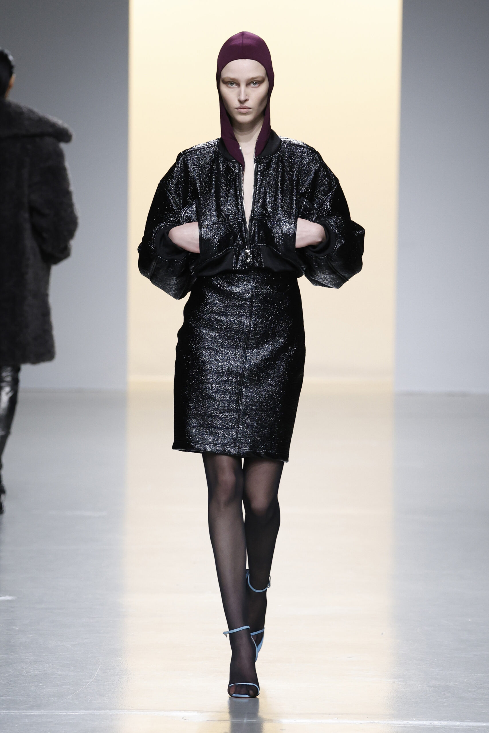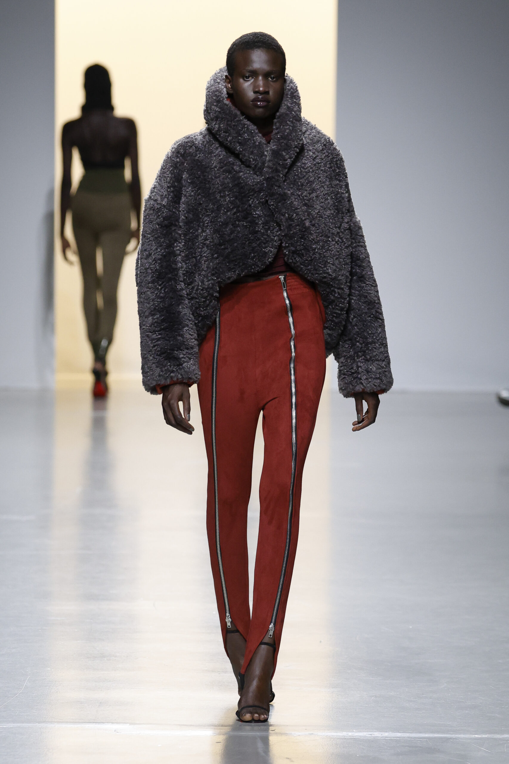 La collection introduit des tissus aux qualités minérales et extraterrestres, tels que le jersey argenté évoquant du mercure liquide, le mesh cristallin, les sequins reptiliens et le cracknyl, un tissu couture à la surface semblable à celle d’une météorite, créé à l’origine par Cristóbal Balenciaga. Ces matériaux, alliés aux tissus classiques d’ATLEIN, témoignent de la poursuite par Tron de l’exploration des alternatives véganes au cuir, avec des jerseys spéciaux imitant l’effet du nappa et du daim.