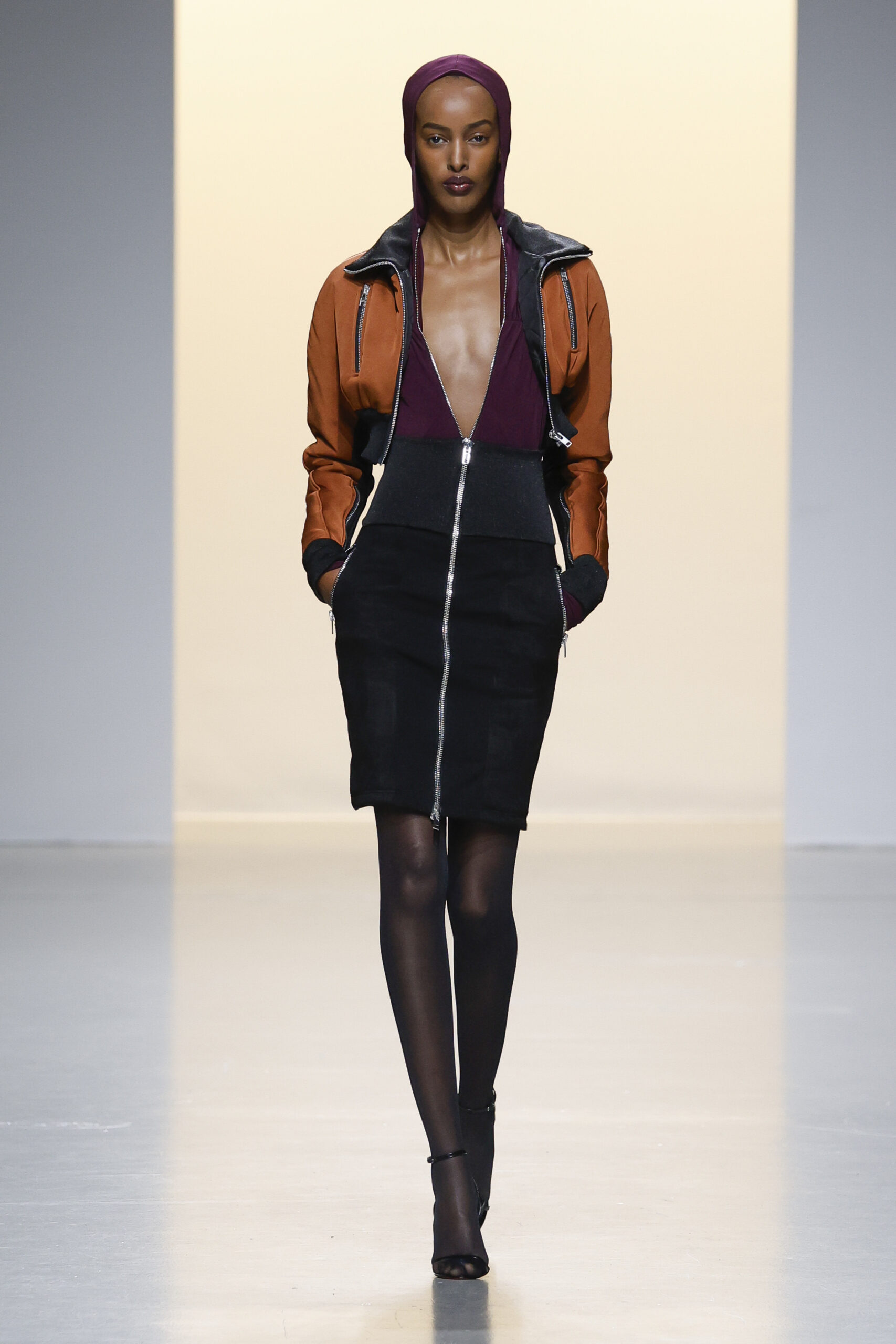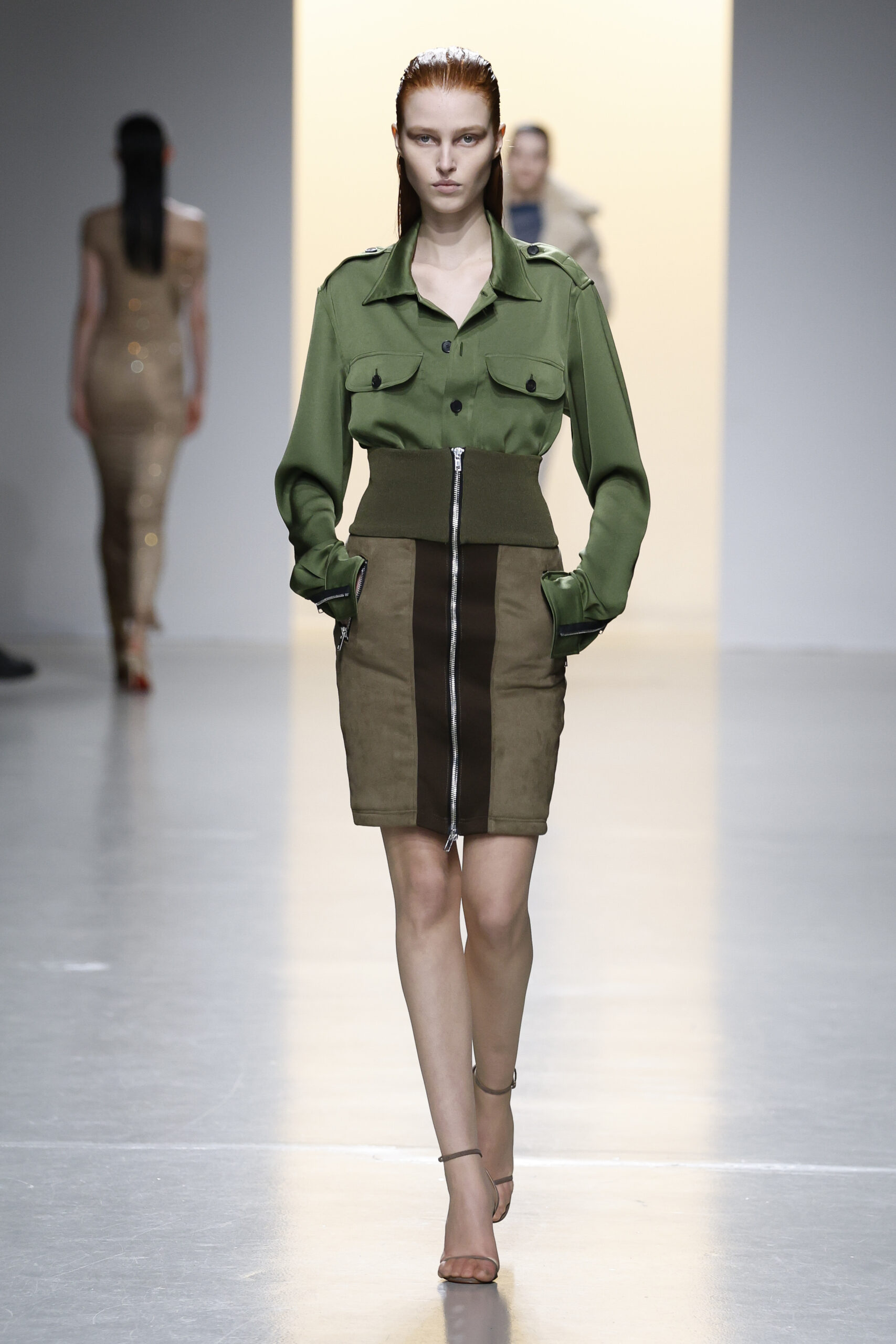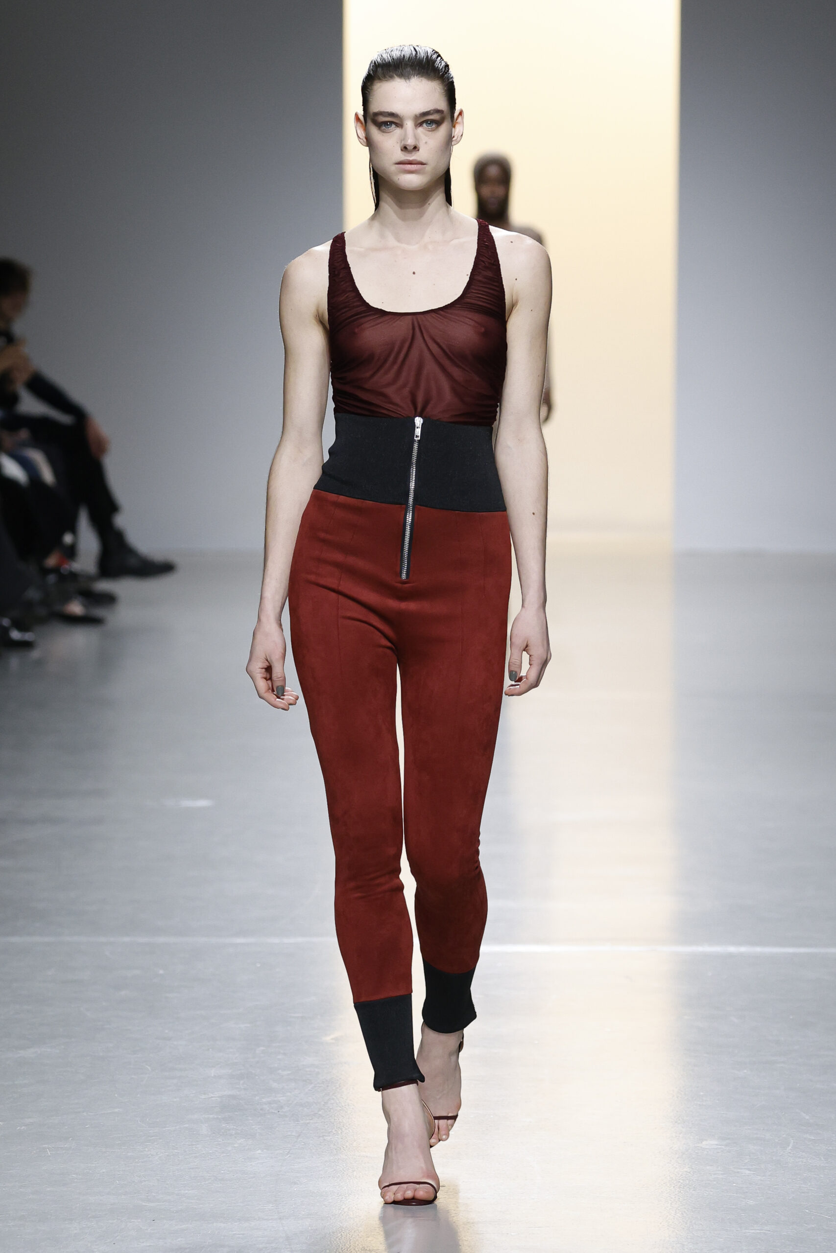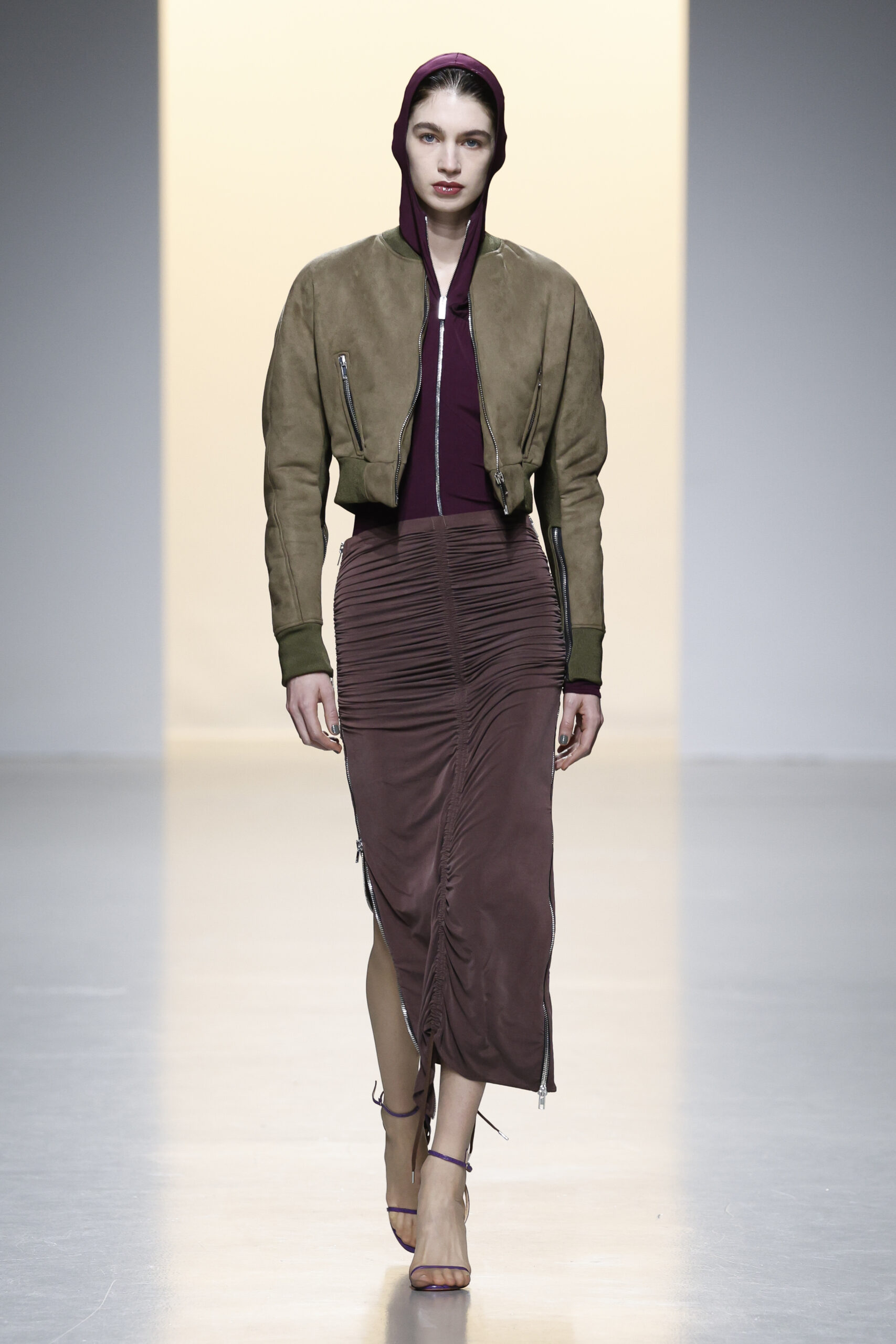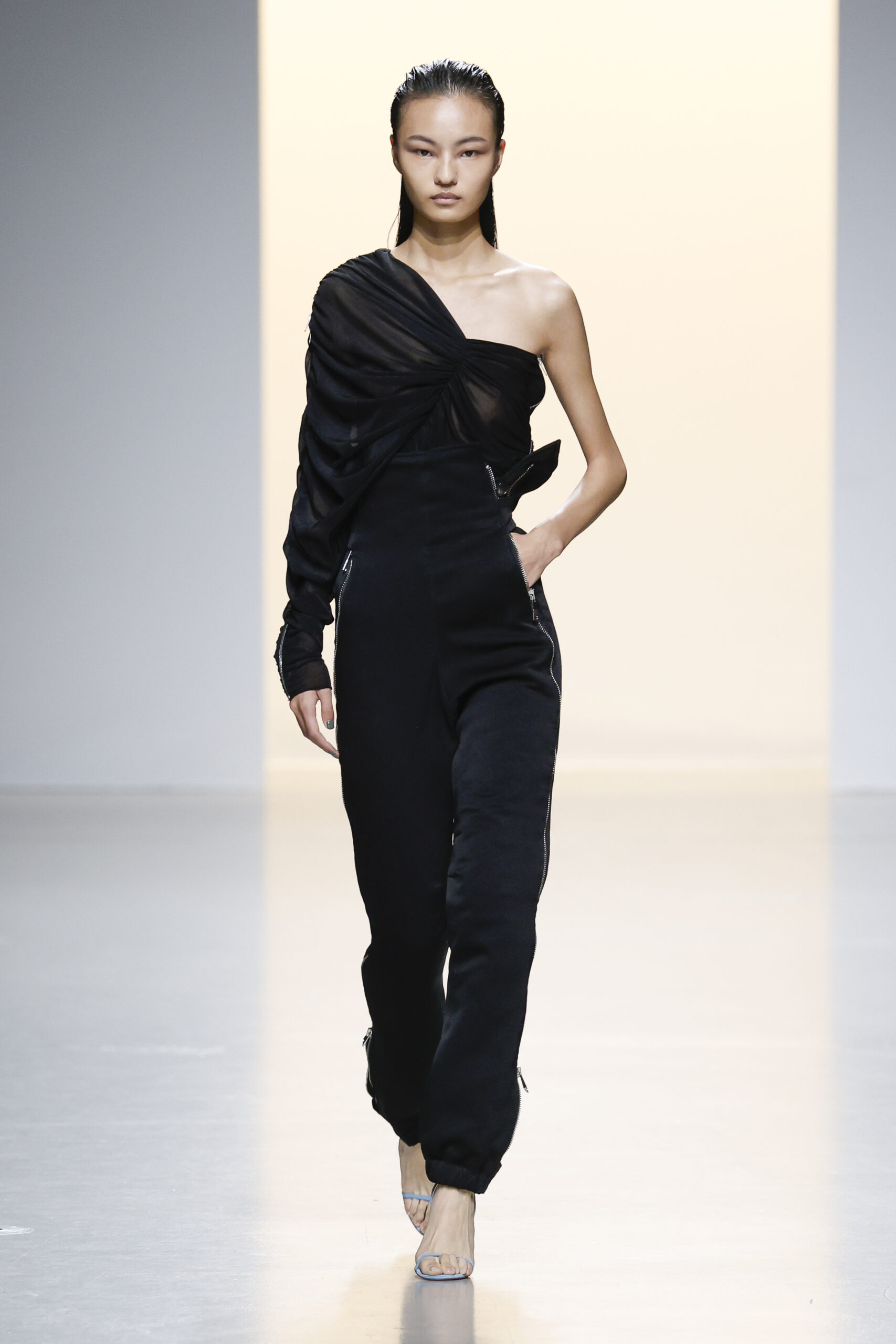 La collection introduit des tissus aux qualités minérales et extraterrestres, tels que le jersey argenté évoquant du mercure liquide, le mesh cristallin, les sequins reptiliens et le cracknyl, un tissu couture à la surface semblable à celle d’une météorite, créé à l’origine par Cristóbal Balenciaga. Ces matériaux, alliés aux tissus classiques d’ATLEIN, témoignent de la poursuite par Tron de l’exploration des alternatives véganes au cuir, avec des jerseys spéciaux imitant l’effet du nappa et du daim.