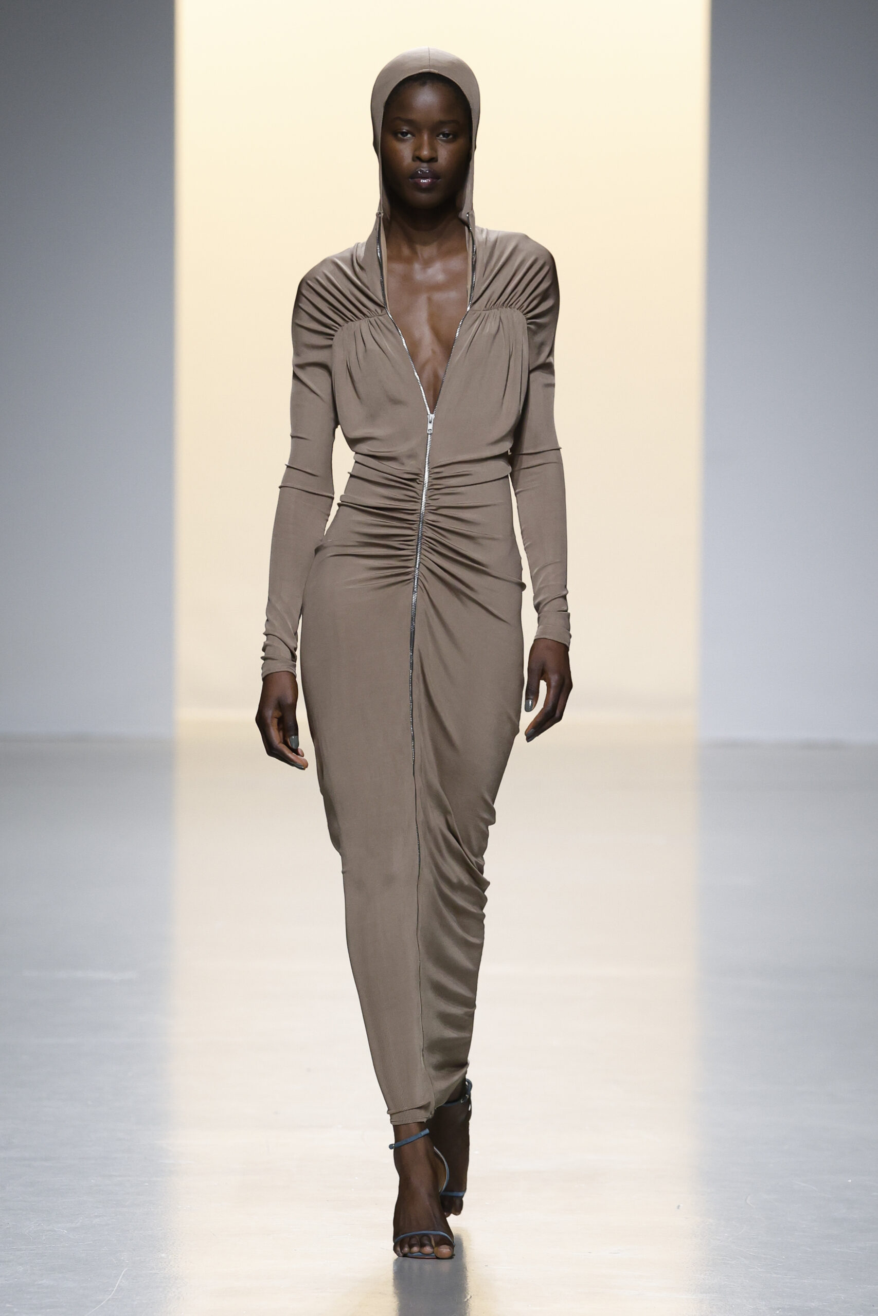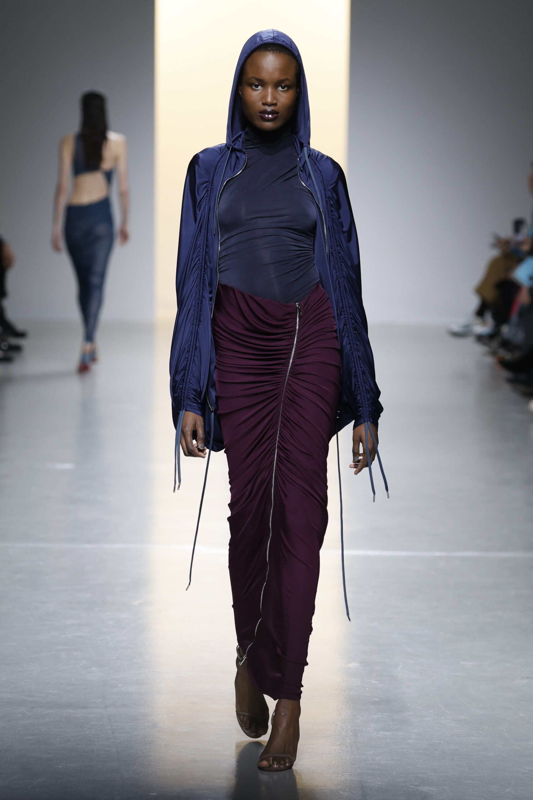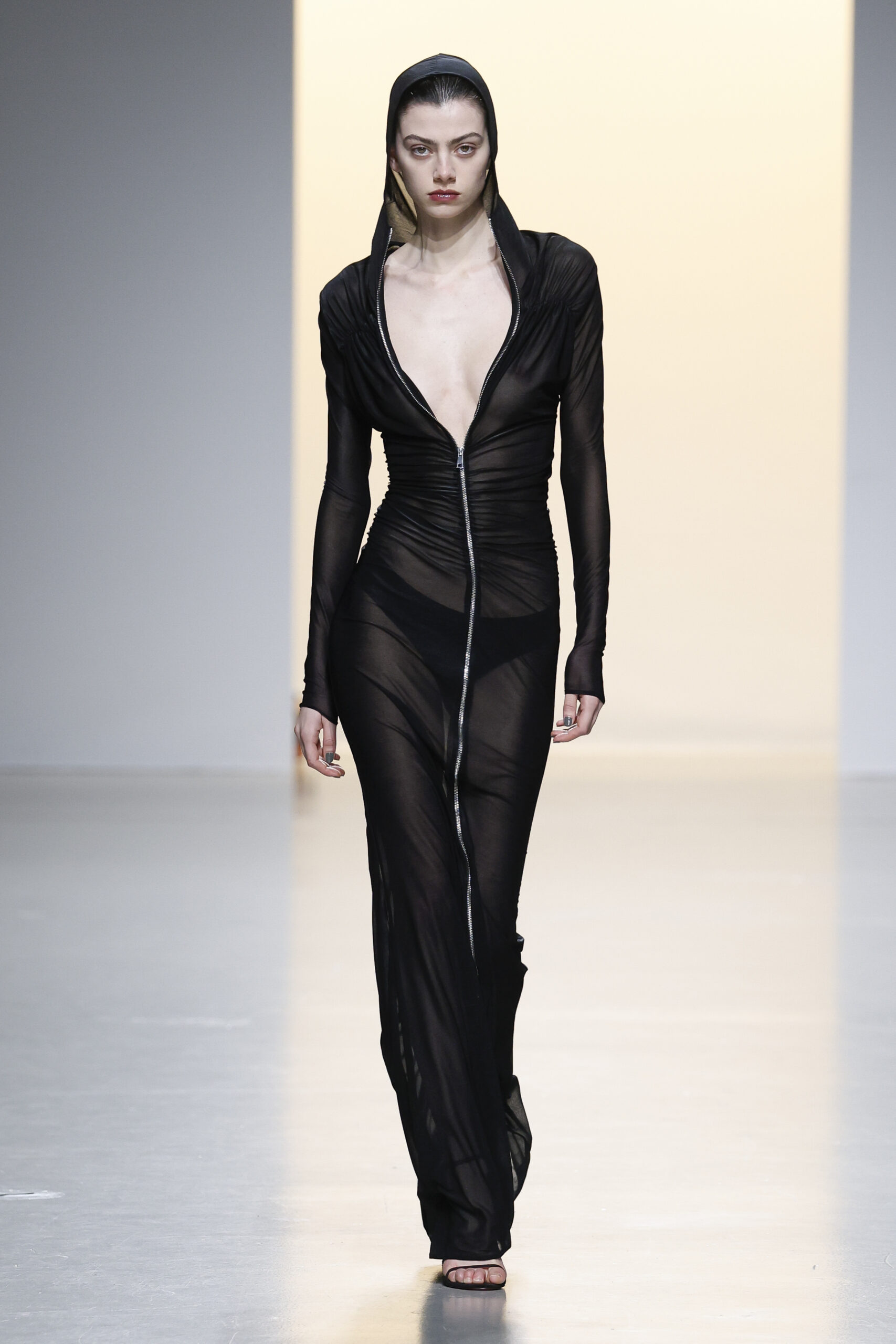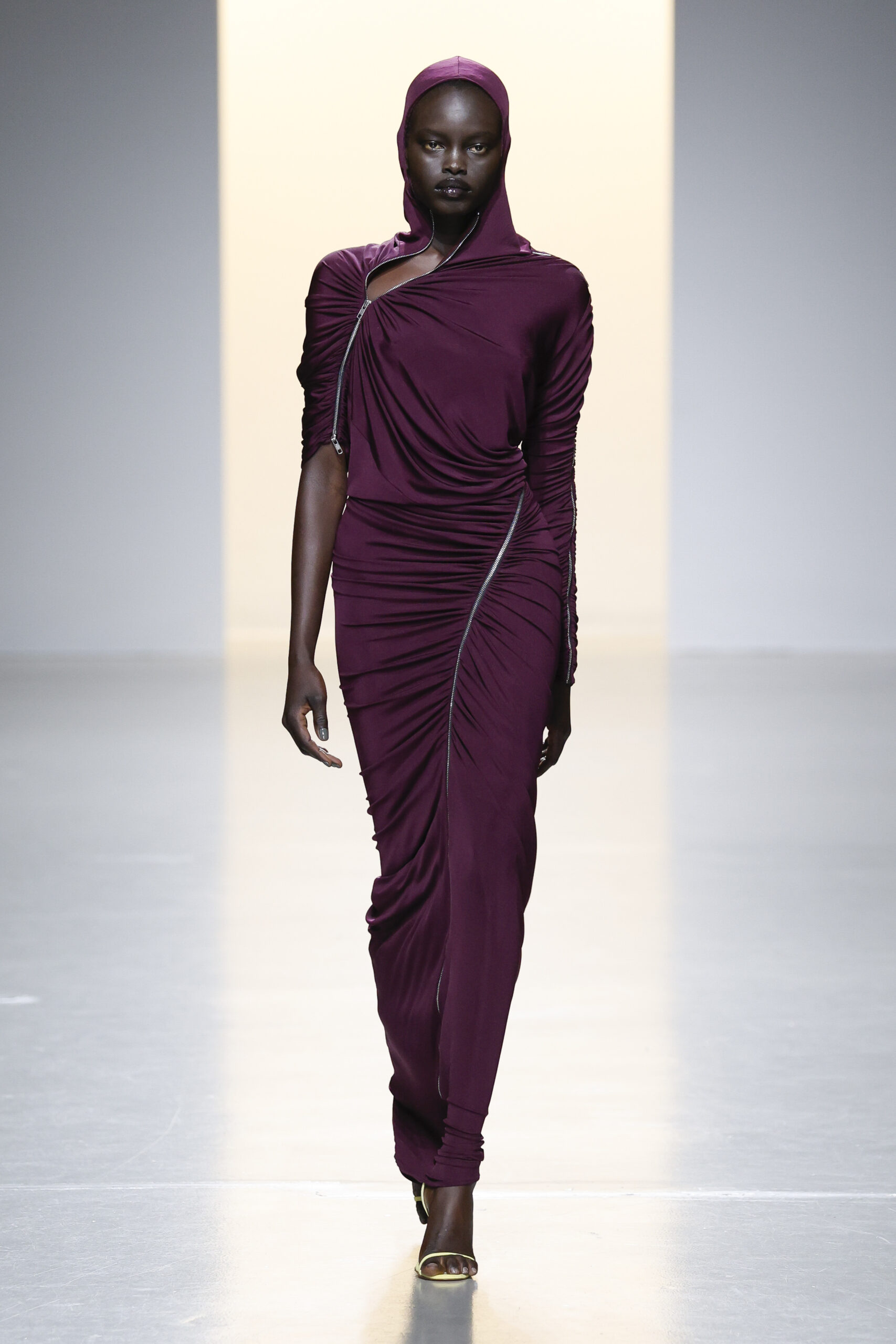 La collection se distingue par sa capacité à mêler l’utilitaire à l’hyperféminité, marquant une évolution notable des classiques ATLEIN. Les robes en jersey côtelé et en viscose sont réinventées avec des détails tels que des capuches protectrices, des fermetures éclair métalliques et des ornements hardware, rappelant les gestes sensuels d’ouverture et de fermeture d’une combinaison de plongée. Cette hybridation souligne l’importance de la construction dans l’œuvre de Tron, où les tissus sont travaillés de manière à envelopper, draper et mouler le corps, affirmant une silhouette consciente, active et souvent allongée, qui semble flotter au-delà des limites terrestres.