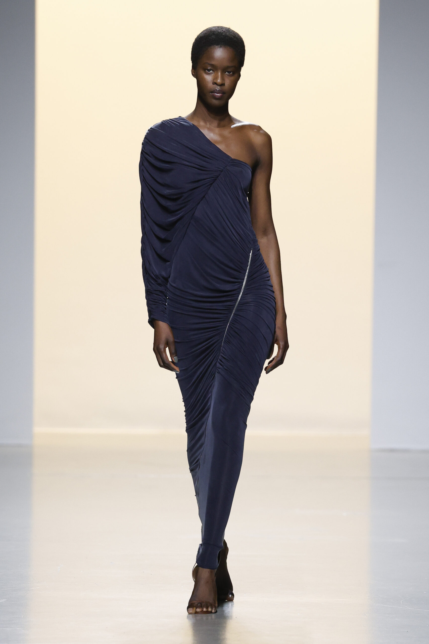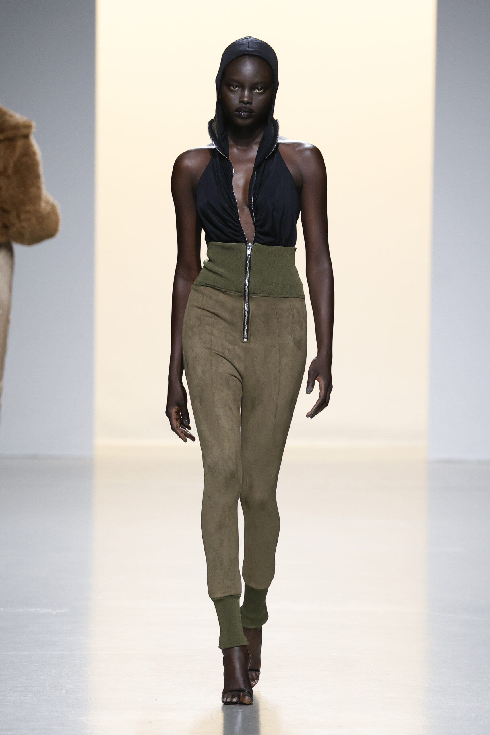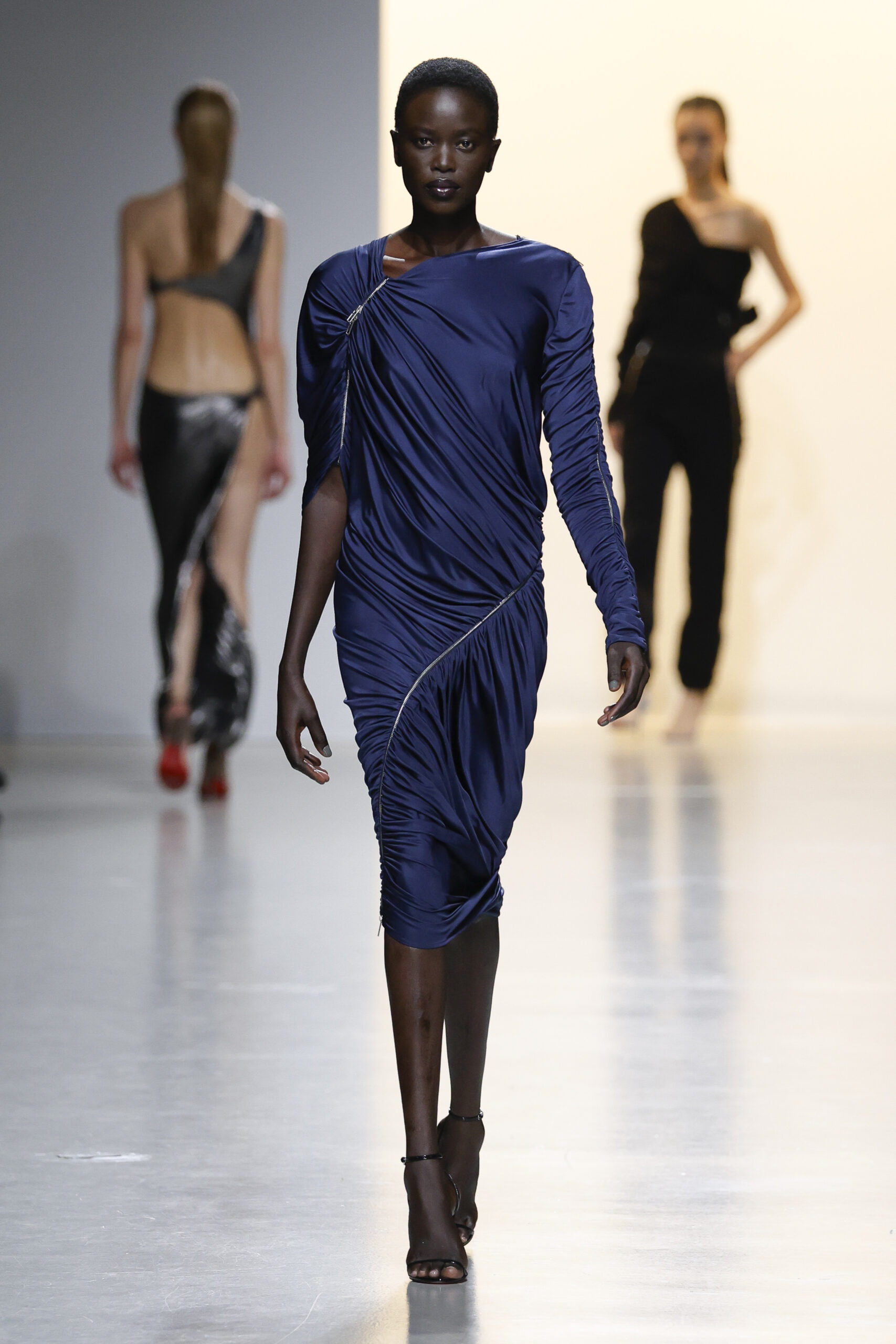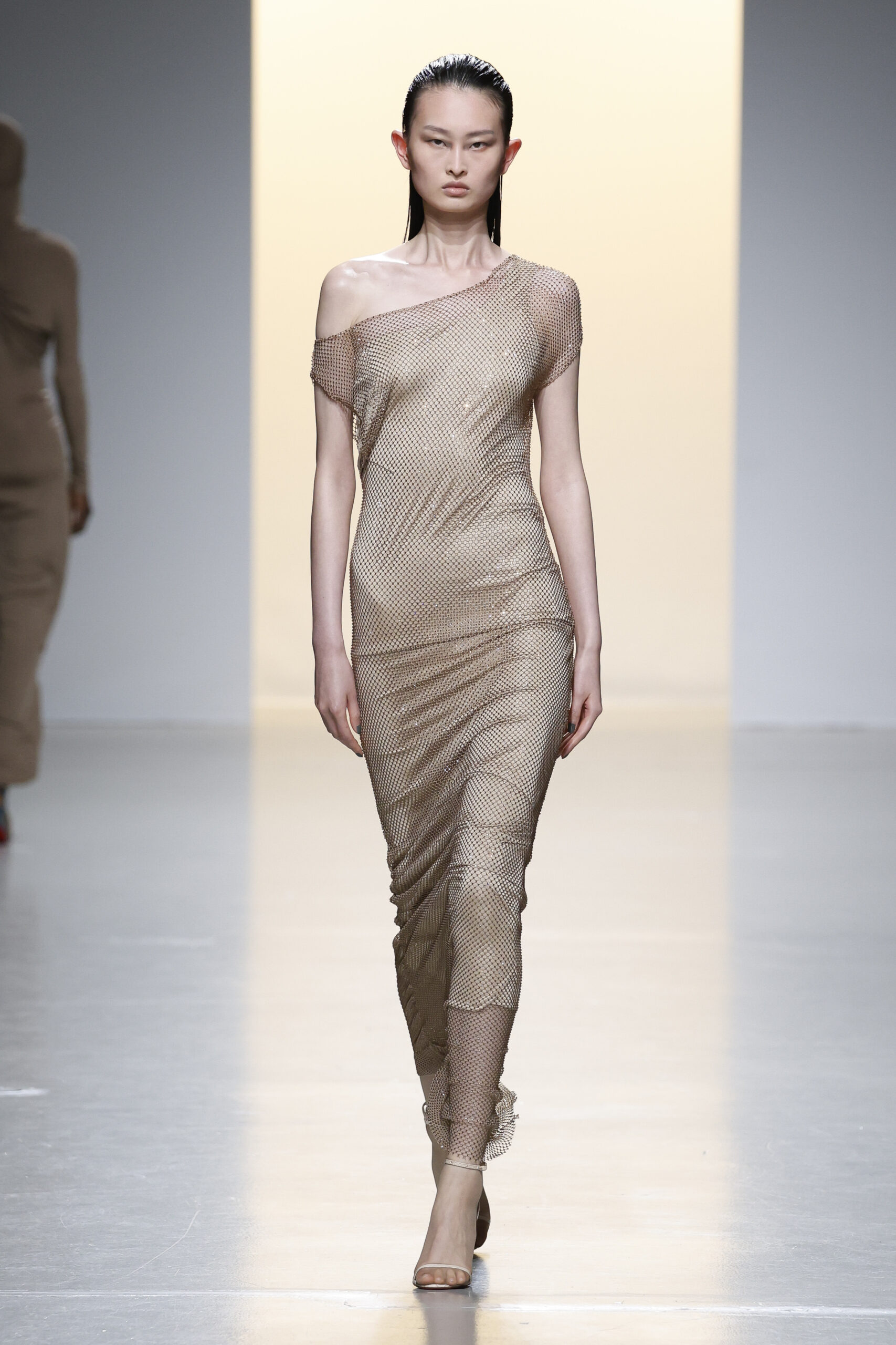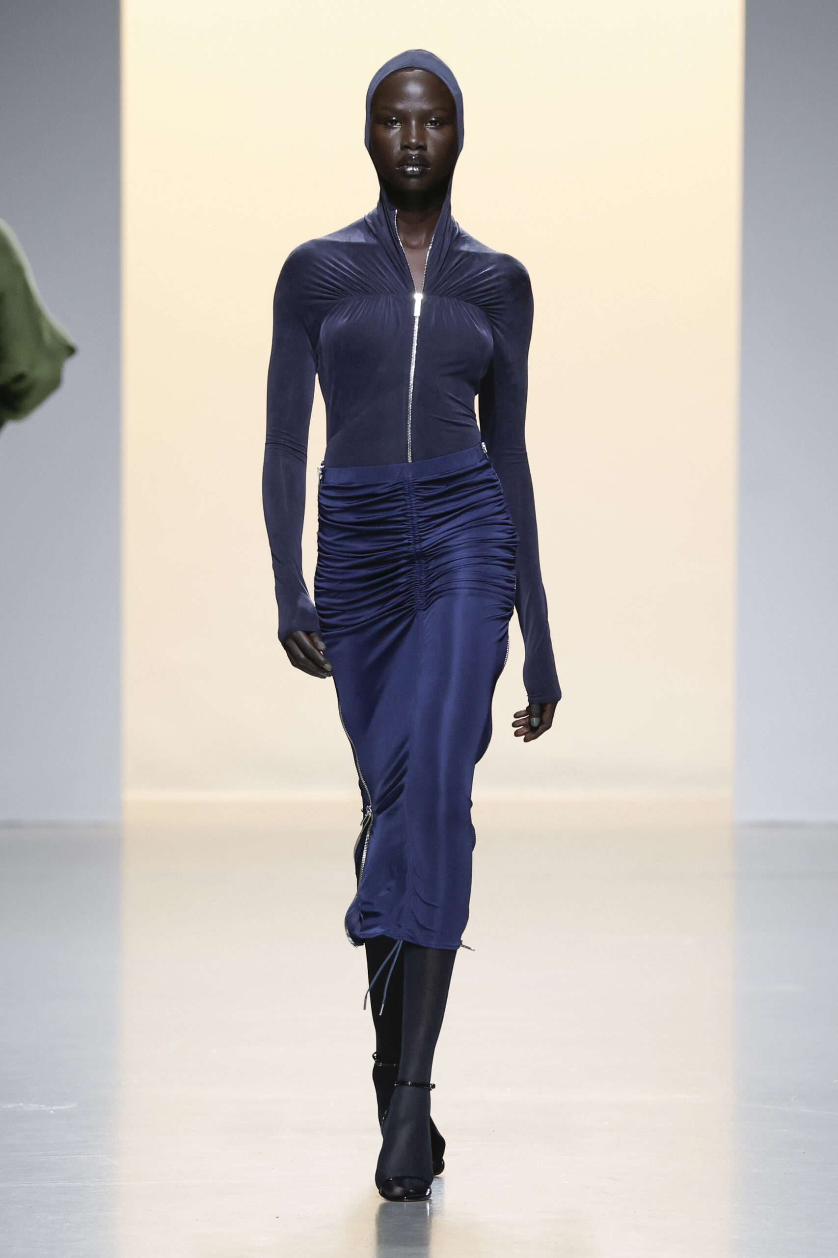 La collection se distingue par sa capacité à mêler l’utilitaire à l’hyperféminité, marquant une évolution notable des classiques ATLEIN. Les robes en jersey côtelé et en viscose sont réinventées avec des détails tels que des capuches protectrices, des fermetures éclair métalliques et des ornements hardware, rappelant les gestes sensuels d’ouverture et de fermeture d’une combinaison de plongée. Cette hybridation souligne l’importance de la construction dans l’œuvre de Tron, où les tissus sont travaillés de manière à envelopper, draper et mouler le corps, affirmant une silhouette consciente, active et souvent allongée, qui semble flotter au-delà des limites terrestres.