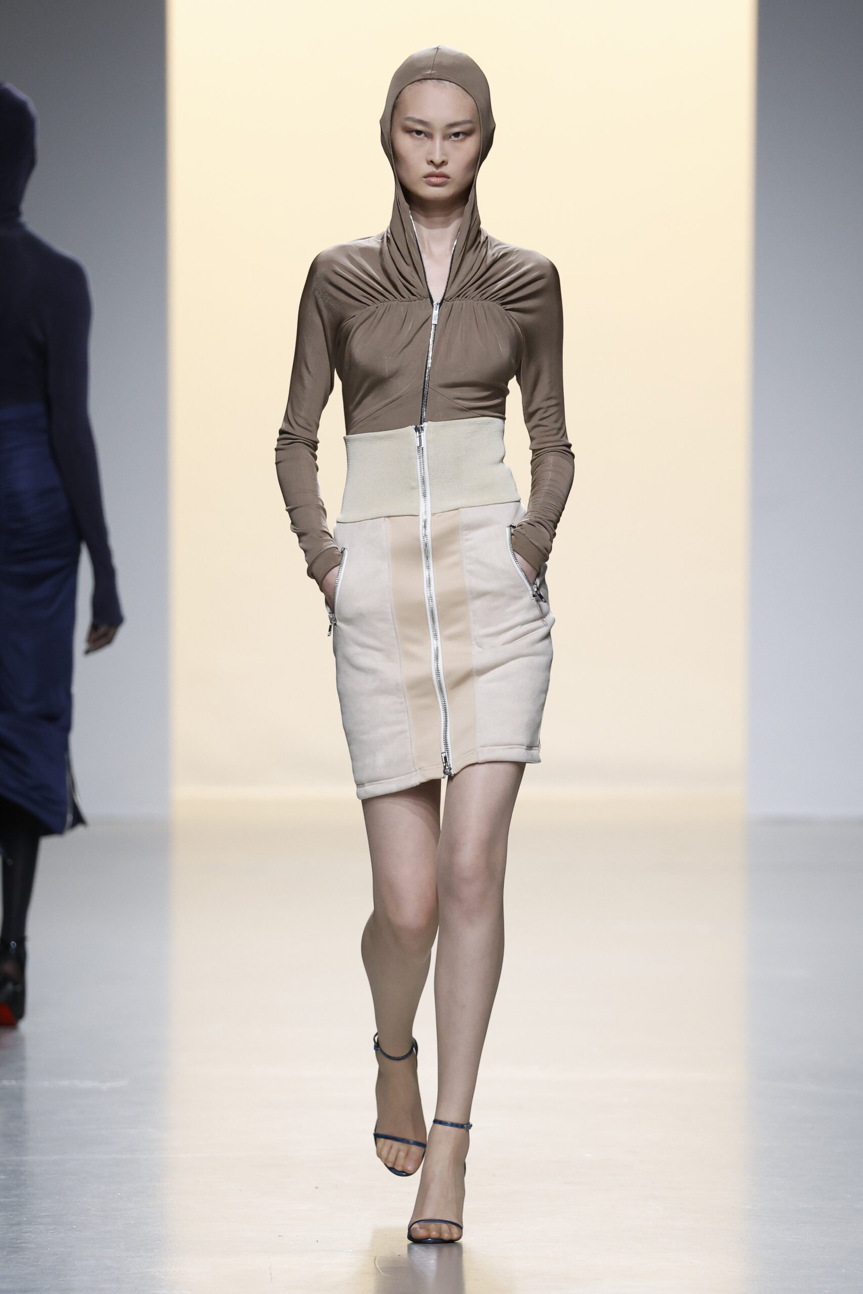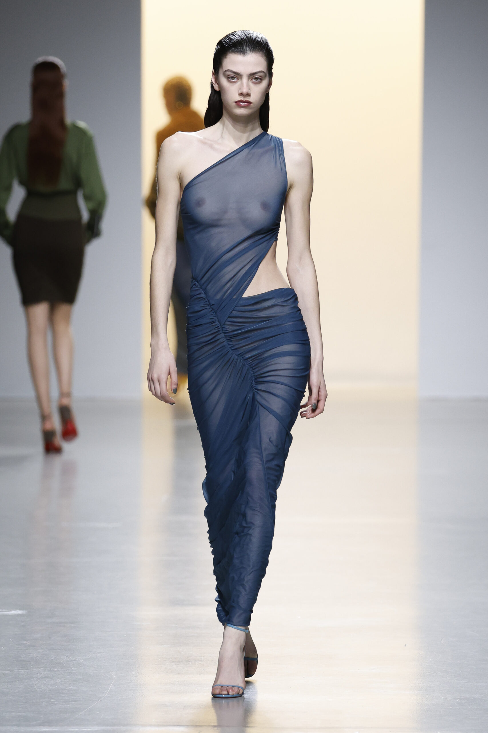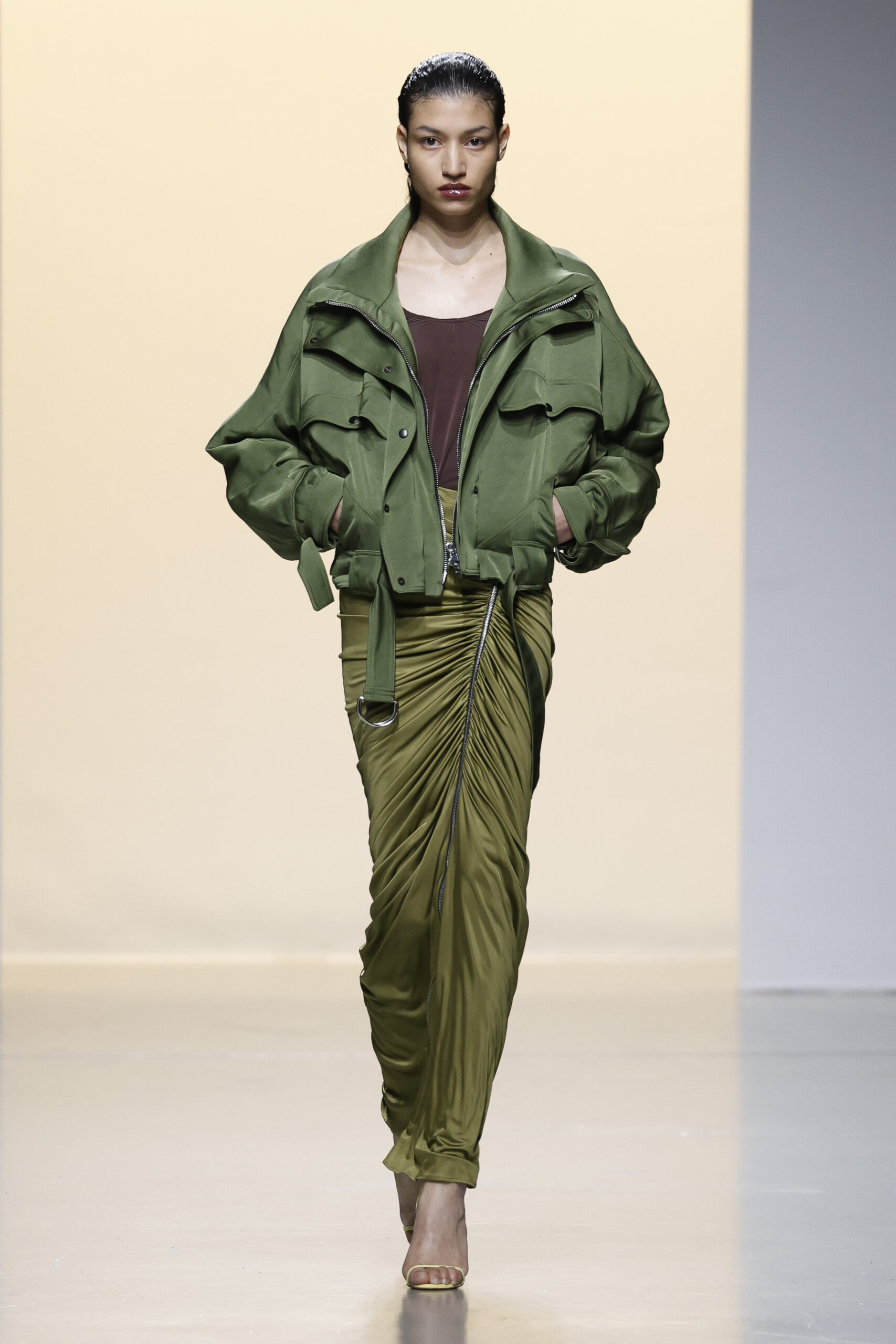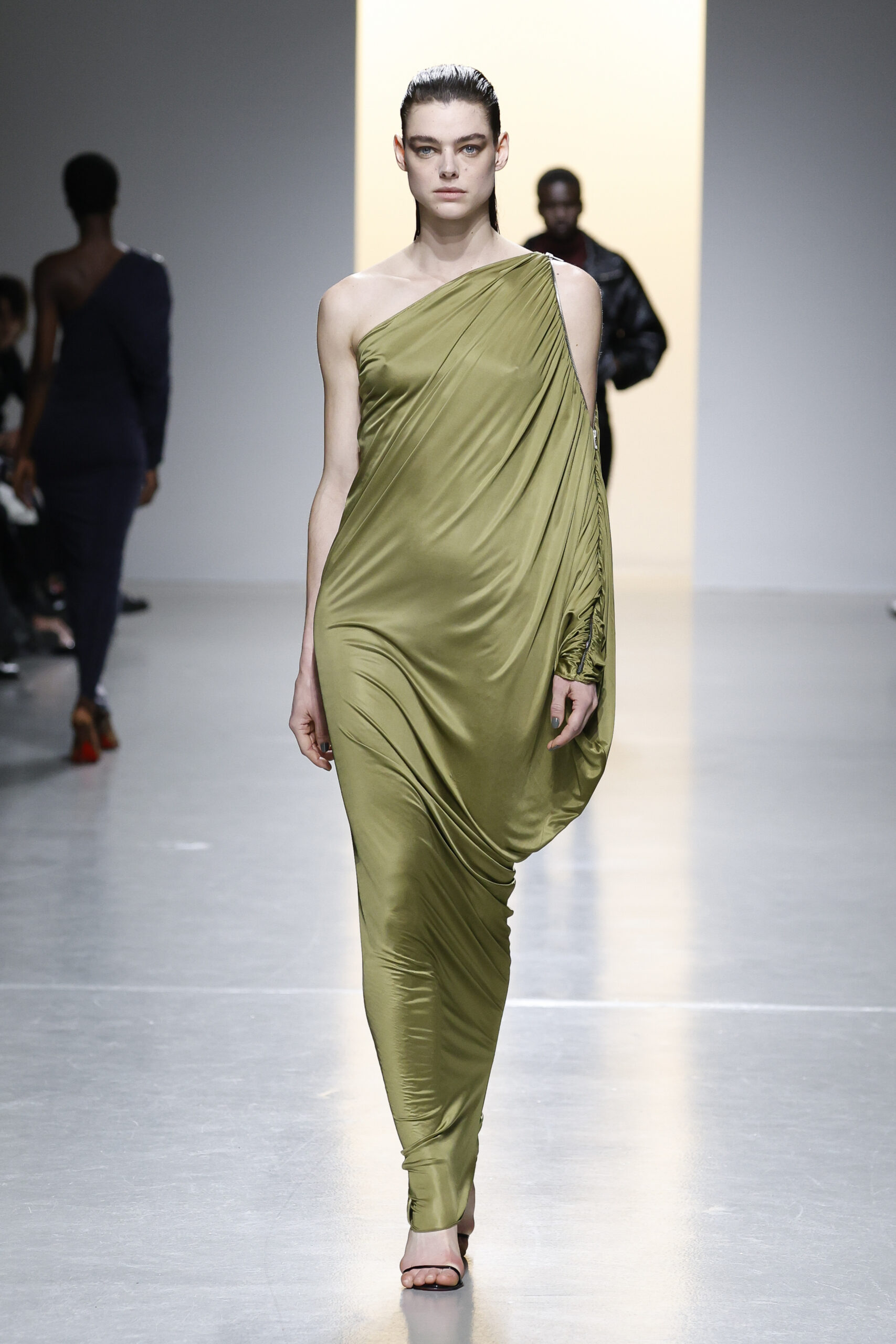 La collection se distingue par sa capacité à mêler l’utilitaire à l’hyperféminité, marquant une évolution notable des classiques ATLEIN. Les robes en jersey côtelé et en viscose sont réinventées avec des détails tels que des capuches protectrices, des fermetures éclair métalliques et des ornements hardware, rappelant les gestes sensuels d’ouverture et de fermeture d’une combinaison de plongée. Cette hybridation souligne l’importance de la construction dans l’œuvre de Tron, où les tissus sont travaillés de manière à envelopper, draper et mouler le corps, affirmant une silhouette consciente, active et souvent allongée, qui semble flotter au-delà des limites terrestres.