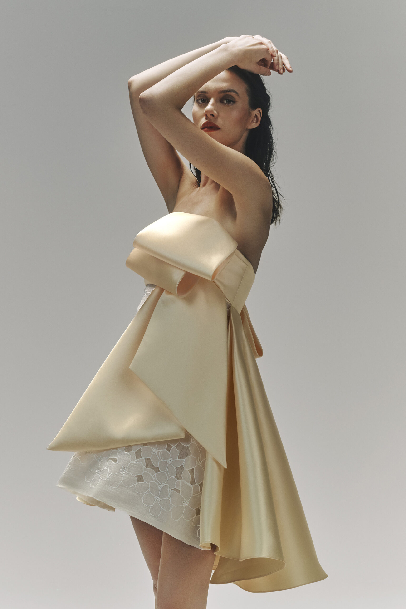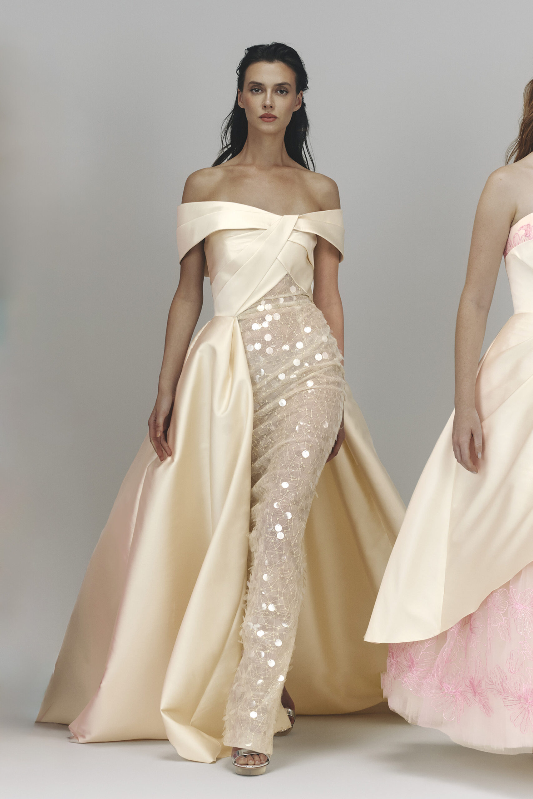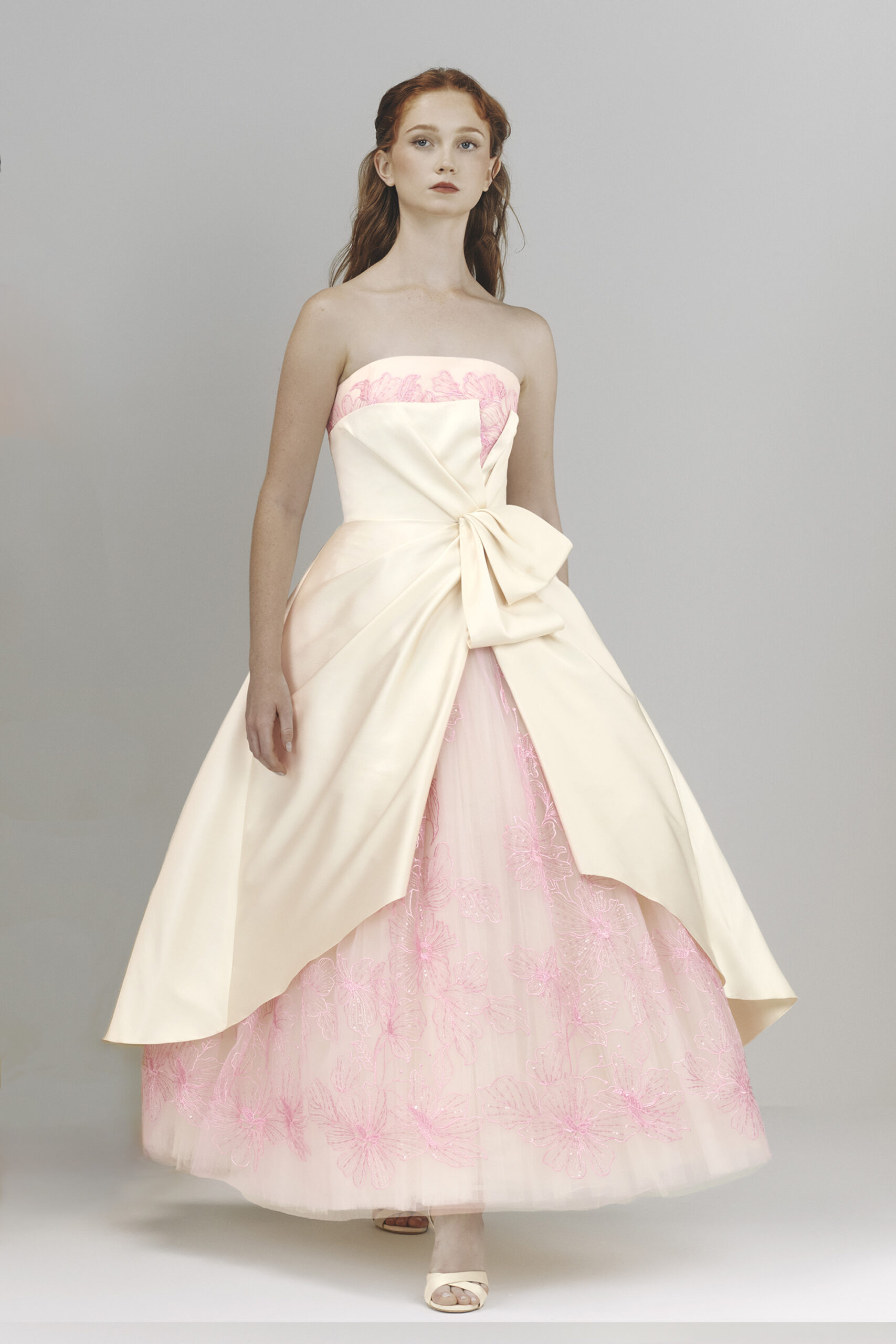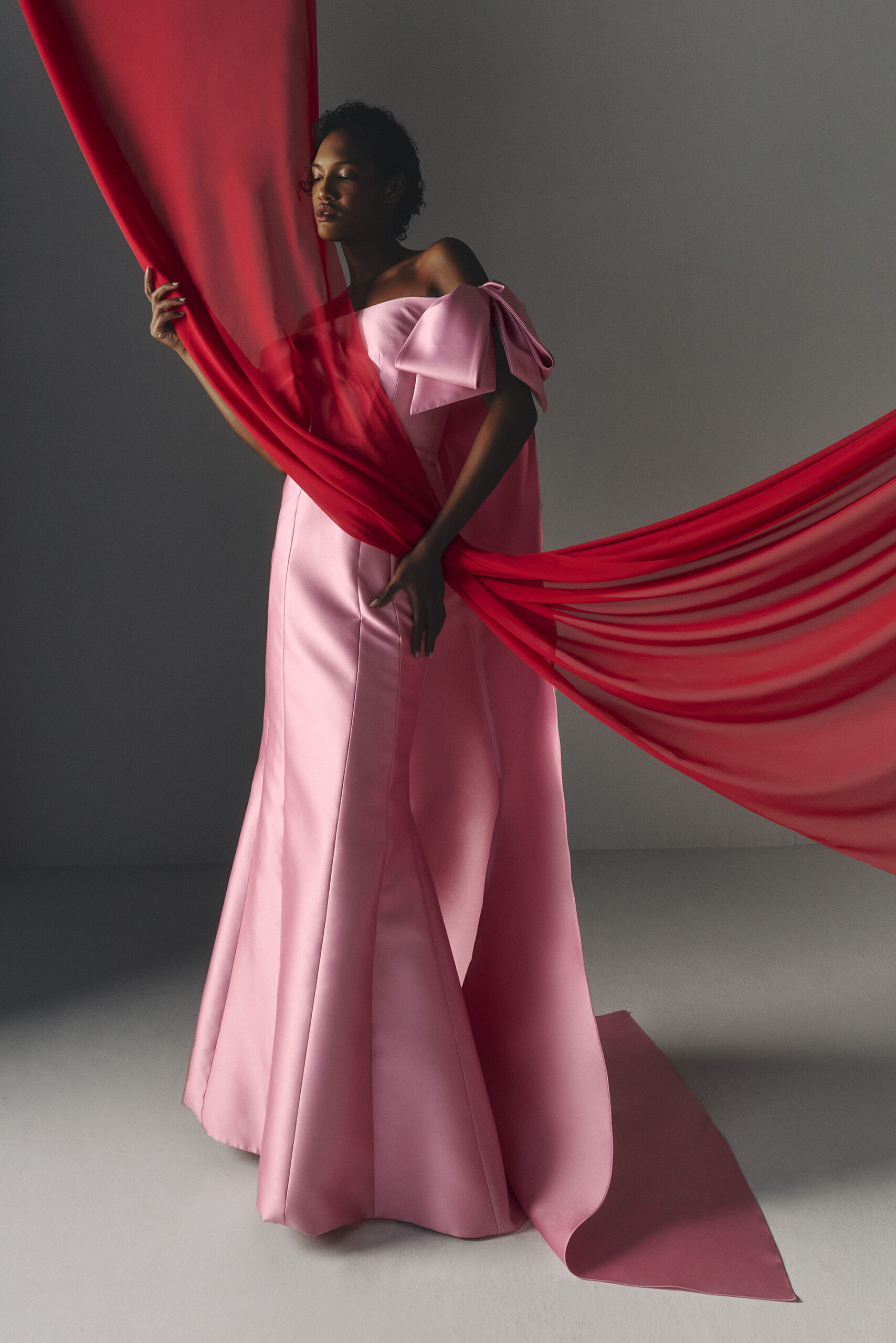 Les pièces sont sublimées par des ornements élaborés – draperies, nœuds, et broderies complexes – ajoutant profondeur et texture à la collection. La palette de couleurs, inspirée de l’environnement du miroir de Matsuyama, propose des tons tels que Vanilla, Lemonade, Cameo Pink, et bien d’autres, évoquant le charme mystique de la culture et de la nature japonaises.