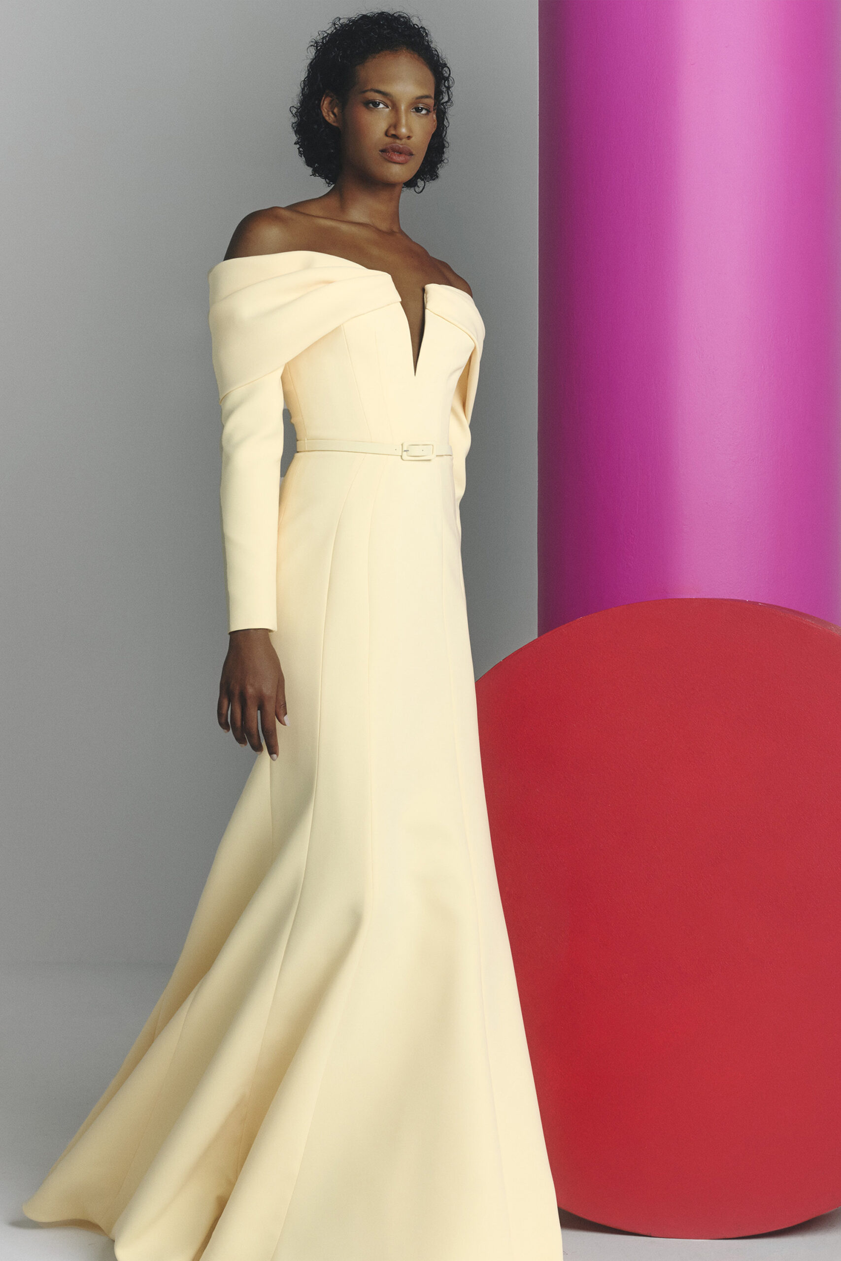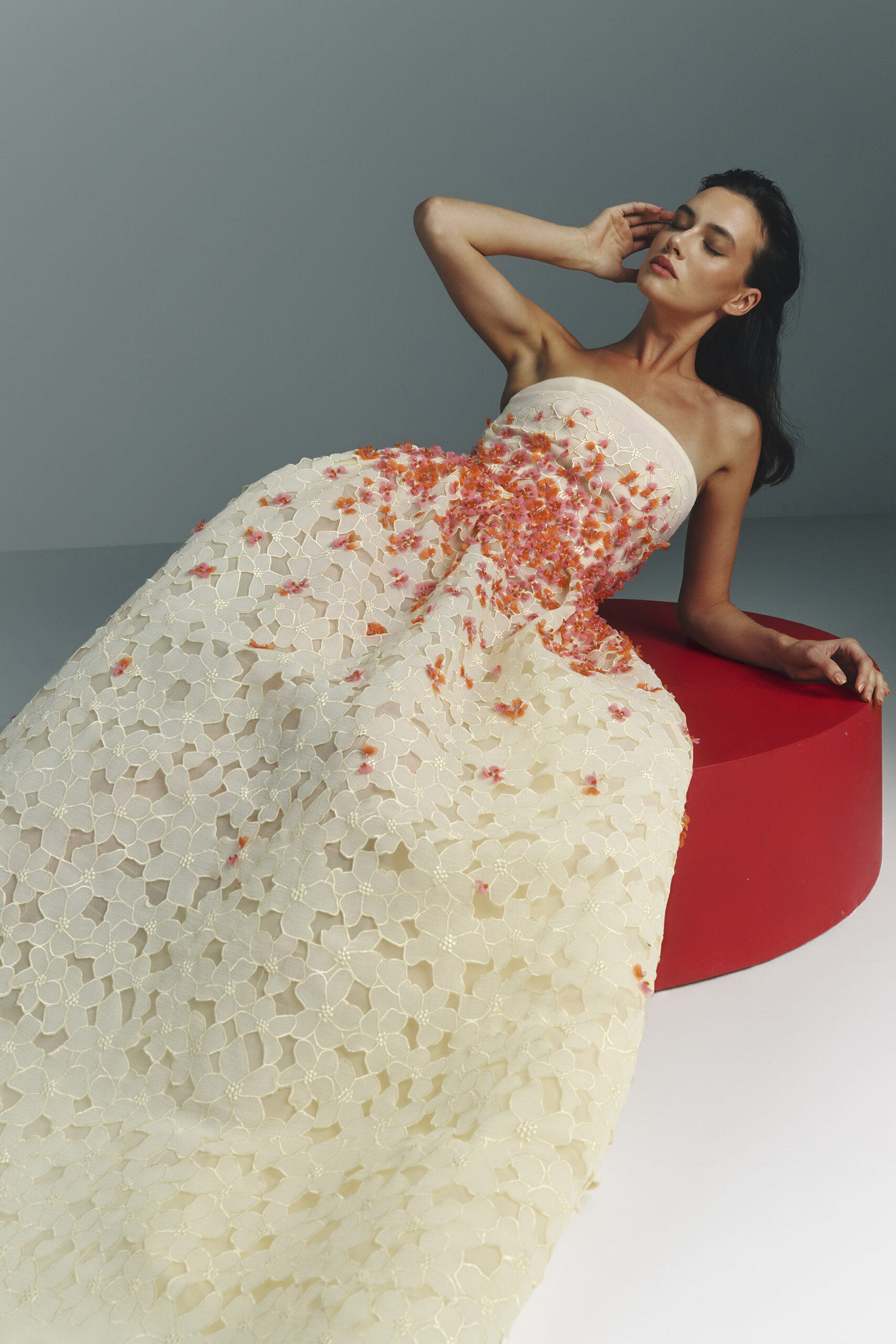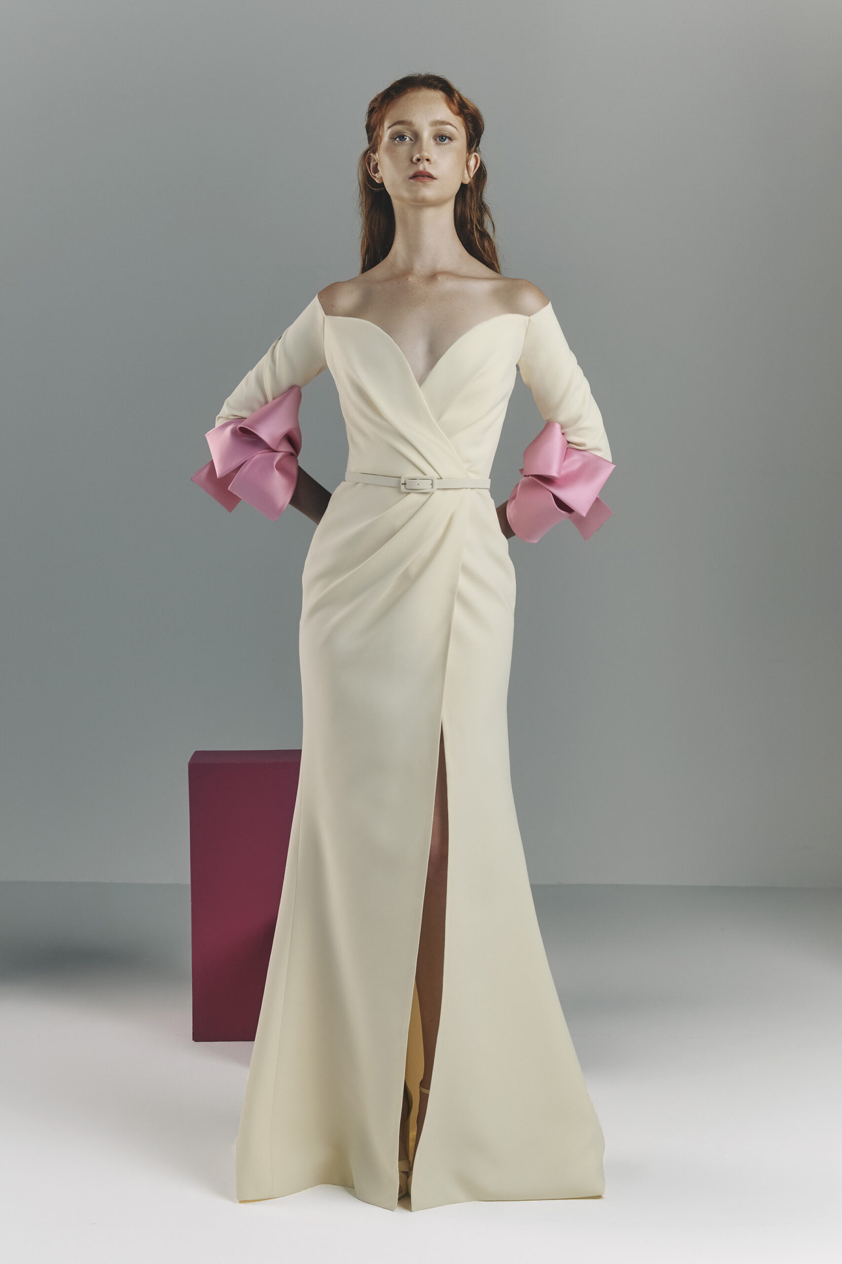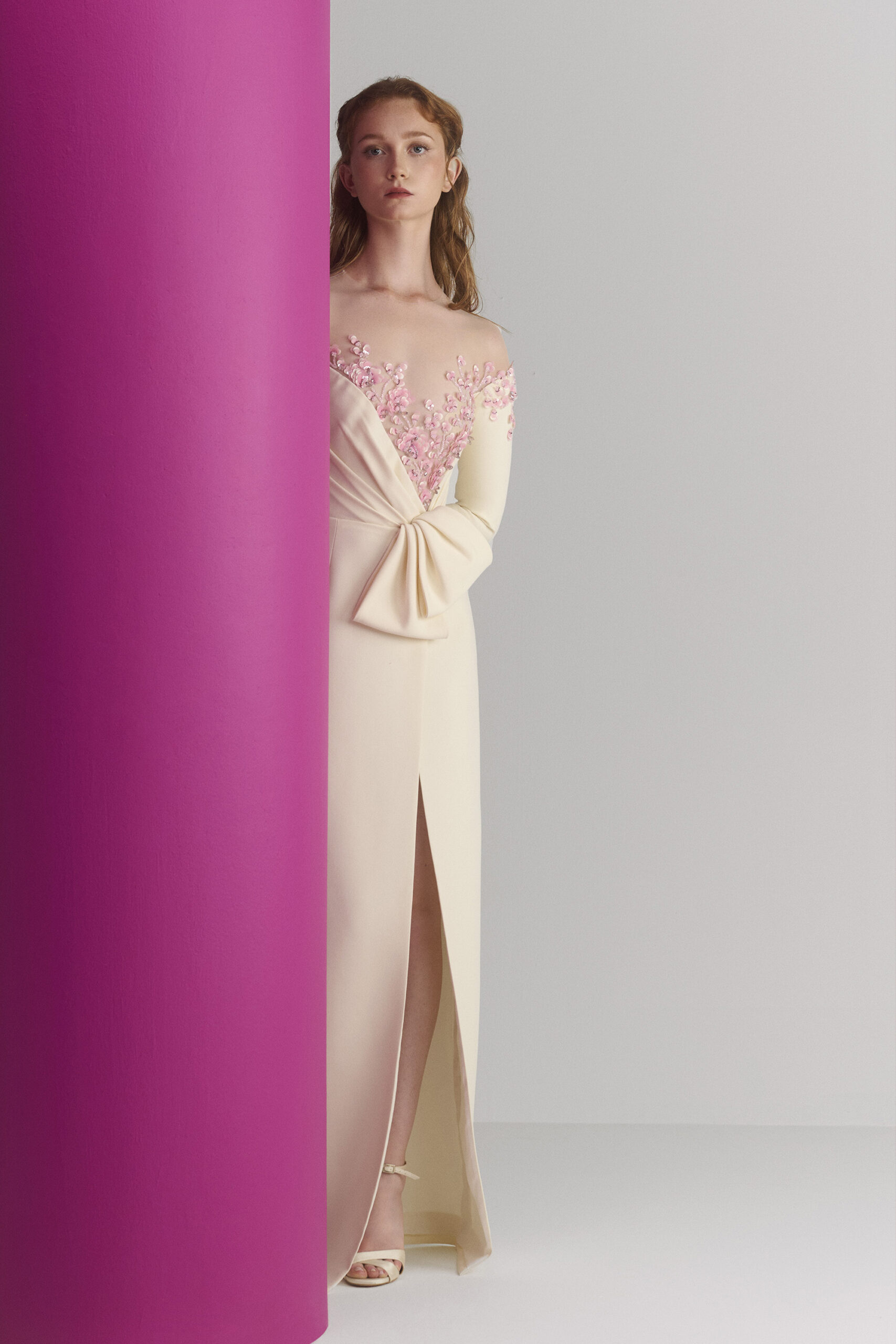 Les pièces sont sublimées par des ornements élaborés – draperies, nœuds, et broderies complexes – ajoutant profondeur et texture à la collection. La palette de couleurs, inspirée de l’environnement du miroir de Matsuyama, propose des tons tels que Vanilla, Lemonade, Cameo Pink, et bien d’autres, évoquant le charme mystique de la culture et de la nature japonaises.