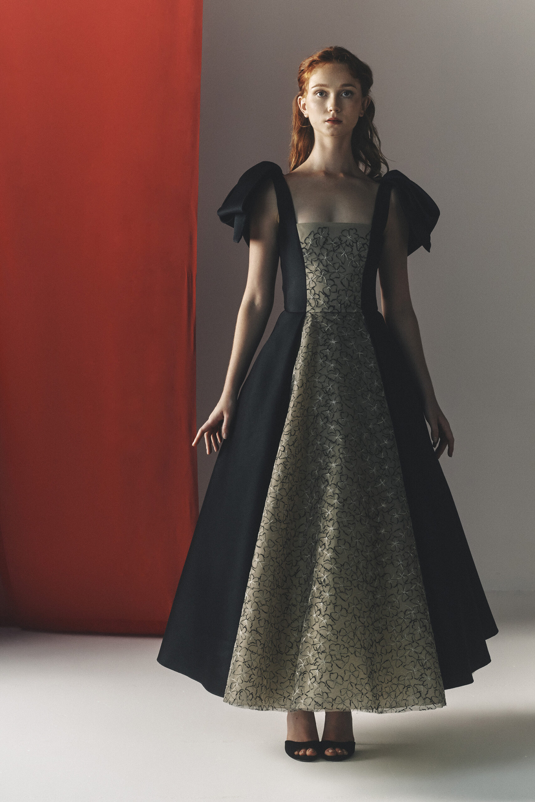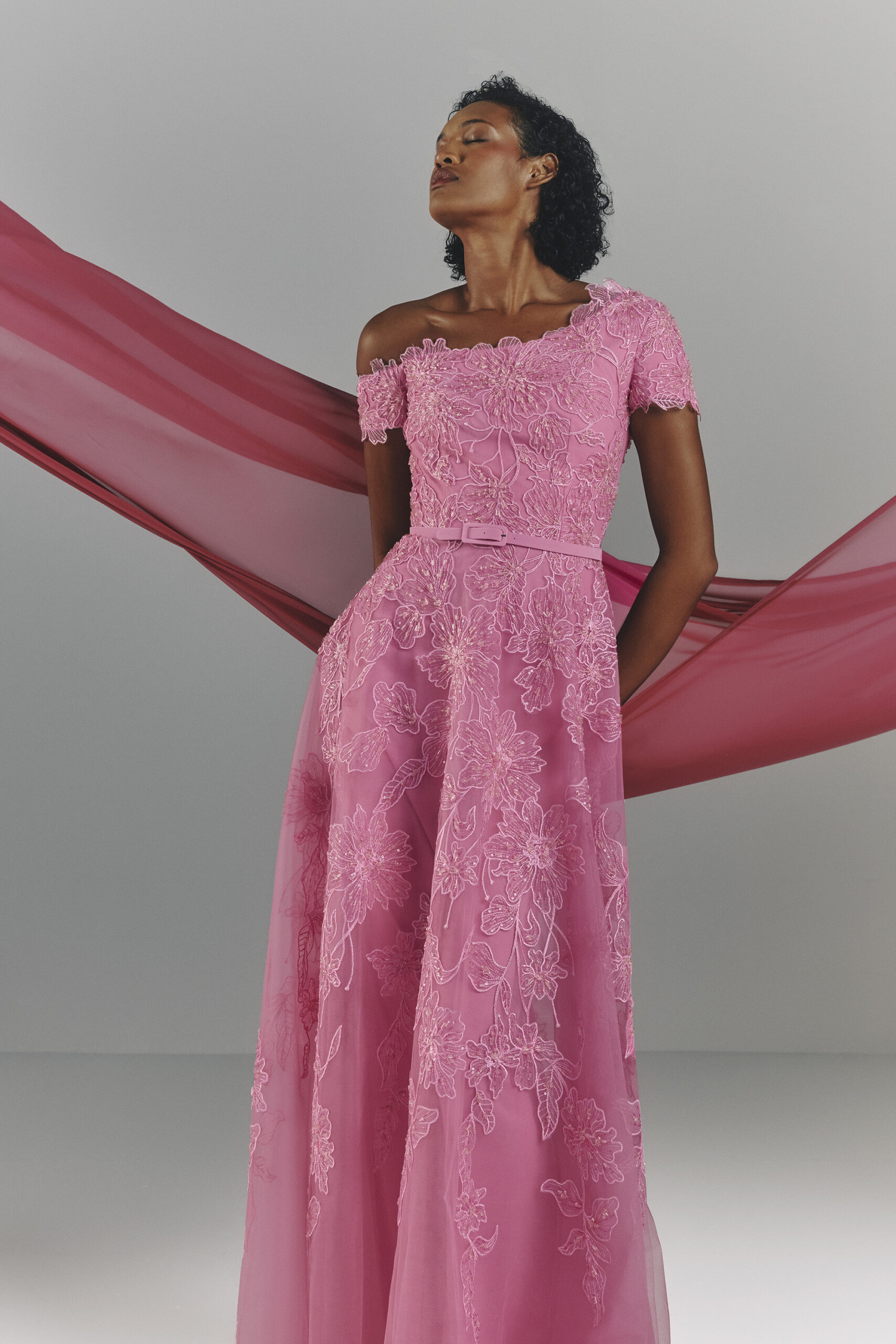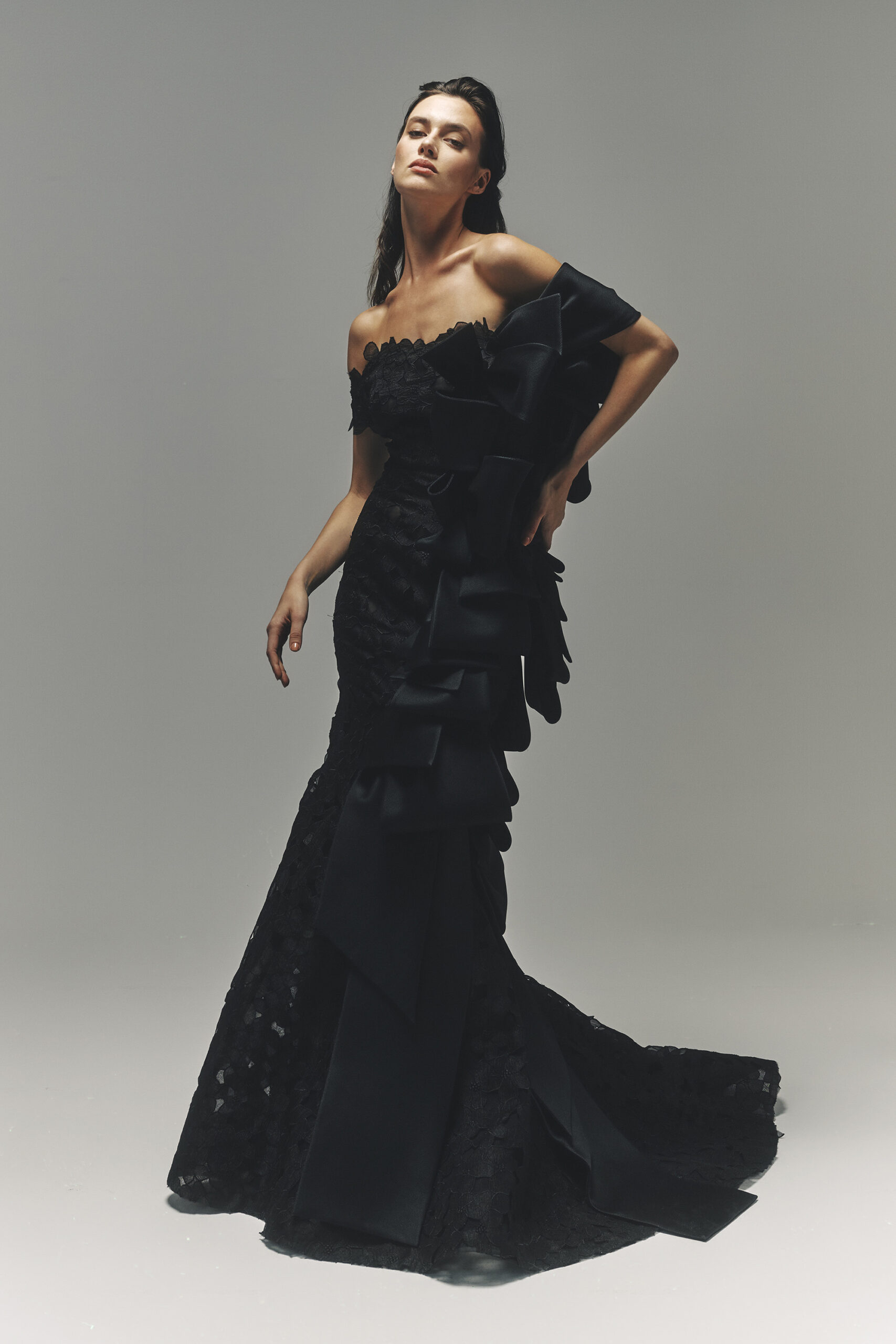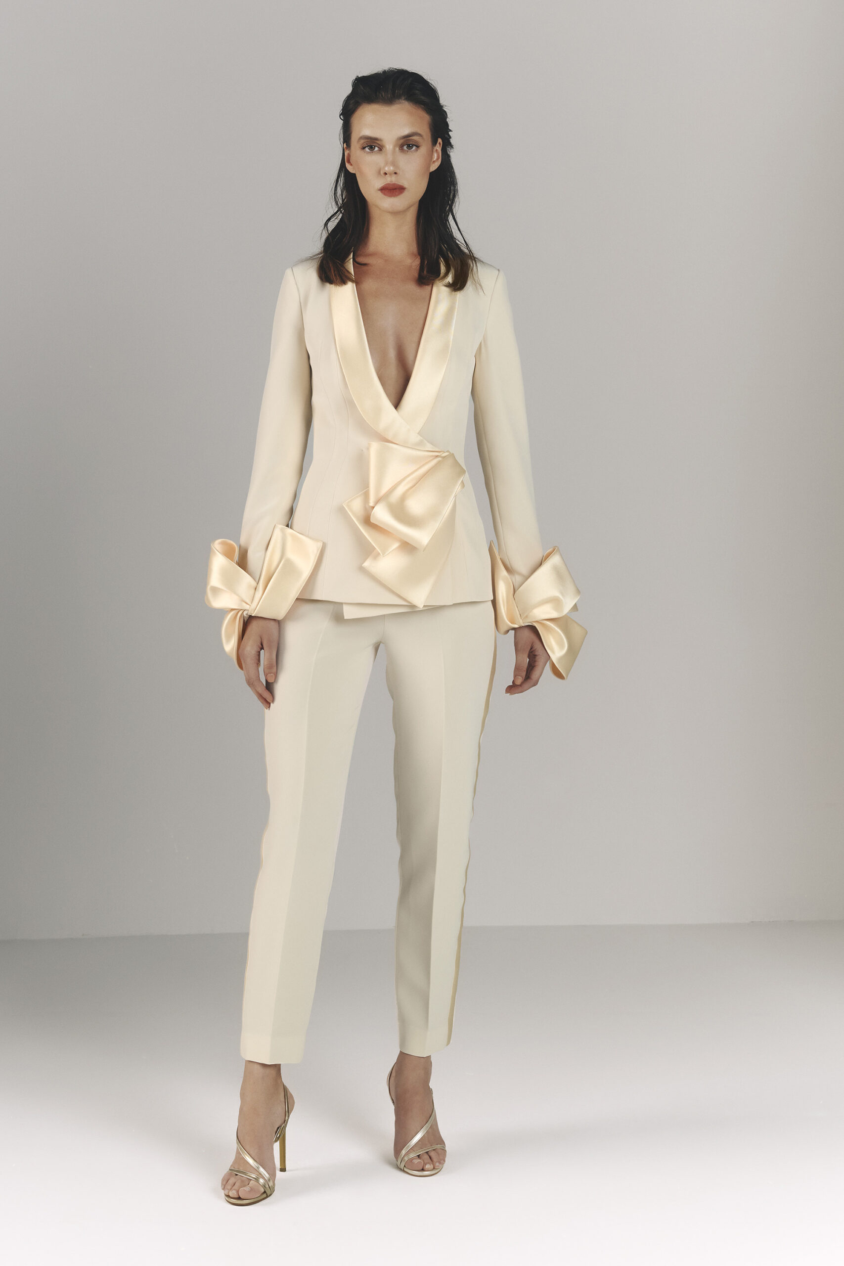 Les pièces sont sublimées par des ornements élaborés – draperies, nœuds, et broderies complexes – ajoutant profondeur et texture à la collection. La palette de couleurs, inspirée de l’environnement du miroir de Matsuyama, propose des tons tels que Vanilla, Lemonade, Cameo Pink, et bien d’autres, évoquant le charme mystique de la culture et de la nature japonaises.