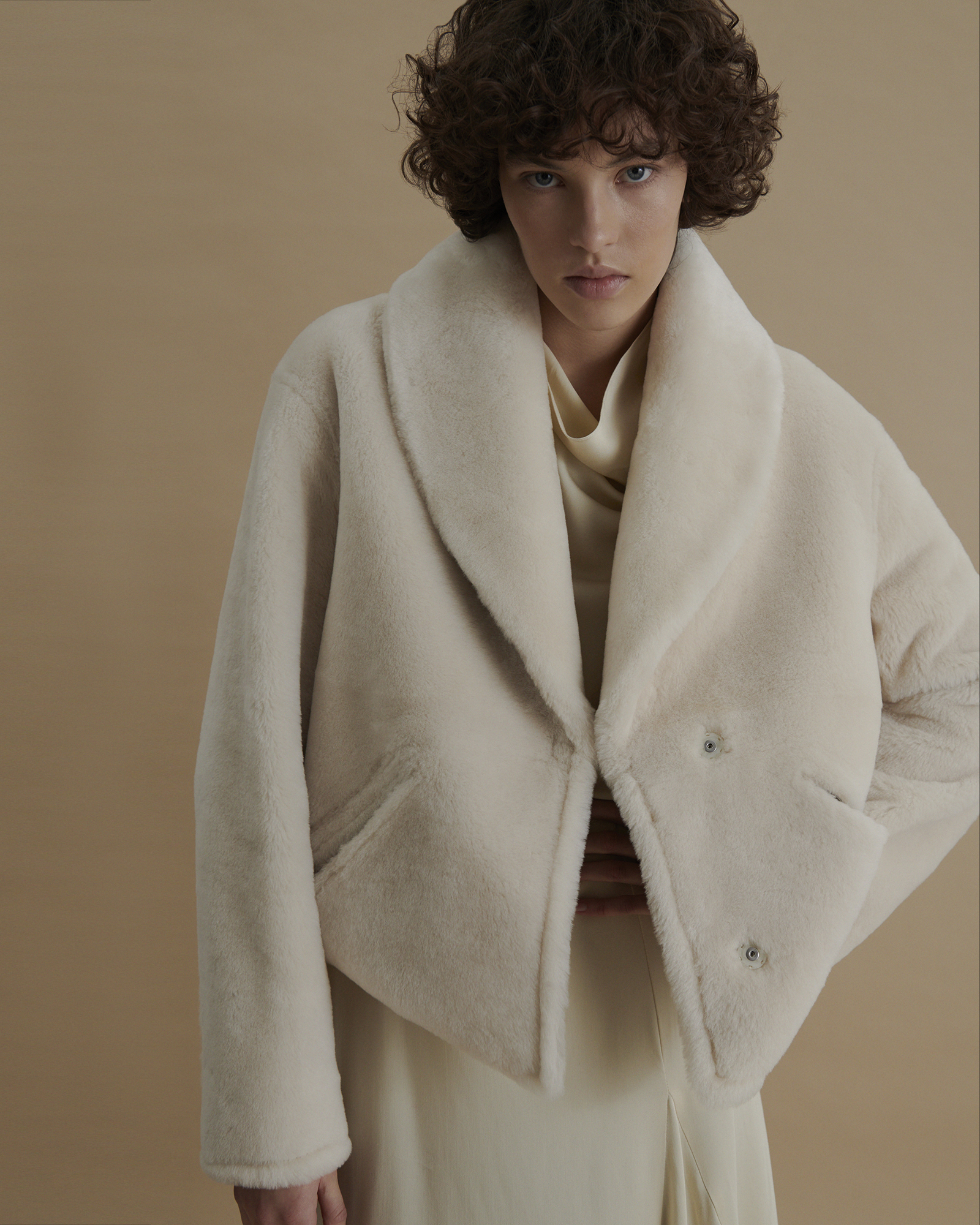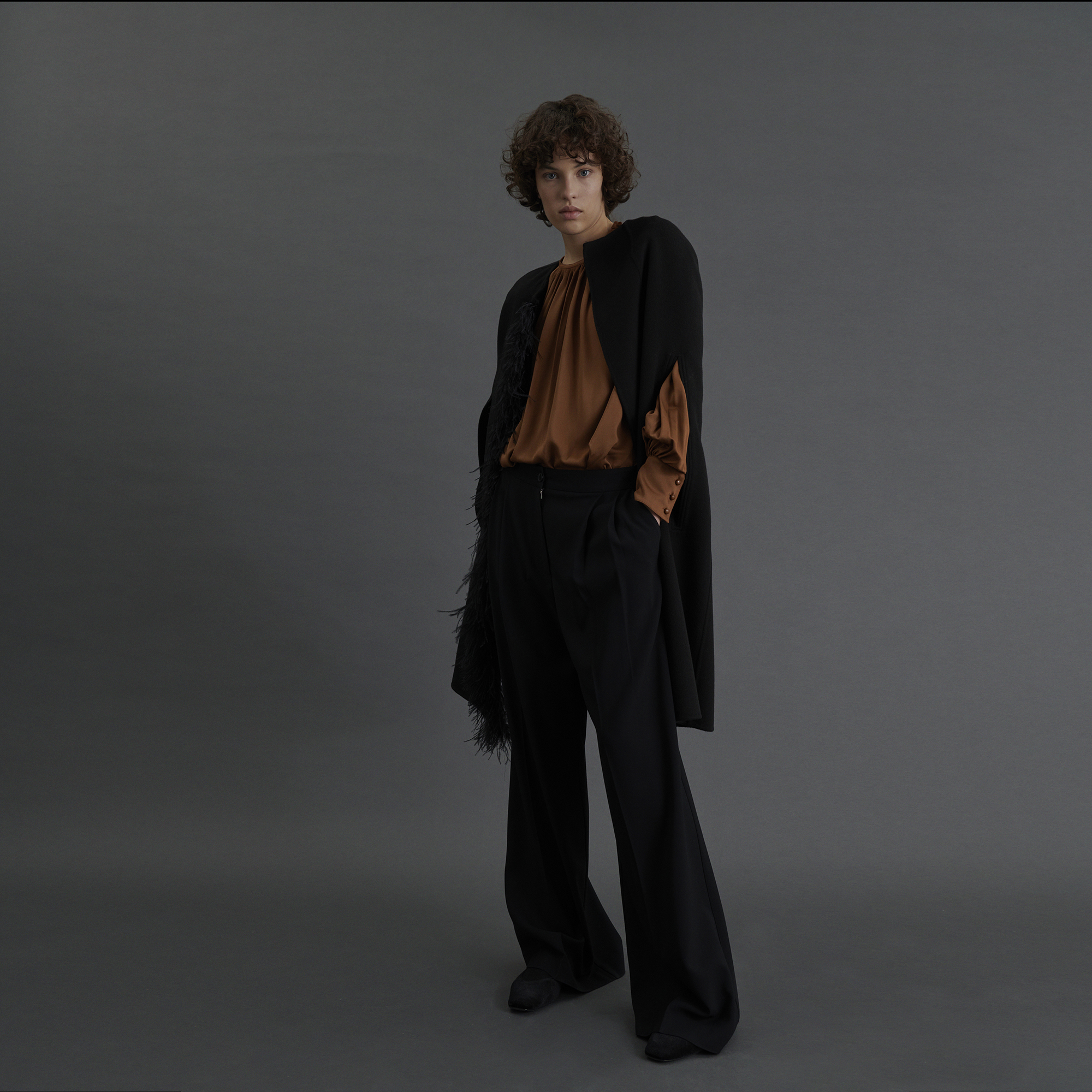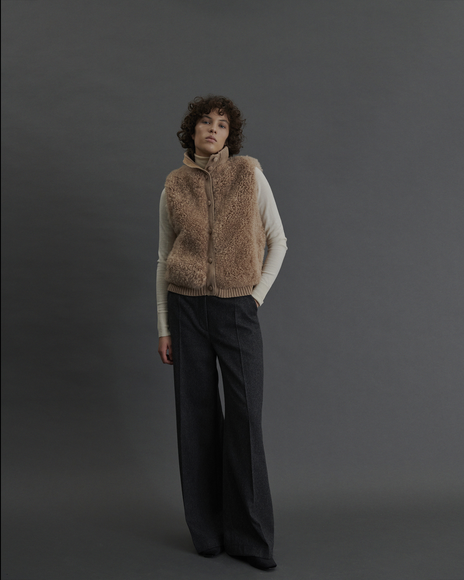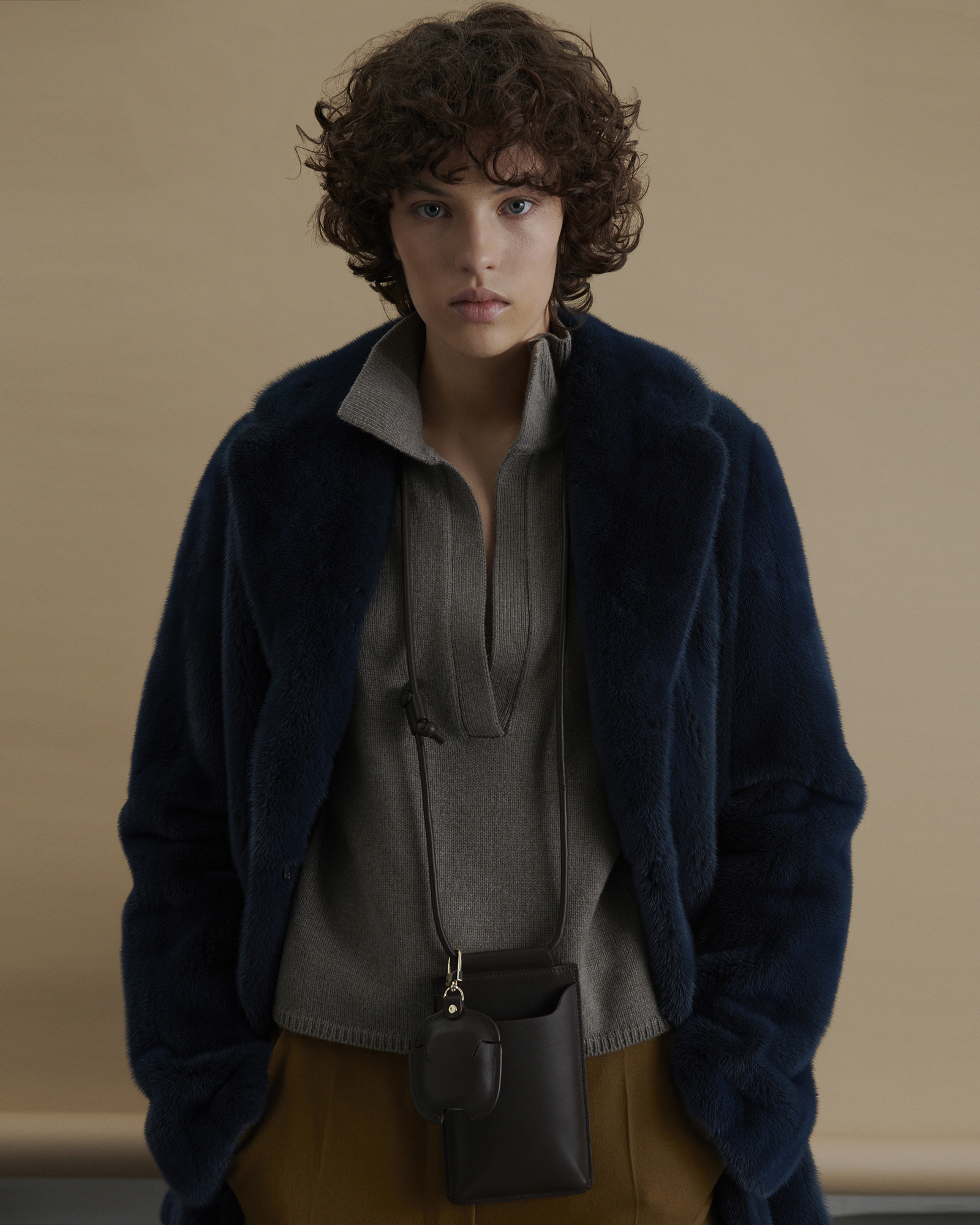 Le « luxe discret », signature de la maison Yves Salomon, se manifeste à travers chaque création. Les manteaux en cachemire, emblèmes de cette discrétion luxueuse, côtoient des vestes finement ajustées, sublimées par des surpiqûres de cuir discrètes. Cette collection témoigne de l’excellence du savoir-faire des ateliers Yves Salomon, mêlant avec brio art, design et technicité.